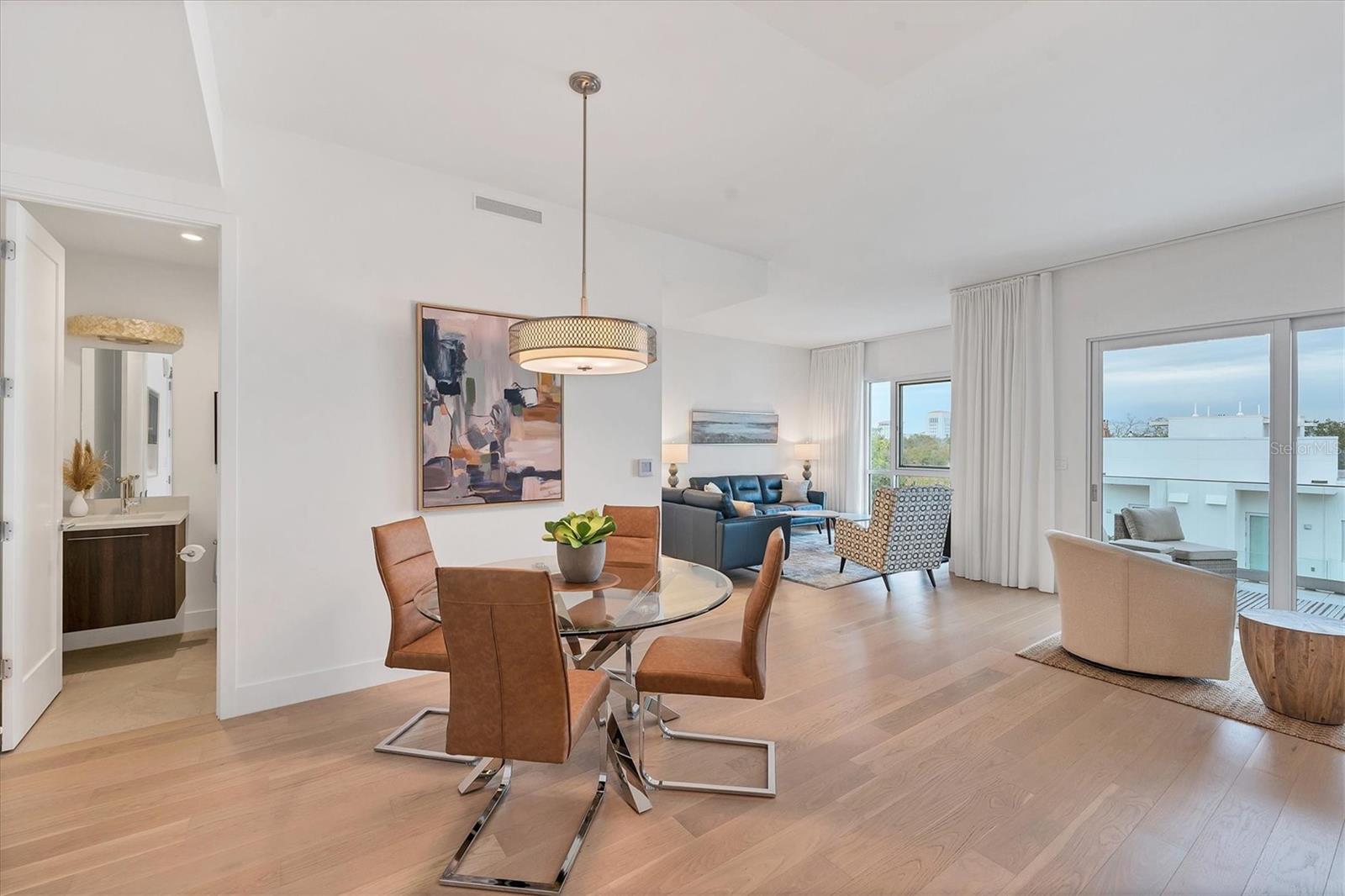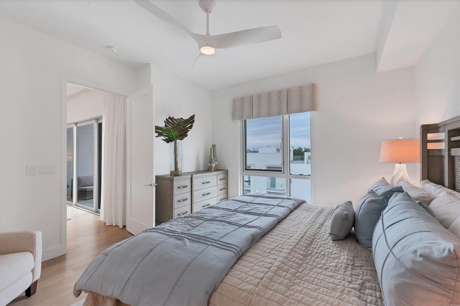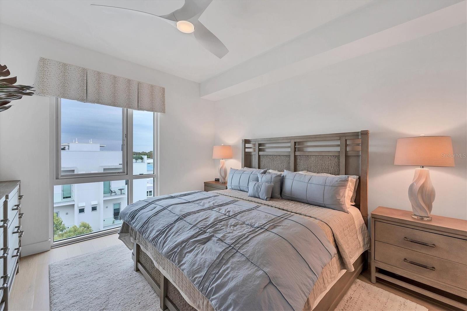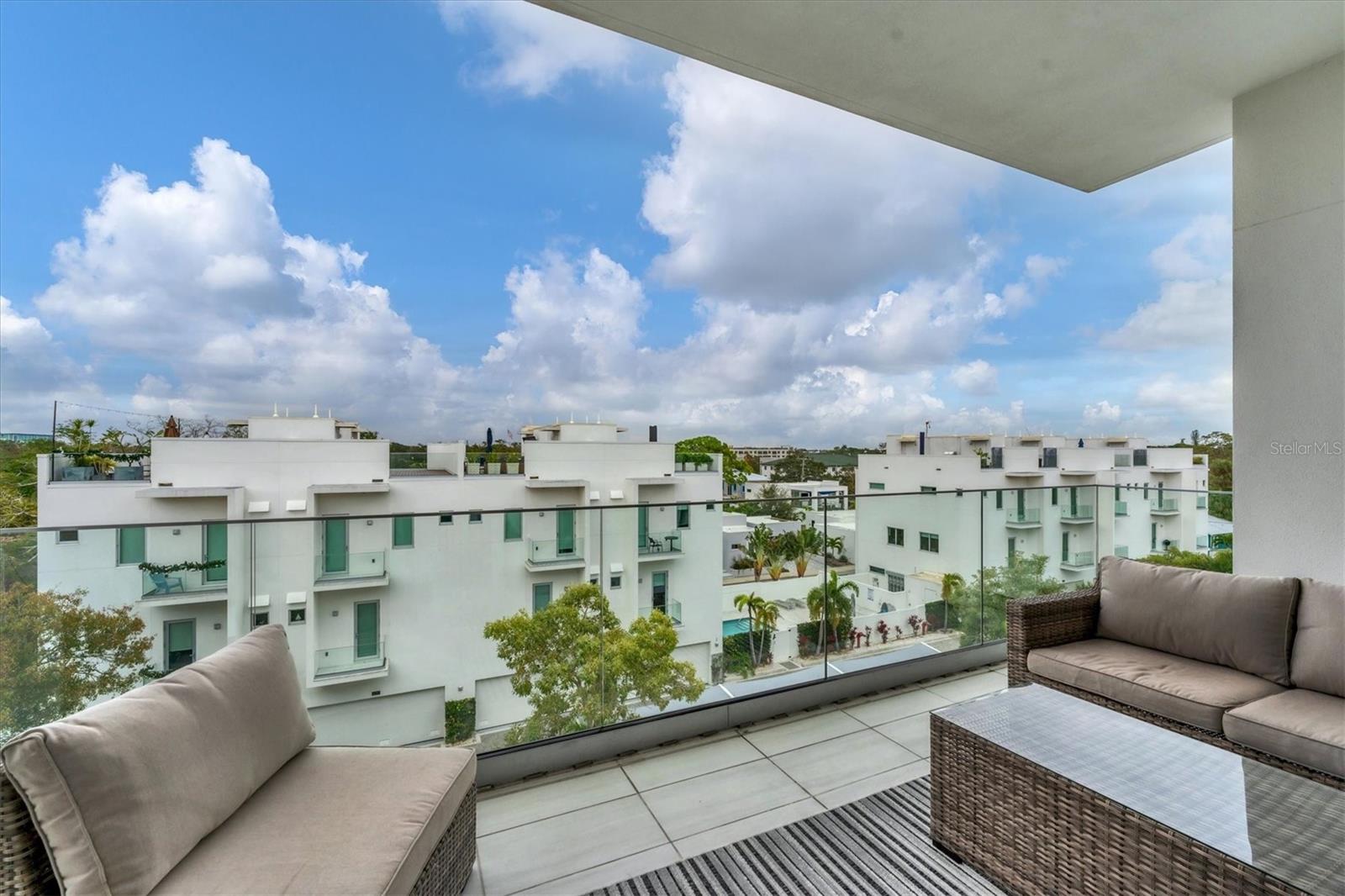 This elegant furnished residence, located on the top floor of the exclusive Orange Club community, seamlessly combines design with comfort. Positioned in an ideal downtown location within a boutique building of only 15 residences, this condominium is known for its Beach House floor plan and boasts over 1,400 square feet of living space. The open-concept layout extends to the central living space and opens to the balcony through floor to ceiling sliders. The expansive private balcony, complete with an overhead fan and a natural gas hook-up, provides comfortable lounge and dining space with the option for an exterior grill. The kitchen is thoughtfully designed for both efficiency and entertaining, equipped with a natural gas cooktop, wraparound countertops, and a large island for additional space and seating. Premium dark wood-grain cabinetry and stainless-steel appliances contribute to the home's luxurious feel. Adjacent to the kitchen is the open and spacious dining area. On one side, the primary suite spans the width of the residence, featuring a large, light-filled bedroom leading to a spa-inspired ensuite bathroom and an enormous walk-in closet. The primary bathroom showcases a glass-enclosed walk-in shower and an extra-long floating double vanity with ample built-in storage. Modern design elements, such as large-scale porcelain tiles, extend from the bathroom floor to a feature wall above the vanity. Currently, one bedroom serves as a designated study, easily transformable into guest space or a private media den. Positioned for privacy, the additional bedrooms are on the opposite side of the home, separated from the primary suite by the living space. Luxurious design elements throughout include luxury vinyl flooring, premium fixtures, and automated Lutron shades. In addition to the deeded and assigned covered parking space, multiple guest parking spaces are available on the property. Climate-controlled storage is on the ground level, and Orange Club residents enjoy access to a heated pool and patio area. Perfectly located near the historical Burns Court neighborhood and within a short walking distance of downtown and Sarasota Bay, Orange Club provides the perfect setting for experiencing urban amenities while enjoying a sense of privacy and tranquility.