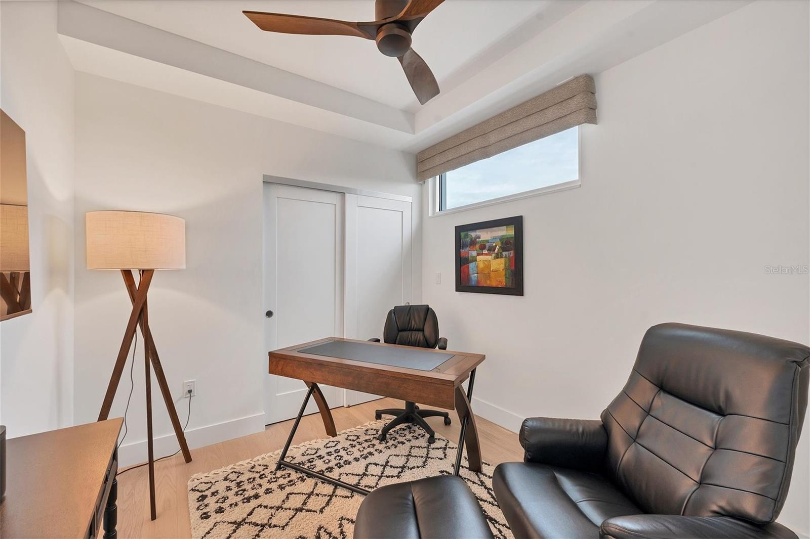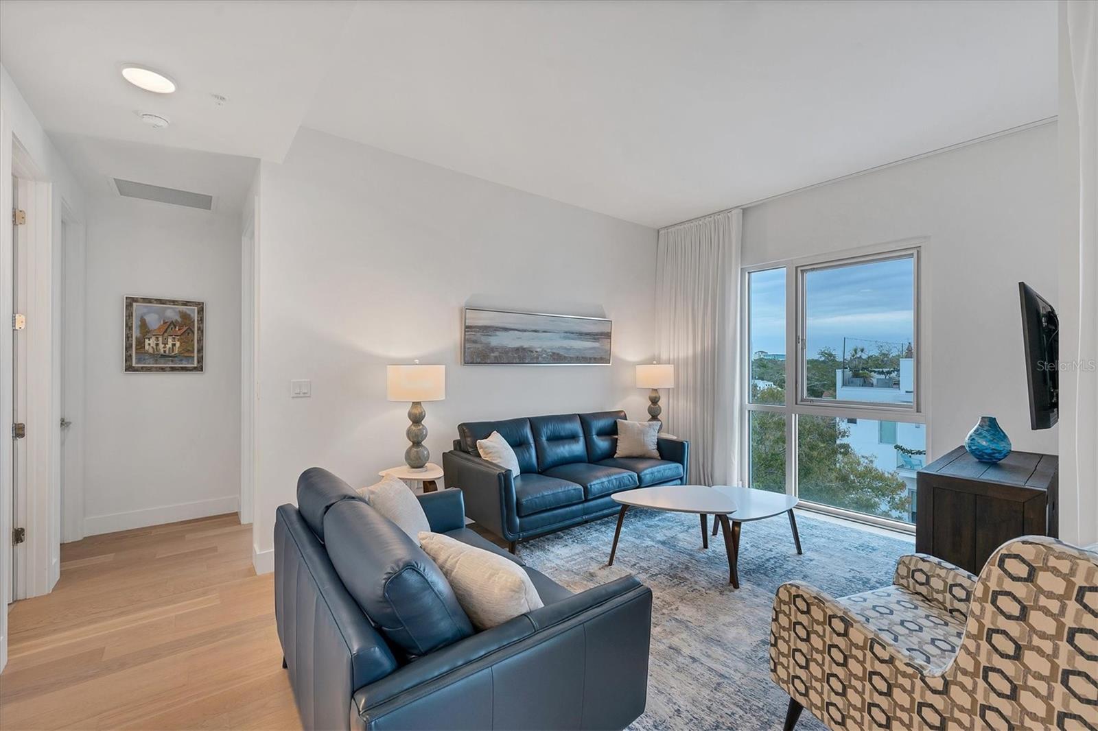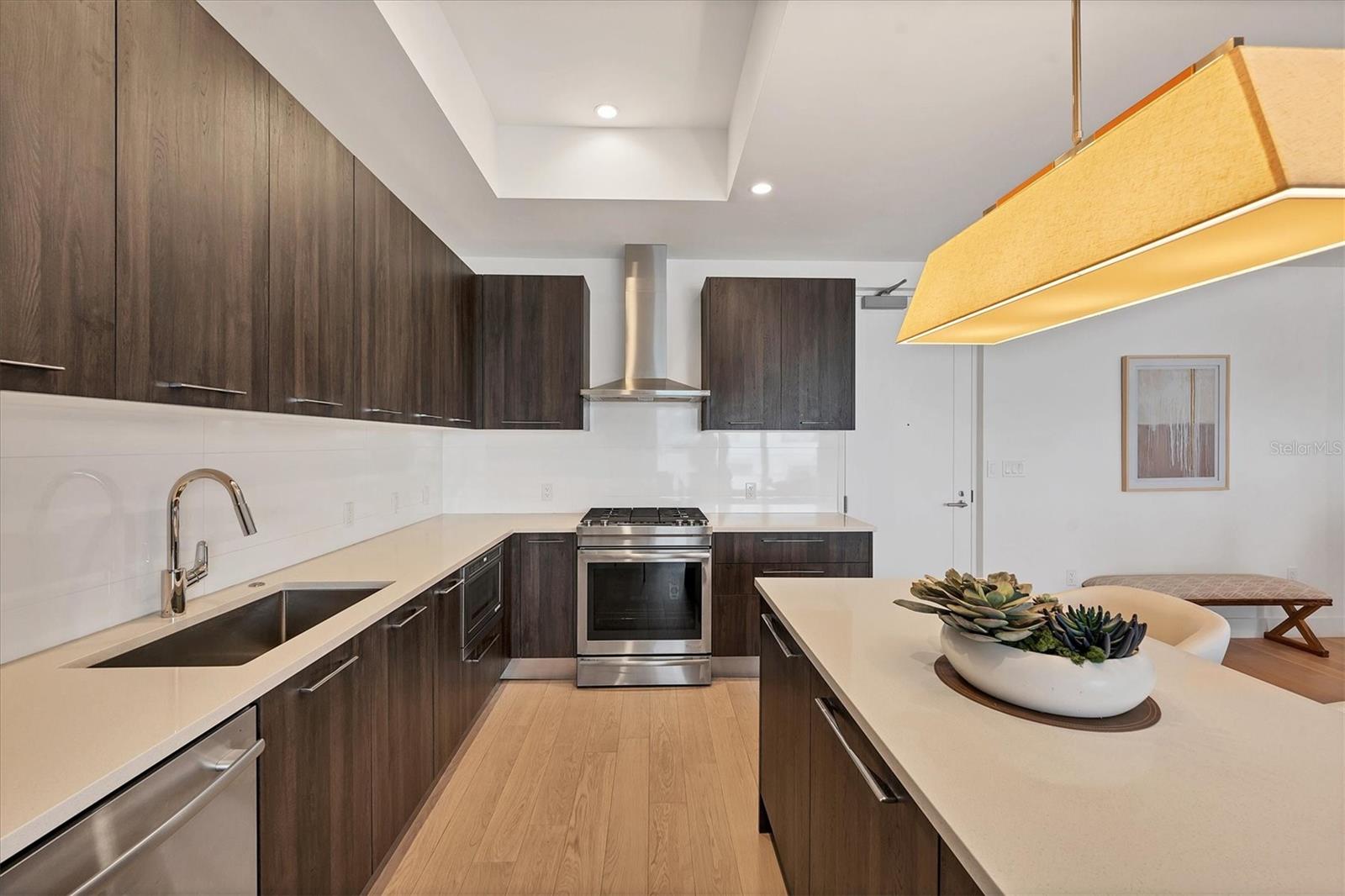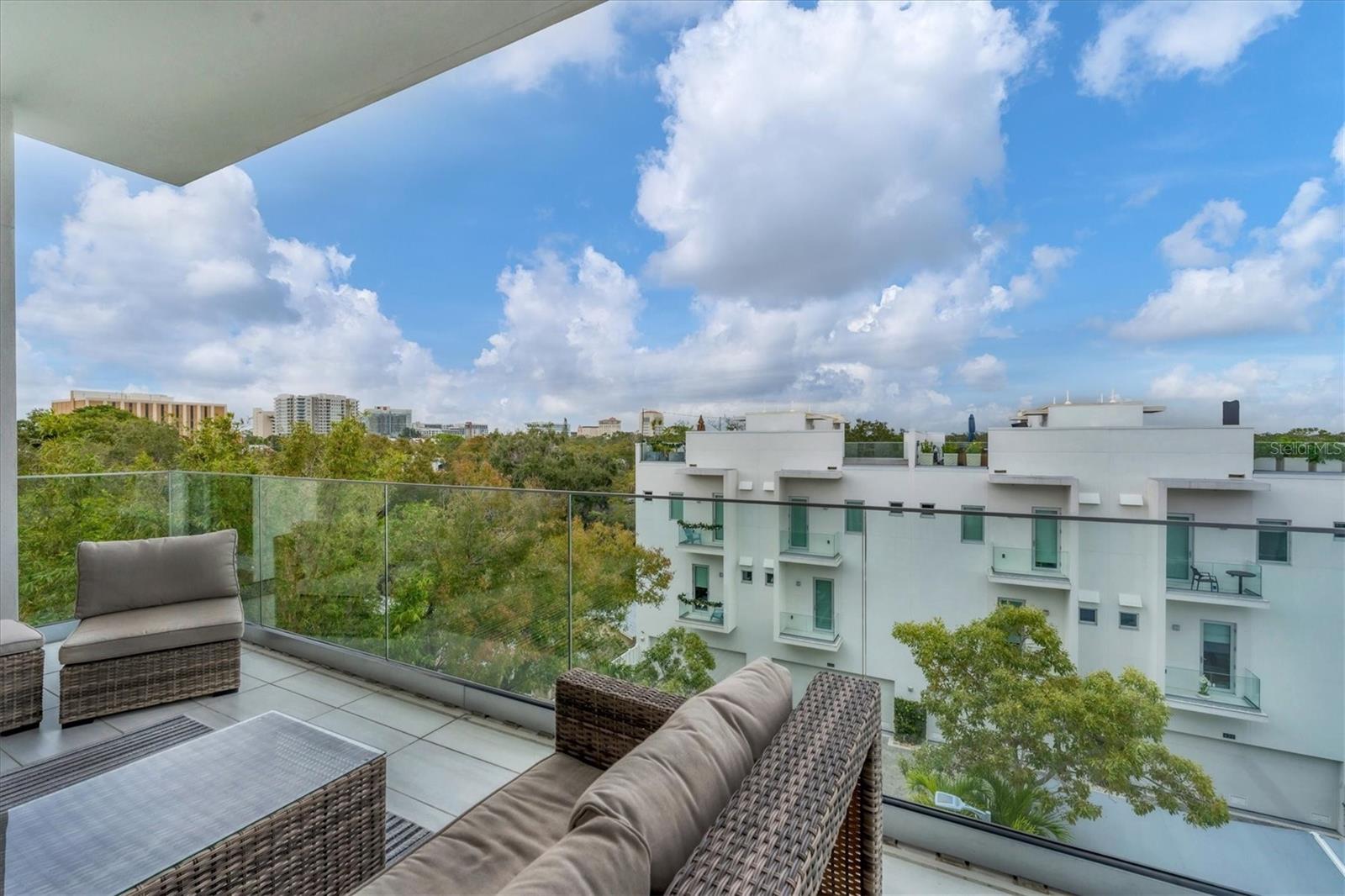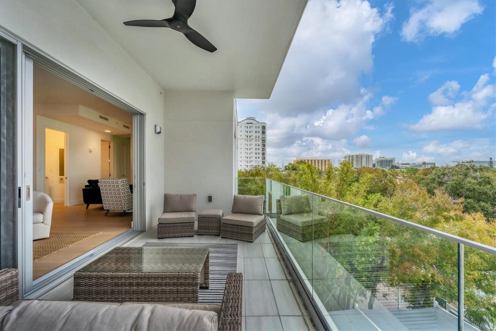 This elegant furnished residence, located on the top floor of the exclusive Orange Club community, seamlessly combines design with comfort. Positioned in an ideal downtown location within a boutique building of only 15 residences, this condominium is known for its Beach House floor plan and boasts over 1,400 square feet of living space. The open-concept layout extends to the central living space and opens to the balcony through floor to ceiling sliders. The expansive private balcony, complete with an overhead fan and a natural gas hook-up, provides comfortable lounge and dining space with the option for an exterior grill. The kitchen is thoughtfully designed for both efficiency and entertaining, equipped with a natural gas cooktop, wraparound countertops, and a large island for additional space and seating. Premium dark wood-grain cabinetry and stainless-steel appliances contribute to the home's luxurious feel. Adjacent to the kitchen is the open and spacious dining area. On one side, the primary suite spans the width of the residence, featuring a large, light-filled bedroom leading to a spa-inspired ensuite bathroom and an enormous walk-in closet. The primary bathroom showcases a glass-enclosed walk-in shower and an extra-long floating double vanity with ample built-in storage. Modern design elements, such as large-scale porcelain tiles, extend from the bathroom floor to a feature wall above the vanity. Currently, one bedroom serves as a designated study, easily transformable into guest space or a private media den. Positioned for privacy, the additional bedrooms are on the opposite side of the home, separated from the primary suite by the living space. Luxurious design elements throughout include luxury vinyl flooring, premium fixtures, and automated Lutron shades. In addition to the deeded and assigned covered parking space, multiple guest parking spaces are available on the property. Climate-controlled storage is on the ground level, and Orange Club residents enjoy access to a heated pool and patio area. Perfectly located near the historical Burns Court neighborhood and within a short walking distance of downtown and Sarasota Bay, Orange Club provides the perfect setting for experiencing urban amenities while enjoying a sense of privacy and tranquility.