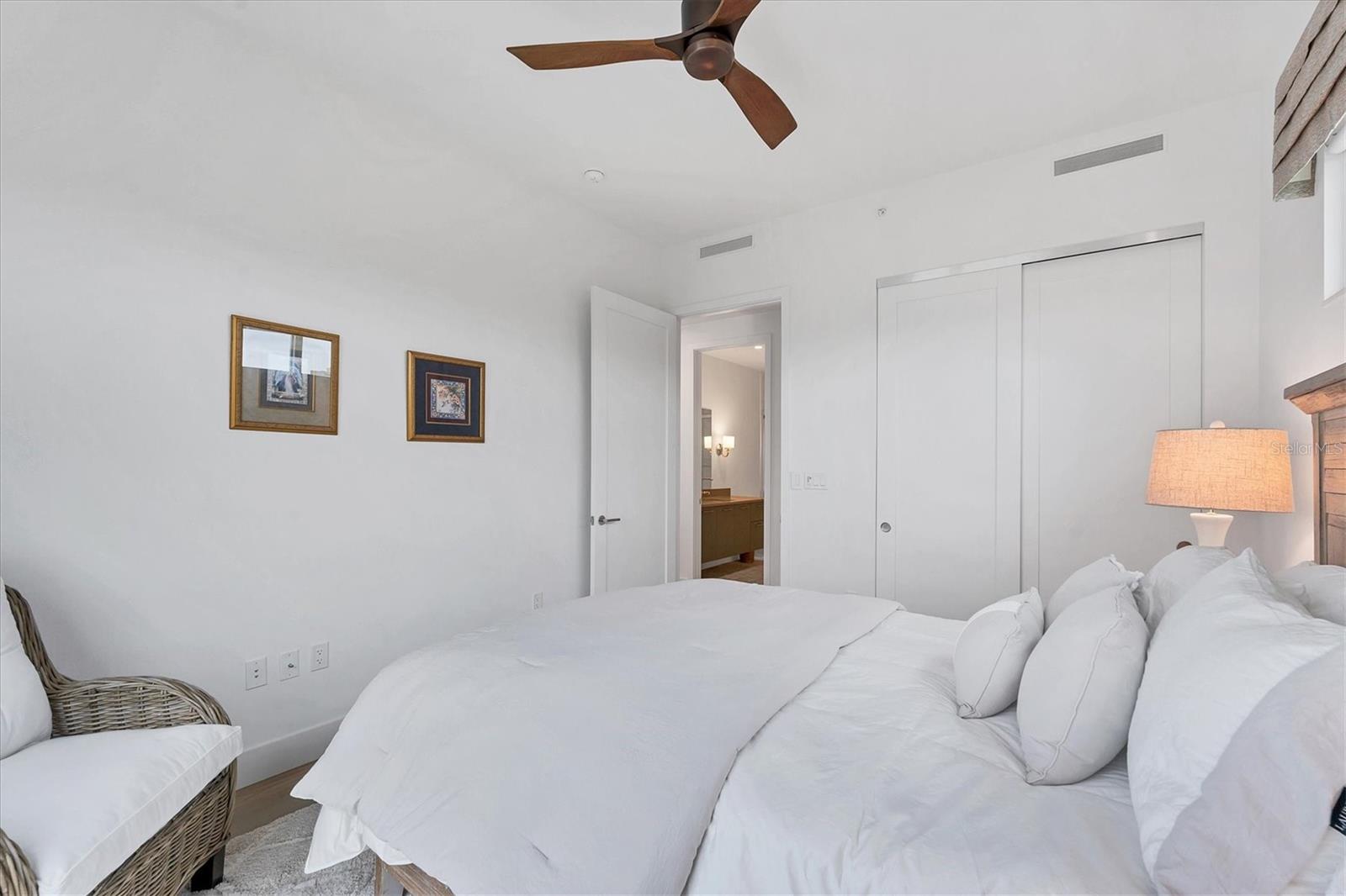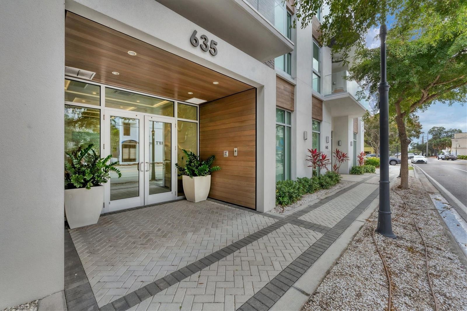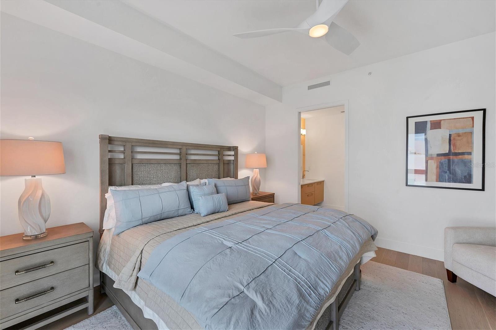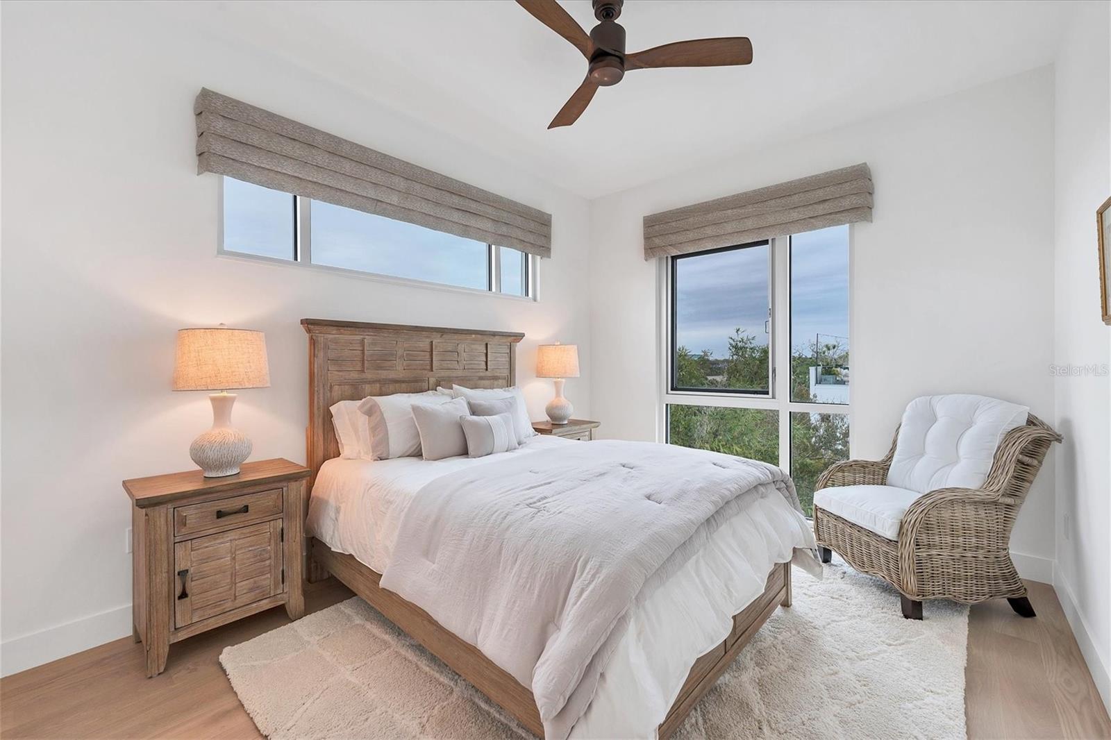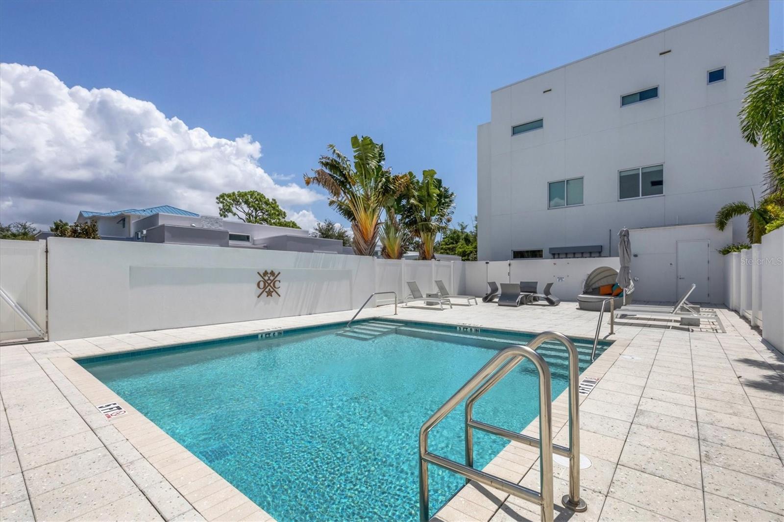 This elegant furnished residence, located on the top floor of the exclusive Orange Club community, seamlessly combines design with comfort. Positioned in an ideal downtown location within a boutique building of only 15 residences, this condominium is known for its Beach House floor plan and boasts over 1,400 square feet of living space. The open-concept layout extends to the central living space and opens to the balcony through floor to ceiling sliders. The expansive private balcony, complete with an overhead fan and a natural gas hook-up, provides comfortable lounge and dining space with the option for an exterior grill. The kitchen is thoughtfully designed for both efficiency and entertaining, equipped with a natural gas cooktop, wraparound countertops, and a large island for additional space and seating. Premium dark wood-grain cabinetry and stainless-steel appliances contribute to the home's luxurious feel. Adjacent to the kitchen is the open and spacious dining area. On one side, the primary suite spans the width of the residence, featuring a large, light-filled bedroom leading to a spa-inspired ensuite bathroom and an enormous walk-in closet. The primary bathroom showcases a glass-enclosed walk-in shower and an extra-long floating double vanity with ample built-in storage. Modern design elements, such as large-scale porcelain tiles, extend from the bathroom floor to a feature wall above the vanity. Currently, one bedroom serves as a designated study, easily transformable into guest space or a private media den. Positioned for privacy, the additional bedrooms are on the opposite side of the home, separated from the primary suite by the living space. Luxurious design elements throughout include luxury vinyl flooring, premium fixtures, and automated Lutron shades. In addition to the deeded and assigned covered parking space, multiple guest parking spaces are available on the property. Climate-controlled storage is on the ground level, and Orange Club residents enjoy access to a heated pool and patio area. Perfectly located near the historical Burns Court neighborhood and within a short walking distance of downtown and Sarasota Bay, Orange Club provides the perfect setting for experiencing urban amenities while enjoying a sense of privacy and tranquility.