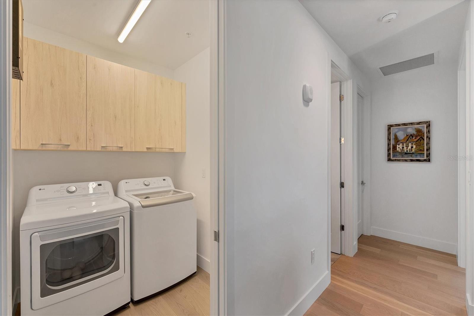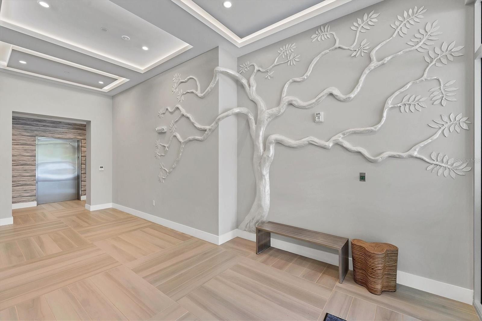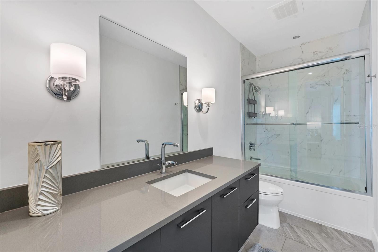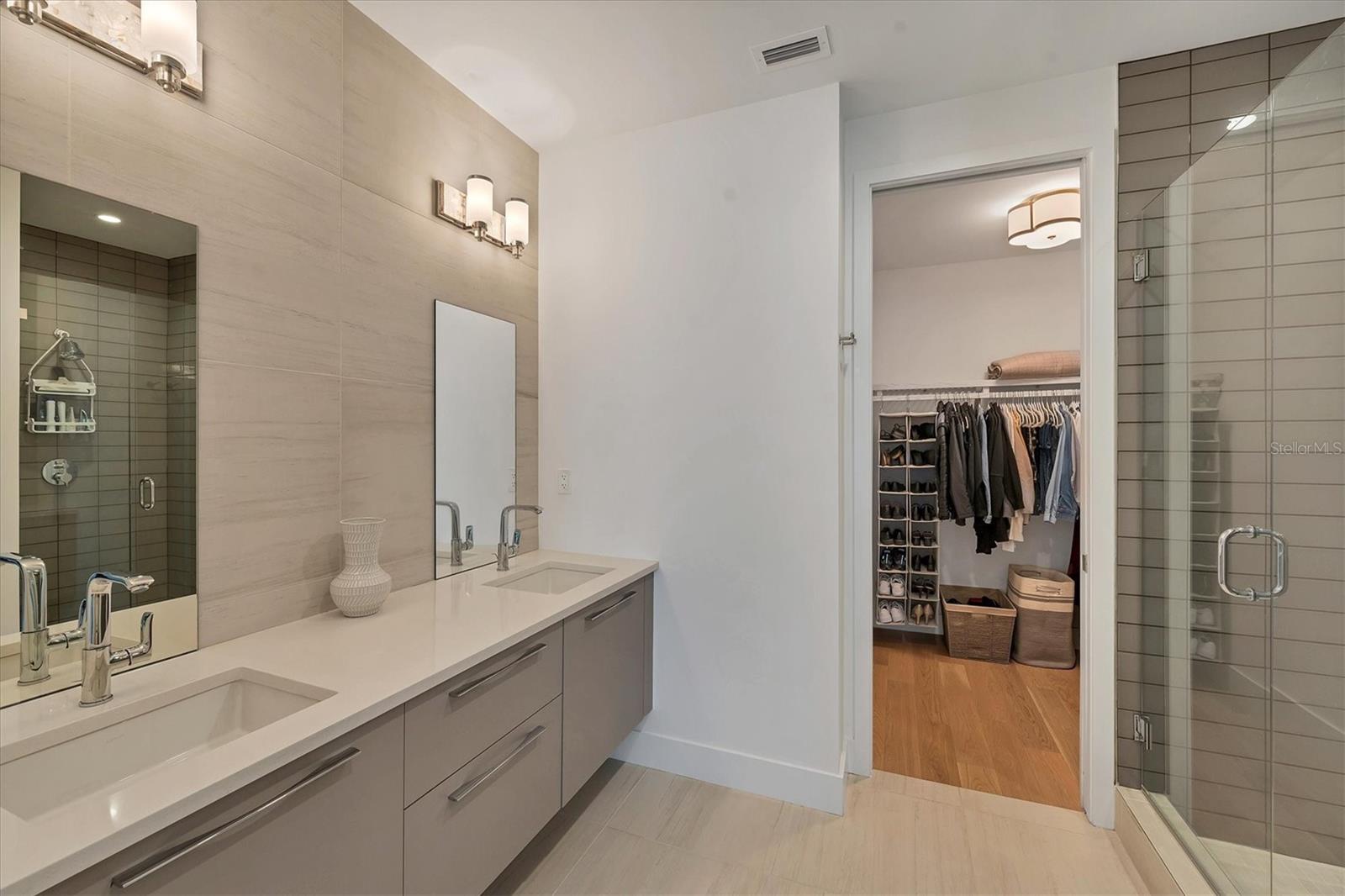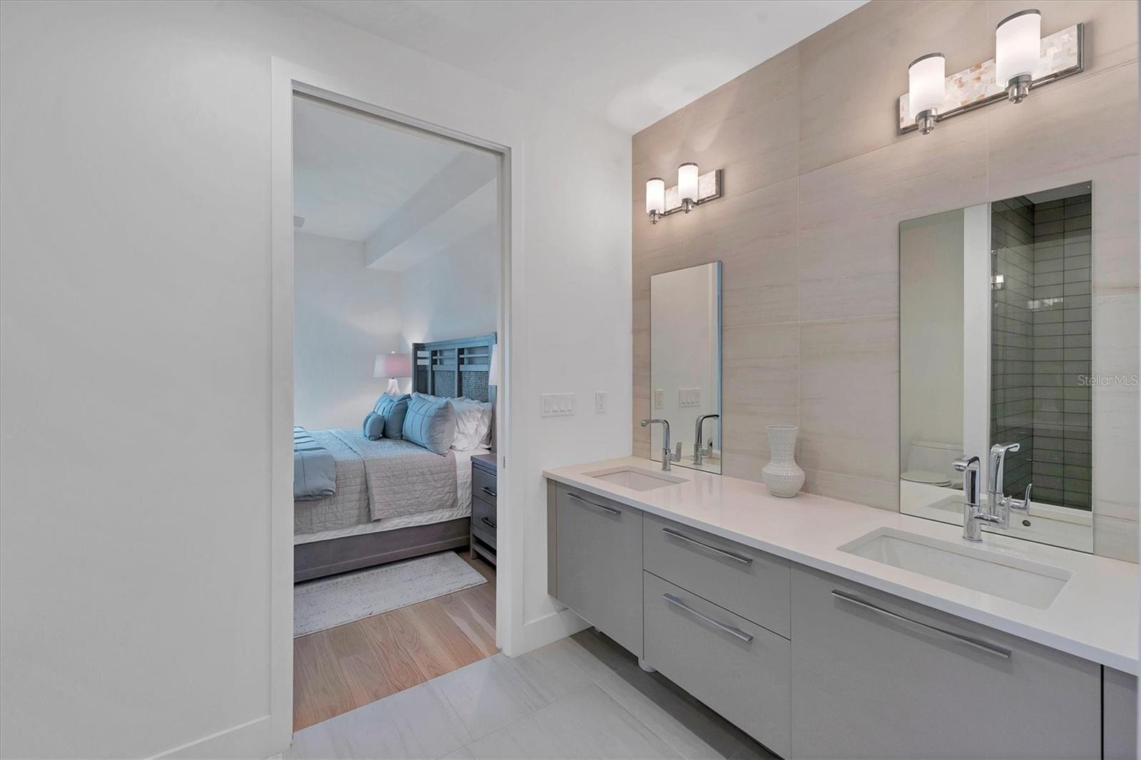 This elegant furnished residence, located on the top floor of the exclusive Orange Club community, seamlessly combines design with comfort. Positioned in an ideal downtown location within a boutique building of only 15 residences, this condominium is known for its Beach House floor plan and boasts over 1,400 square feet of living space. The open-concept layout extends to the central living space and opens to the balcony through floor to ceiling sliders. The expansive private balcony, complete with an overhead fan and a natural gas hook-up, provides comfortable lounge and dining space with the option for an exterior grill. The kitchen is thoughtfully designed for both efficiency and entertaining, equipped with a natural gas cooktop, wraparound countertops, and a large island for additional space and seating. Premium dark wood-grain cabinetry and stainless-steel appliances contribute to the home's luxurious feel. Adjacent to the kitchen is the open and spacious dining area. On one side, the primary suite spans the width of the residence, featuring a large, light-filled bedroom leading to a spa-inspired ensuite bathroom and an enormous walk-in closet. The primary bathroom showcases a glass-enclosed walk-in shower and an extra-long floating double vanity with ample built-in storage. Modern design elements, such as large-scale porcelain tiles, extend from the bathroom floor to a feature wall above the vanity. Currently, one bedroom serves as a designated study, easily transformable into guest space or a private media den. Positioned for privacy, the additional bedrooms are on the opposite side of the home, separated from the primary suite by the living space. Luxurious design elements throughout include luxury vinyl flooring, premium fixtures, and automated Lutron shades. In addition to the deeded and assigned covered parking space, multiple guest parking spaces are available on the property. Climate-controlled storage is on the ground level, and Orange Club residents enjoy access to a heated pool and patio area. Perfectly located near the historical Burns Court neighborhood and within a short walking distance of downtown and Sarasota Bay, Orange Club provides the perfect setting for experiencing urban amenities while enjoying a sense of privacy and tranquility.