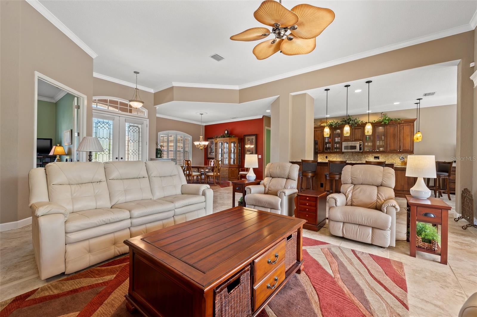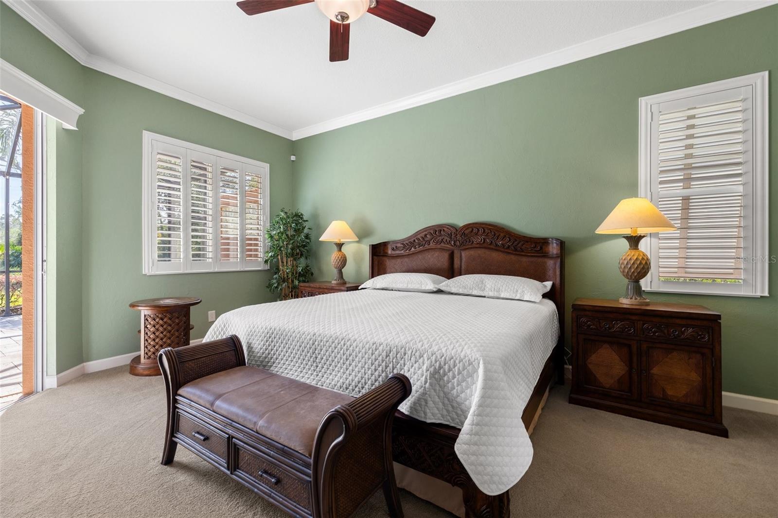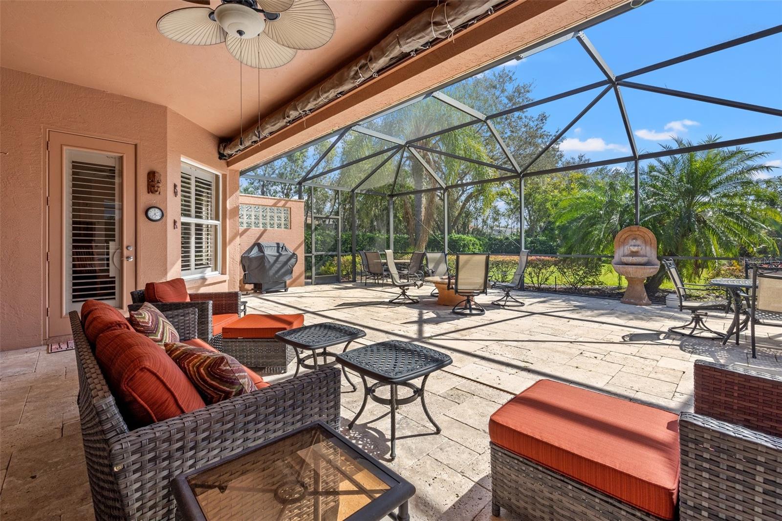 Welcome to Misty Creek – an established community of distinguished residences that exude individual character while enjoying the allure of natural beauty and solitude. Situated on a prime corner lot with .4 acres of land, the home offers a vast and meticulously maintained yard that backs up to a serene preserve providing privacy and a picturesque backdrop. As you enter through the double glass entry doors, you will see through to the breathtaking preserve views. The incredible attention to detail is evident with the crown molding, finely detailed custom cabinetry, and plantation shutters throughout. This home features 3 bedrooms plus an office with an abundance of space for all to enjoy. Step into the heart of the home and enjoy a meticulously remodeled kitchen with granite countertops, wood cabinets, a breakfast bar, a large pantry, wine cooler and eat-in nook. Whether you're a gourmet cook or simply cherishing moments spent with loved ones, the kitchen is designed to impress. Off the kitchen is the spacious great room which is perfect for casual living and entertaining guests or enjoying peaceful evenings with family. Expansive sliding doors lead to the large, expanded lanai with a refreshing hot tub and paver deck which sets the tone for indoor/outdoor Florida living. Enjoy the incredible outside screened lanai without the expense and hassles of maintaining a pool. Privacy is paramount, thanks to the thoughtfully designed split bedroom plan. The spacious primary bedroom features crown molding, two walk-in closets with custom built-ins, and an exquisite ensuite bathroom with double vanity, roman tub, and a separate walk-in shower. The office/den has stylish built-in bookcases and desks that provide a beautiful place to work or study from home. The guest bedrooms are private and share a beautiful guest bath with wood cabinetry and walk-in shower. Additional exterior features include a new high-efficiency AC, system 3-car side entry garage, Generac generator, hurricane shutters and screens, garage cabinetry and workshop. The Misty Creek community hosts a lovely golf course and club (membership not required). There are two gated entries, one of which is manned 24-hrs. Easy access to the Interstate, shopping, dining, and more.