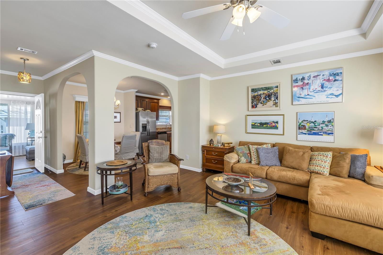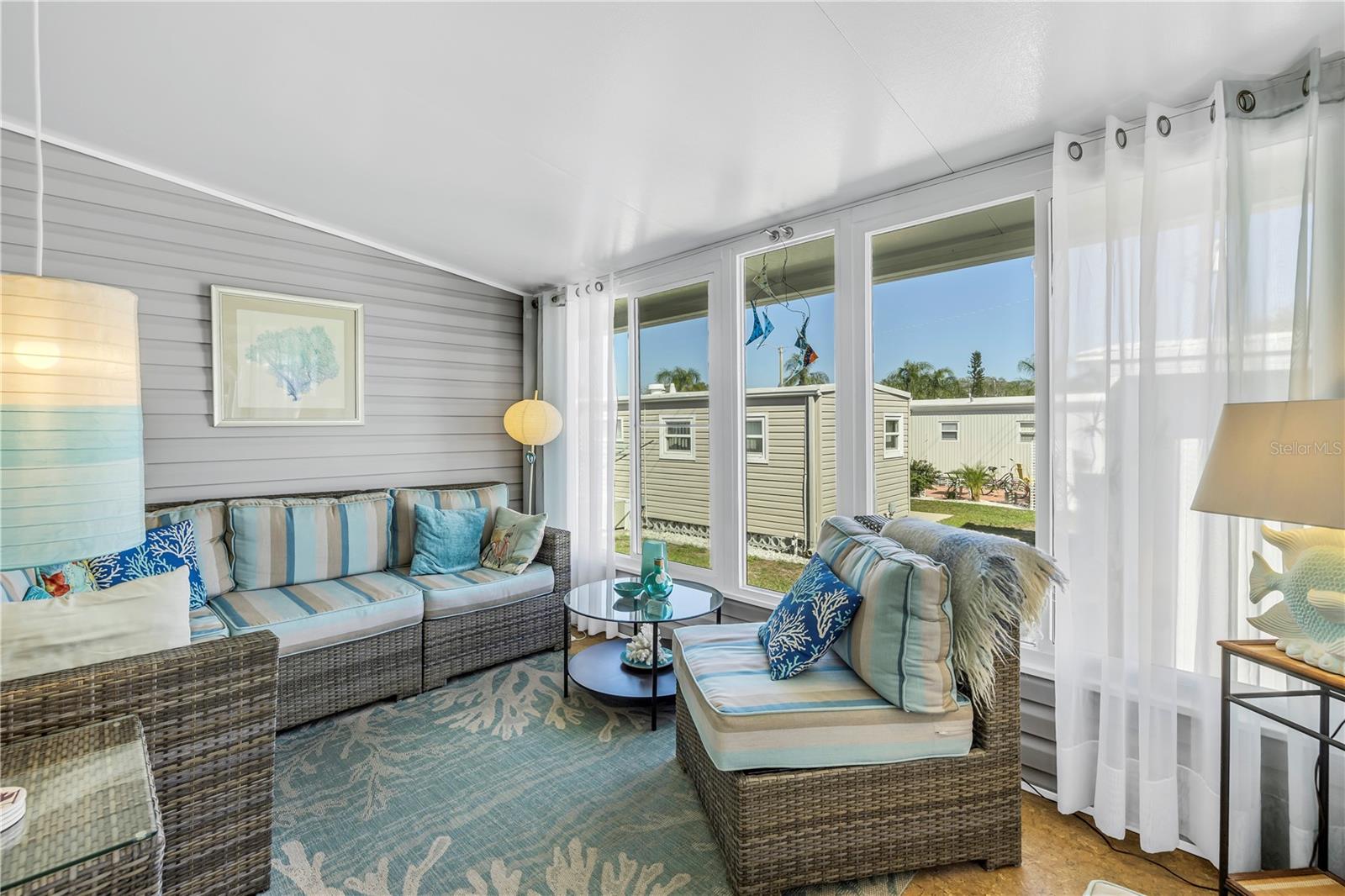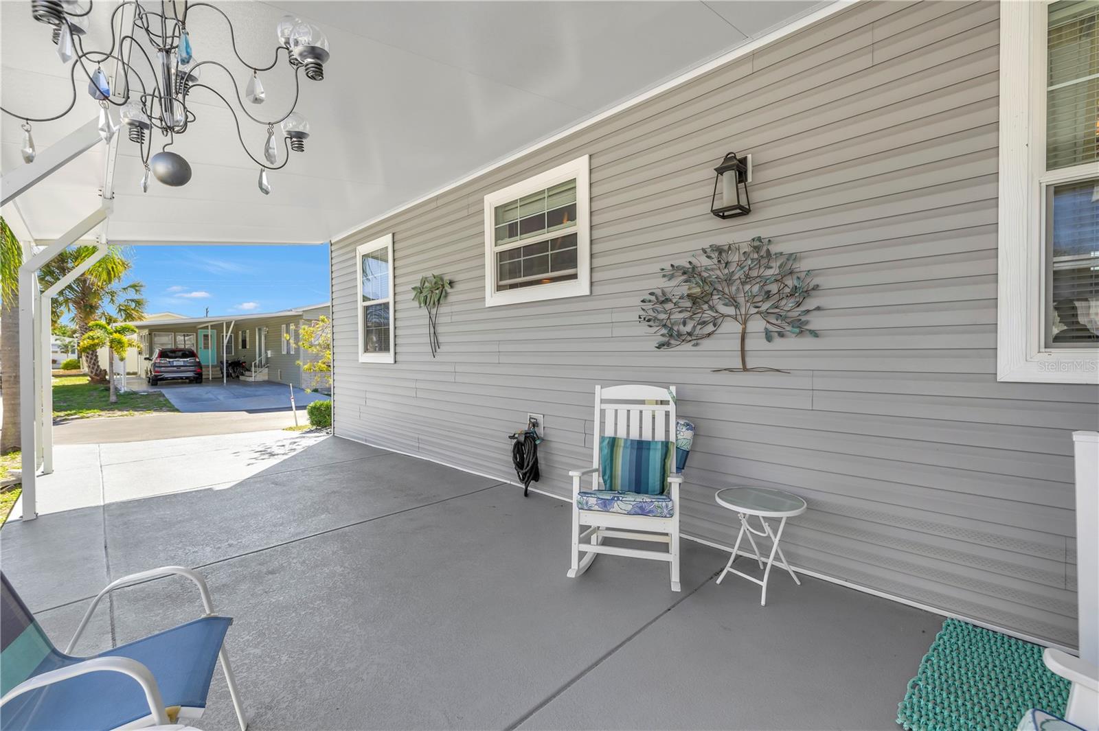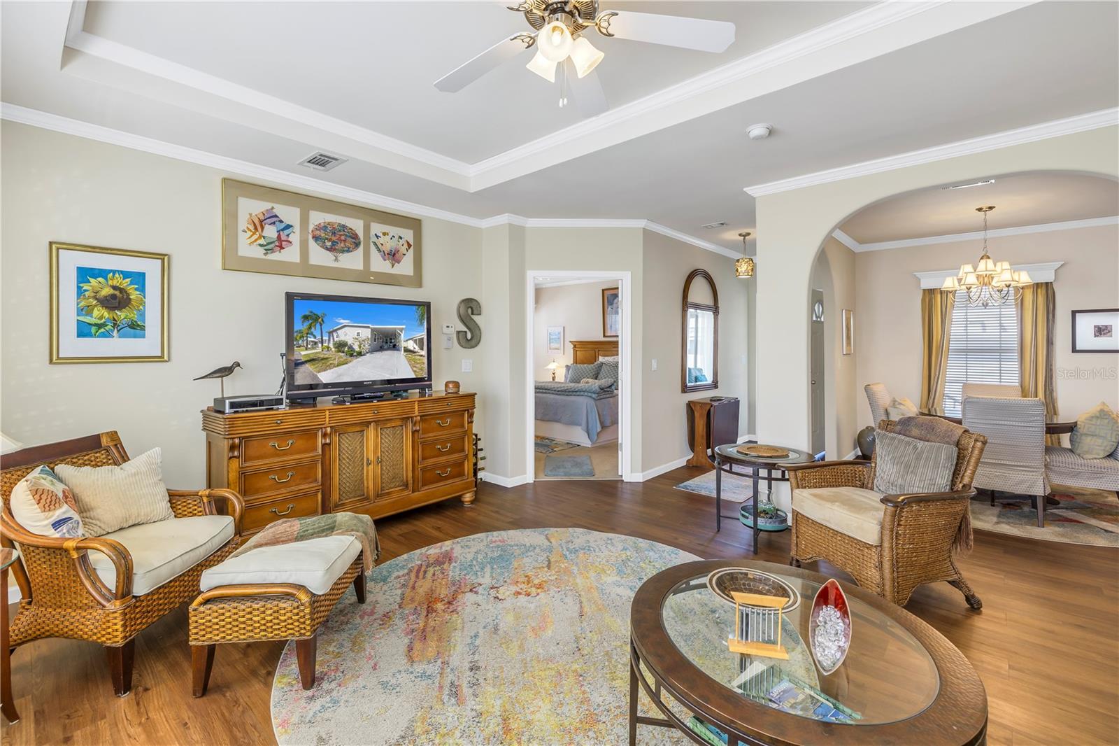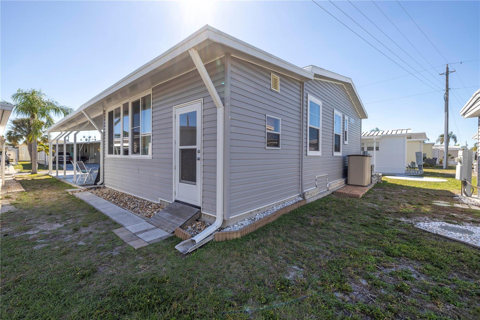 Step into a world of comfort and convenience with this meticulously crafted, custom-built home completed in 2015. Nestled just 1 mile from the pristine shores of Siesta Beach, where free parking awaits. This 3-bedroom, 2-bathroom haven offers a perfect blend of style and functionality. Enjoy seamless accessibility to shopping, transportation, and recreational activities, whether by car, bicycle, or a leisurely stroll. Set within an established, resident-owned 55+ community, indulge in worry-free living with a monthly HOA fee of only $175, covering cable TV, water, sewer, trash removal, lawn care, security monitoring, sport courts, pool & patio, recreational hall, library, and maintenance of all public areas. High-speed internet is also readily available. Inside, the expansive kitchen boasts abundant counter space, a large island with seating, 27 cherry cabinets and drawers, and a new refrigerator added in December 2023. The open concept living and dining area, adorned with tray ceilings reaching 11 feet in height, creates an ideal area for family entertaining and social gatherings. Safety and convenience take center stage with 36-inch wide door openings, tinted windows with cornices and shades, and windows that tip-in for easy cleaning, all while being severe weather resistant. A reinforced "safe area" provides added protection during severe weather events.The primary bedroom, privately situated at one end of the house, features an en-suite double sink bathroom and a walk-in closet. The bathroom includes a step-in shower with a full-size sit-down seat and slip-resistant tile. At the opposite end, discover two additional bedrooms, a full bathroom, and a laundry/utility room with a new washer and dryer are brand new as of November 2023. Step out onto the inviting lanai/porch, surrounded by large sliding windows and screens, providing a comfortable space to unwind. Outside, a generous 31-foot driveway offers ample parking for two cars, while a patio space and a sizable shed with a loft and electrical outlets cater to both storage and workspace needs. This home effortlessly combines comfort, safety, and functionality for a truly exceptional living experience.