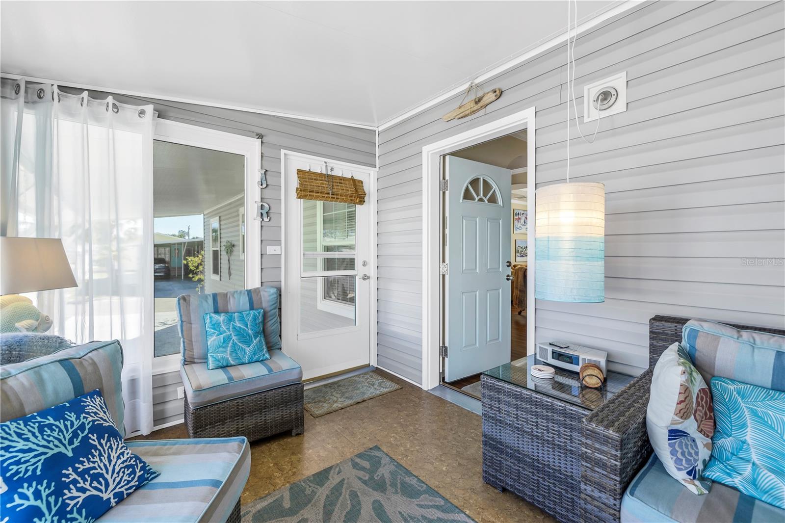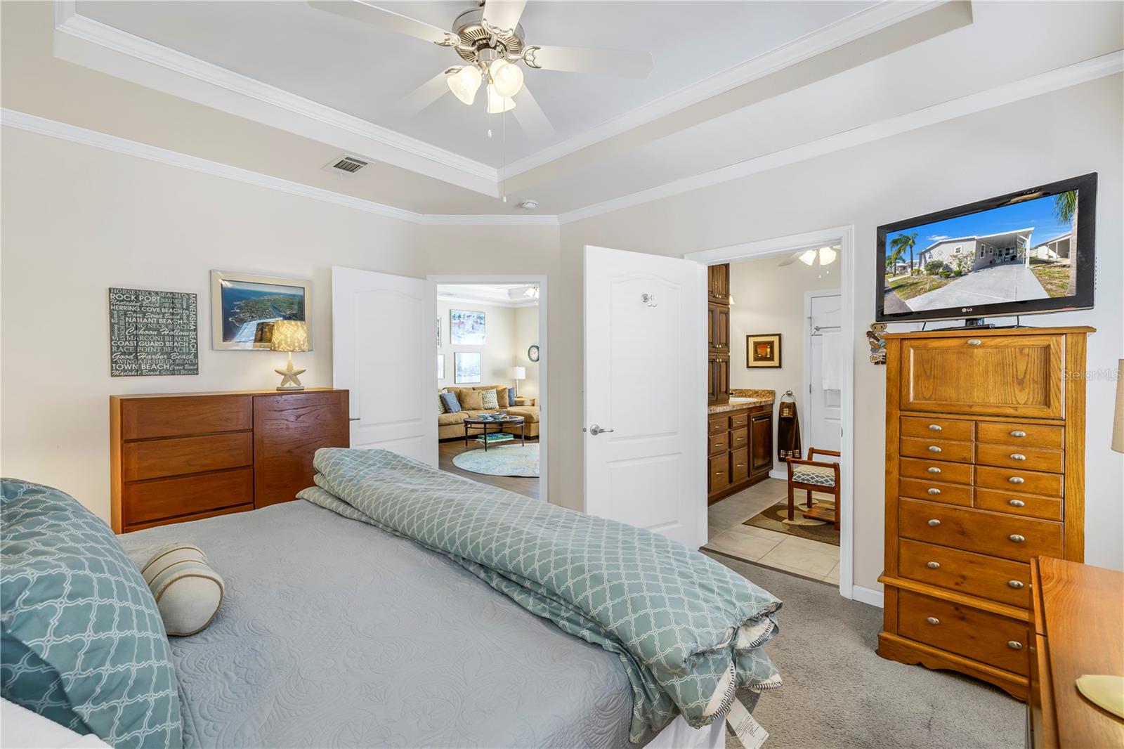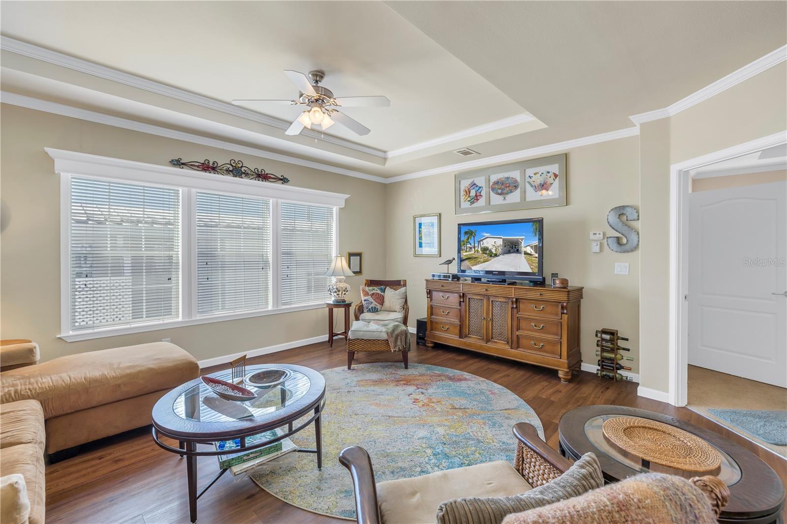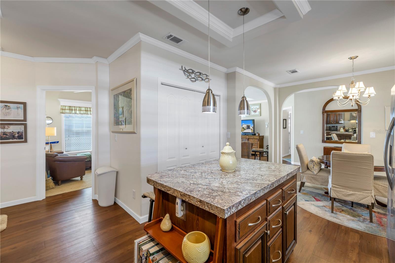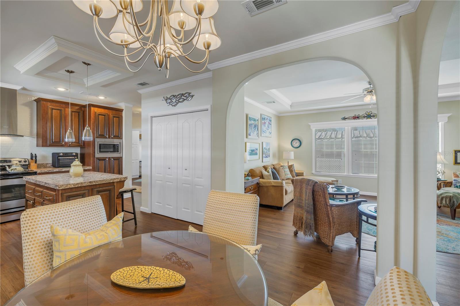 Step into a world of comfort and convenience with this meticulously crafted, custom-built home completed in 2015. Nestled just 1 mile from the pristine shores of Siesta Beach, where free parking awaits. This 3-bedroom, 2-bathroom haven offers a perfect blend of style and functionality. Enjoy seamless accessibility to shopping, transportation, and recreational activities, whether by car, bicycle, or a leisurely stroll. Set within an established, resident-owned 55+ community, indulge in worry-free living with a monthly HOA fee of only $175, covering cable TV, water, sewer, trash removal, lawn care, security monitoring, sport courts, pool & patio, recreational hall, library, and maintenance of all public areas. High-speed internet is also readily available. Inside, the expansive kitchen boasts abundant counter space, a large island with seating, 27 cherry cabinets and drawers, and a new refrigerator added in December 2023. The open concept living and dining area, adorned with tray ceilings reaching 11 feet in height, creates an ideal area for family entertaining and social gatherings. Safety and convenience take center stage with 36-inch wide door openings, tinted windows with cornices and shades, and windows that tip-in for easy cleaning, all while being severe weather resistant. A reinforced "safe area" provides added protection during severe weather events.The primary bedroom, privately situated at one end of the house, features an en-suite double sink bathroom and a walk-in closet. The bathroom includes a step-in shower with a full-size sit-down seat and slip-resistant tile. At the opposite end, discover two additional bedrooms, a full bathroom, and a laundry/utility room with a new washer and dryer are brand new as of November 2023. Step out onto the inviting lanai/porch, surrounded by large sliding windows and screens, providing a comfortable space to unwind. Outside, a generous 31-foot driveway offers ample parking for two cars, while a patio space and a sizable shed with a loft and electrical outlets cater to both storage and workspace needs. This home effortlessly combines comfort, safety, and functionality for a truly exceptional living experience.