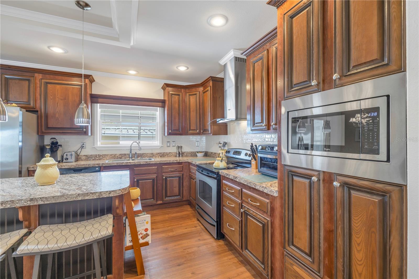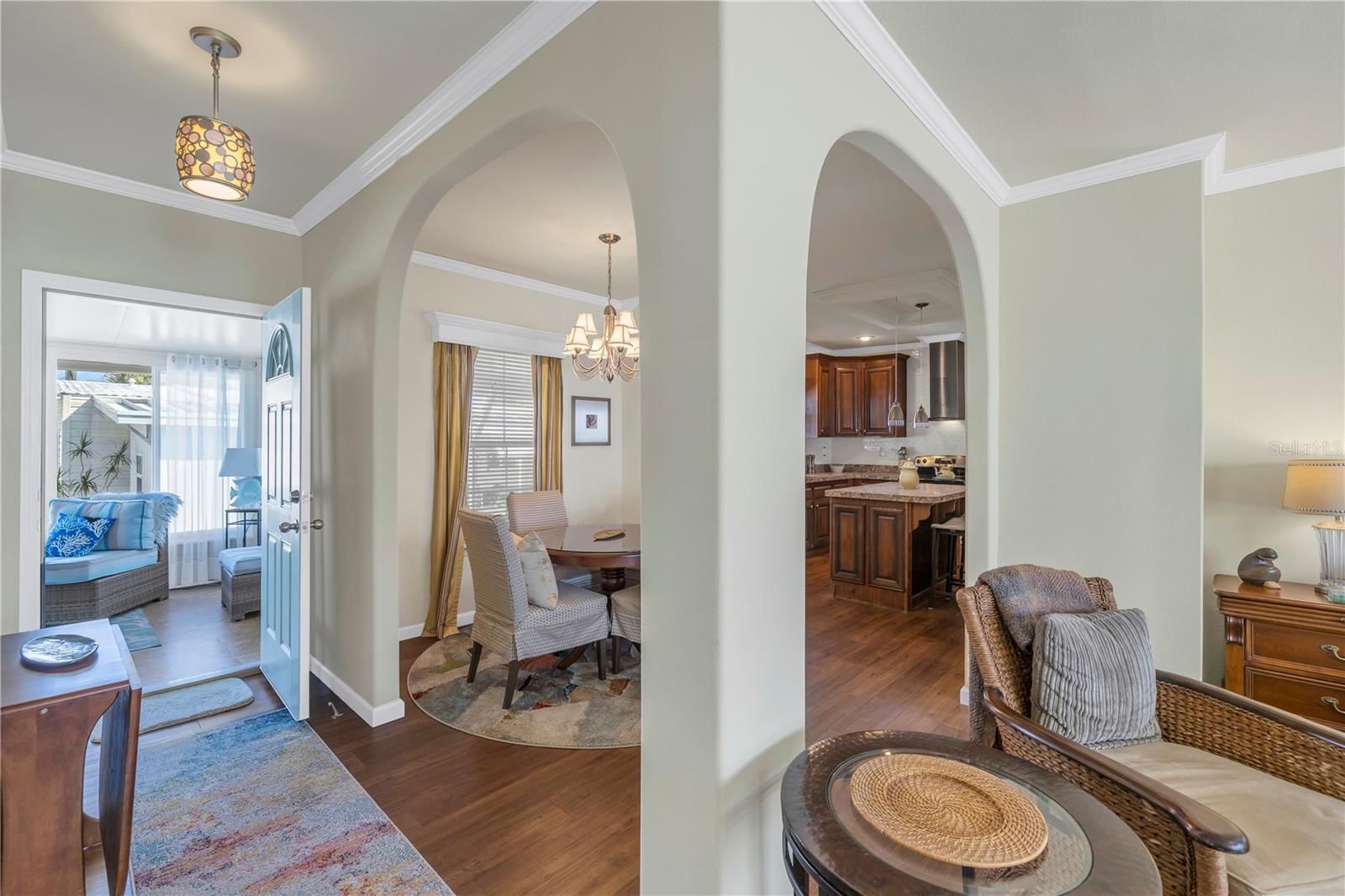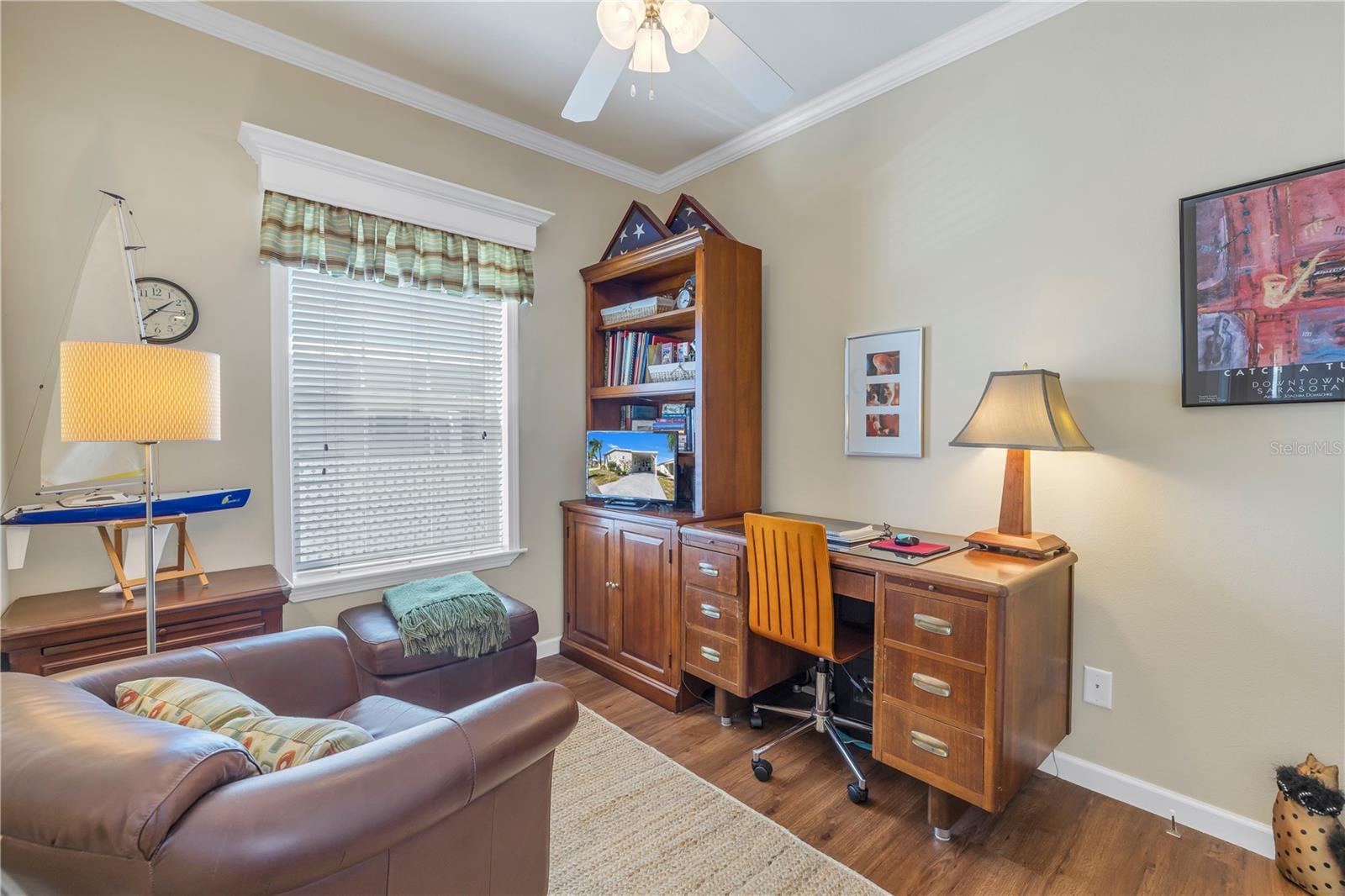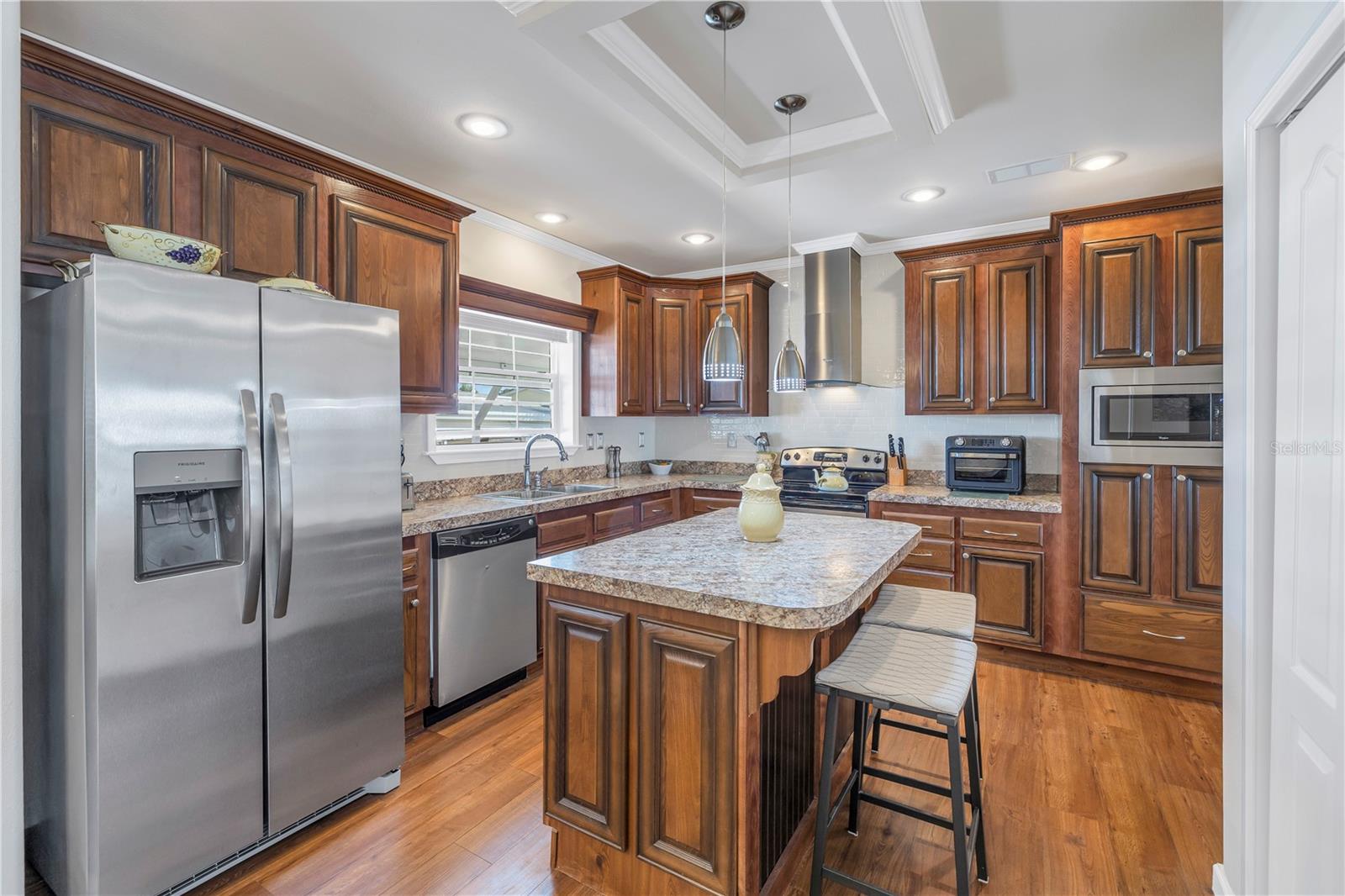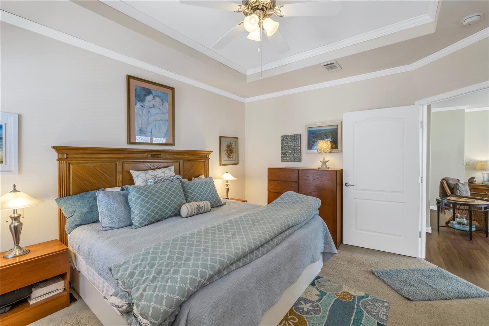Step into a world of comfort and convenience with this meticulously crafted, custom-built home completed in 2015. Nestled just 1 mile from the pristine shores of Siesta Beach, where free parking awaits. This 3-bedroom, 2-bathroom haven offers a perfect blend of style and functionality. Enjoy seamless accessibility to shopping, transportation, and recreational activities, whether by car, bicycle, or a leisurely stroll. Set within an established, resident-owned 55+ community, indulge in worry-free living with a monthly HOA fee of only $175, covering cable TV, water, sewer, trash removal, lawn care, security monitoring, sport courts, pool & patio, recreational hall, library, and maintenance of all public areas. High-speed internet is also readily available. Inside, the expansive kitchen boasts abundant counter space, a large island with seating, 27 cherry cabinets and drawers, and a new refrigerator added in December 2023. The open concept living and dining area, adorned with tray ceilings reaching 11 feet in height, creates an ideal area for family entertaining and social gatherings. Safety and convenience take center stage with 36-inch wide door openings, tinted windows with cornices and shades, and windows that tip-in for easy cleaning, all while being severe weather resistant. A reinforced "safe area" provides added protection during severe weather events.The primary bedroom, privately situated at one end of the house, features an en-suite double sink bathroom and a walk-in closet. The bathroom includes a step-in shower with a full-size sit-down seat and slip-resistant tile. At the opposite end, discover two additional bedrooms, a full bathroom, and a laundry/utility room with a new washer and dryer are brand new as of November 2023. Step out onto the inviting lanai/porch, surrounded by large sliding windows and screens, providing a comfortable space to unwind. Outside, a generous 31-foot driveway offers ample parking for two cars, while a patio space and a sizable shed with a loft and electrical outlets cater to both storage and workspace needs. This home effortlessly combines comfort, safety, and functionality for a truly exceptional living experience.