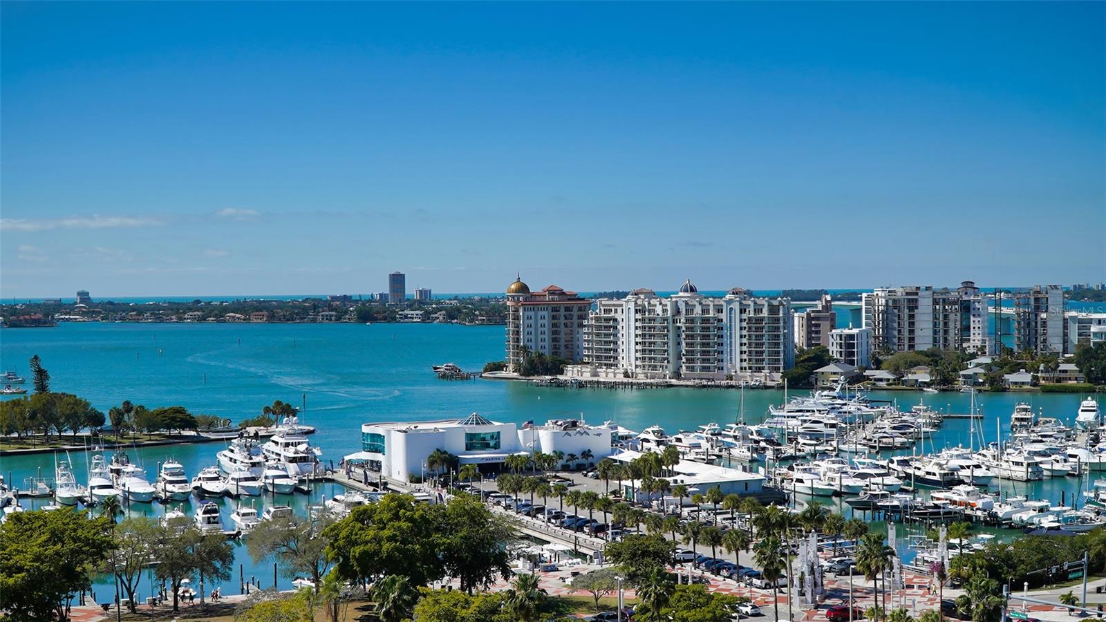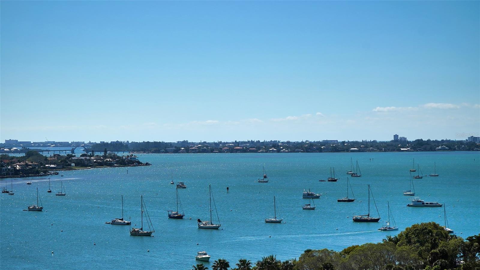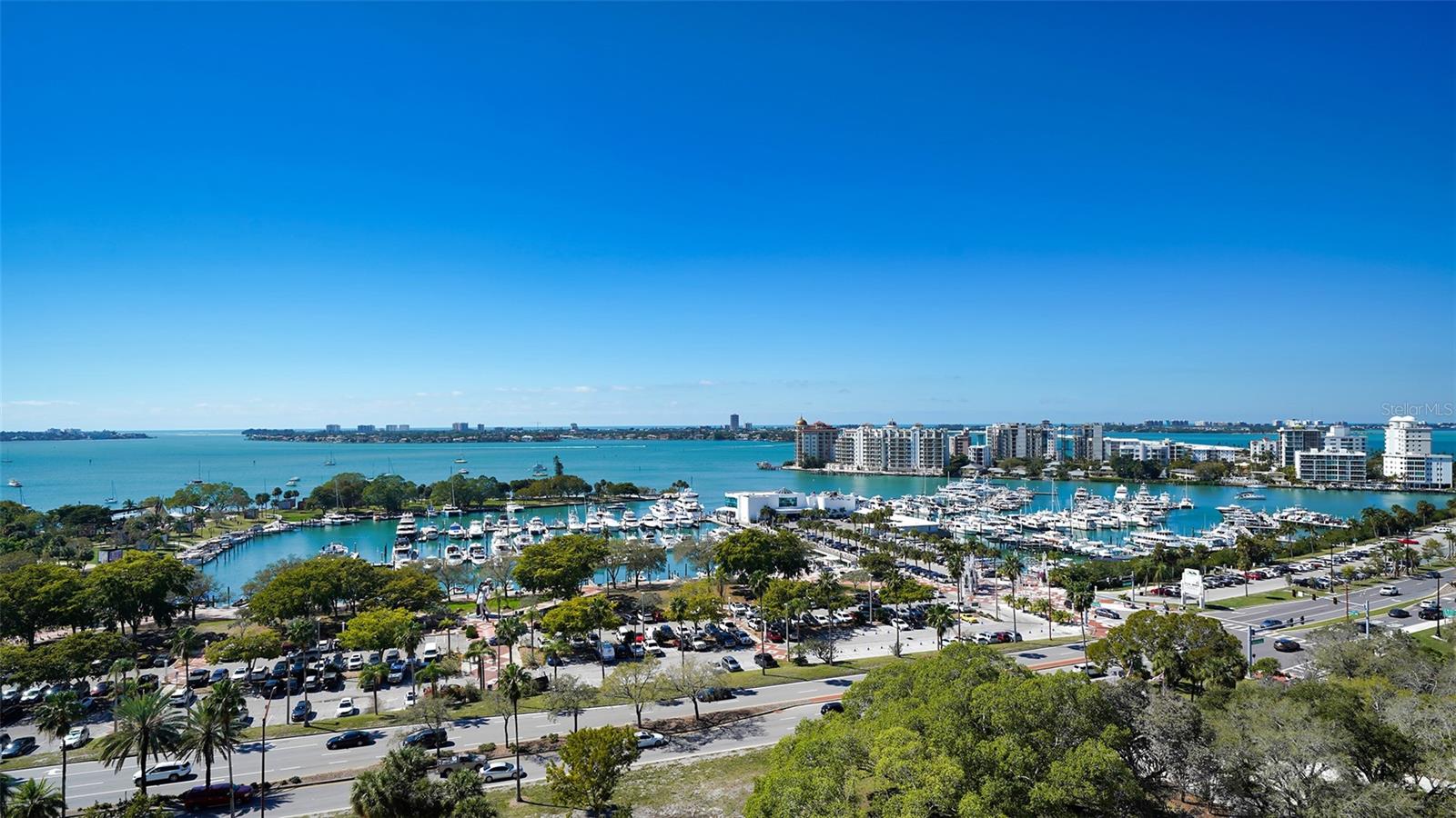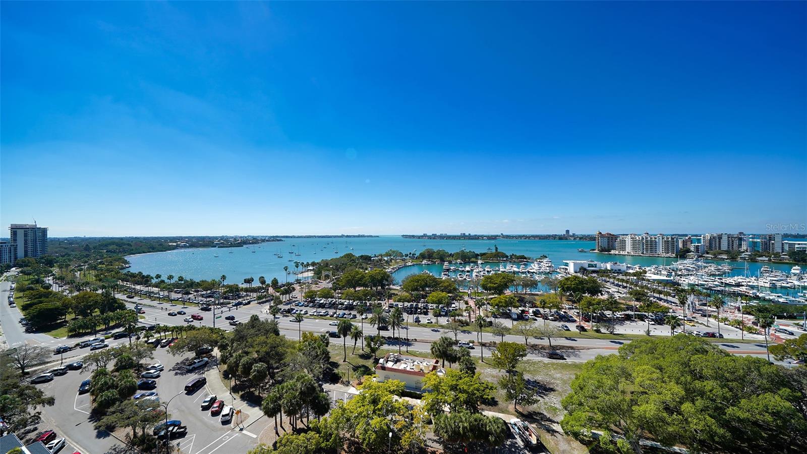 PENTHOUSE with FABULOUS VIEWS of SARASOTA BAY. Elegant Remodel with CONTEMPORARY OPEN DESIGN. Chef’s Kitchen with Cambria Quartz countertop, Fireclay Farm Sink with touchless faucet, Thomasville sold wood cabinets with soft-close drawers and slide-out shelves, two Lazy Susans, double pull-out waste center for trash and recycling, extra cabinets under LARGE KITCHEN BAR. Floors are Porcelain Tile with Herringbone pattern. A focal point in the Great Room is not only the FANTISTIC WATER VIEWS but also a BEAUTIFUL Stack Stone wall. A MODERN OPEN PLAN with 11-foot opening to the bedroom using EightDoor 3-panel frosted glass Barn Door to give extras water views, extra light and privacy when closed. All interior doors are EightDoor 3-panel frosted glass. Bathrooms have motion detector lights. One bathroom features a Heated Bubble Massage Tub and the other bathroom has a SPACIOUS Shower with beautiful glass tile on the wall. Custom Closets and Laundry by the bathroom. Motorized Shades and Keyless Entry for CAREFREE LIVING. The 101 Condominium has had major updates including impact windows and doors, new lobby, fitness center, yoga room, community room with kitchen and added bicycle storage. The final phase of improvements, including the Penthouse glass railings, is scheduled to be completed in 2024. Enjoy the security of the parking garage and the on-site management with concierge service 8:00 AM to 6:00 PM. Enjoy the DOWNTOWN LIFESTYLE living around the corner from Main Street, Palm Avenue, Whole Foods, StarBucks, restaurants, theatre, Selby Library and the Marina. Enjoy jet skiing at Bayfront Park and stay in shape by jogging over the John Ringling Bridge. Only 5 minutes to Lido Beach and St. Armands Circle with over 130 shops and restaurants. This HIGHLY SOUGHT AFTER LOCATION is perfect for you. OPPORTUNITY KNOCKS. . . but HURRY