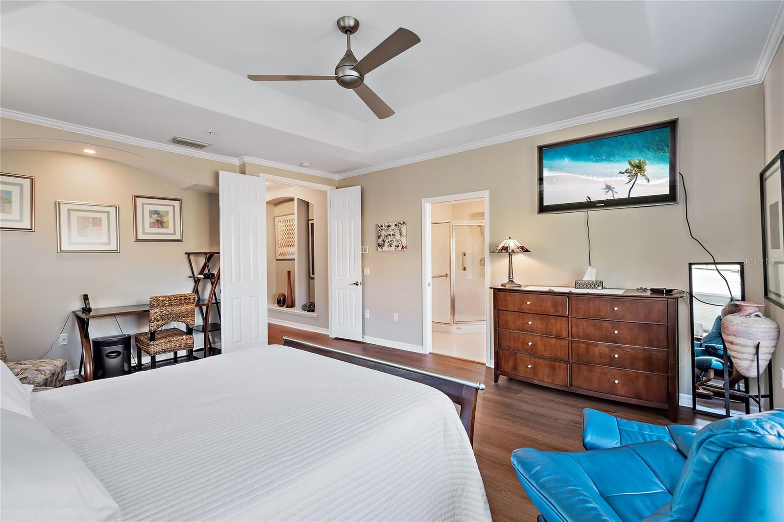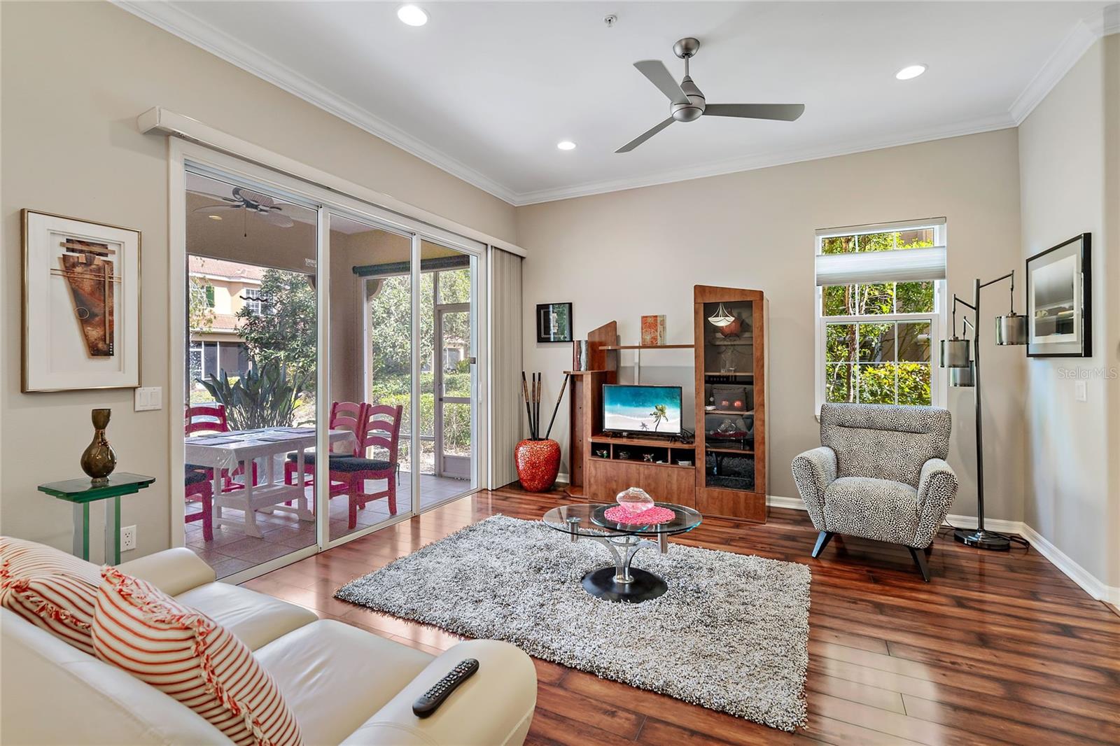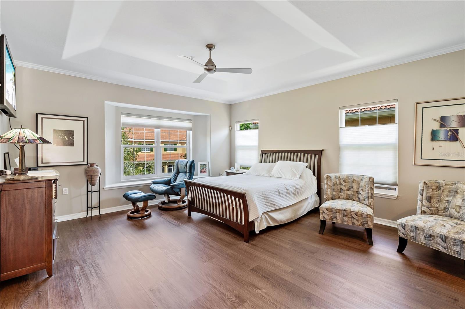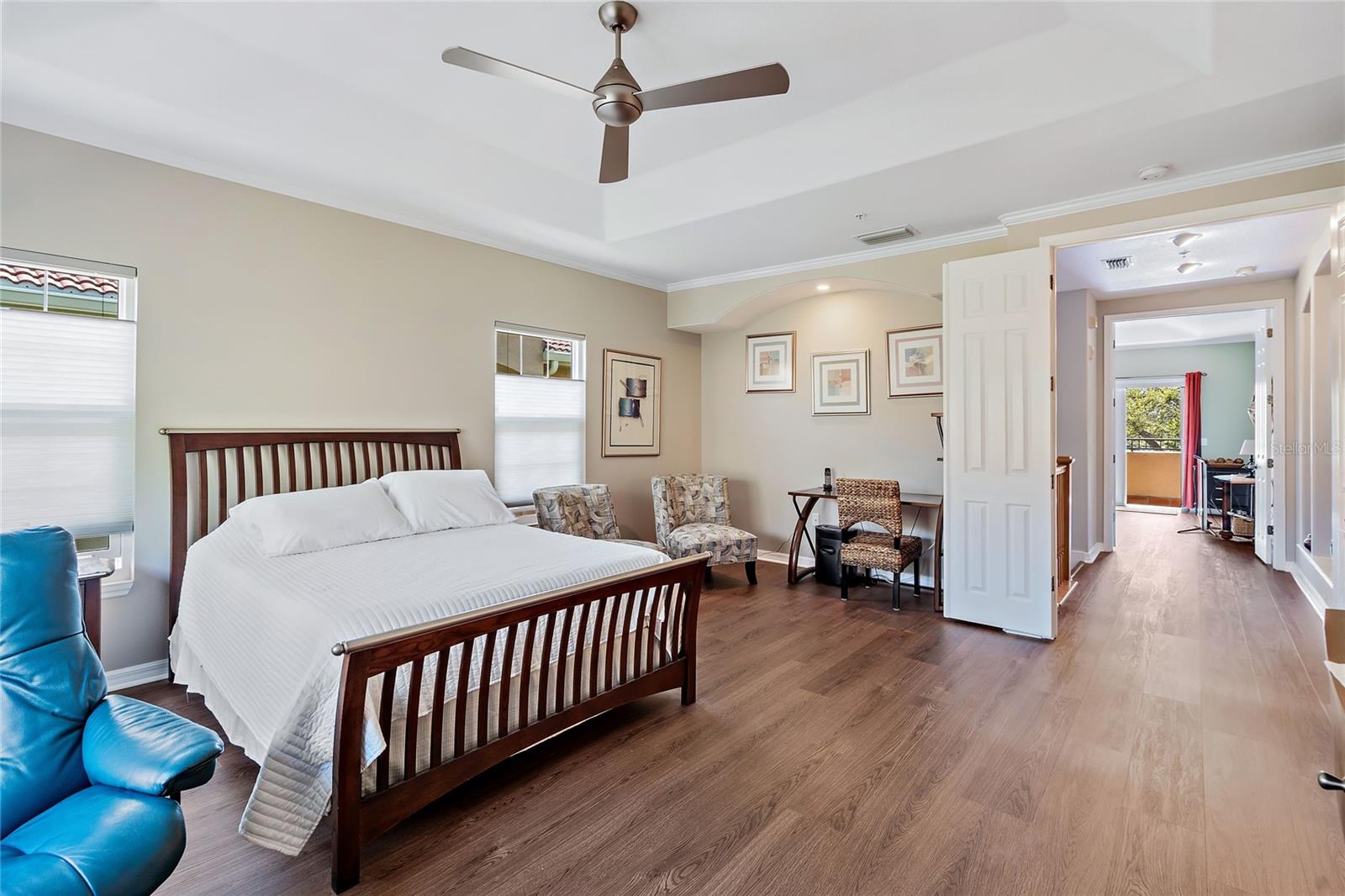 Great opportunity to live in Palmer Square West this turn-key elegantly appointed and nothing missed with a rare 2 car garage townhome. South Sarasota townhome just minutes from the #1 beach in the world! Cathedral and tray ceilings, crown molding with details only this home could display. The large kitchen displays granite countertops and wood cabinets. This is a maintenance free lifestyle featuring brick paver driveway and walkway, newly installed barrel tile roof, community with a beautiful pool and spa both newly resurfaced. This home features two spacious owner suites with ensuite baths and walk in closets. On the 2nd level all new Life-Proof, waterproof Luxury Vinyl Plank flooring, freshly painted and a 2023 new ac system. The third bedroom/den is on the first level which one can use as a home office/den or a 3rd bedroom. The screened lanai overlooks lush landscaping for privacy and beautiful water fountain with peaceful and tranquil water views. Perfect for an afternoon book, morning coffee or relaxing in the evening. Premier location near the Gulf of Mexico, golf, shopping, etc. Walk to Costco, movies, dinner, etc. All windows replaced with PGT 5500. impacted windows EXCEPT dining room window and sliding glass door.