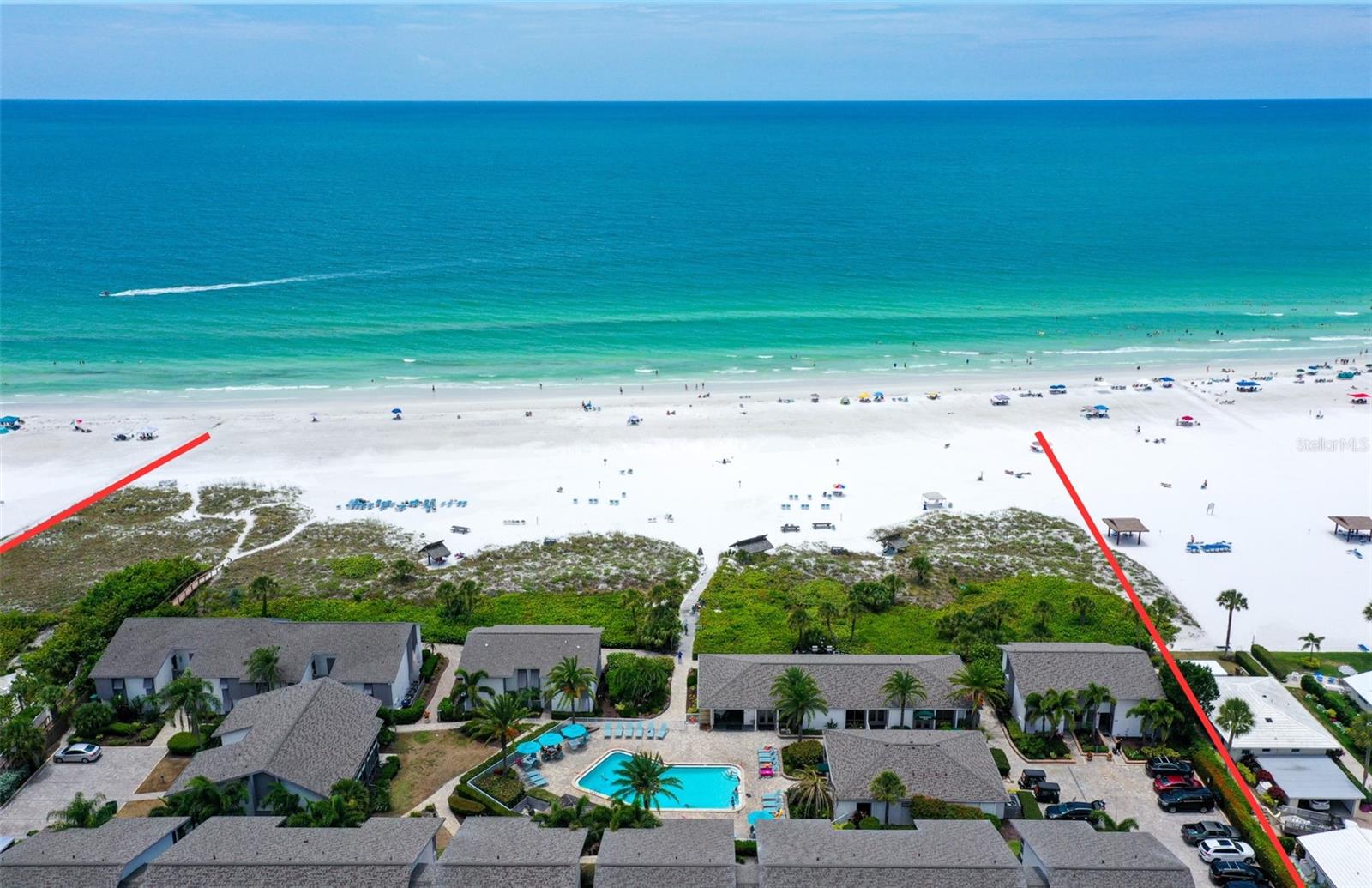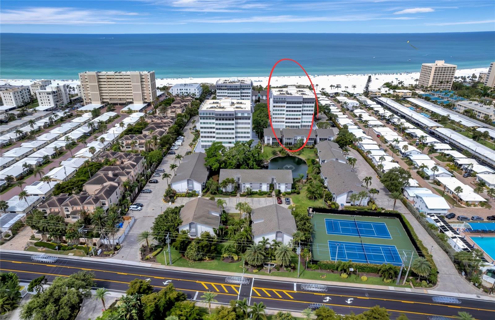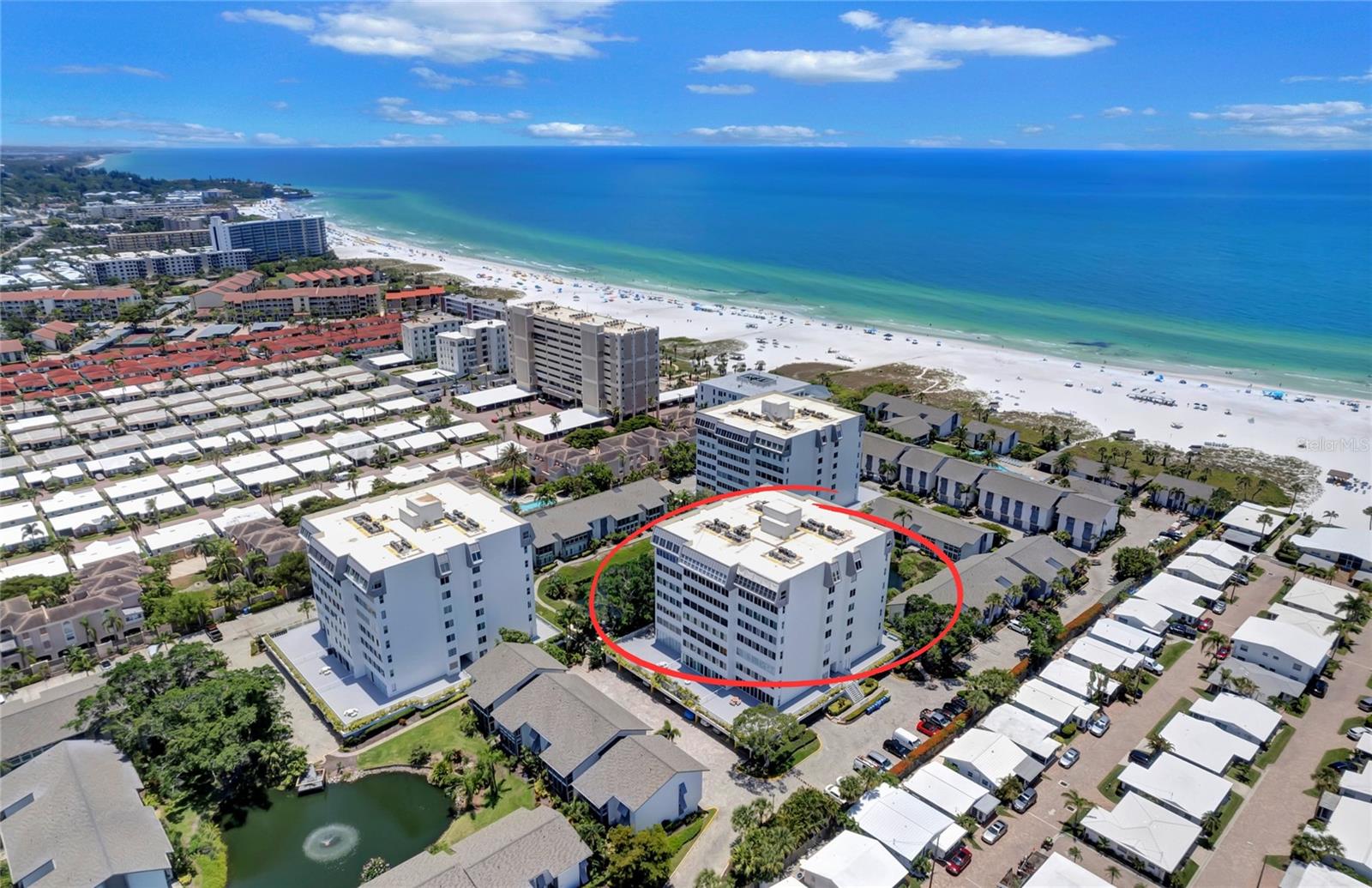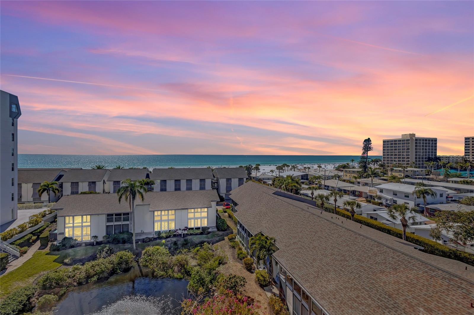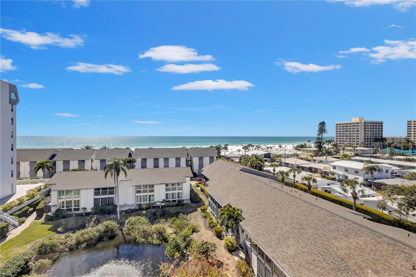PRICE IMPROVEMENT! Stunning Siesta Key Beach, Pond, Gulf & sunset Views! This distinctive 2-bedroom, 2-bath condo on the 5th floor boasts a Spanish architectual influence with a unique coffered beam ceiling in the living room and arched doorways. Enjoy gulf & beach views from the lanai, primary bedroom, guest bedroom, and living room. The interior includes split bedrooms, a spacious living room, and dining area. The primary bedroom features a walk-in closet, while the en-suite bathroom showcases custom cabinets and granite countertops. The guest bathroom offers a walk-in shower, custom wood cabinets, and a granite countertop. Throughout the condo, you'll find tile flooring and crown molding, impact hurricane-rated windows, a 2019 AC unit, and a 2018 tankless water heater. The kitchen is well-appointed with custom wood cabinets, granite countertops, stainless steel appliances, and a built in dining area with a large table. Accommodate your family and friends with the expansive enclosed lanai, offering extra seating, office space, and sleeping arrangements for guests. Sold fully furnished, the condo includes a large laundry room with ample storage cabinets and a full-sized washer and dryer. Benefit from private covered parking space #506 in the under-building garage, complete with a storage bin for beach chairs and toys. Situated within the 16-acre Peppertree Gulf-to-Bay community, enjoy a wealth of amenities including a private beach with chairs, 2 heated pools, 2 clubhouses, multiple BBQ areas, fitness center, sauna, tennis/pickleball courts, and a fishing pier. This secure midrise condo is conveniently located just 78 steps from the beach. On-site management & rental services are available. Explore the village via trolley for local shopping, dining, and entertainment. This piece of paradise is perfect for creating lasting memories with your loved ones. Immerse yourself in Sarasota's arts and culture with this furnished beachfront condo ready for immediate occupancy. Let the adventures unfold.
