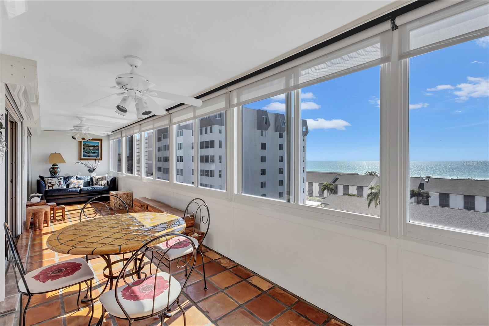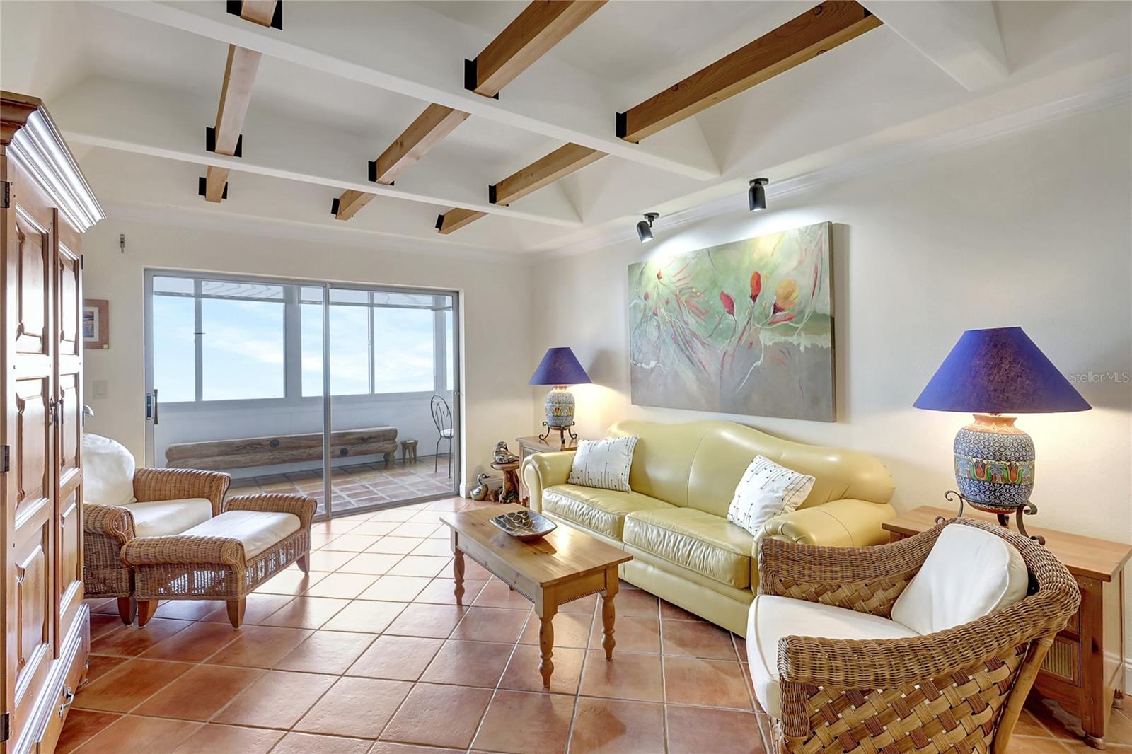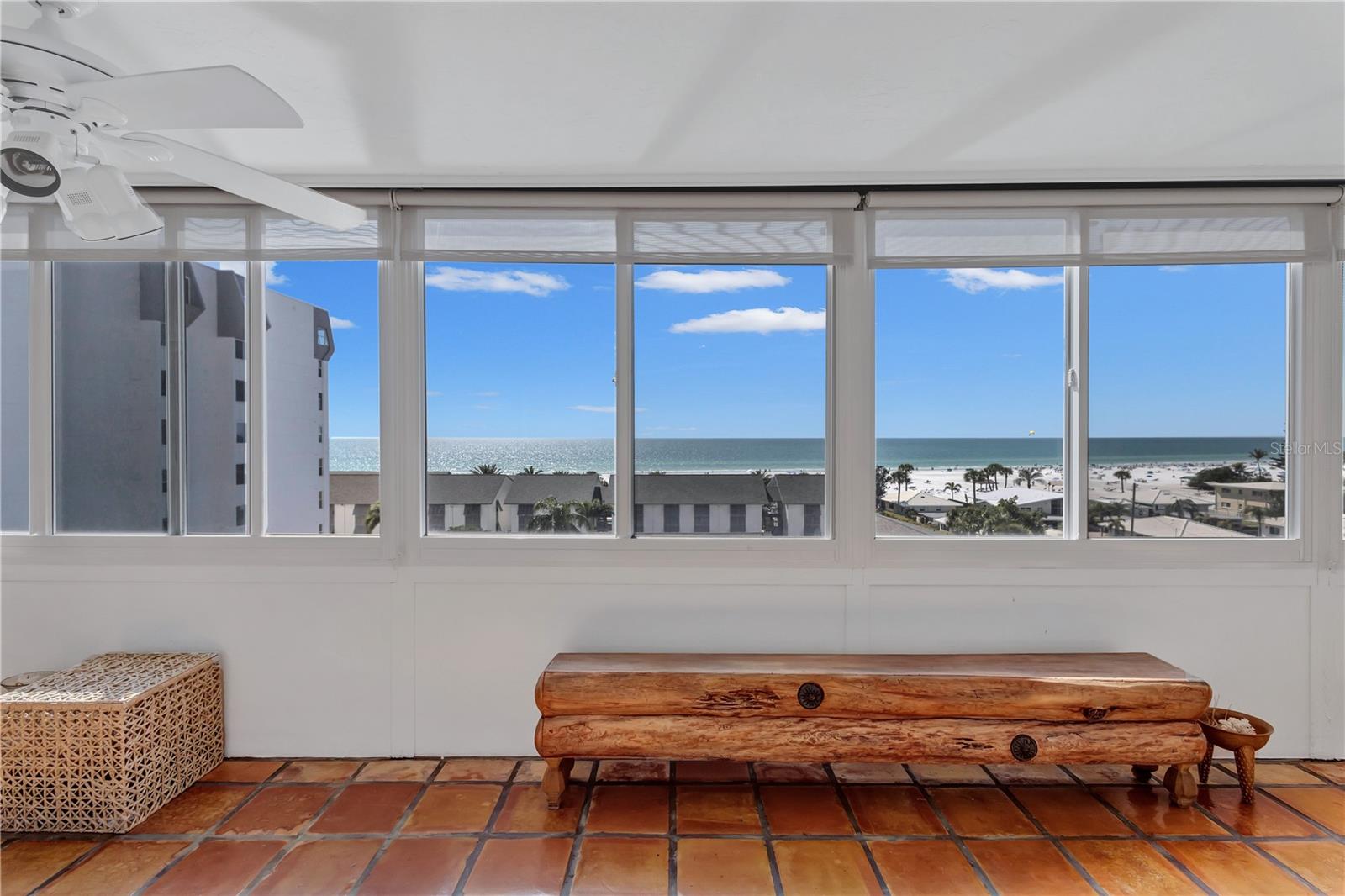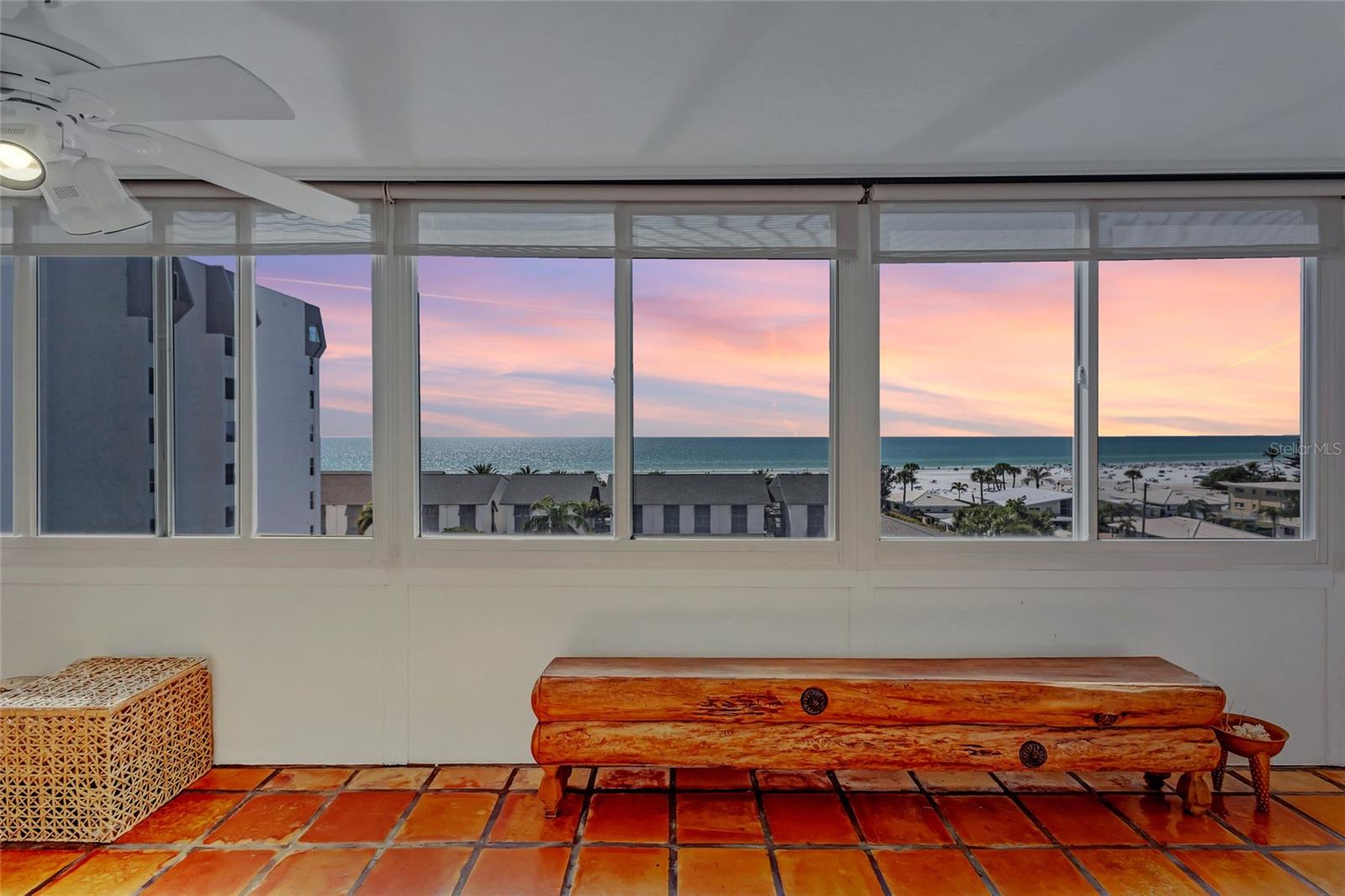 PRICE IMPROVEMENT! Stunning Siesta Key Beach, Pond, Gulf & sunset Views! This distinctive 2-bedroom, 2-bath condo on the 5th floor boasts a Spanish architectual influence with a unique coffered beam ceiling in the living room and arched doorways. Enjoy gulf & beach views from the lanai, primary bedroom, guest bedroom, and living room. The interior includes split bedrooms, a spacious living room, and dining area. The primary bedroom features a walk-in closet, while the en-suite bathroom showcases custom cabinets and granite countertops. The guest bathroom offers a walk-in shower, custom wood cabinets, and a granite countertop. Throughout the condo, you'll find tile flooring and crown molding, impact hurricane-rated windows, a 2019 AC unit, and a 2018 tankless water heater. The kitchen is well-appointed with custom wood cabinets, granite countertops, stainless steel appliances, and a built in dining area with a large table. Accommodate your family and friends with the expansive enclosed lanai, offering extra seating, office space, and sleeping arrangements for guests. Sold fully furnished, the condo includes a large laundry room with ample storage cabinets and a full-sized washer and dryer. Benefit from private covered parking space #506 in the under-building garage, complete with a storage bin for beach chairs and toys. Situated within the 16-acre Peppertree Gulf-to-Bay community, enjoy a wealth of amenities including a private beach with chairs, 2 heated pools, 2 clubhouses, multiple BBQ areas, fitness center, sauna, tennis/pickleball courts, and a fishing pier. This secure midrise condo is conveniently located just 78 steps from the beach. On-site management & rental services are available. Explore the village via trolley for local shopping, dining, and entertainment. This piece of paradise is perfect for creating lasting memories with your loved ones. Immerse yourself in Sarasota's arts and culture with this furnished beachfront condo ready for immediate occupancy. Let the adventures unfold.