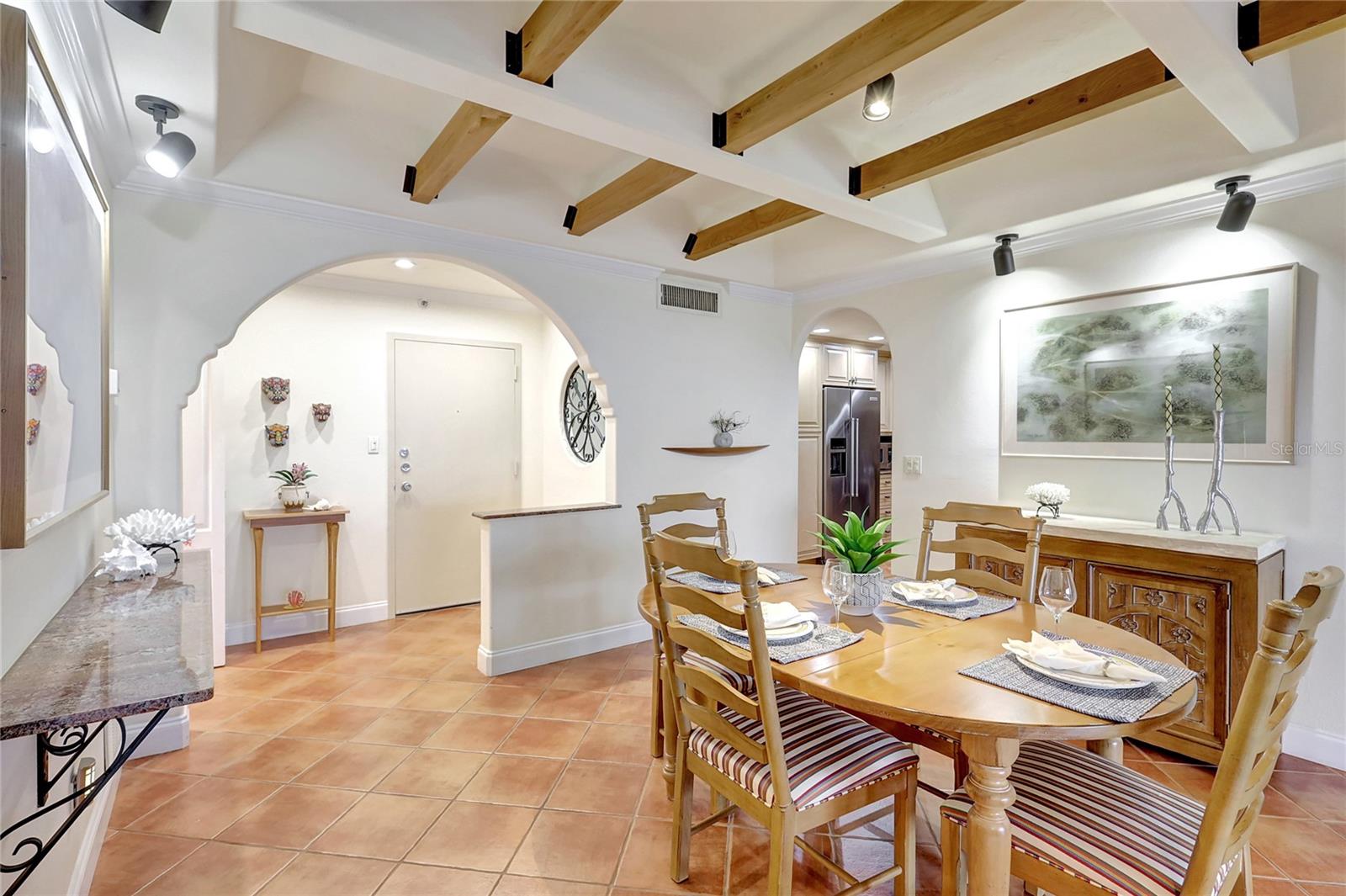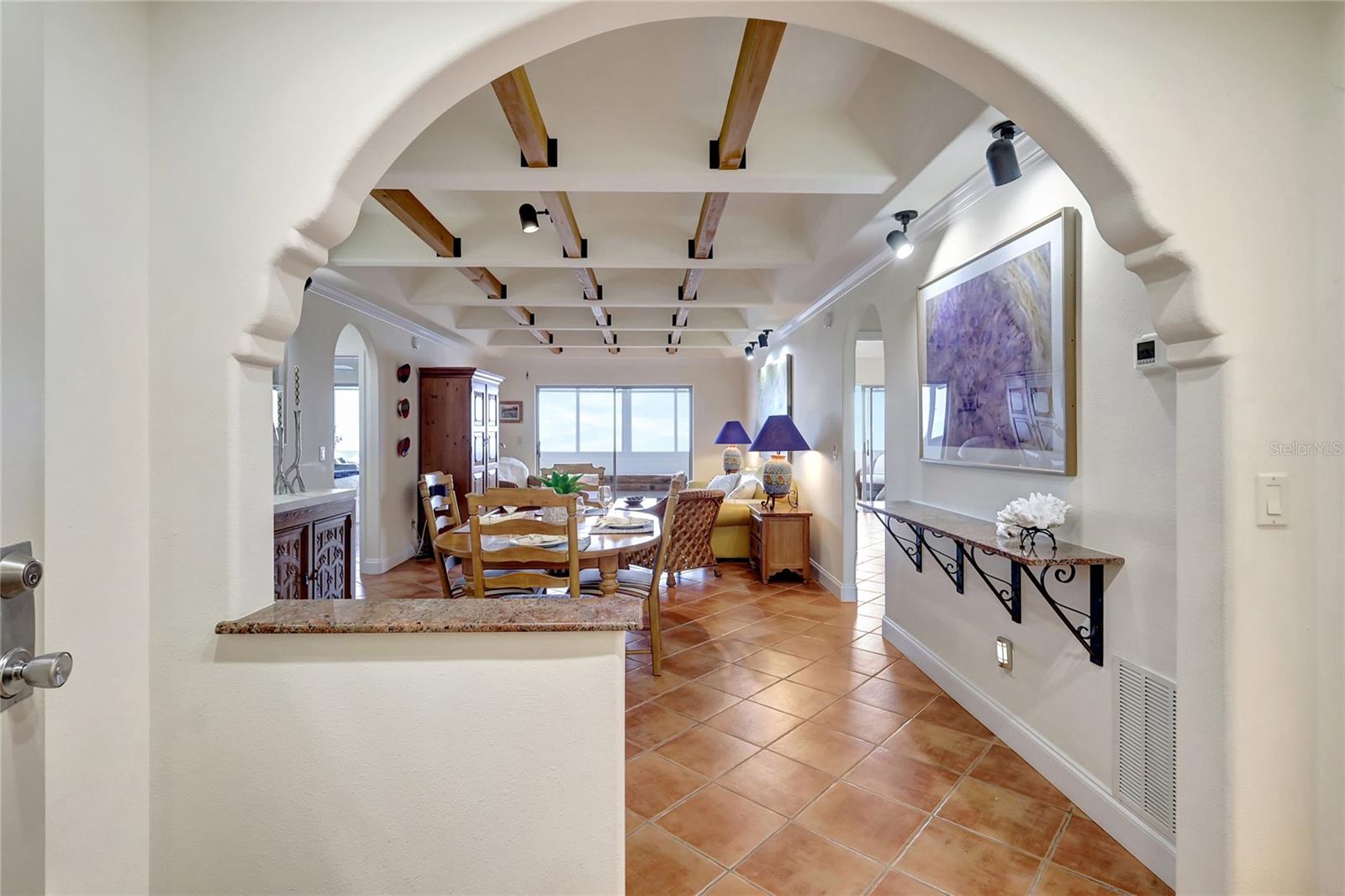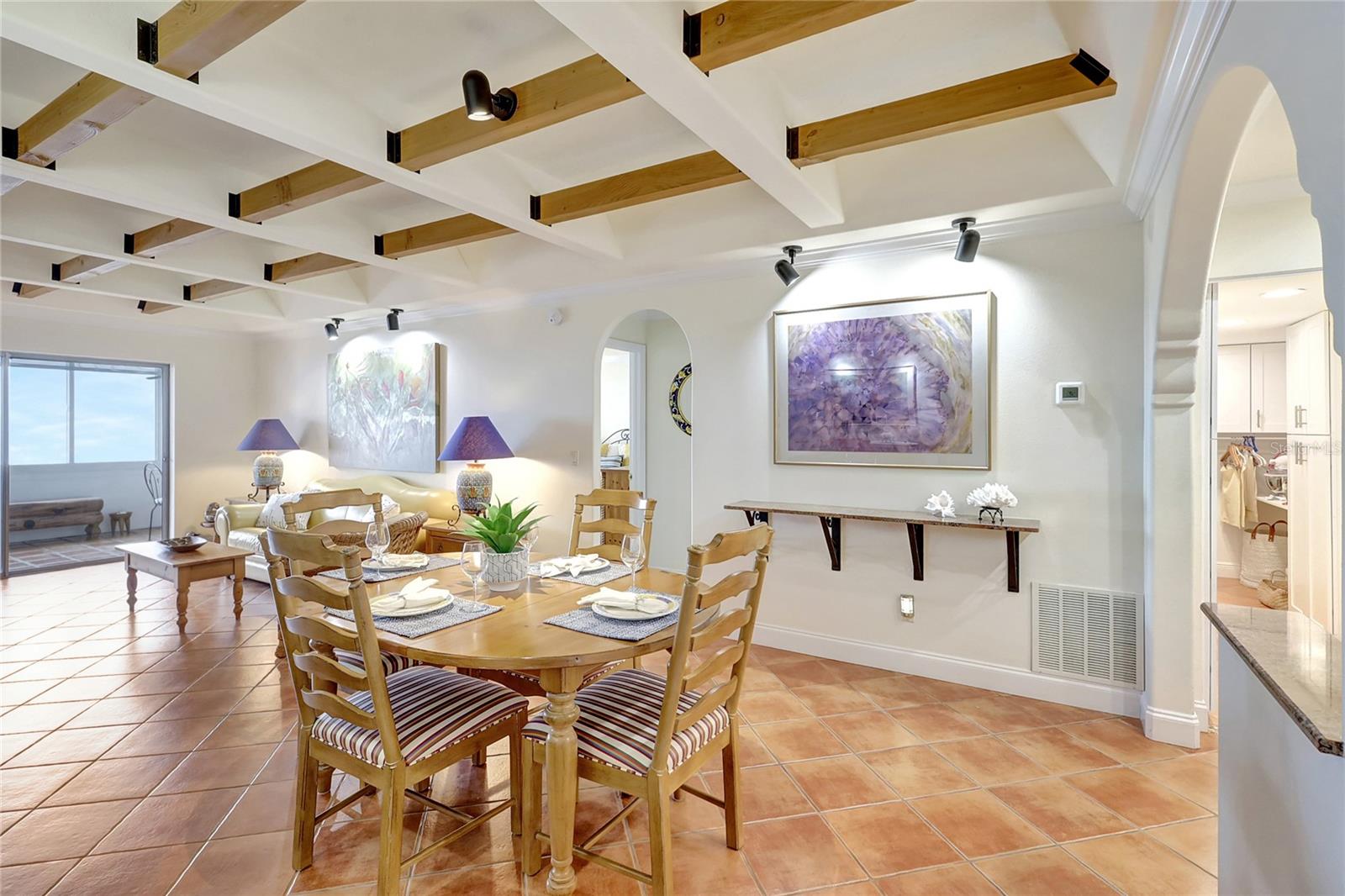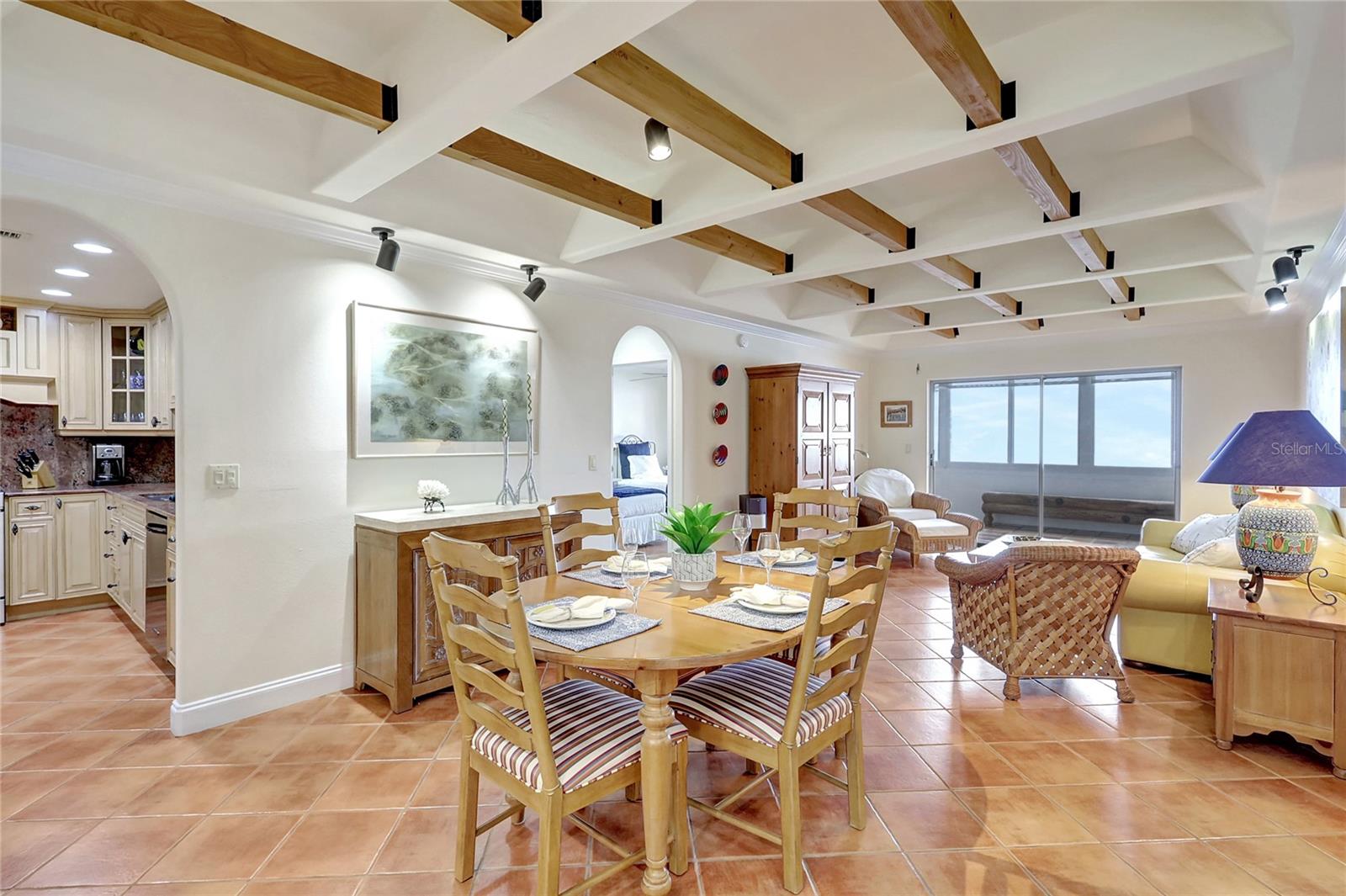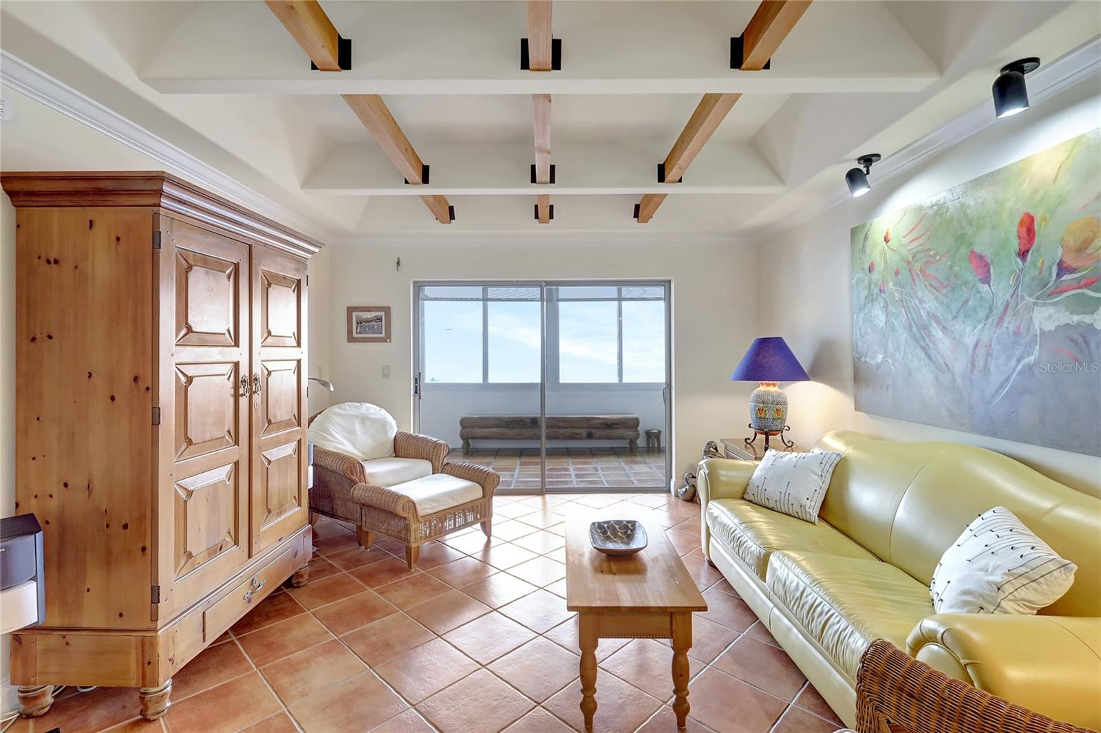 PRICE IMPROVEMENT! Stunning Siesta Key Beach, Pond, Gulf & sunset Views! This distinctive 2-bedroom, 2-bath condo on the 5th floor boasts a Spanish architectual influence with a unique coffered beam ceiling in the living room and arched doorways. Enjoy gulf & beach views from the lanai, primary bedroom, guest bedroom, and living room. The interior includes split bedrooms, a spacious living room, and dining area. The primary bedroom features a walk-in closet, while the en-suite bathroom showcases custom cabinets and granite countertops. The guest bathroom offers a walk-in shower, custom wood cabinets, and a granite countertop. Throughout the condo, you'll find tile flooring and crown molding, impact hurricane-rated windows, a 2019 AC unit, and a 2018 tankless water heater. The kitchen is well-appointed with custom wood cabinets, granite countertops, stainless steel appliances, and a built in dining area with a large table. Accommodate your family and friends with the expansive enclosed lanai, offering extra seating, office space, and sleeping arrangements for guests. Sold fully furnished, the condo includes a large laundry room with ample storage cabinets and a full-sized washer and dryer. Benefit from private covered parking space #506 in the under-building garage, complete with a storage bin for beach chairs and toys. Situated within the 16-acre Peppertree Gulf-to-Bay community, enjoy a wealth of amenities including a private beach with chairs, 2 heated pools, 2 clubhouses, multiple BBQ areas, fitness center, sauna, tennis/pickleball courts, and a fishing pier. This secure midrise condo is conveniently located just 78 steps from the beach. On-site management & rental services are available. Explore the village via trolley for local shopping, dining, and entertainment. This piece of paradise is perfect for creating lasting memories with your loved ones. Immerse yourself in Sarasota's arts and culture with this furnished beachfront condo ready for immediate occupancy. Let the adventures unfold.