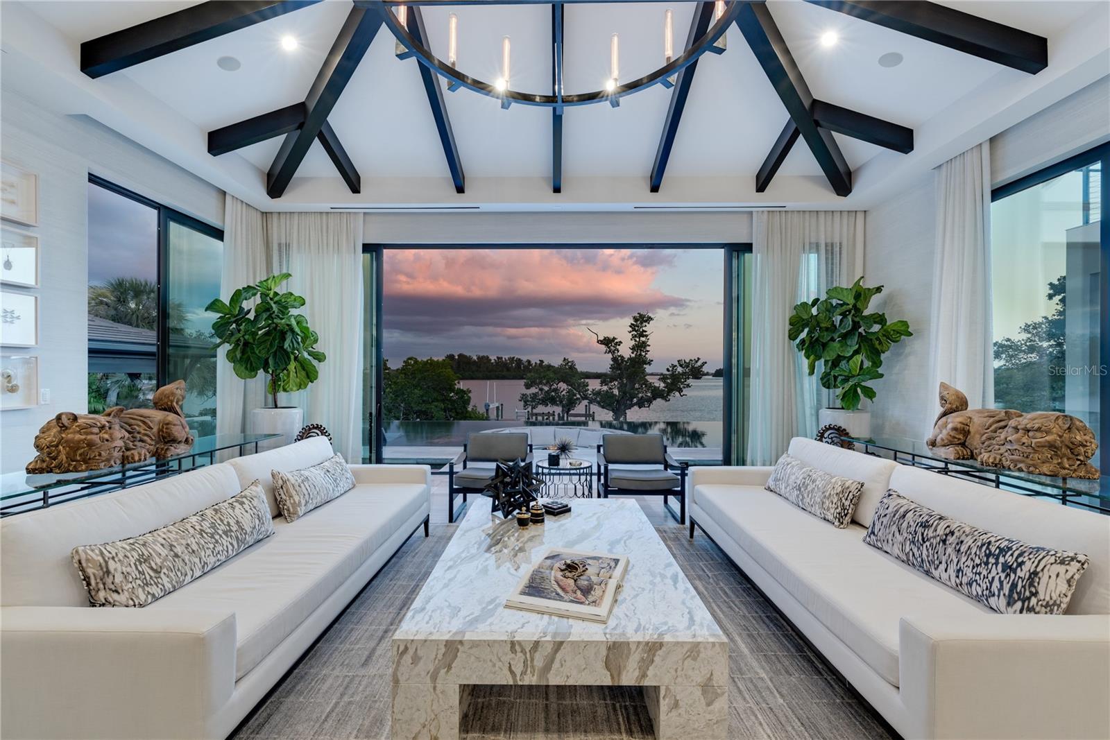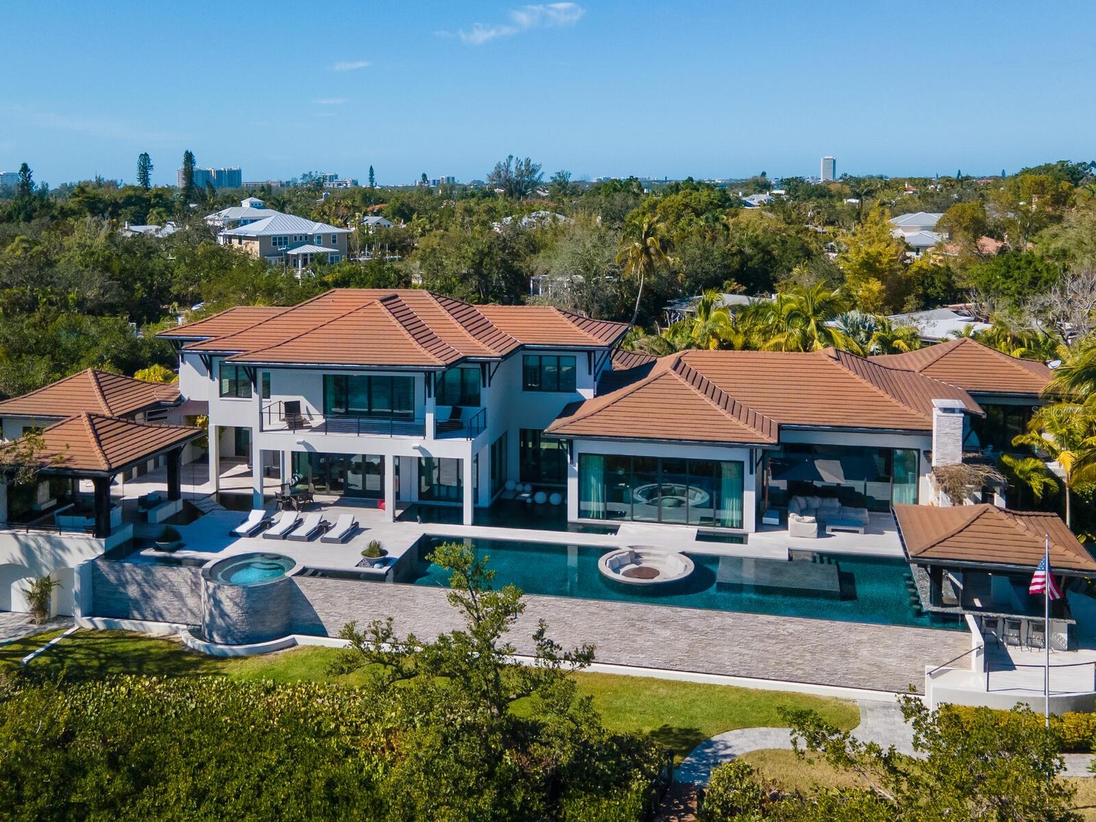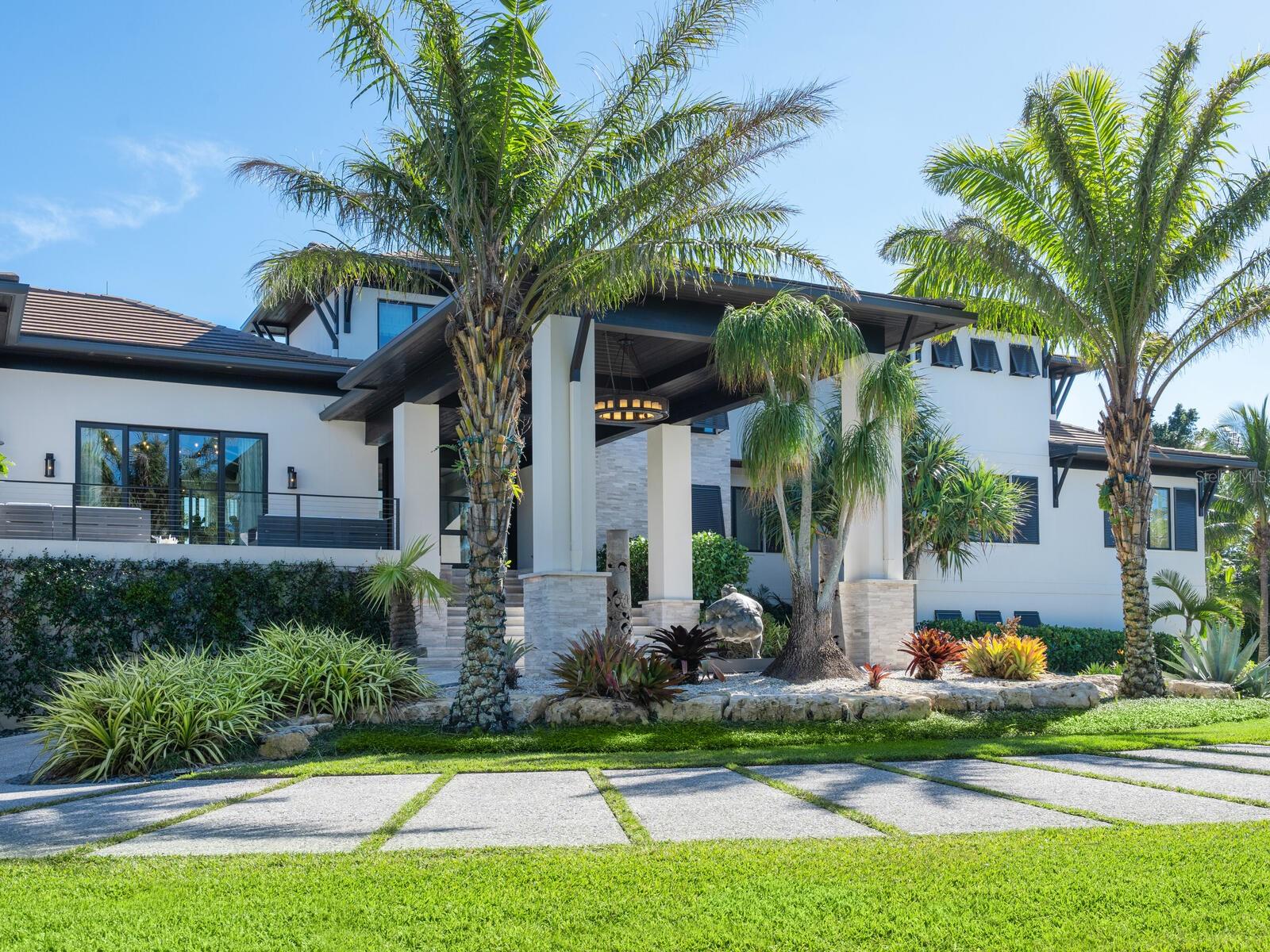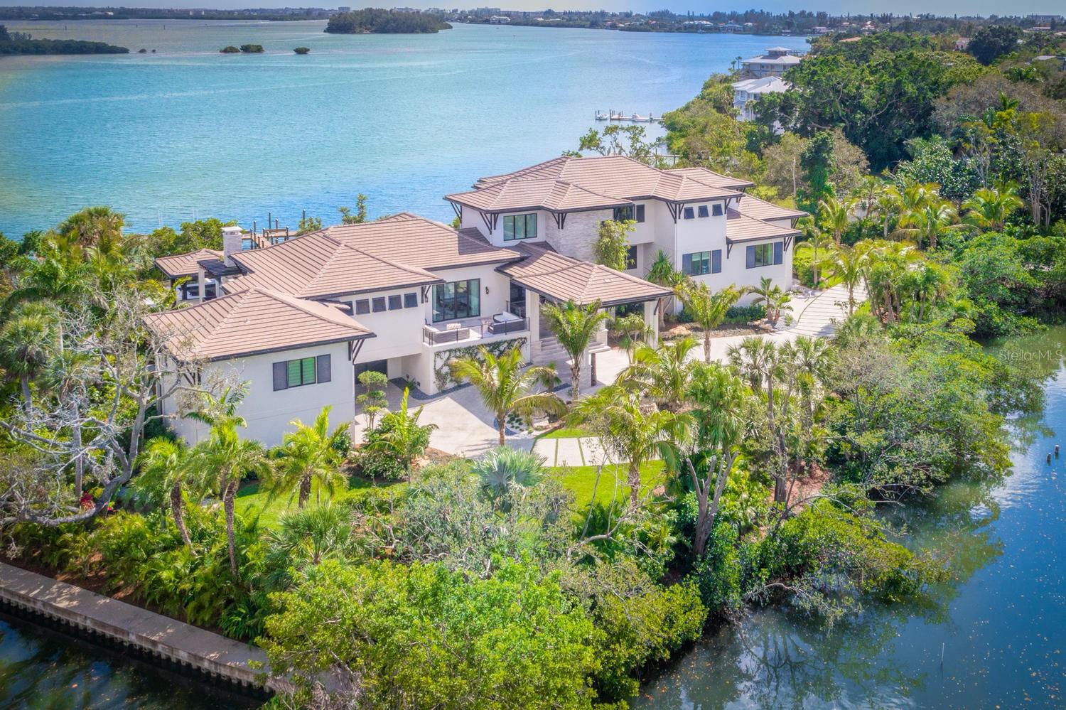 Relax and take in the positive energy of Lotus-style living in this one-of-a-kind Balinese-inspired resort compound on the north end of the world-famous Siesta Key. Nothing is needed to begin your Zen journey as the property comes completely furnished down to dishes, silverware and a Buddha living wall. The true coexistence of indoor and outdoor space blends over 8,000 square feet of indoor space with thousands of square feet of patio and pool area. An outdoor oasis offering an infinity-edge pool with a swim-up bar, a sunken fire pit lounge within the pool, a spa, an outdoor kitchen, a dining pavilion with a living plant wall and an open-air living room with fireplace. A koi pond with stunning built-in footbridges stretches nearly the entire length of the home, enhancing the serene ambiance of the outdoor space. Spanning over an acre with more than 700 feet of waterfront, the property is a masterpiece of luxury, designed for effortless relaxed living or island-style entertaining. A custom-designed driveway welcomes you to a breathtaking entrance, where waterfalls and fire features set the tone for the experience that awaits inside. Expansive walls of glass, seamless indoor-outdoor transitions, and rich wood and stone flooring throughout create a striking, cohesive aesthetic. The thoughtfully designed interior boasts multiple living spaces, including a game room, home theater, fitness room, meditation space, and an impressive 8+ car garage. For the waterfront enthusiast, a well-equipped boat dock, a separate waterfront garage, and a paddleboard/canoe launch provide unparalleled access to the pristine waters. This exceptional residence also features a newer seawall, full-house generator, Crestron home automation, a 3-stop elevator, and a whole-house reverse-osmosis water filtration system, ensuring both convenience and peace of mind. A true island paradise, this estate offers unmatched privacy while remaining just moments from Sarasota’s vibrant shopping, dining, and world-renowned cultural attractions. Don’t miss this rare opportunity to own a move-in-ready masterpiece on Siesta Key – home to the #1 beach in the USA (Tripadvisor).