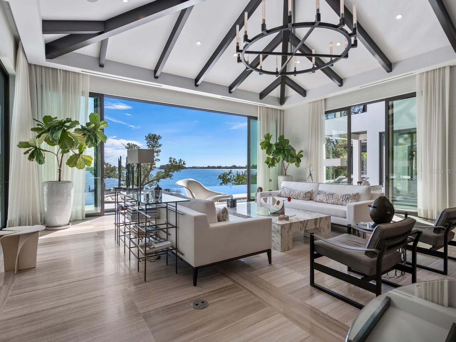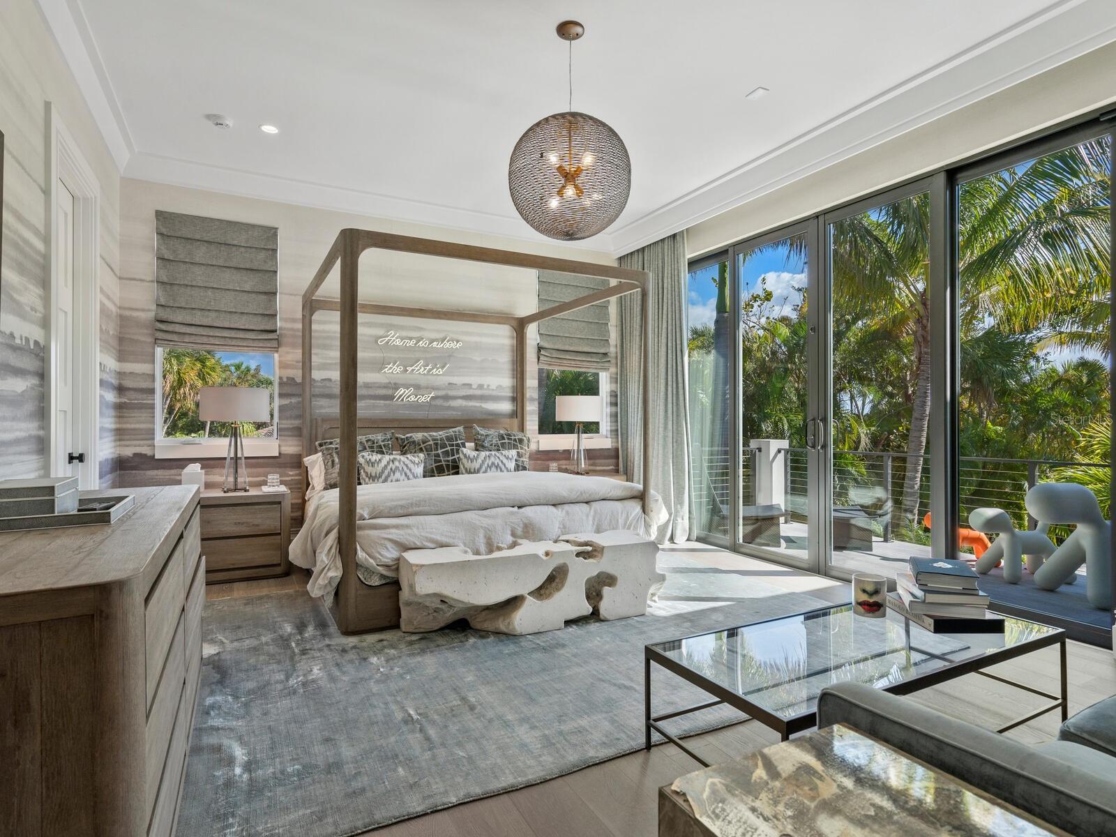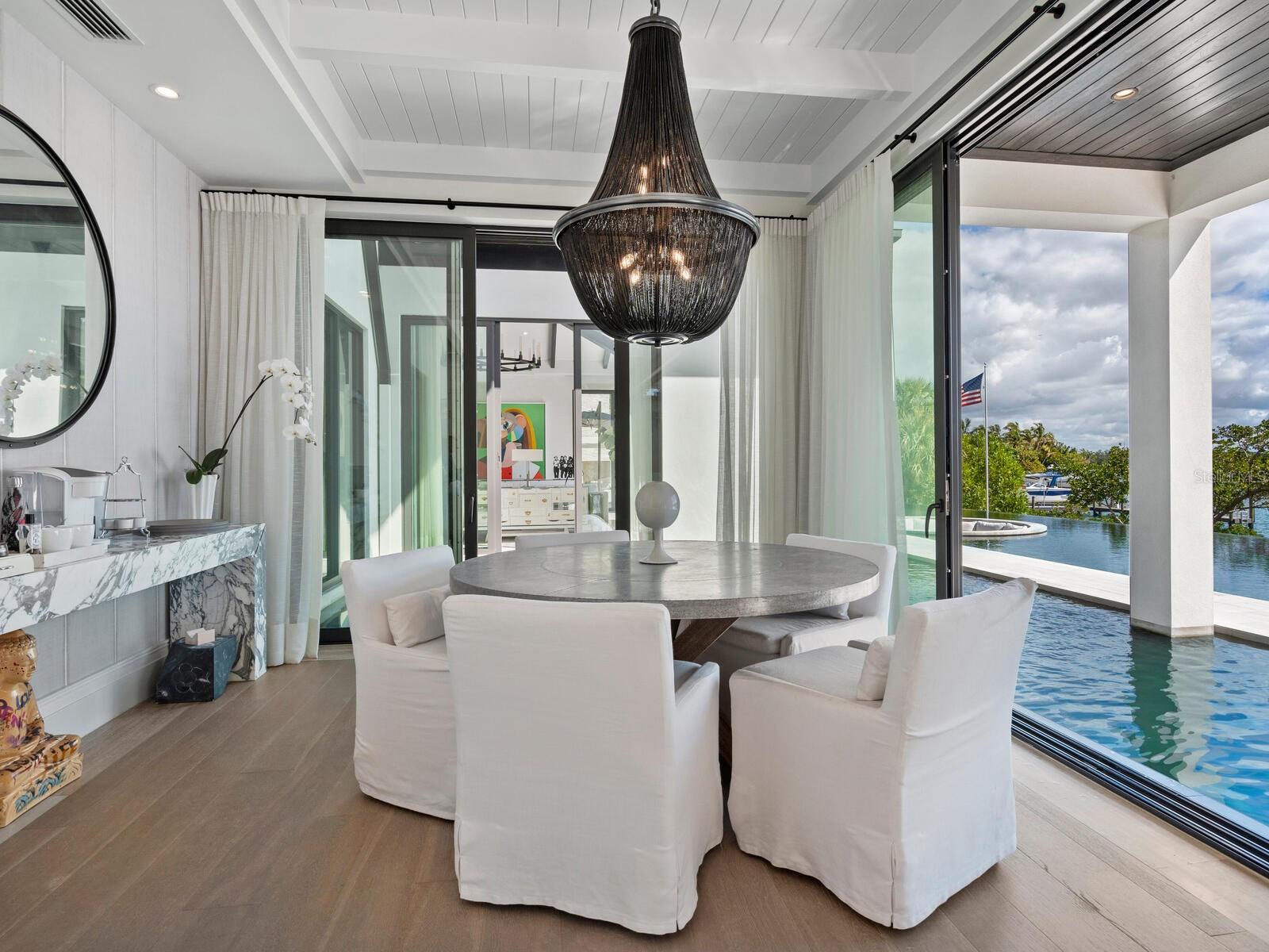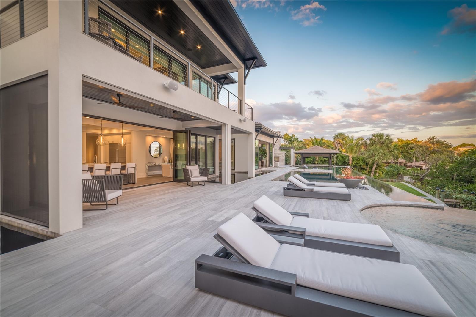 Relax and take in the positive energy of Lotus-style living in this one-of-a-kind Balinese-inspired resort compound on the north end of the world-famous Siesta Key. Nothing is needed to begin your Zen journey as the property comes completely furnished down to dishes, silverware and a Buddha living wall. The true coexistence of indoor and outdoor space blends over 8,000 square feet of indoor space with thousands of square feet of patio and pool area. An outdoor oasis offering an infinity-edge pool with a swim-up bar, a sunken fire pit lounge within the pool, a spa, an outdoor kitchen, a dining pavilion with a living plant wall and an open-air living room with fireplace. A koi pond with stunning built-in footbridges stretches nearly the entire length of the home, enhancing the serene ambiance of the outdoor space. Spanning over an acre with more than 700 feet of waterfront, the property is a masterpiece of luxury, designed for effortless relaxed living or island-style entertaining. A custom-designed driveway welcomes you to a breathtaking entrance, where waterfalls and fire features set the tone for the experience that awaits inside. Expansive walls of glass, seamless indoor-outdoor transitions, and rich wood and stone flooring throughout create a striking, cohesive aesthetic. The thoughtfully designed interior boasts multiple living spaces, including a game room, home theater, fitness room, meditation space, and an impressive 8+ car garage. For the waterfront enthusiast, a well-equipped boat dock, a separate waterfront garage, and a paddleboard/canoe launch provide unparalleled access to the pristine waters. This exceptional residence also features a newer seawall, full-house generator, Crestron home automation, a 3-stop elevator, and a whole-house reverse-osmosis water filtration system, ensuring both convenience and peace of mind. A true island paradise, this estate offers unmatched privacy while remaining just moments from Sarasota’s vibrant shopping, dining, and world-renowned cultural attractions. Don’t miss this rare opportunity to own a move-in-ready masterpiece on Siesta Key – home to the #1 beach in the USA (Tripadvisor).