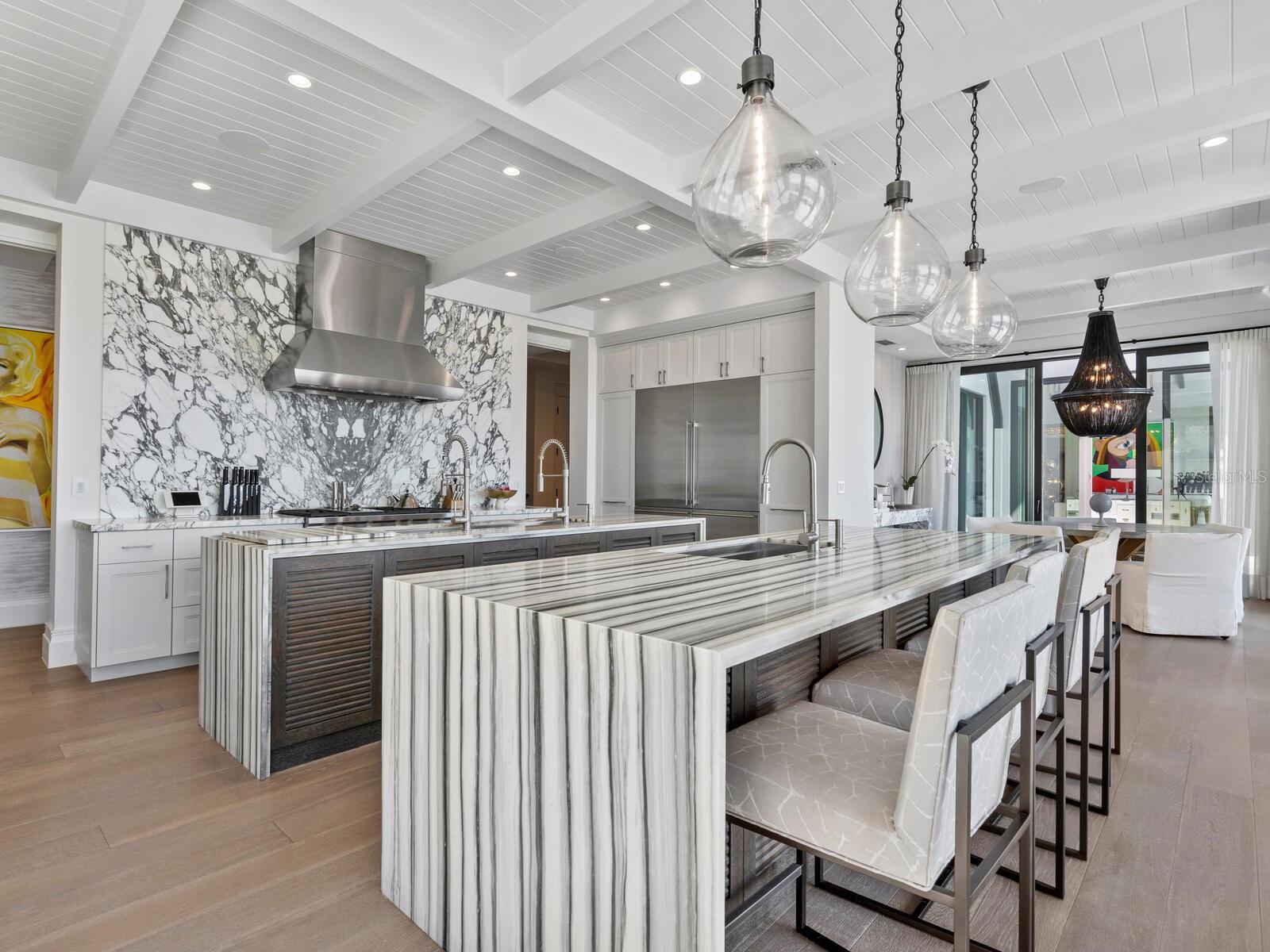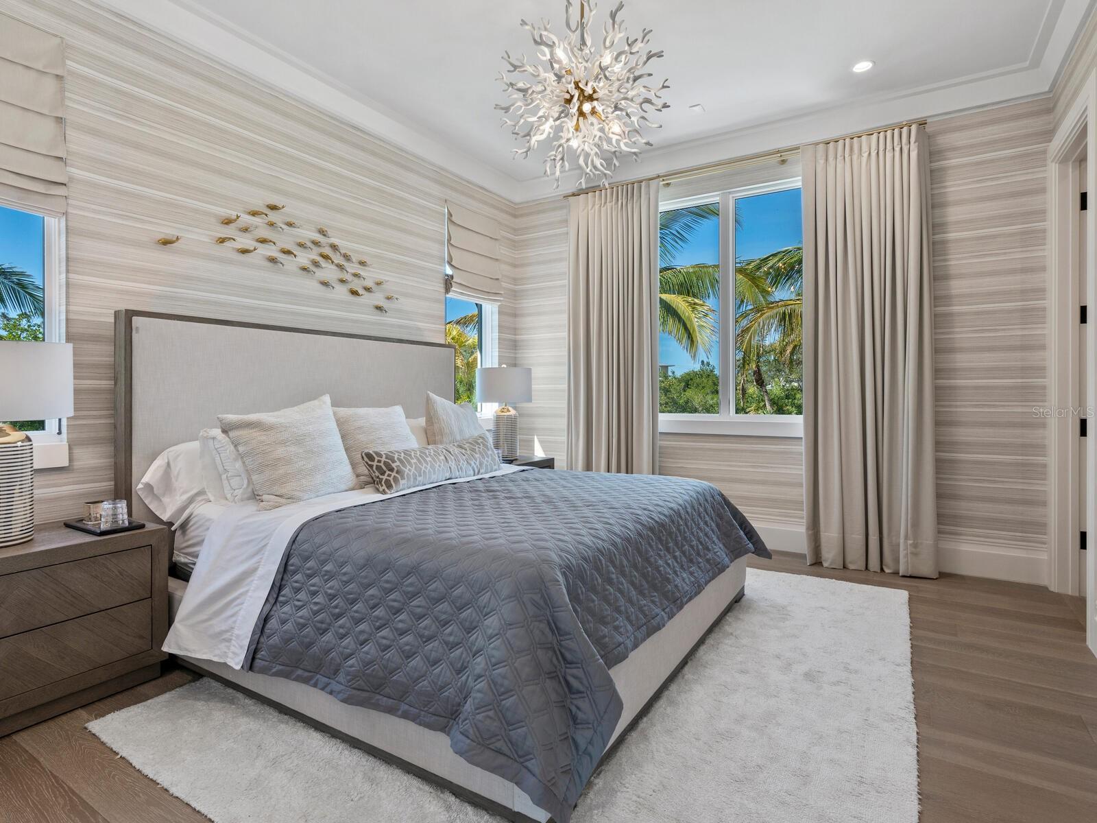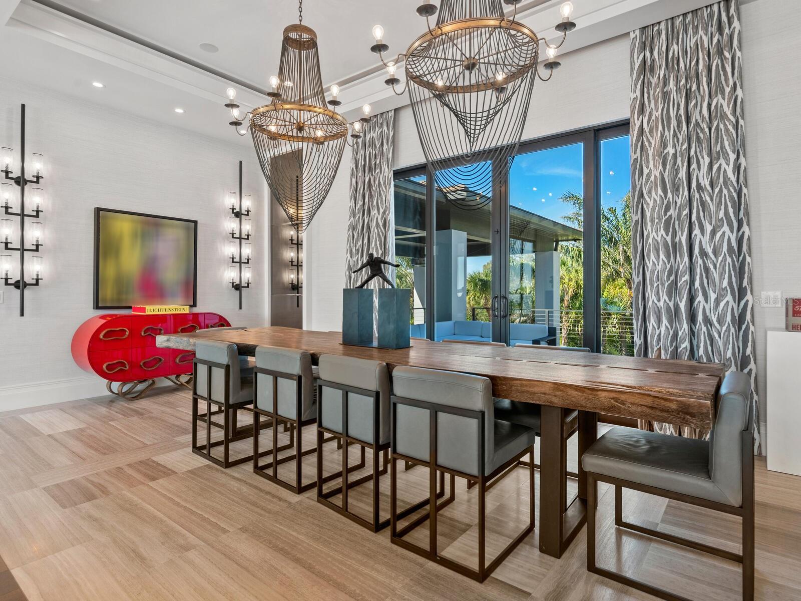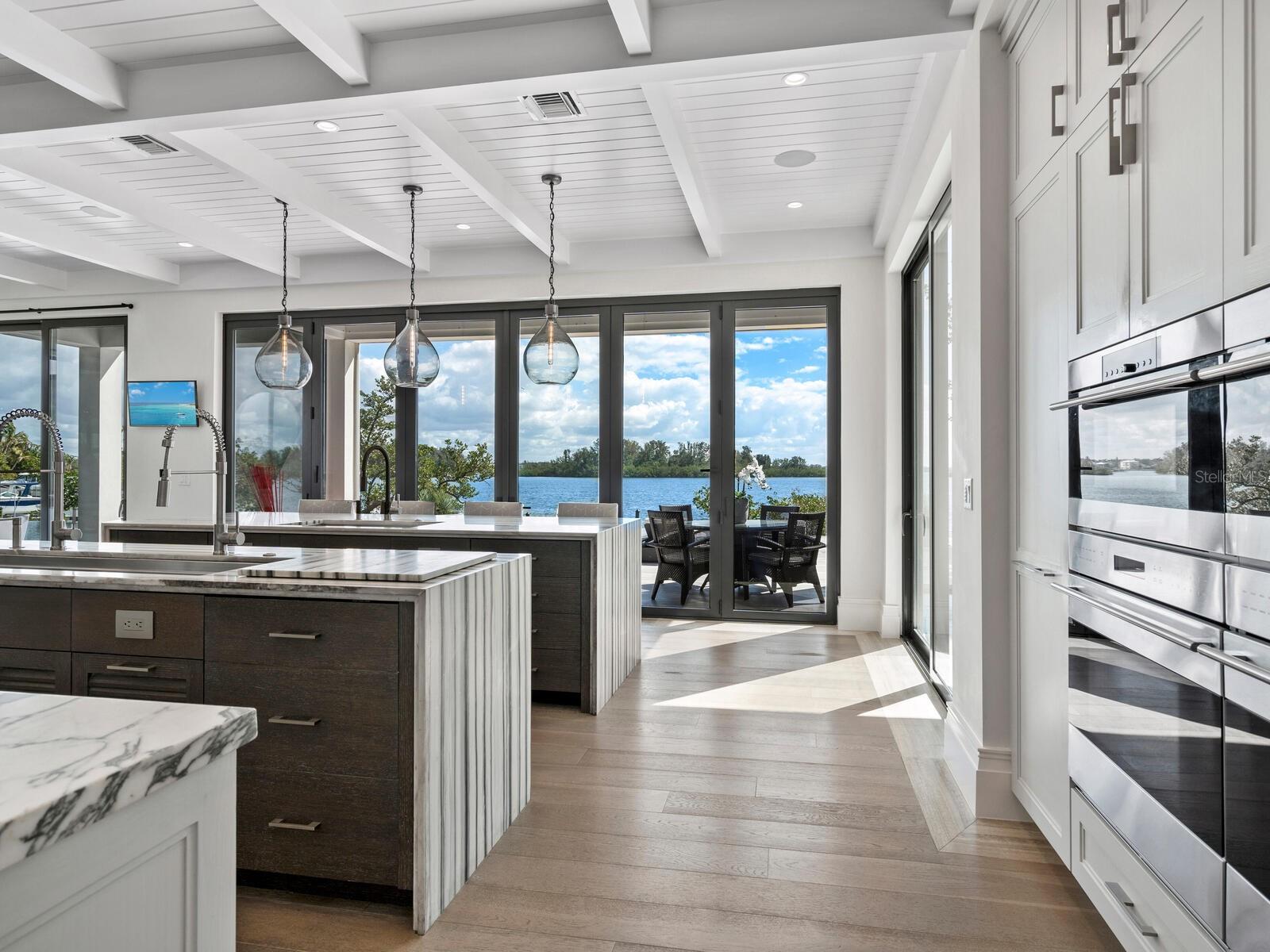 Relax and take in the positive energy of Lotus-style living in this one-of-a-kind Balinese-inspired resort compound on the north end of the world-famous Siesta Key. Nothing is needed to begin your Zen journey as the property comes completely furnished down to dishes, silverware and a Buddha living wall. The true coexistence of indoor and outdoor space blends over 8,000 square feet of indoor space with thousands of square feet of patio and pool area. An outdoor oasis offering an infinity-edge pool with a swim-up bar, a sunken fire pit lounge within the pool, a spa, an outdoor kitchen, a dining pavilion with a living plant wall and an open-air living room with fireplace. A koi pond with stunning built-in footbridges stretches nearly the entire length of the home, enhancing the serene ambiance of the outdoor space. Spanning over an acre with more than 700 feet of waterfront, the property is a masterpiece of luxury, designed for effortless relaxed living or island-style entertaining. A custom-designed driveway welcomes you to a breathtaking entrance, where waterfalls and fire features set the tone for the experience that awaits inside. Expansive walls of glass, seamless indoor-outdoor transitions, and rich wood and stone flooring throughout create a striking, cohesive aesthetic. The thoughtfully designed interior boasts multiple living spaces, including a game room, home theater, fitness room, meditation space, and an impressive 8+ car garage. For the waterfront enthusiast, a well-equipped boat dock, a separate waterfront garage, and a paddleboard/canoe launch provide unparalleled access to the pristine waters. This exceptional residence also features a newer seawall, full-house generator, Crestron home automation, a 3-stop elevator, and a whole-house reverse-osmosis water filtration system, ensuring both convenience and peace of mind. A true island paradise, this estate offers unmatched privacy while remaining just moments from Sarasota’s vibrant shopping, dining, and world-renowned cultural attractions. Don’t miss this rare opportunity to own a move-in-ready masterpiece on Siesta Key – home to the #1 beach in the USA (Tripadvisor).