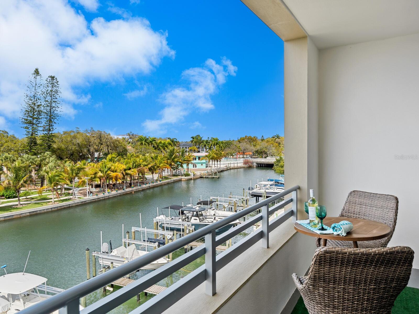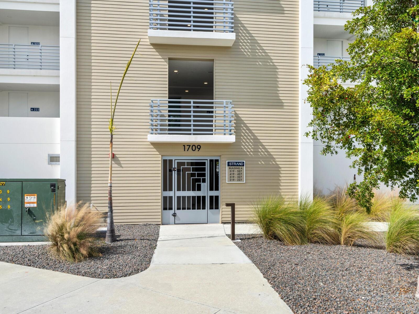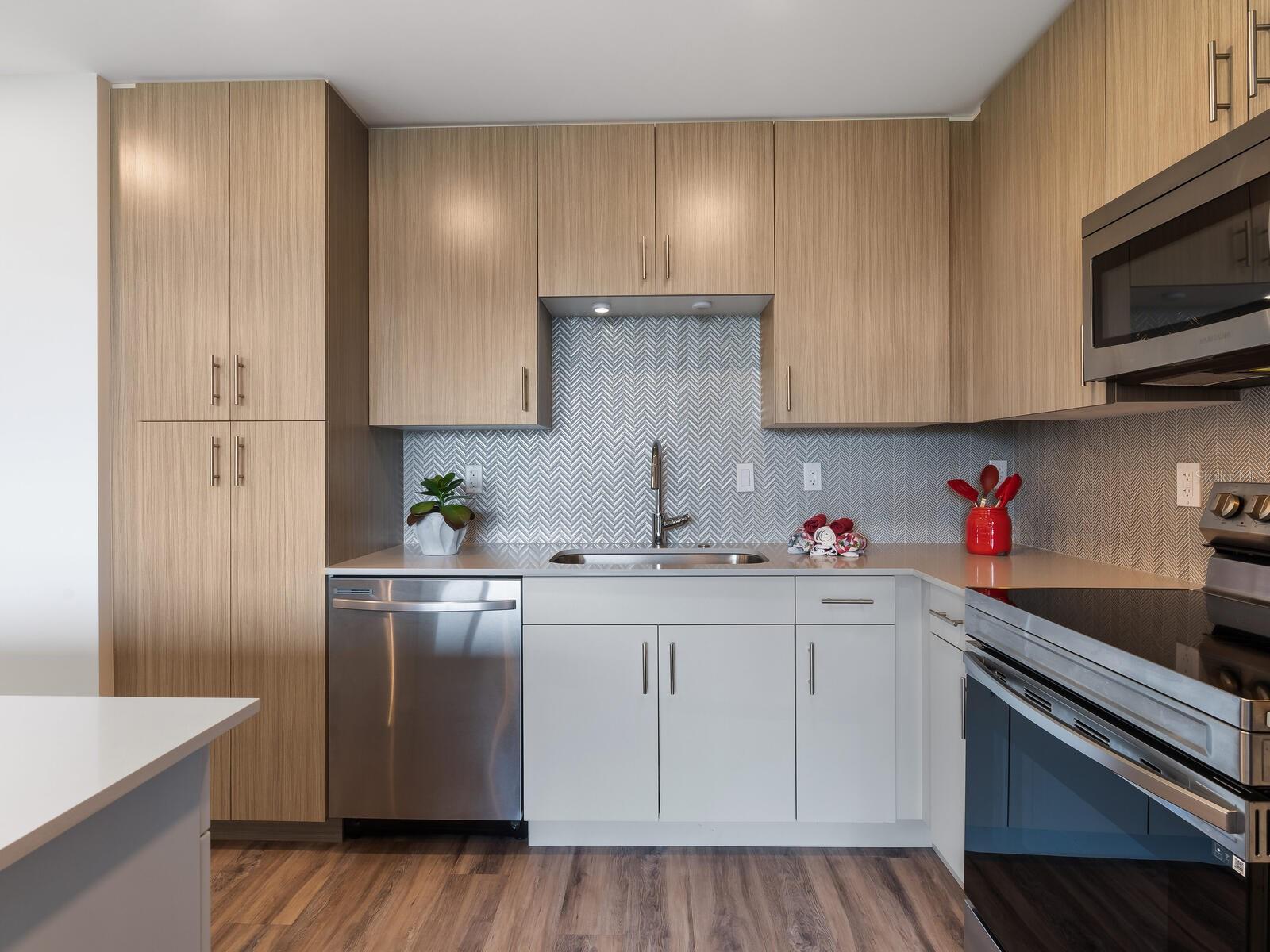 Newer construction, completed in 2022, The Strand is a gated community and comprised of 2 buildings with a total of 152 units and 47 boat slips with resort style amenities. Modern cabinetry and design, there is a large kitchen island, quartz counter tops in kitchen and baths, ceiling fans, neutral kitchen backsplash, in unit washer and dryer and many more upgrades you must see! There is direct access to Sarasota Bay and the Gulf of Mexico. Boat slips are occasionally available to purchase or rent from other owners' time to time. World class amenities include heated pool, spa, a well-equipped fitness center with a view of the pool, boardwalk, a dog park surrounded by bougainvillea (2 large dogs permitted), kayak launch, fire pit, community gas grills, electric car charging stations, private storage unit, a generous rental policy (minimum 1 week rentals permitted) for the investor minded, full time management, 1 deeded garage parking space, and deeded storage cage, extra and plentiful exterior guest parking. Close proximity to Sarasota's bay front, Bay Park, arts, and downtown's rich culture, chic shops and cuisine rich restaurants, St. Armand's Circle, and Sarasota's white sandy beaches! Attractive and modern furniture available (separate bill of sale).