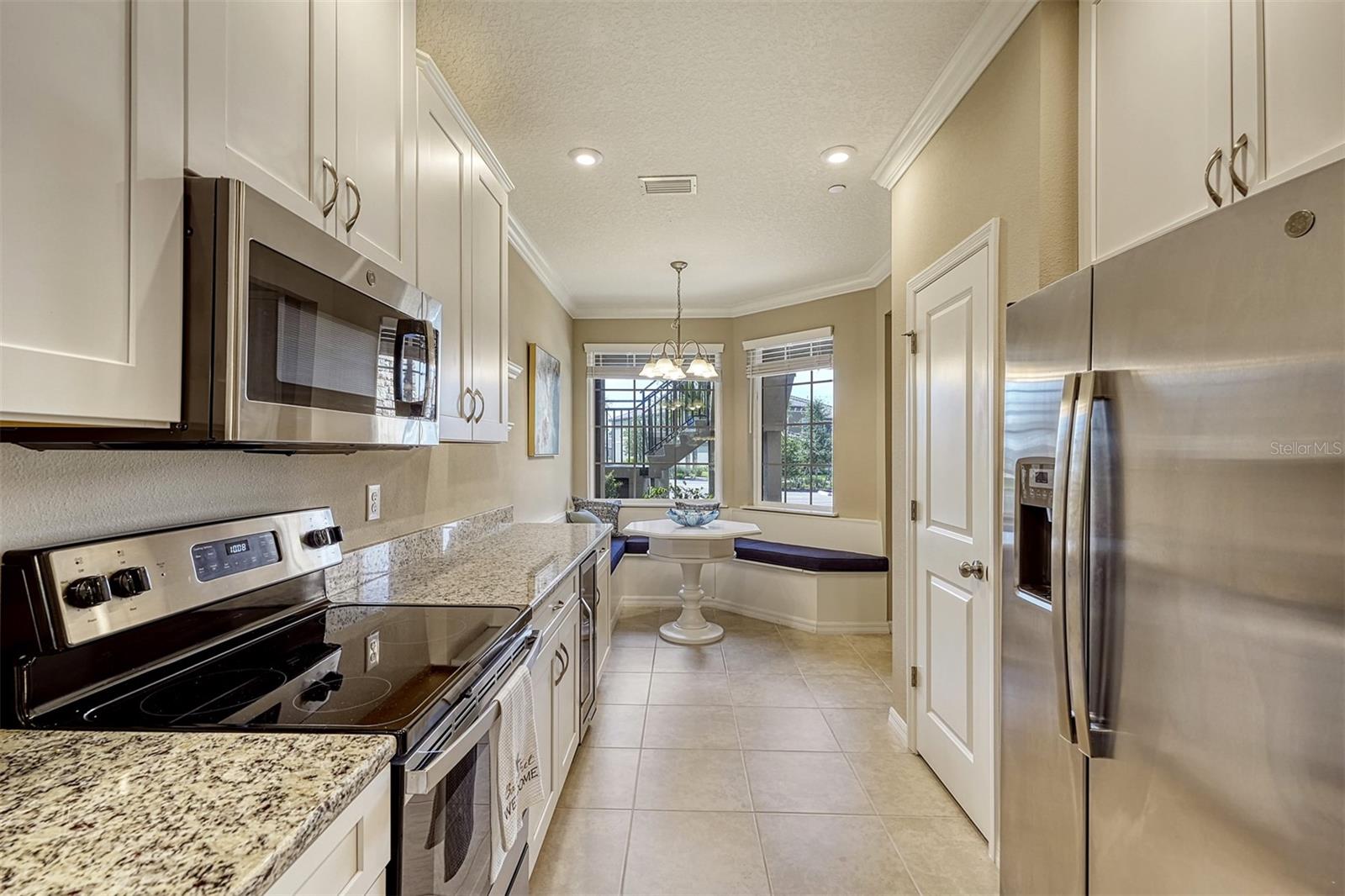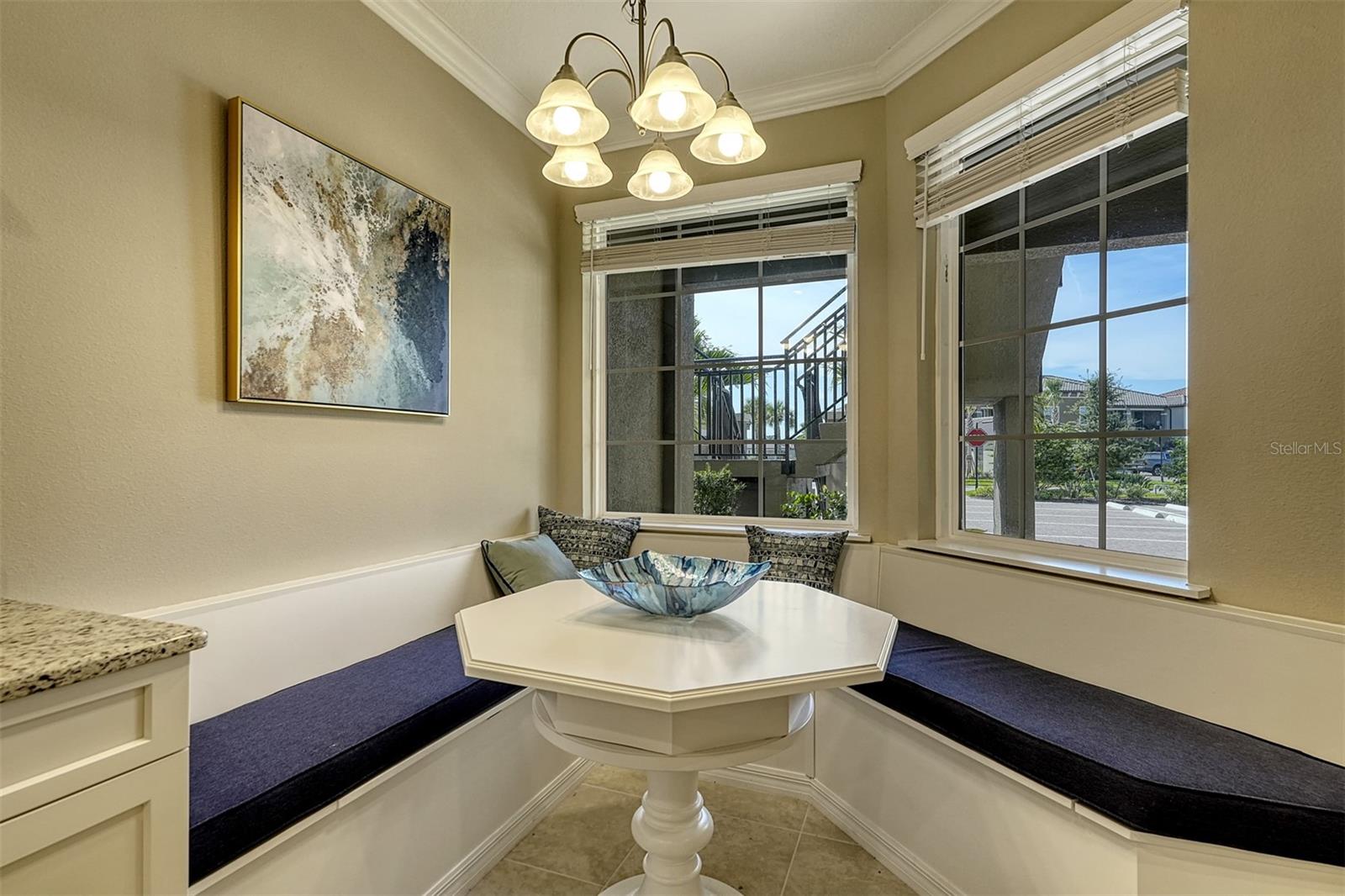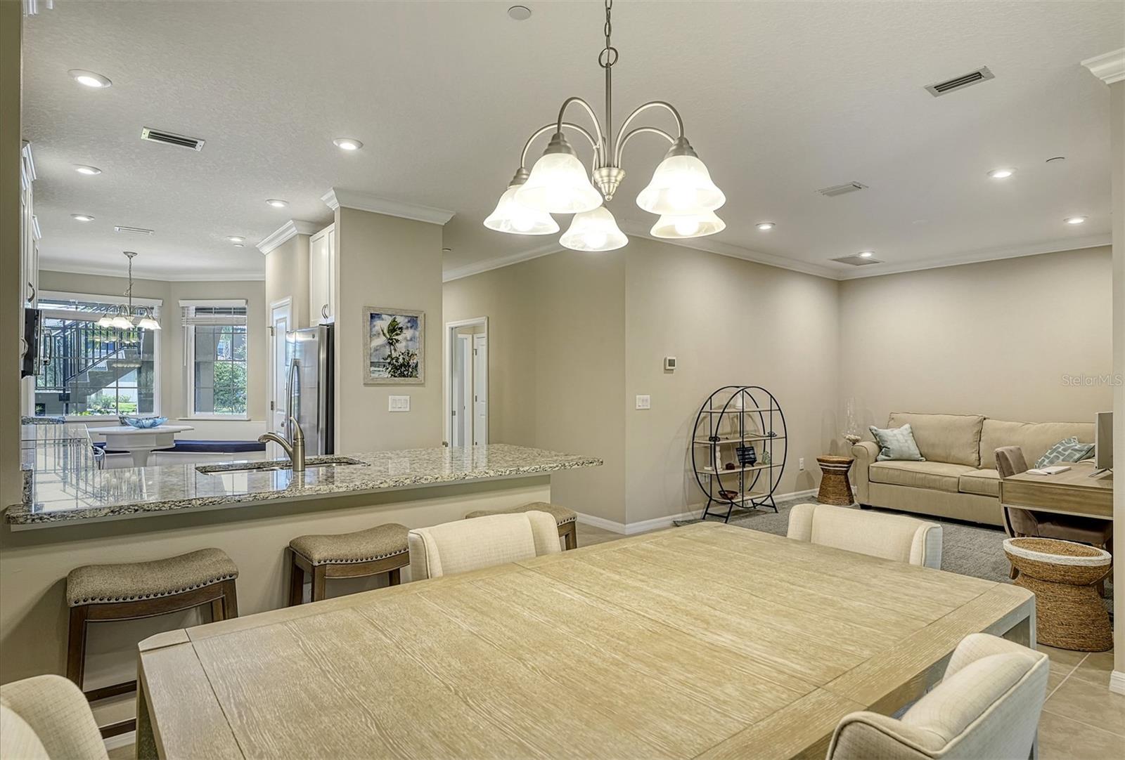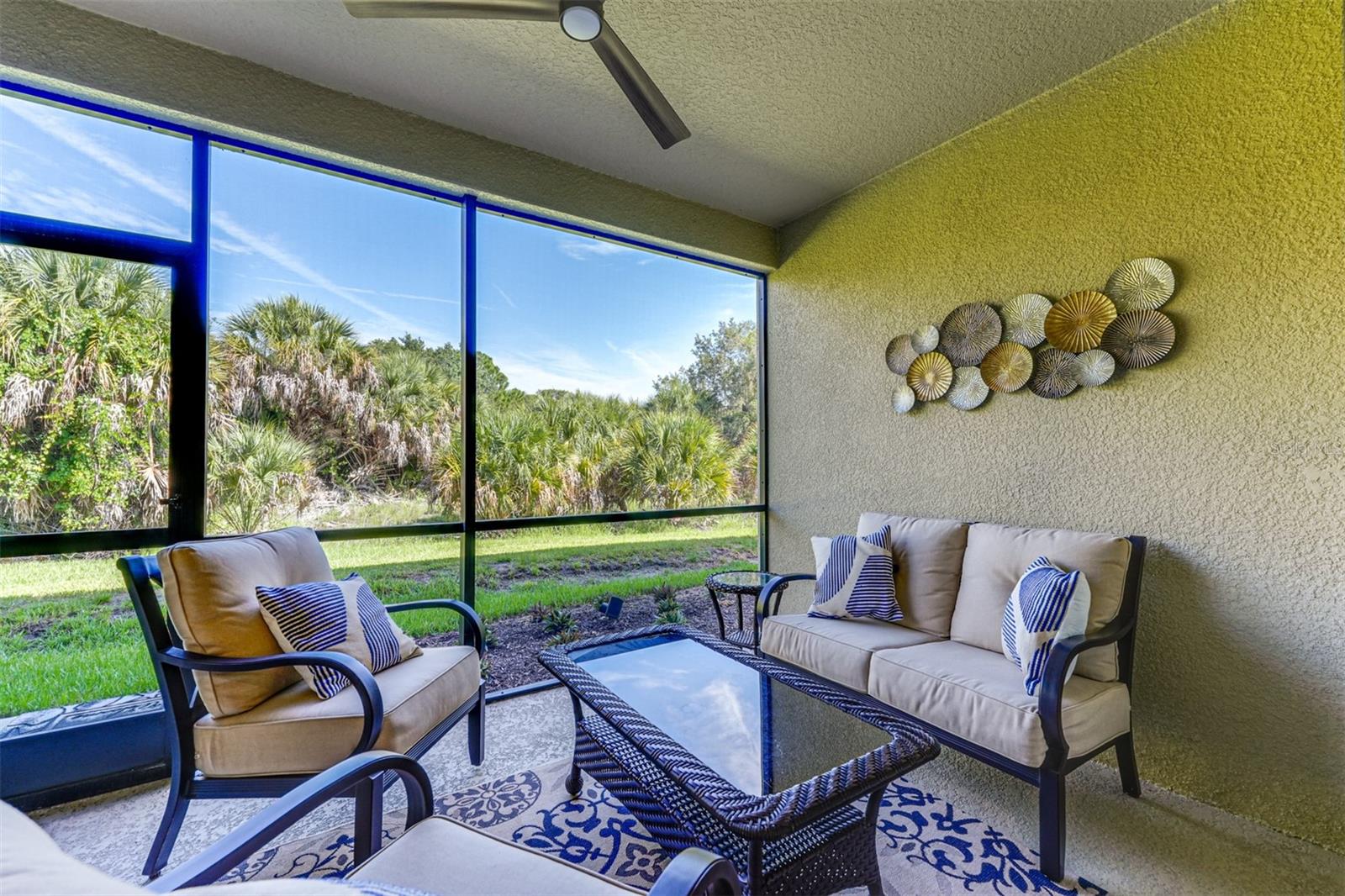Live the resort lifestyle in the coveted Esplanade on Palmer Ranch. This ground floor 2/2 plus den unit in the Garden Homes is the perfect winter getaway. This tastefully designed condo is comfortable and inviting. Neutral tile floors flow throughout the main living areas, kitchen and den. Bright kitchen with granite counter tops and stainless appliances. Upgrades include a custom designed built-in banquette with storage, extended kitchen counter with wine fridge, extra cabinet, and additional cabinet above the refrigerator. There is a detached one car garage and assigned parking spot. Hurricane panels included for all windows and sliders. The resort-style amenity center is the hub of the community. Extensive activities calendar, Two pools, splash area and playground, fitness center, pickle ball and tennis courts, spa services, The Bahama Bar restaurant and much more. Minutes to the Legacy Trail and a short 8 mile drive to Nokomis Beach and 10 miles to Venice.