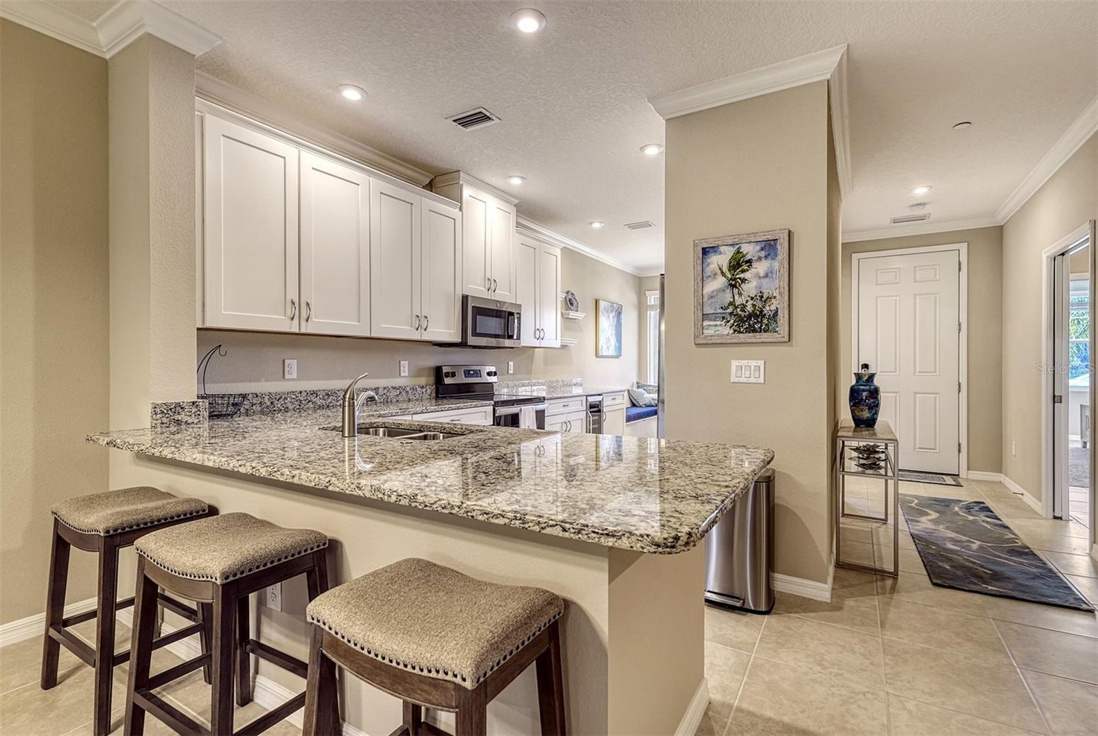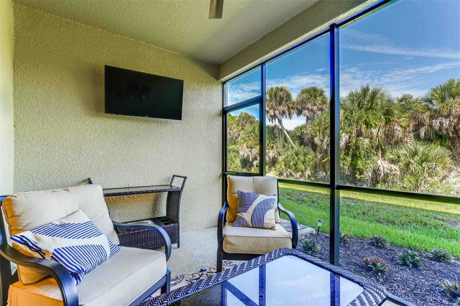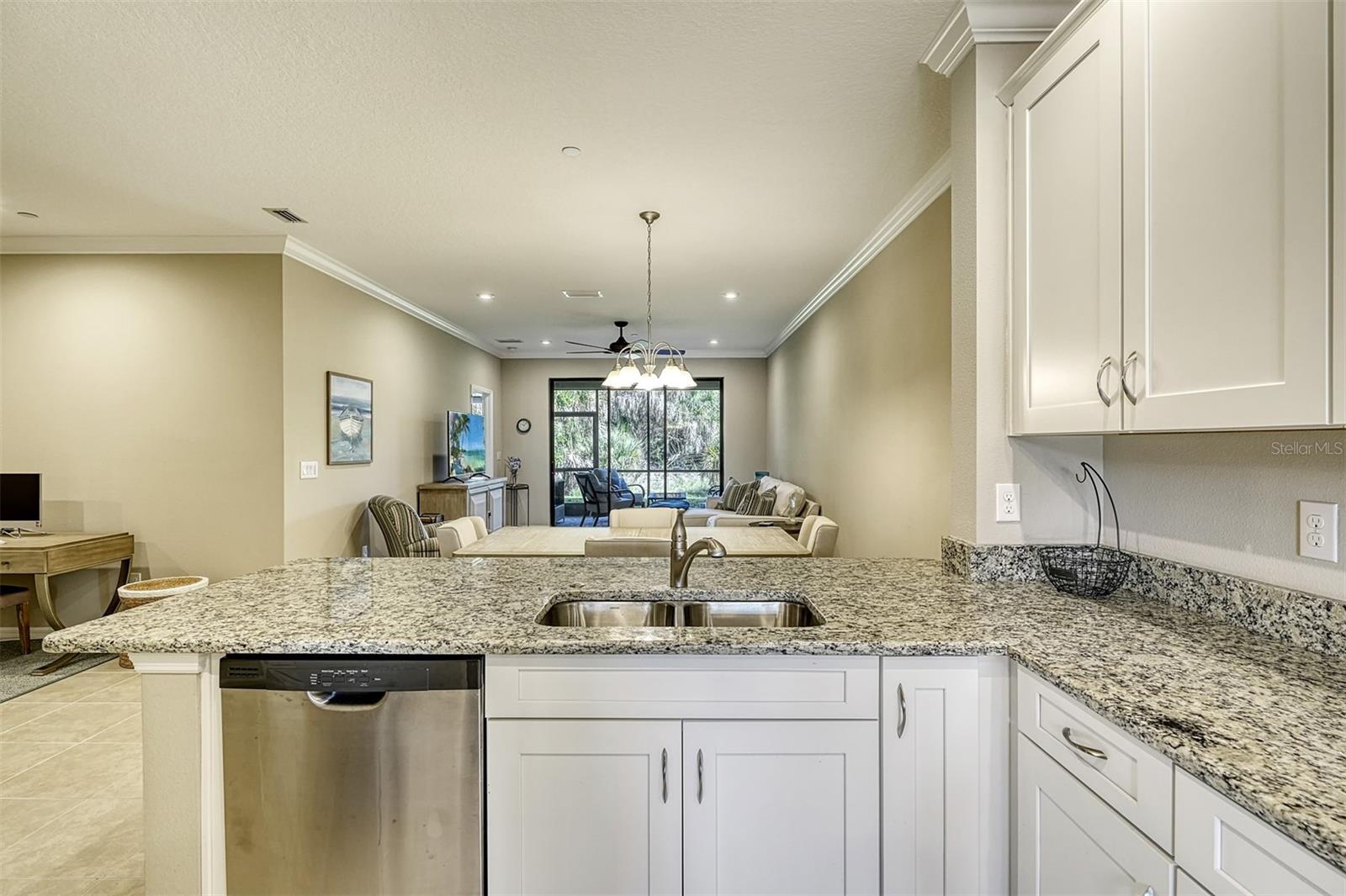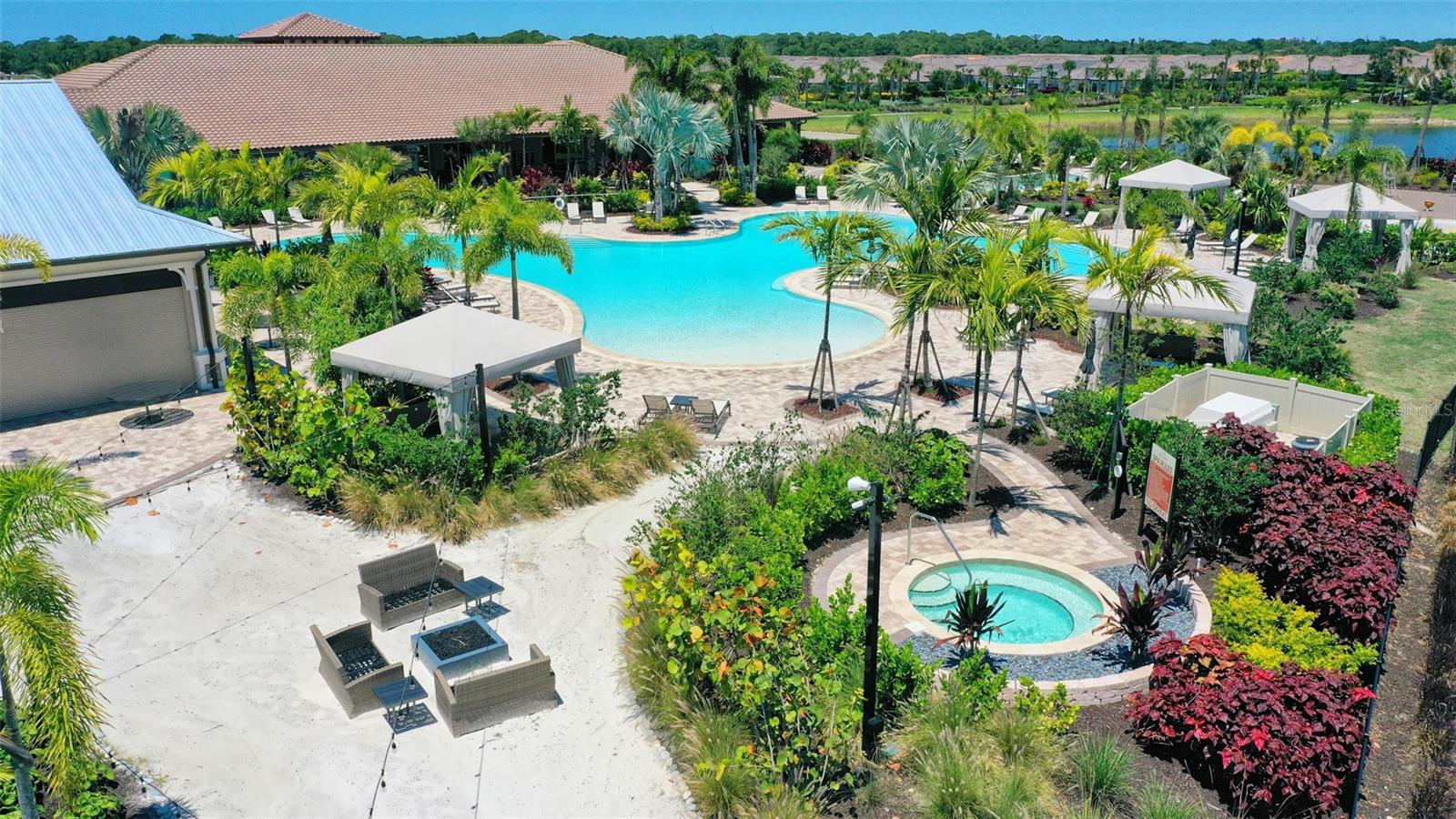 Live the resort lifestyle in the coveted Esplanade on Palmer Ranch. This ground floor 2/2 plus den unit in the Garden Homes is the perfect winter getaway. This tastefully designed condo is comfortable and inviting. Neutral tile floors flow throughout the main living areas, kitchen and den. Bright kitchen with granite counter tops and stainless appliances. Upgrades include a custom designed built-in banquette with storage, extended kitchen counter with wine fridge, extra cabinet, and additional cabinet above the refrigerator. There is a detached one car garage and assigned parking spot. Hurricane panels included for all windows and sliders. The resort-style amenity center is the hub of the community. Extensive activities calendar, Two pools, splash area and playground, fitness center, pickle ball and tennis courts, spa services, The Bahama Bar restaurant and much more. Minutes to the Legacy Trail and a short 8 mile drive to Nokomis Beach and 10 miles to Venice.