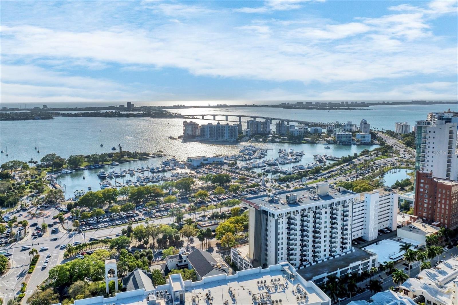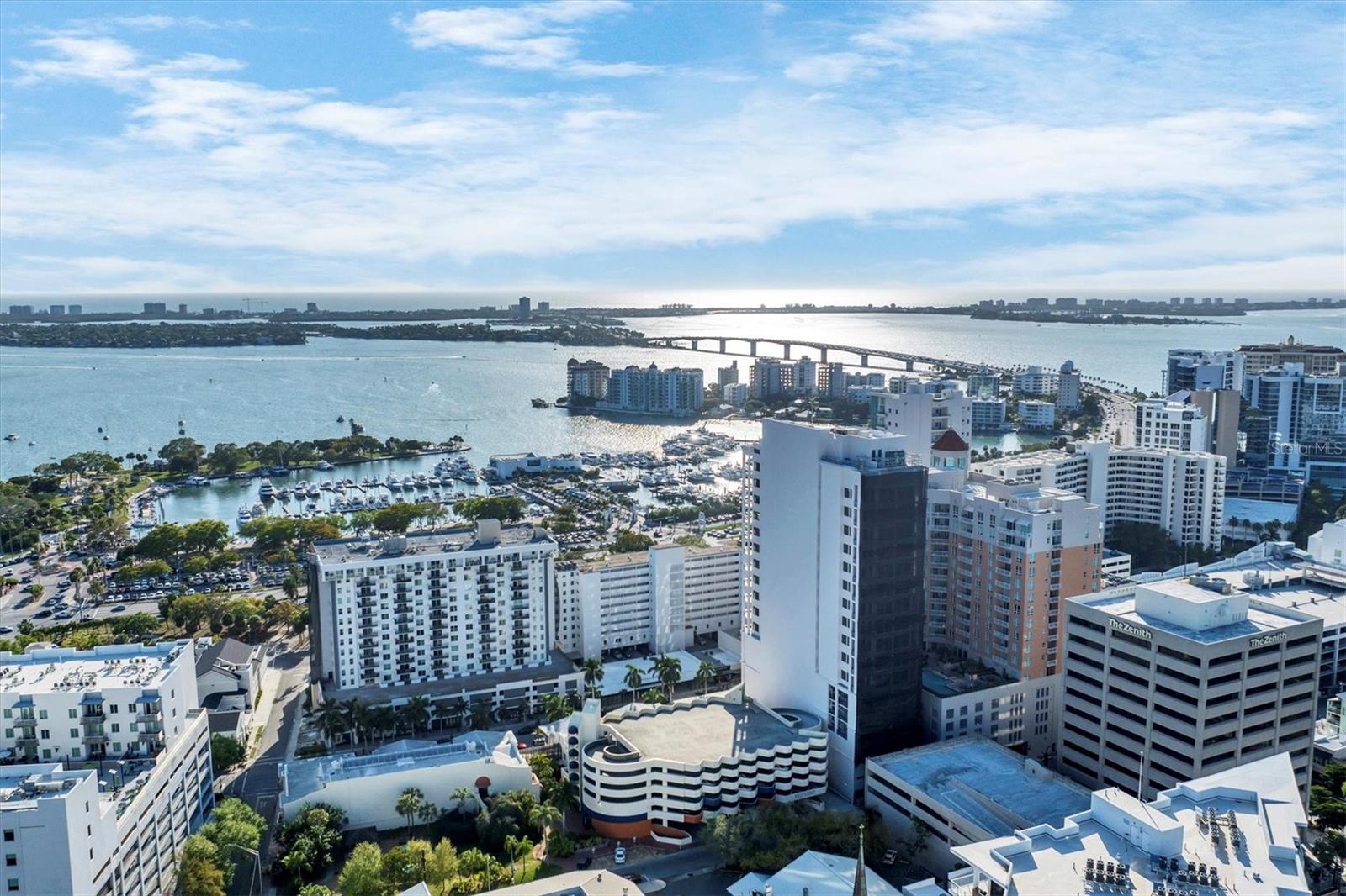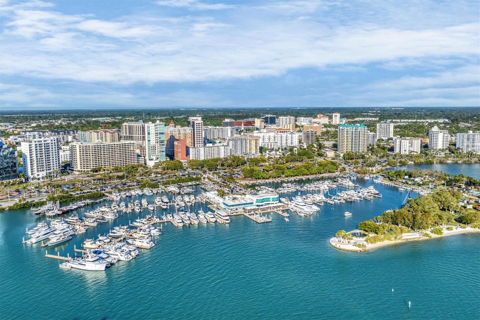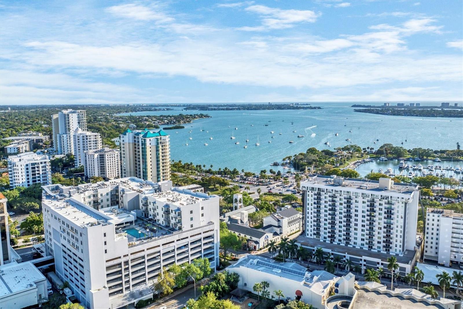 This 15th-floor condominium unit offers a prime location overlooking the city marina and Bayfront Park, nestled amidst a vibrant array of upscale restaurants, boutiques, and art galleries. Situated conveniently near the Opera House and Cinema Arts Theater, with trendy St. Armand's Circle and the picturesque Lido Beach just a five-minute drive away. This 2-bedroom, 2-bathroom unit boasts abundant natural light, greeting you with a scenic balcony vista. The kitchen features stunning stone countertops, matching those in the bathrooms, along with a stylish hammered brass sink, stainless steel appliances, and gold-accented cabinetry with convenient pull-out shelves and a lazy susan. The primary bedroom offers a spacious retreat, complete with a large window, an ensuite bath featuring a pebbled shower floor and hammered brass sink, and a thoughtful addition of a toilet with an attached bidet. A walk-in closet features a customized organization system. The second bedroom includes a Murphy bed with an attached wardrobe. Additionally, the walk-in closet houses a laundry area with a stackable washer and dryer. The second bath features a sizable vanity with a hammered brass sink and a walk-in shower with a pebbled floor. The unit also includes two additional storage closets, along with one parking space and a storage cage in the attached parking garage. For added security, the lobby is staffed, and after-hours access is granted with a fob. Currently undergoing extensive renovations, the condominiums will soon offer enhanced amenities, including a heated pool, a fully equipped fitness center, and a versatile studio room for various fitness activities such as dance and yoga.