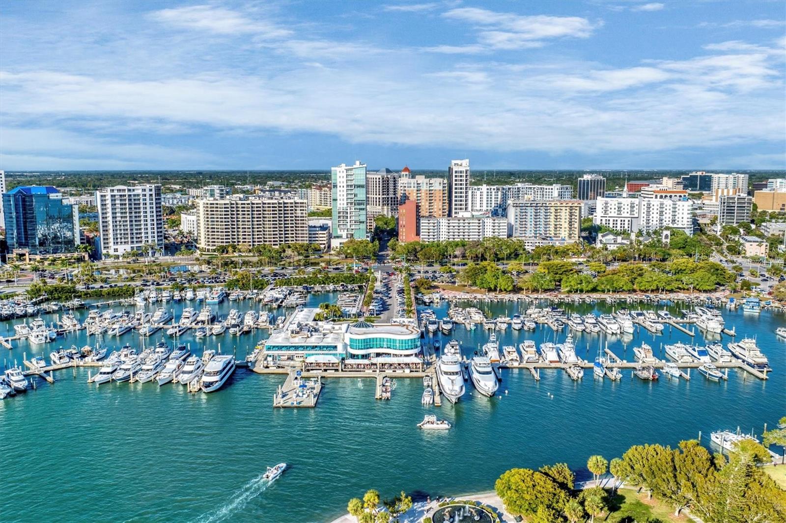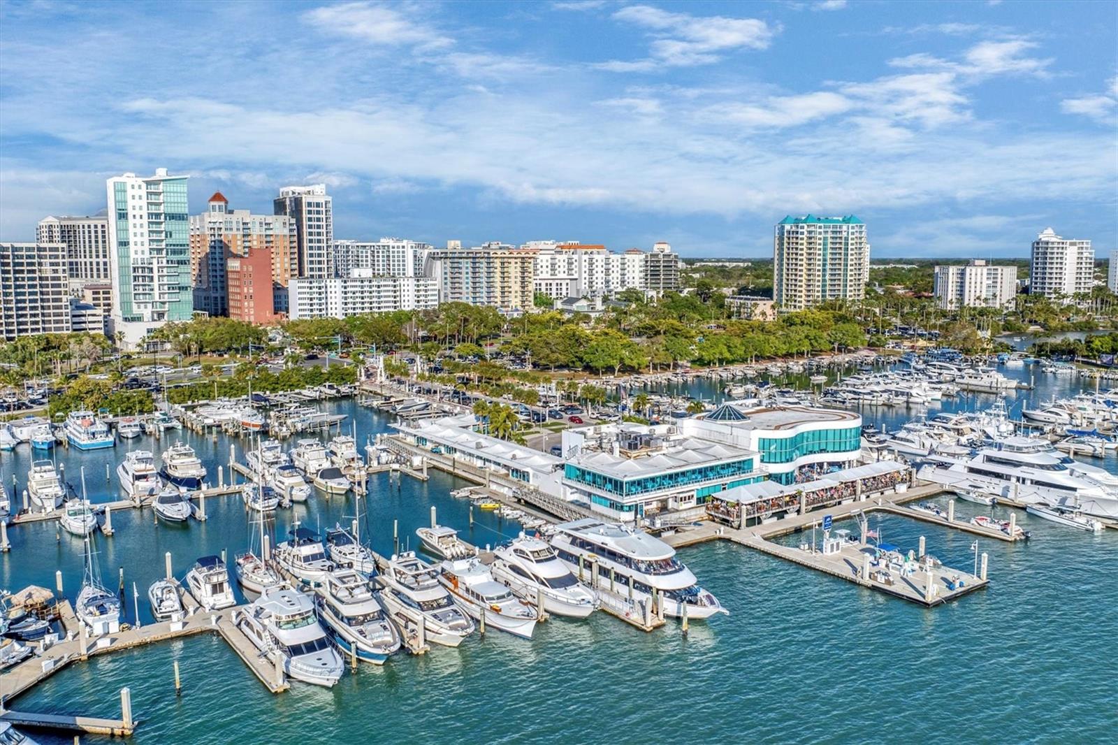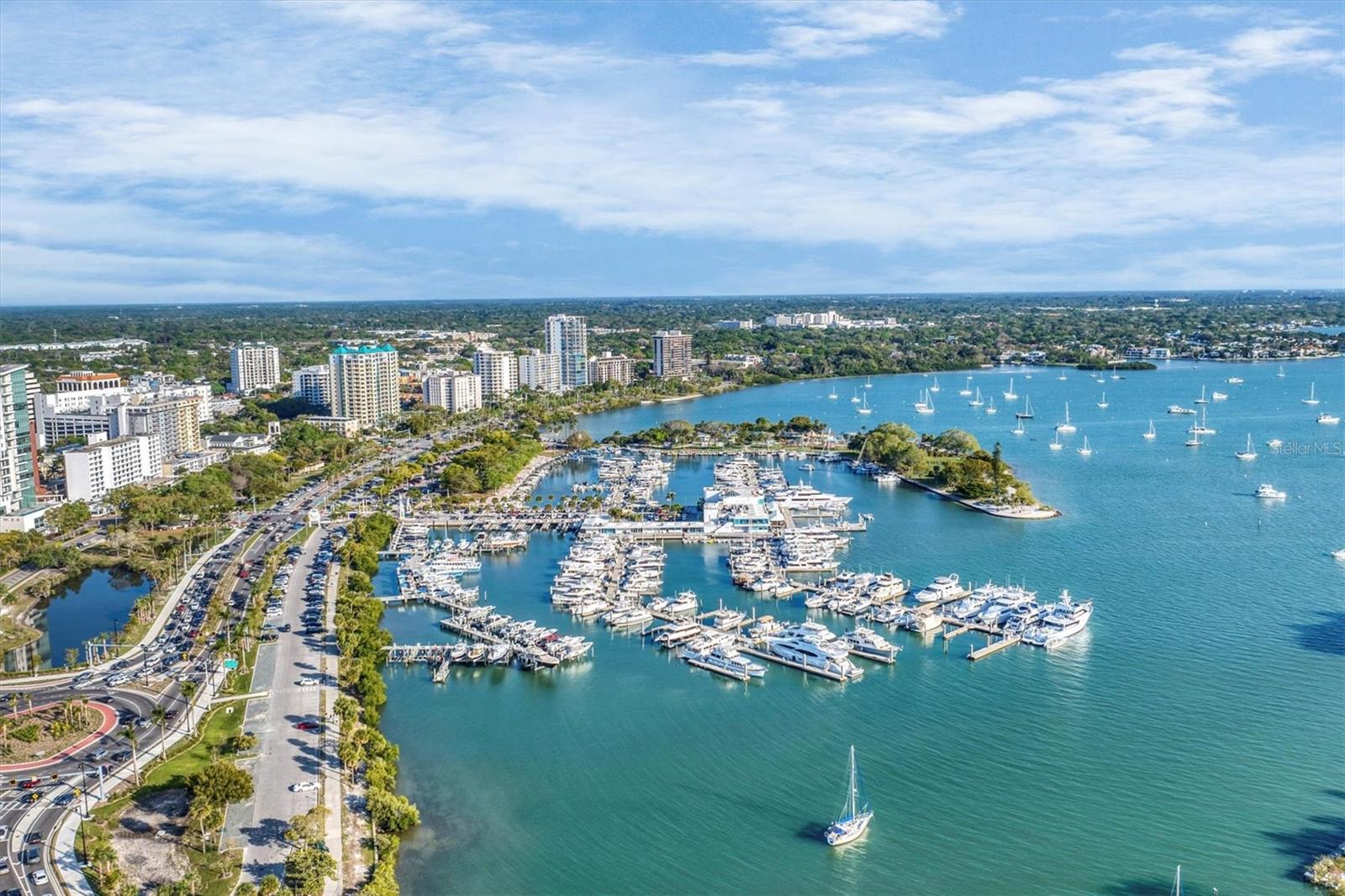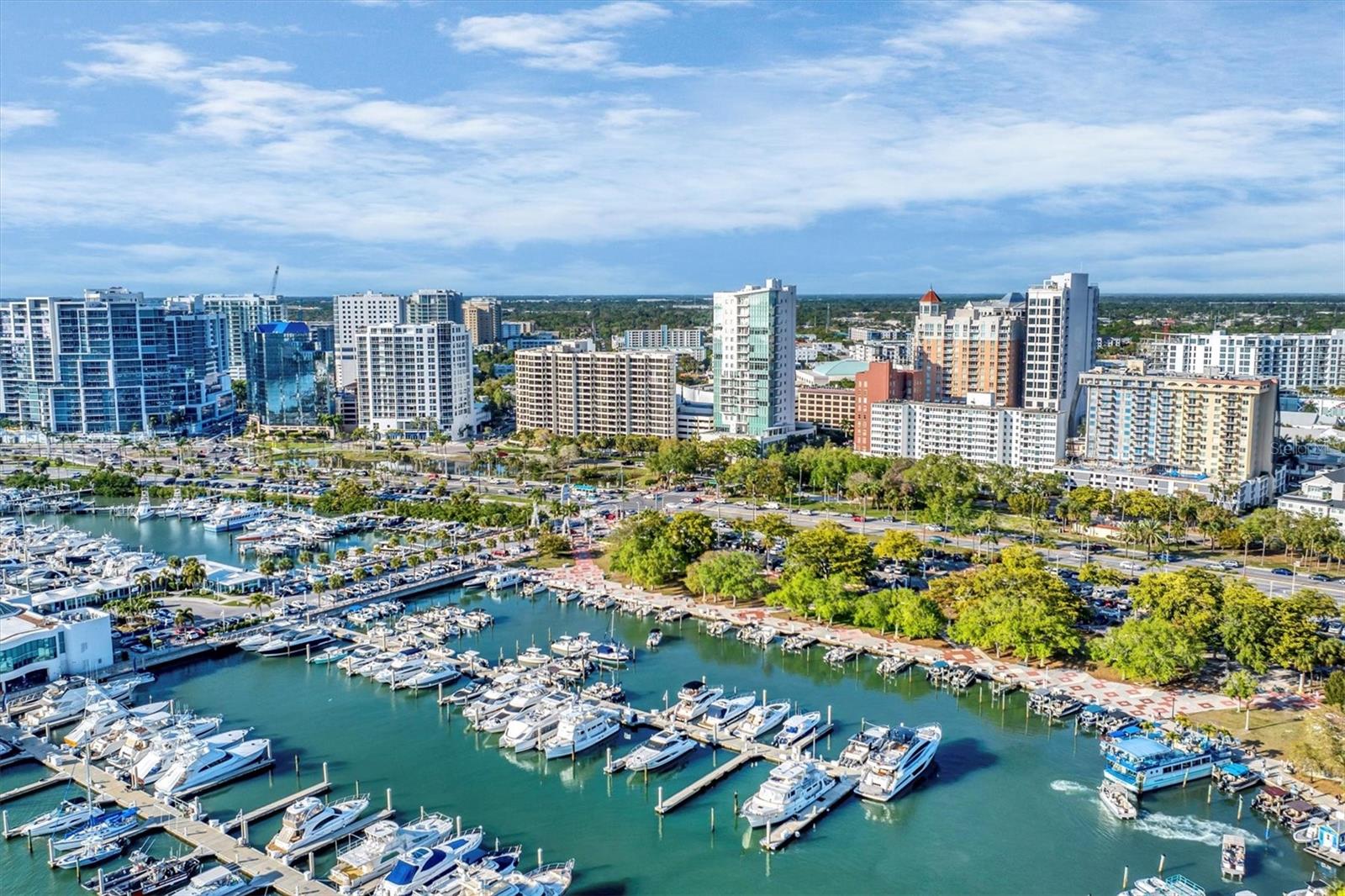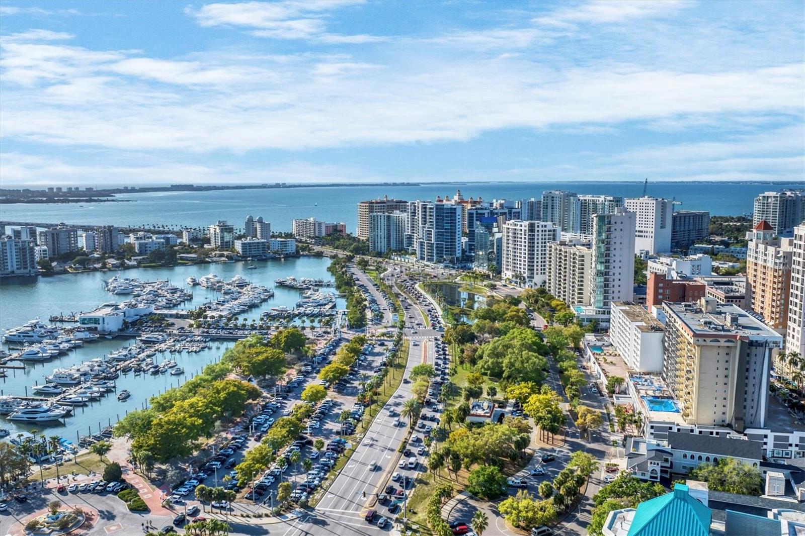 This 15th-floor condominium unit offers a prime location overlooking the city marina and Bayfront Park, nestled amidst a vibrant array of upscale restaurants, boutiques, and art galleries. Situated conveniently near the Opera House and Cinema Arts Theater, with trendy St. Armand's Circle and the picturesque Lido Beach just a five-minute drive away. This 2-bedroom, 2-bathroom unit boasts abundant natural light, greeting you with a scenic balcony vista. The kitchen features stunning stone countertops, matching those in the bathrooms, along with a stylish hammered brass sink, stainless steel appliances, and gold-accented cabinetry with convenient pull-out shelves and a lazy susan. The primary bedroom offers a spacious retreat, complete with a large window, an ensuite bath featuring a pebbled shower floor and hammered brass sink, and a thoughtful addition of a toilet with an attached bidet. A walk-in closet features a customized organization system. The second bedroom includes a Murphy bed with an attached wardrobe. Additionally, the walk-in closet houses a laundry area with a stackable washer and dryer. The second bath features a sizable vanity with a hammered brass sink and a walk-in shower with a pebbled floor. The unit also includes two additional storage closets, along with one parking space and a storage cage in the attached parking garage. For added security, the lobby is staffed, and after-hours access is granted with a fob. Currently undergoing extensive renovations, the condominiums will soon offer enhanced amenities, including a heated pool, a fully equipped fitness center, and a versatile studio room for various fitness activities such as dance and yoga.