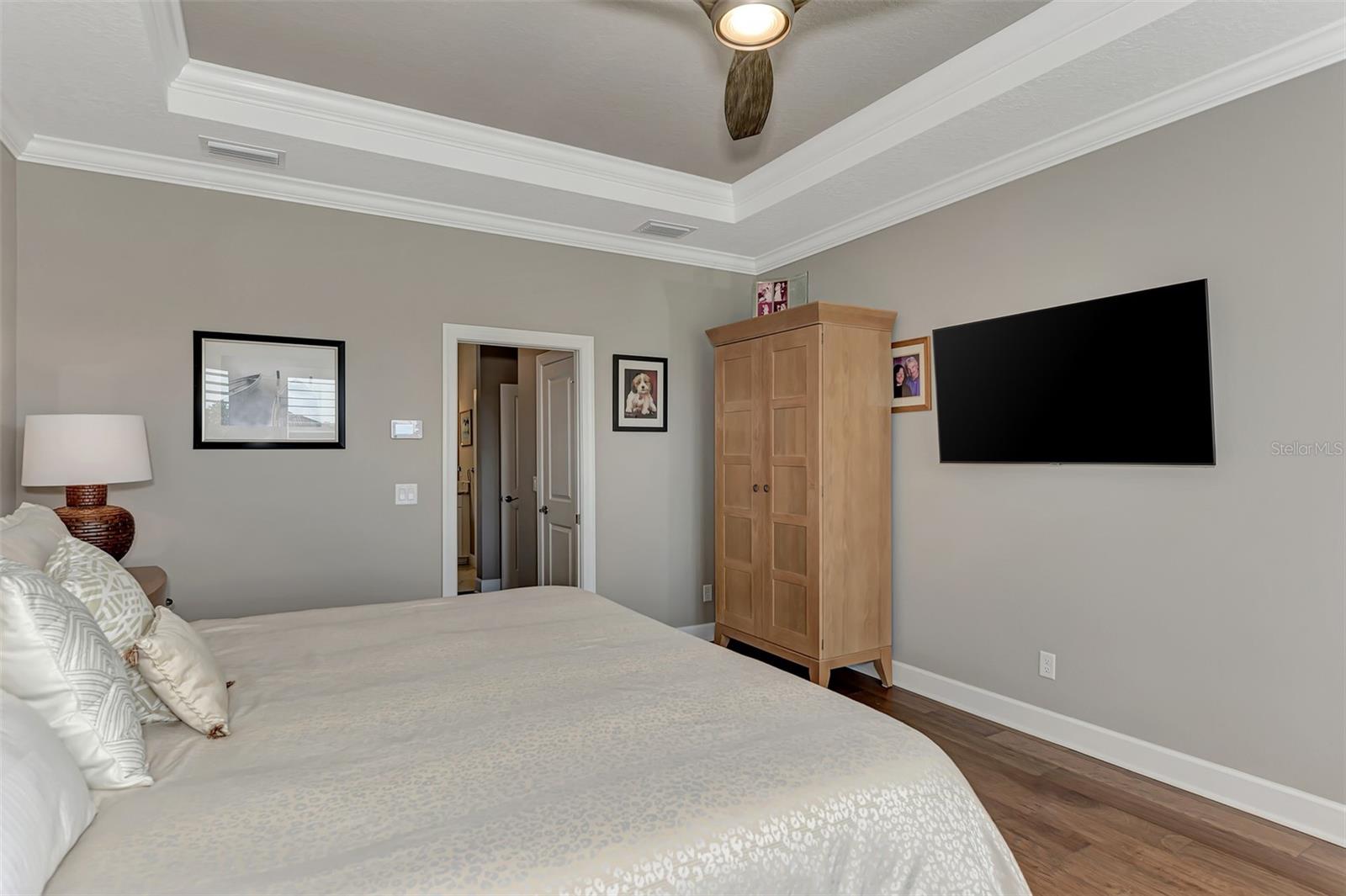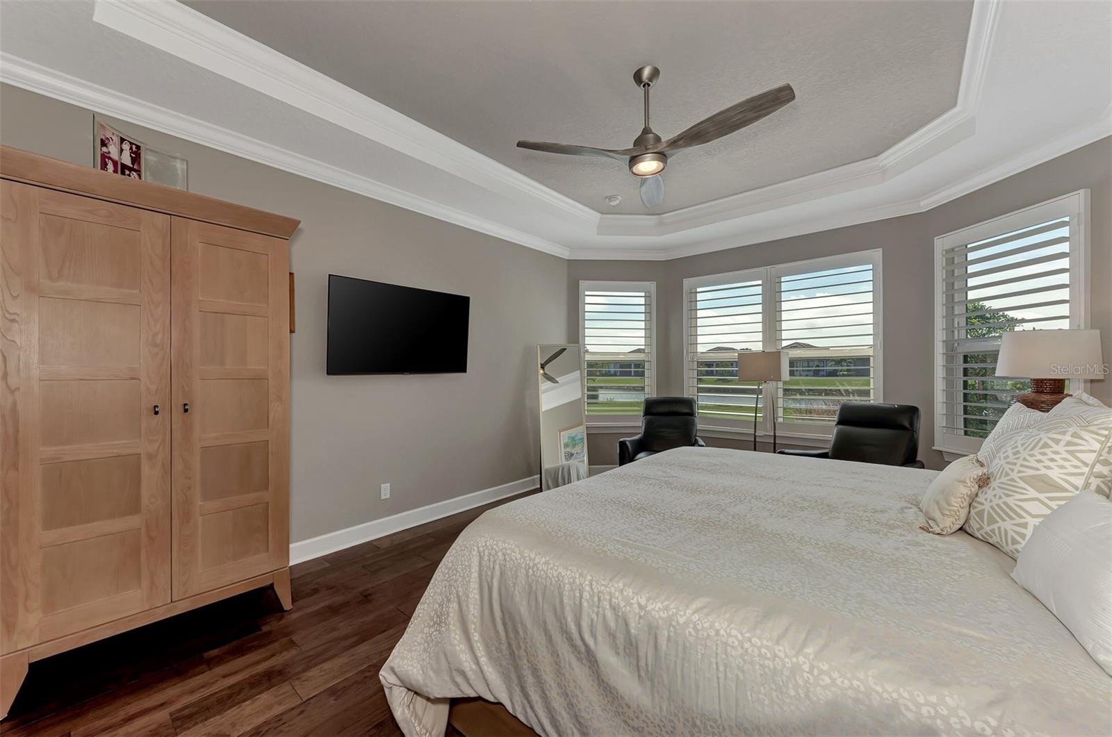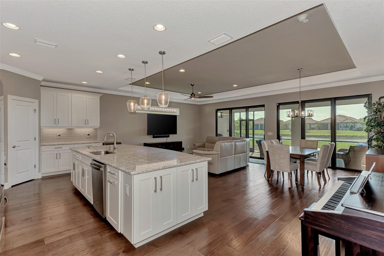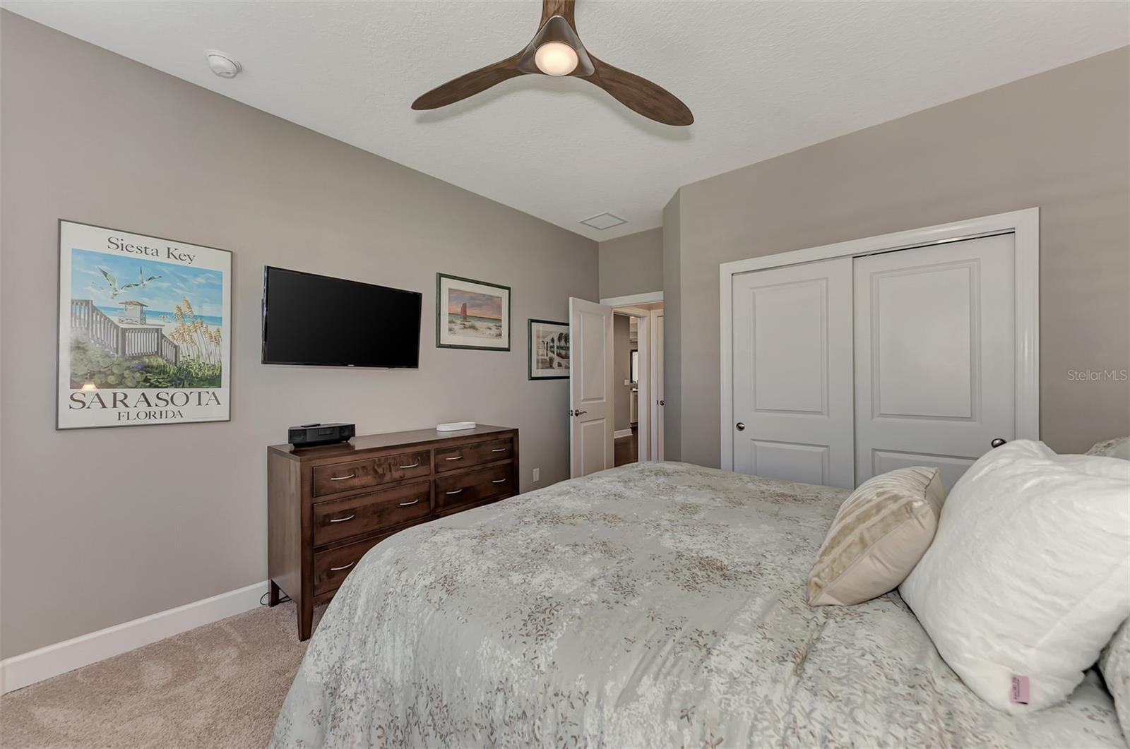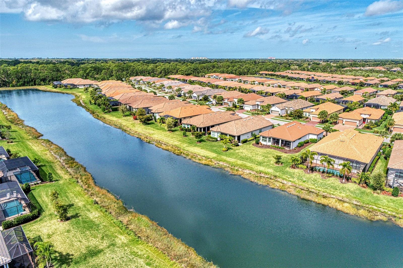 Esplanade on Palmer Ranch, a gated community! This stunning lake view rarely available Piceno Model by Taylor Morrison is light and bright with a south rear facing exposure that is spacious, open and has a modern floor plan for today’s lifestyle. This home offers a full 3 car garage, 2 bedroom en-suites, an office that could easily be converted to a 3rd bedroom, a large living area that is great for entertaining, the entire house has hurricane impact resistant windows and sliders, tray ceilings, highest upgraded flooring which includes tile and engineered hardwood flooring, an oversized backyard to fit your custom designed pool, outdoor kitchen rough in, custom designed closets throughout, custom made office wall unit with desk, garage shelving with racks and workbench, flatscreen tv’s installed in every room and on the lanai. The kitchen is perfect for a Chef! It's equipped with an oversized quartz Island with lots of storage underneath, stainless steel appliances, quartz countertops, soft close drawers, under cabinet lighting, beautiful wood cabinets with pull outs and large drawers for your kitchen needs. Gas Cooking! This Taylor Morrison signature neighborhood offers endless amenities, it feels like being on a cruise ship! The neighborhood provides lawn maintenance which makes it extra special if you want to lock and go! These amenities are a Lifestyle director, elegant amenity center with wellness services, catering kitchen, lounge areas, fitness center & activity rooms, Resort style pool & spa, fire pit, walking trails, private entrance to the Legacy Bike Trail, tennis, pickle ball, bocce, dog parks and its own neighborhood Bahama bar that includes restaurant and full bar. This neighborhood is a fun place to live. Don't miss out in the opportunity to live in a Resort Style community. Golf Carts Welcome! Bedroom Closet Type: Walk-in Closet (Primary Bedroom).