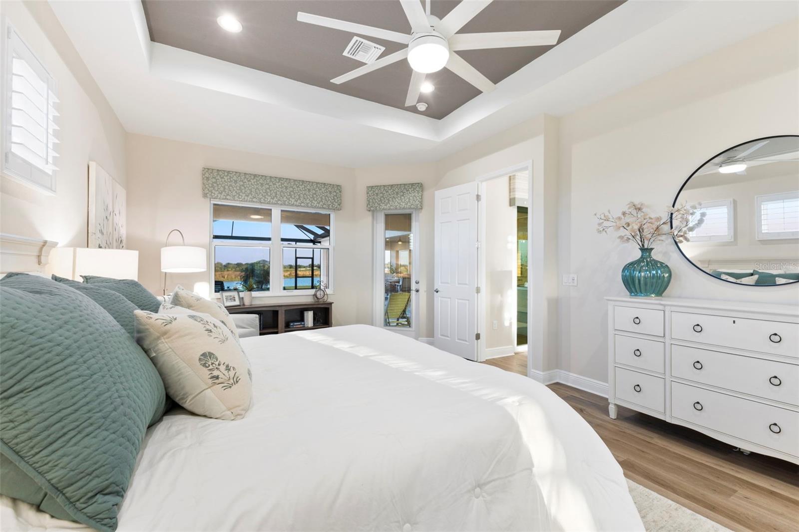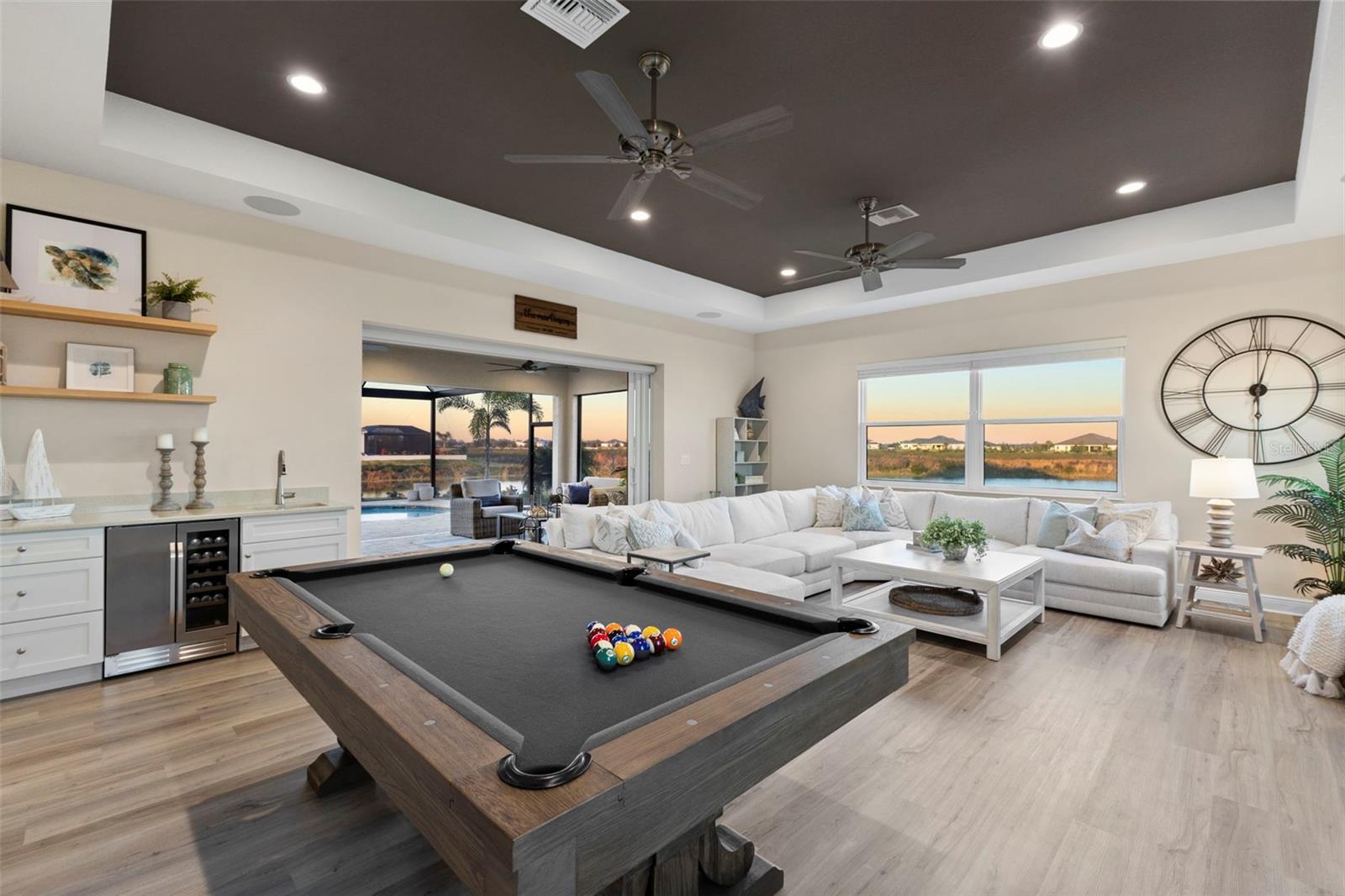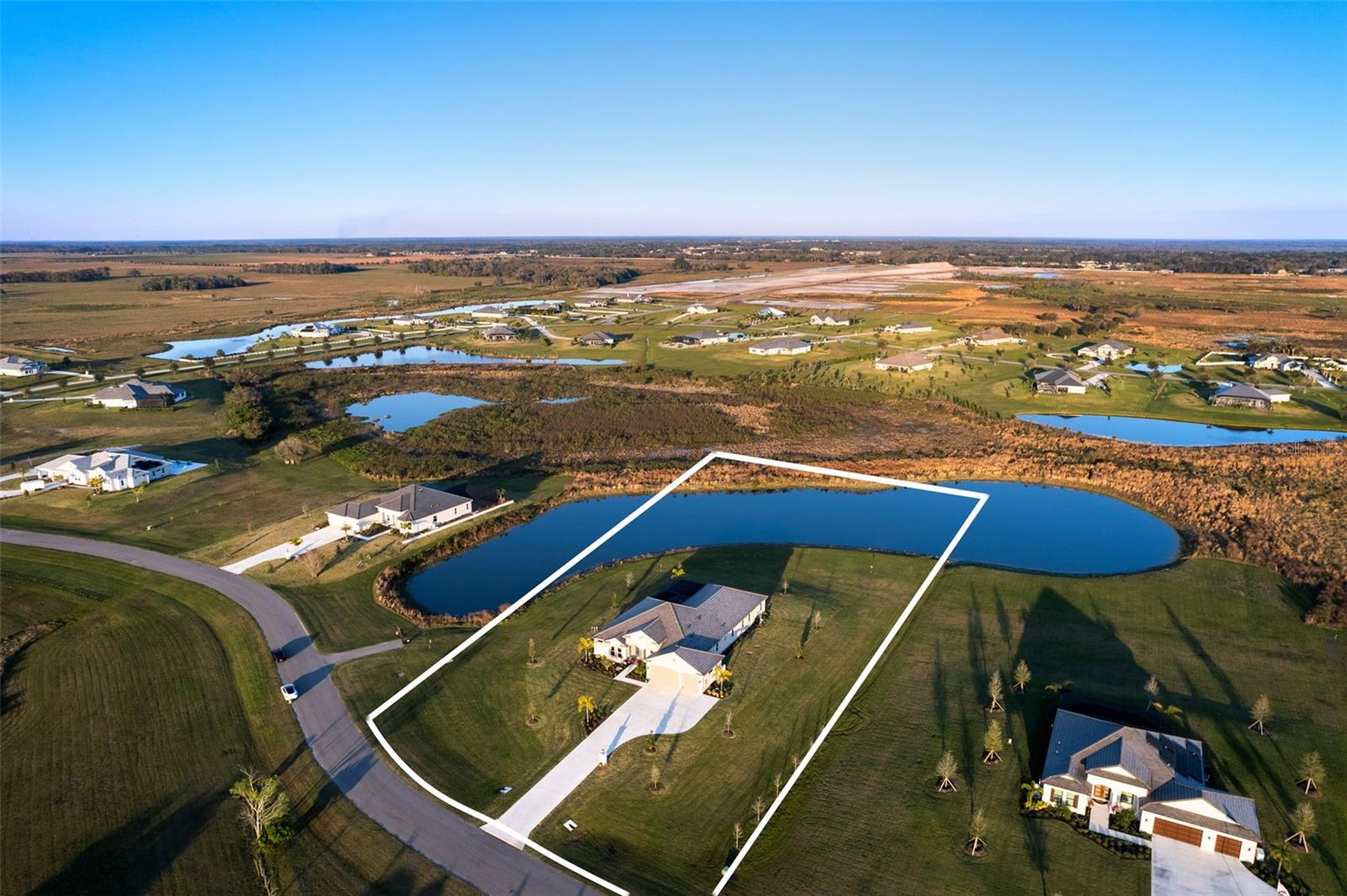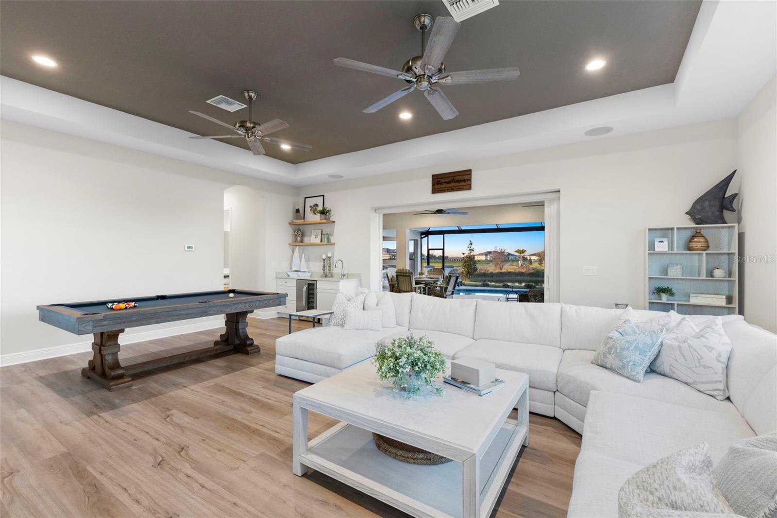 Welcome to luxurious living at 3554 Recurve Circle, nestled in the serene countryside of Hampton Lakes in Sarasota, Florida. This exquisite estate offers a perfect blend of tranquility and opulence, set on a sprawling 3-acre parcel within a neighborhood just 5 miles from the vibrant Waterside Place and Lakewood Ranch. It is priced below the latest appraisal, so you could have instant equity on beautiful property. Upon arrival, be greeted by the grandeur of this estate with its expansive driveway leading to a stately 3-car garage. As you step through the double doors into the foyer, the warmth of the beautiful luxury vinyl flooring welcomes you, guiding you into an open floor plan designed for seamless living and entertaining. To the left, an elegant dining room awaits, adorned with a tray ceiling, grass cloth wallpaper, and custom lighting, setting the stage for intimate gatherings. To the right, discover a private office retreat behind double doors, offering serene views of the lush front yard. Straight ahead, an inviting seating area and butler's pantry beckon, ideal for hosting guests, with sliding glass doors opening to a picturesque pool lanai overlooking a tranquil lake, creating an oasis of relaxation. The heart of this home lies in its oversized gourmet kitchen, boasting light cabinets, a bar-height island with ample seating, double oven, induction cooktop, quartz countertops, and a light subway tile backsplash. Adjacent, a spacious laundry room leads to the garage, featuring an oversized mudroom and storage closets, ensuring effortless organization. Flowing seamlessly from the kitchen, a second living room bathes in natural light, framed by glass sliding doors and an aquarium window, offering panoramic views of the pool and surrounding landscape. A true highlight awaits at the rear of the home—a sprawling bonus room with high ceilings, tray ceiling, and space for a large sectional and pool table. Open the sliding glass pocket doors to seamlessly extend the living space onto the expansive lanai, where every corner offers breathtaking vistas of the wraparound lake, perfect for hosting unforgettable gatherings under the stars. Retreat to the luxurious Primary Suite, boasting a tray ceiling, custom closets, and a spa-like bathroom featuring quartz countertops, large mirrors, and abundant storage. Three additional bedrooms give privacy for both homeowners and guests, ensuring comfort and serenity for all. Experience the epitome of luxury living at 3554 Recurve Circle—a sanctuary where every detail is crafted for relaxation, entertainment, and timeless elegance.
