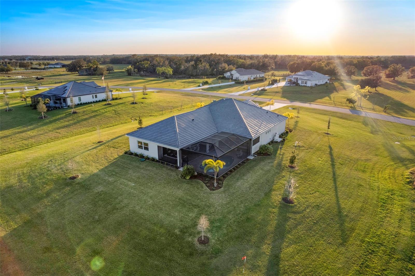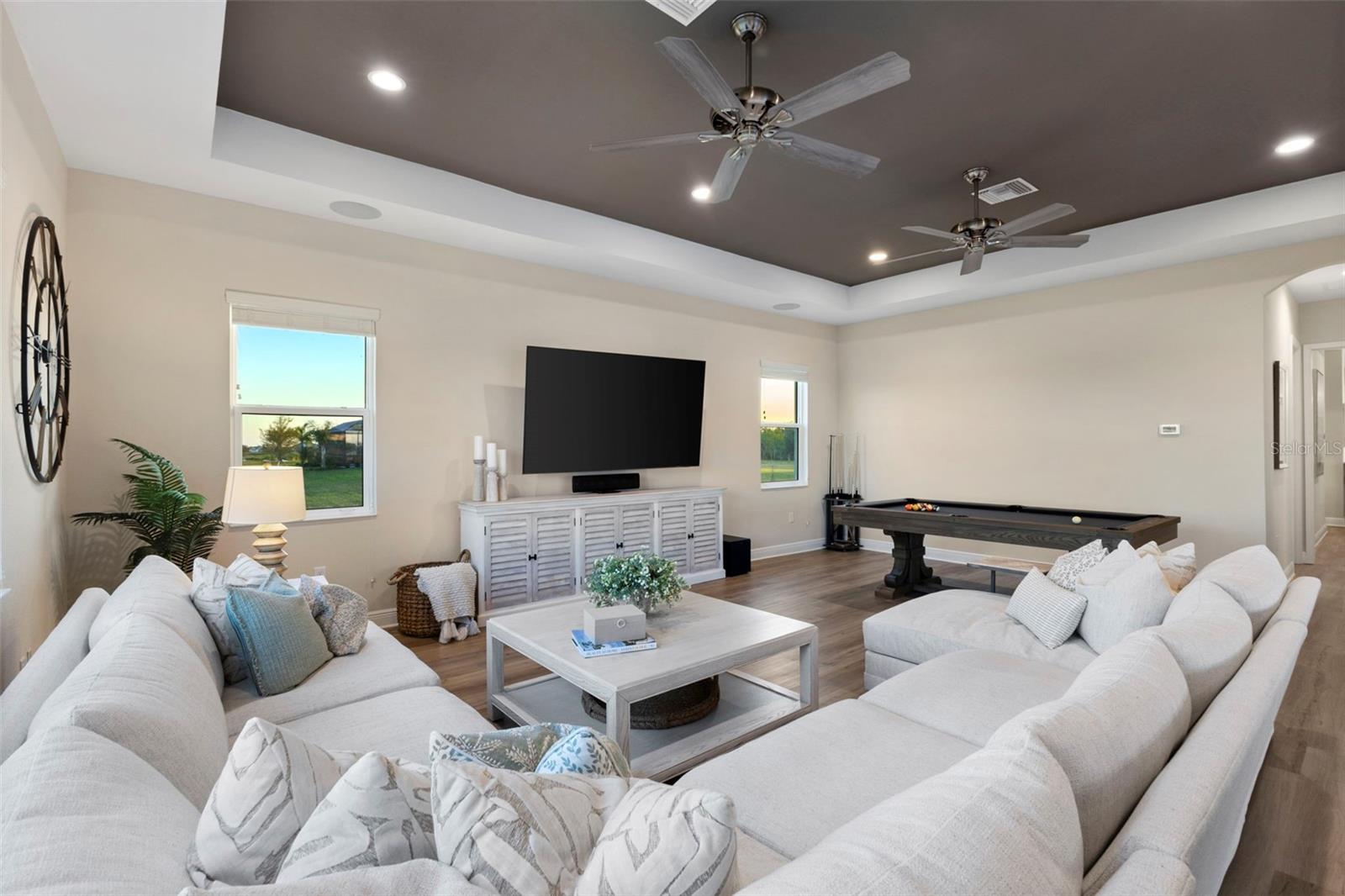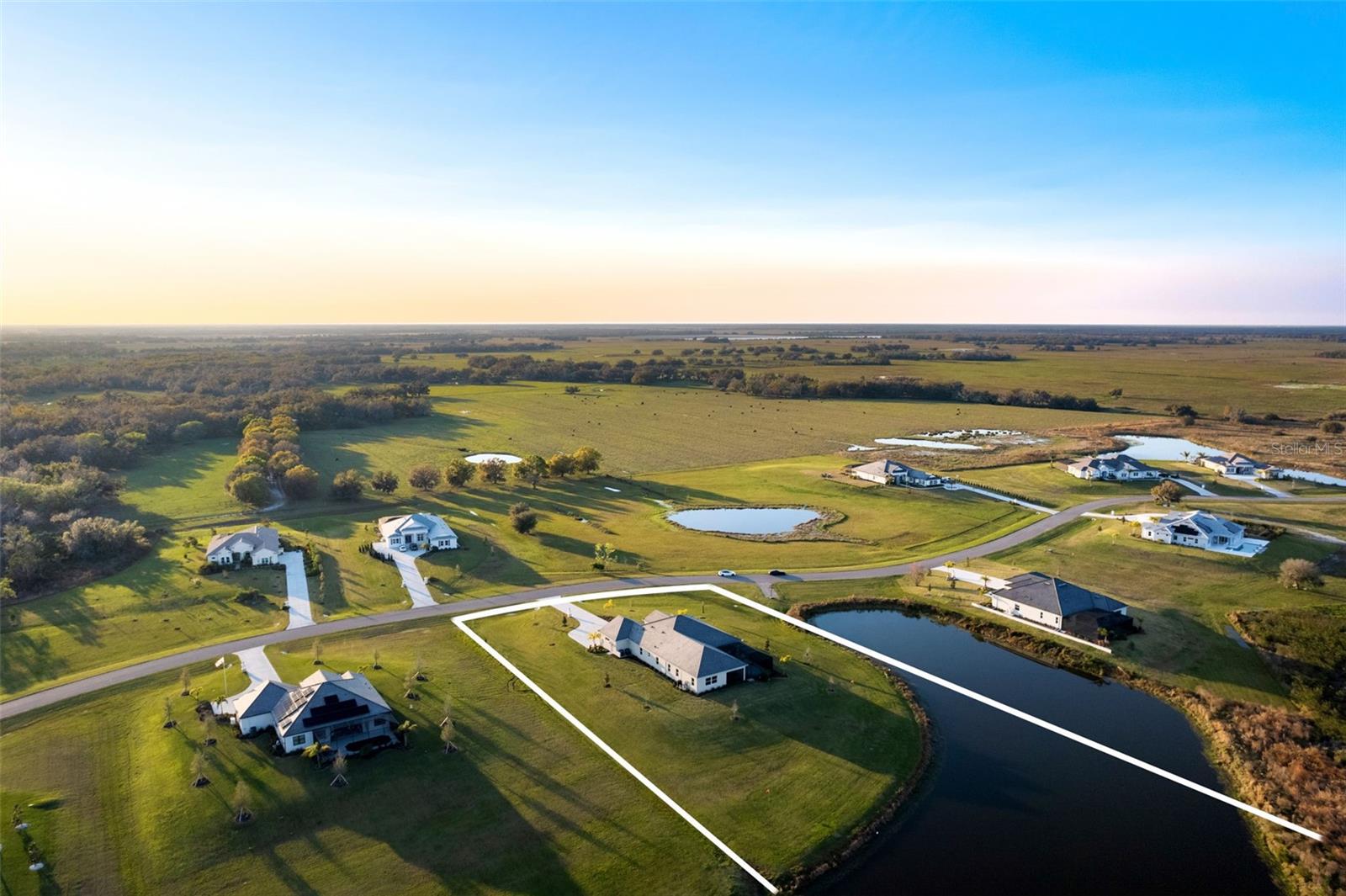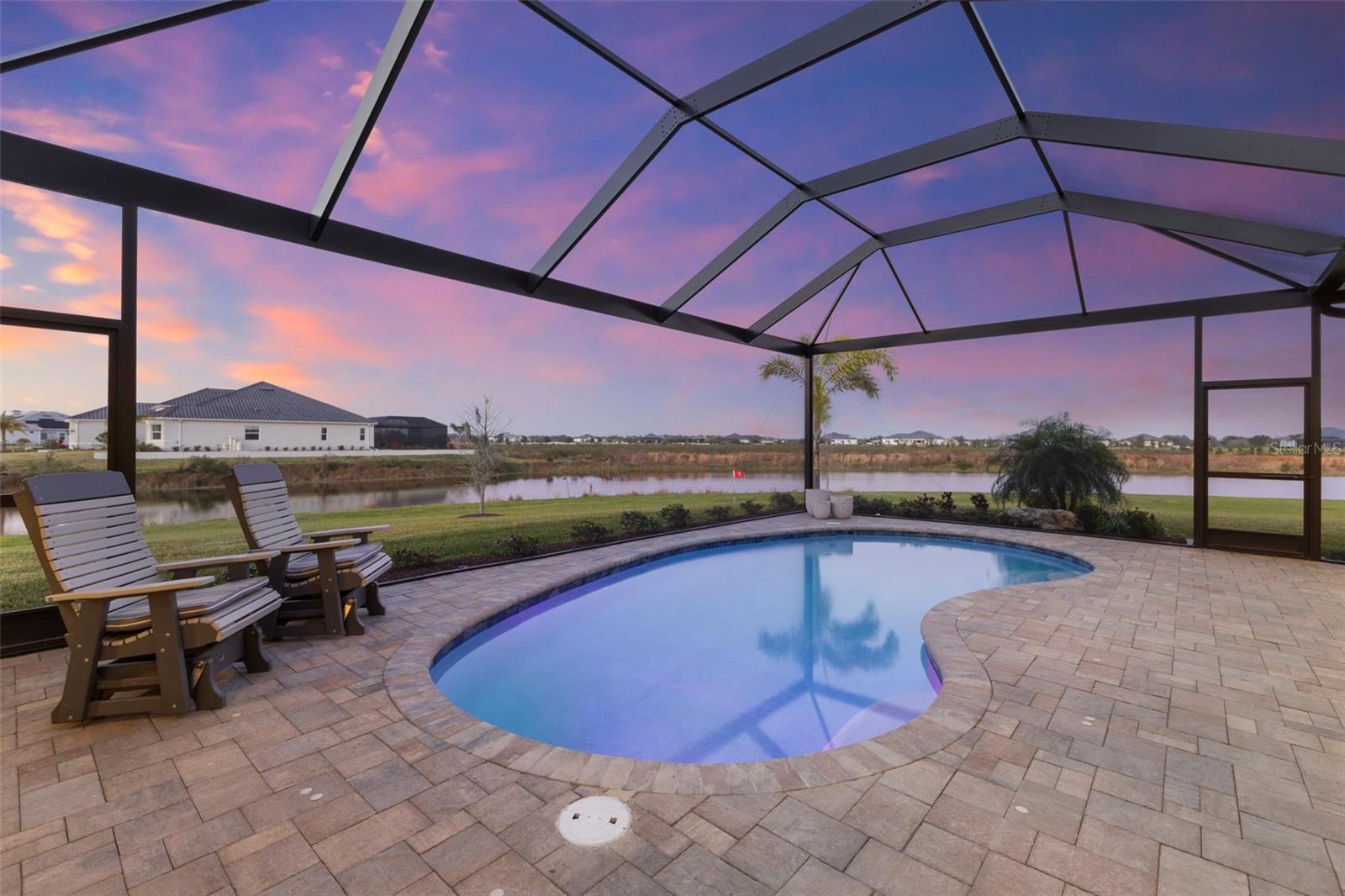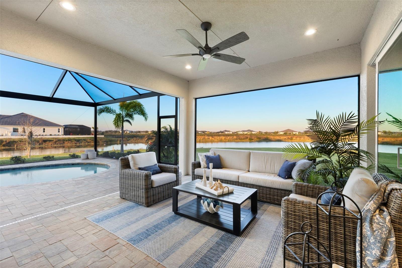 Welcome to luxurious living at 3554 Recurve Circle, nestled in the serene countryside of Hampton Lakes in Sarasota, Florida. This exquisite estate offers a perfect blend of tranquility and opulence, set on a sprawling 3-acre parcel within a neighborhood just 5 miles from the vibrant Waterside Place and Lakewood Ranch. It is priced below the latest appraisal, so you could have instant equity on beautiful property. Upon arrival, be greeted by the grandeur of this estate with its expansive driveway leading to a stately 3-car garage. As you step through the double doors into the foyer, the warmth of the beautiful luxury vinyl flooring welcomes you, guiding you into an open floor plan designed for seamless living and entertaining. To the left, an elegant dining room awaits, adorned with a tray ceiling, grass cloth wallpaper, and custom lighting, setting the stage for intimate gatherings. To the right, discover a private office retreat behind double doors, offering serene views of the lush front yard. Straight ahead, an inviting seating area and butler's pantry beckon, ideal for hosting guests, with sliding glass doors opening to a picturesque pool lanai overlooking a tranquil lake, creating an oasis of relaxation. The heart of this home lies in its oversized gourmet kitchen, boasting light cabinets, a bar-height island with ample seating, double oven, induction cooktop, quartz countertops, and a light subway tile backsplash. Adjacent, a spacious laundry room leads to the garage, featuring an oversized mudroom and storage closets, ensuring effortless organization. Flowing seamlessly from the kitchen, a second living room bathes in natural light, framed by glass sliding doors and an aquarium window, offering panoramic views of the pool and surrounding landscape. A true highlight awaits at the rear of the home—a sprawling bonus room with high ceilings, tray ceiling, and space for a large sectional and pool table. Open the sliding glass pocket doors to seamlessly extend the living space onto the expansive lanai, where every corner offers breathtaking vistas of the wraparound lake, perfect for hosting unforgettable gatherings under the stars. Retreat to the luxurious Primary Suite, boasting a tray ceiling, custom closets, and a spa-like bathroom featuring quartz countertops, large mirrors, and abundant storage. Three additional bedrooms give privacy for both homeowners and guests, ensuring comfort and serenity for all. Experience the epitome of luxury living at 3554 Recurve Circle—a sanctuary where every detail is crafted for relaxation, entertainment, and timeless elegance.