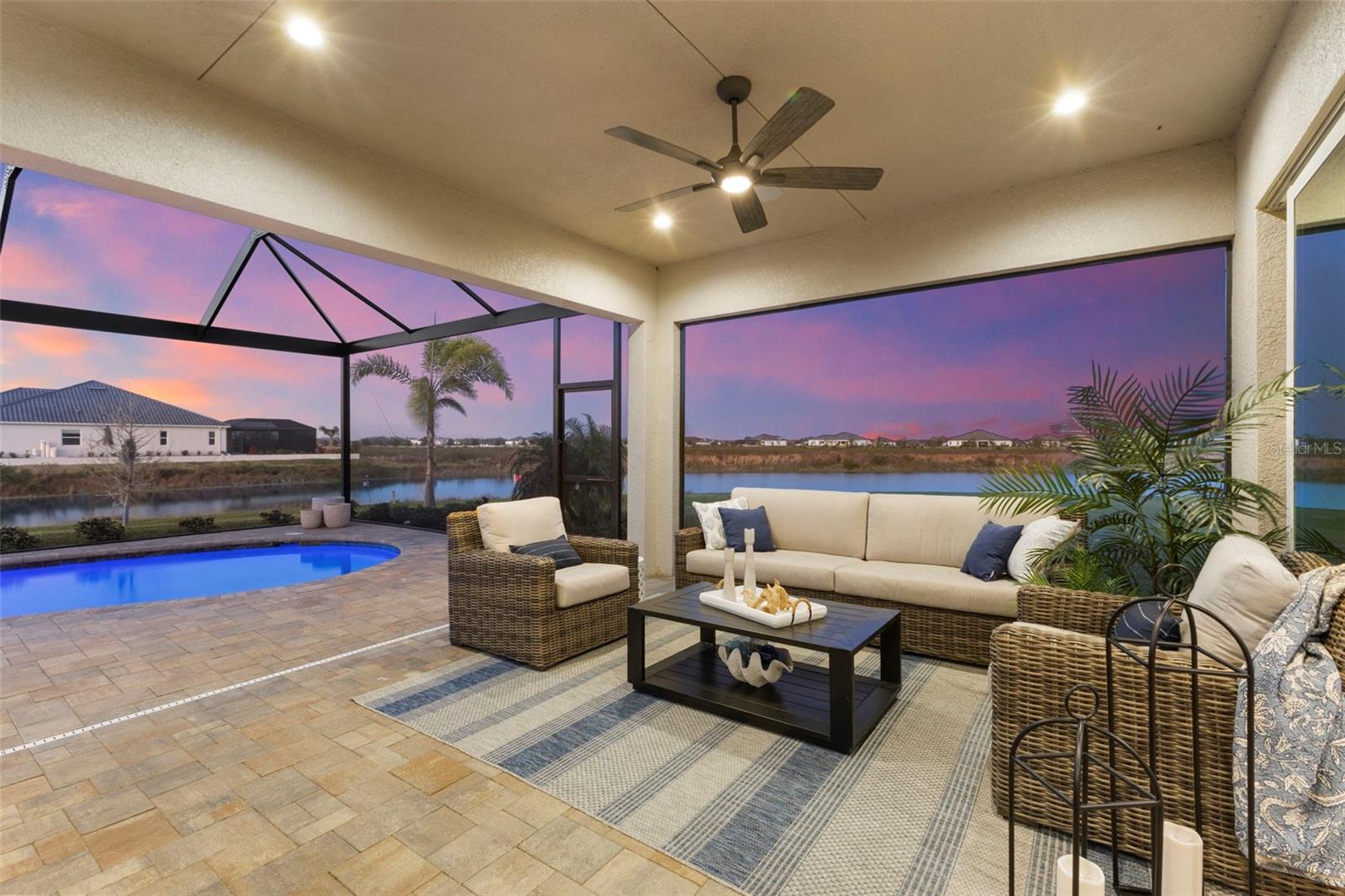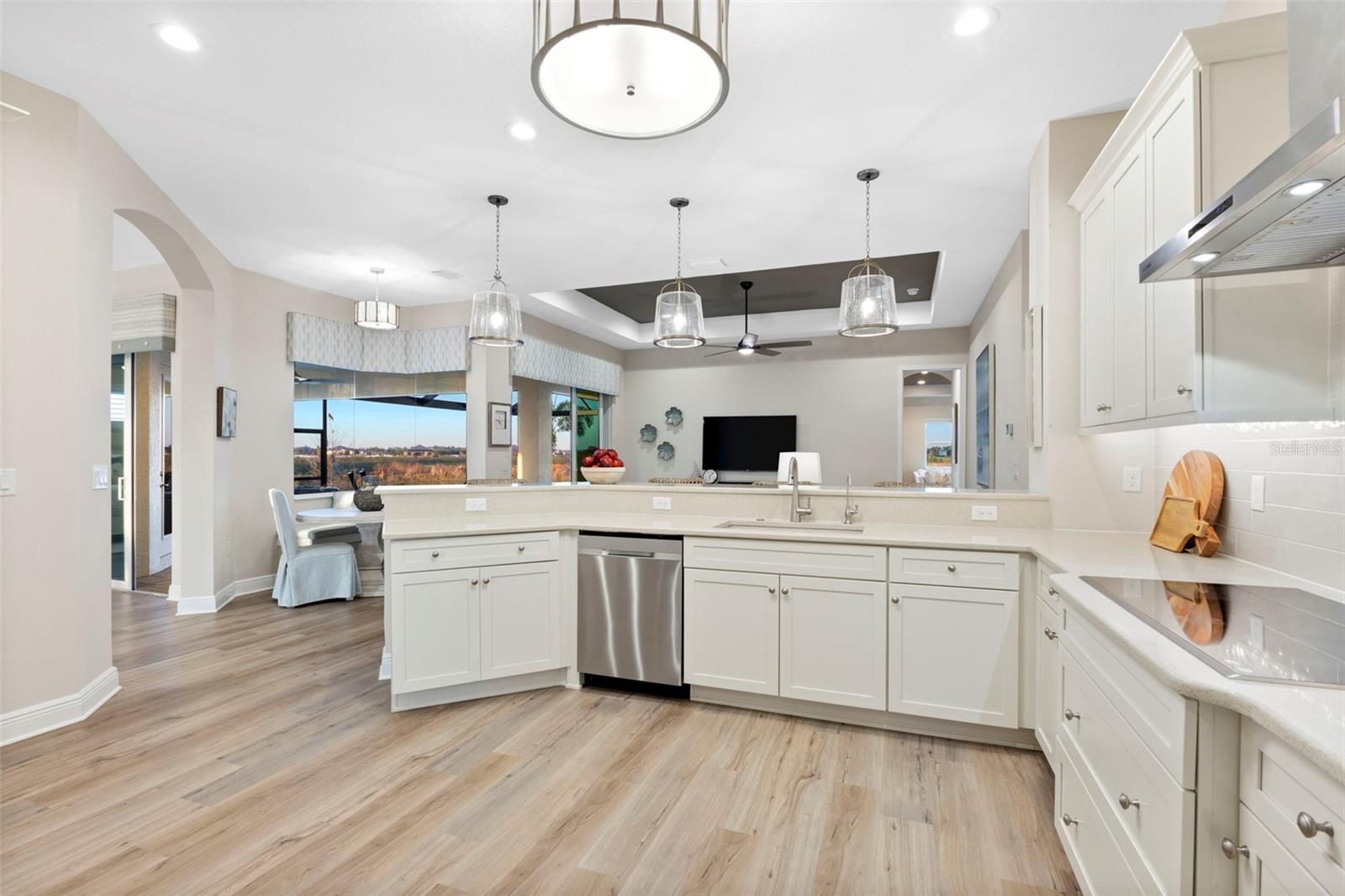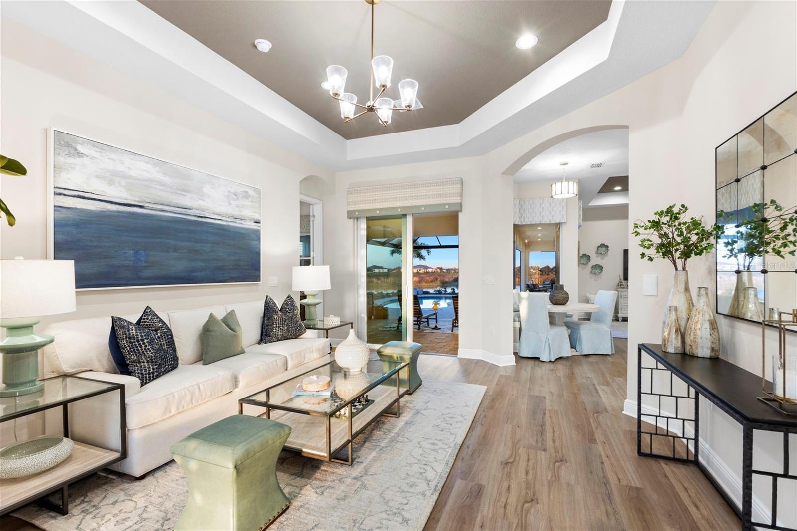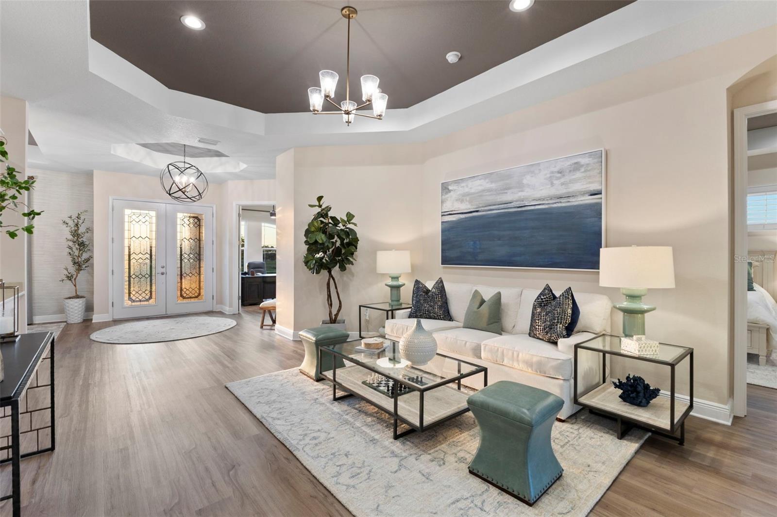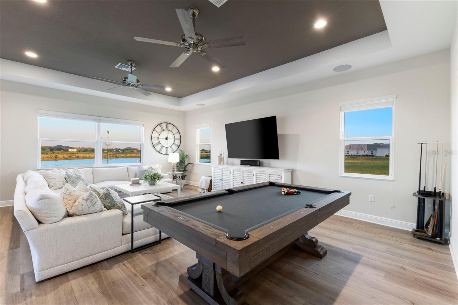Welcome to luxurious living at 3554 Recurve Circle, nestled in the serene countryside of Hampton Lakes in Sarasota, Florida. This exquisite estate offers a perfect blend of tranquility and opulence, set on a sprawling 3-acre parcel within a neighborhood just 5 miles from the vibrant Waterside Place and Lakewood Ranch. It is priced below the latest appraisal, so you could have instant equity on beautiful property. Upon arrival, be greeted by the grandeur of this estate with its expansive driveway leading to a stately 3-car garage. As you step through the double doors into the foyer, the warmth of the beautiful luxury vinyl flooring welcomes you, guiding you into an open floor plan designed for seamless living and entertaining. To the left, an elegant dining room awaits, adorned with a tray ceiling, grass cloth wallpaper, and custom lighting, setting the stage for intimate gatherings. To the right, discover a private office retreat behind double doors, offering serene views of the lush front yard. Straight ahead, an inviting seating area and butler's pantry beckon, ideal for hosting guests, with sliding glass doors opening to a picturesque pool lanai overlooking a tranquil lake, creating an oasis of relaxation. The heart of this home lies in its oversized gourmet kitchen, boasting light cabinets, a bar-height island with ample seating, double oven, induction cooktop, quartz countertops, and a light subway tile backsplash. Adjacent, a spacious laundry room leads to the garage, featuring an oversized mudroom and storage closets, ensuring effortless organization. Flowing seamlessly from the kitchen, a second living room bathes in natural light, framed by glass sliding doors and an aquarium window, offering panoramic views of the pool and surrounding landscape. A true highlight awaits at the rear of the home—a sprawling bonus room with high ceilings, tray ceiling, and space for a large sectional and pool table. Open the sliding glass pocket doors to seamlessly extend the living space onto the expansive lanai, where every corner offers breathtaking vistas of the wraparound lake, perfect for hosting unforgettable gatherings under the stars. Retreat to the luxurious Primary Suite, boasting a tray ceiling, custom closets, and a spa-like bathroom featuring quartz countertops, large mirrors, and abundant storage. Three additional bedrooms give privacy for both homeowners and guests, ensuring comfort and serenity for all. Experience the epitome of luxury living at 3554 Recurve Circle—a sanctuary where every detail is crafted for relaxation, entertainment, and timeless elegance.