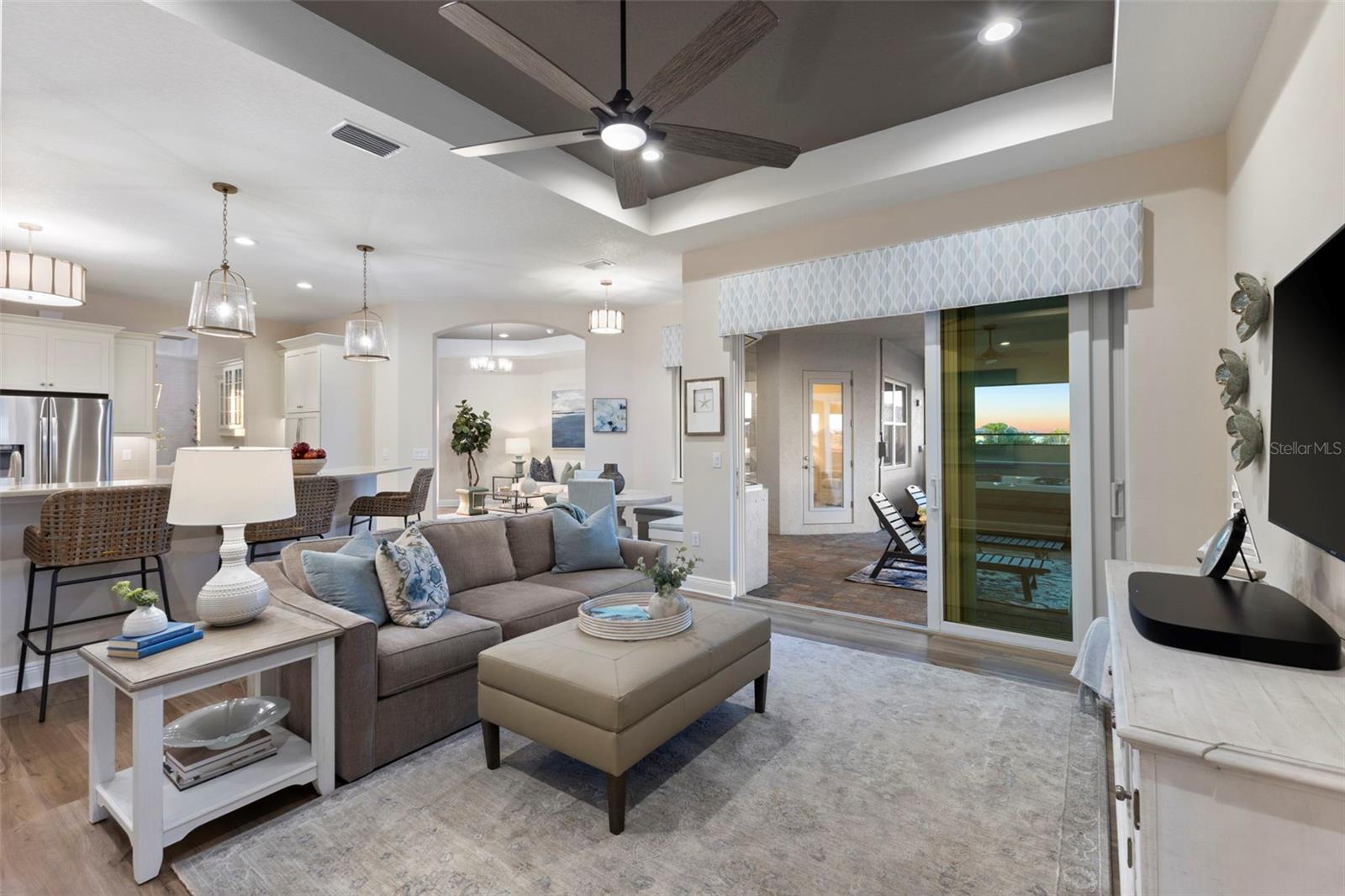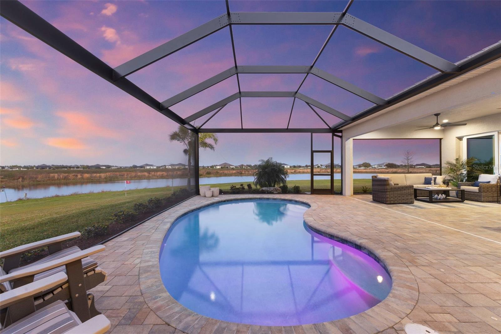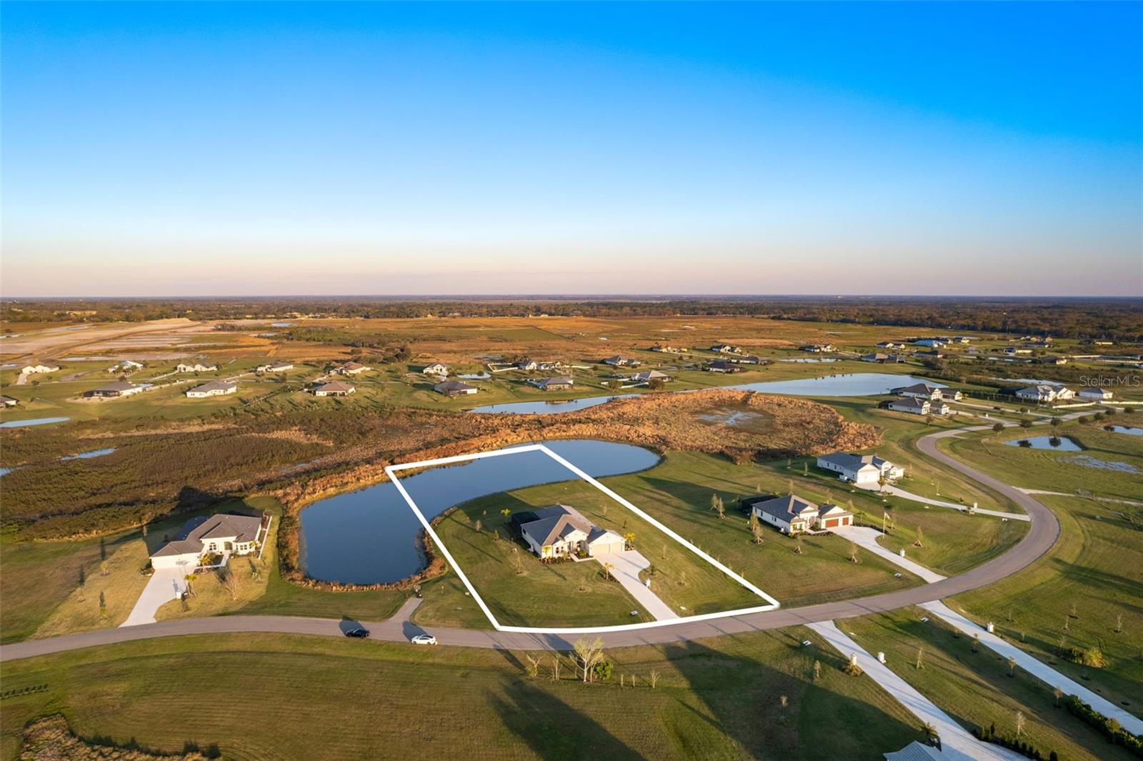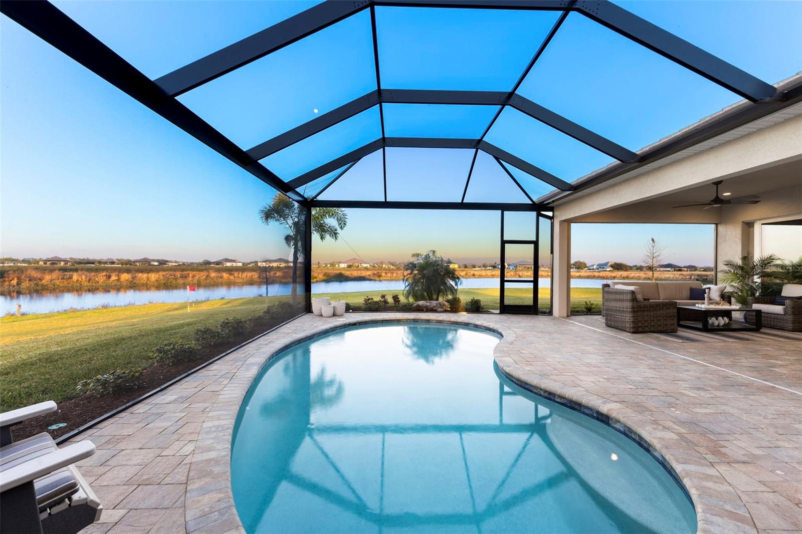 Welcome to luxurious living at 3554 Recurve Circle, nestled in the serene countryside of Hampton Lakes in Sarasota, Florida. This exquisite estate offers a perfect blend of tranquility and opulence, set on a sprawling 3-acre parcel within a neighborhood just 5 miles from the vibrant Waterside Place and Lakewood Ranch. It is priced below the latest appraisal, so you could have instant equity on beautiful property. Upon arrival, be greeted by the grandeur of this estate with its expansive driveway leading to a stately 3-car garage. As you step through the double doors into the foyer, the warmth of the beautiful luxury vinyl flooring welcomes you, guiding you into an open floor plan designed for seamless living and entertaining. To the left, an elegant dining room awaits, adorned with a tray ceiling, grass cloth wallpaper, and custom lighting, setting the stage for intimate gatherings. To the right, discover a private office retreat behind double doors, offering serene views of the lush front yard. Straight ahead, an inviting seating area and butler's pantry beckon, ideal for hosting guests, with sliding glass doors opening to a picturesque pool lanai overlooking a tranquil lake, creating an oasis of relaxation. The heart of this home lies in its oversized gourmet kitchen, boasting light cabinets, a bar-height island with ample seating, double oven, induction cooktop, quartz countertops, and a light subway tile backsplash. Adjacent, a spacious laundry room leads to the garage, featuring an oversized mudroom and storage closets, ensuring effortless organization. Flowing seamlessly from the kitchen, a second living room bathes in natural light, framed by glass sliding doors and an aquarium window, offering panoramic views of the pool and surrounding landscape. A true highlight awaits at the rear of the home—a sprawling bonus room with high ceilings, tray ceiling, and space for a large sectional and pool table. Open the sliding glass pocket doors to seamlessly extend the living space onto the expansive lanai, where every corner offers breathtaking vistas of the wraparound lake, perfect for hosting unforgettable gatherings under the stars. Retreat to the luxurious Primary Suite, boasting a tray ceiling, custom closets, and a spa-like bathroom featuring quartz countertops, large mirrors, and abundant storage. Three additional bedrooms give privacy for both homeowners and guests, ensuring comfort and serenity for all. Experience the epitome of luxury living at 3554 Recurve Circle—a sanctuary where every detail is crafted for relaxation, entertainment, and timeless elegance.