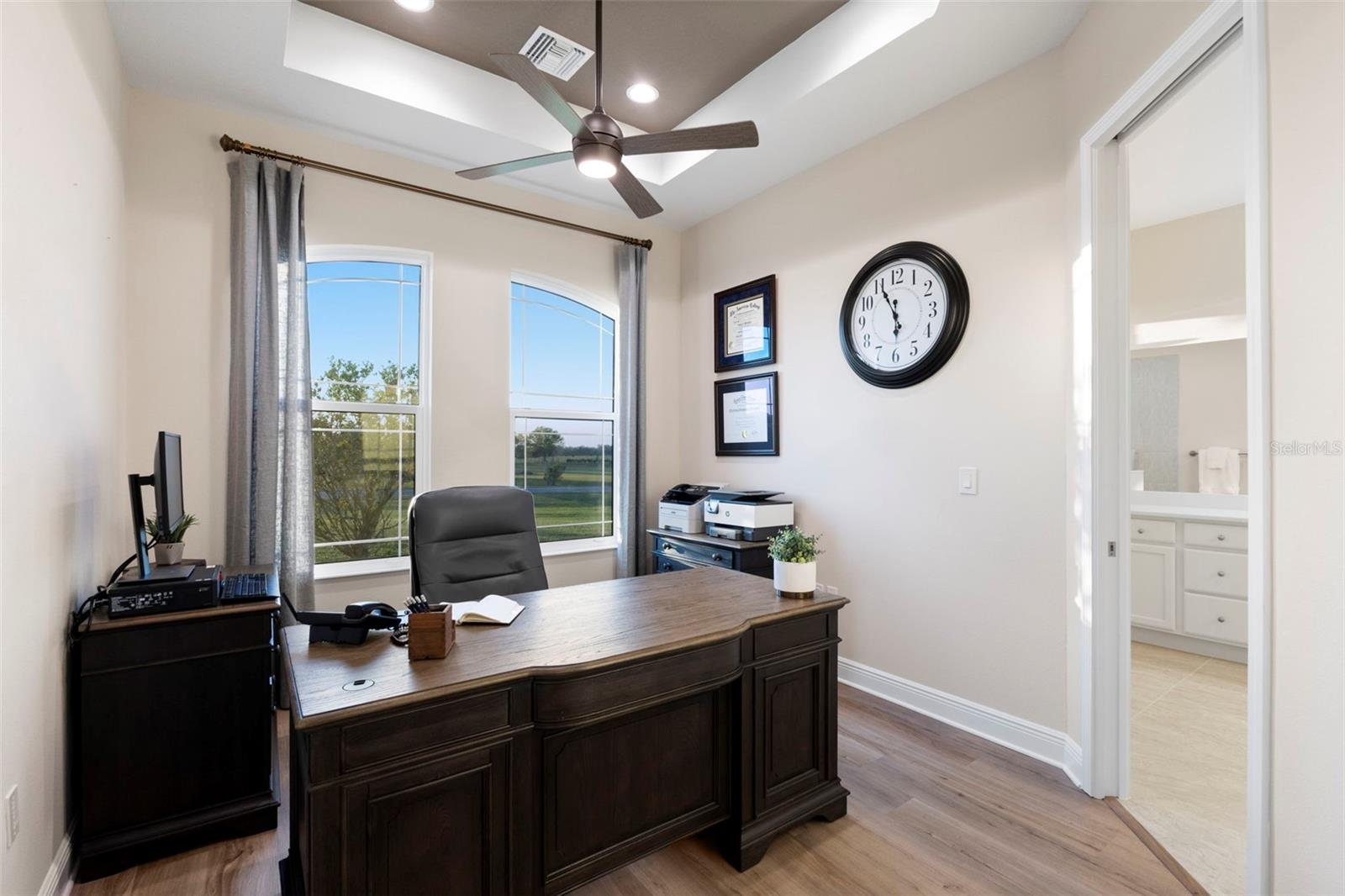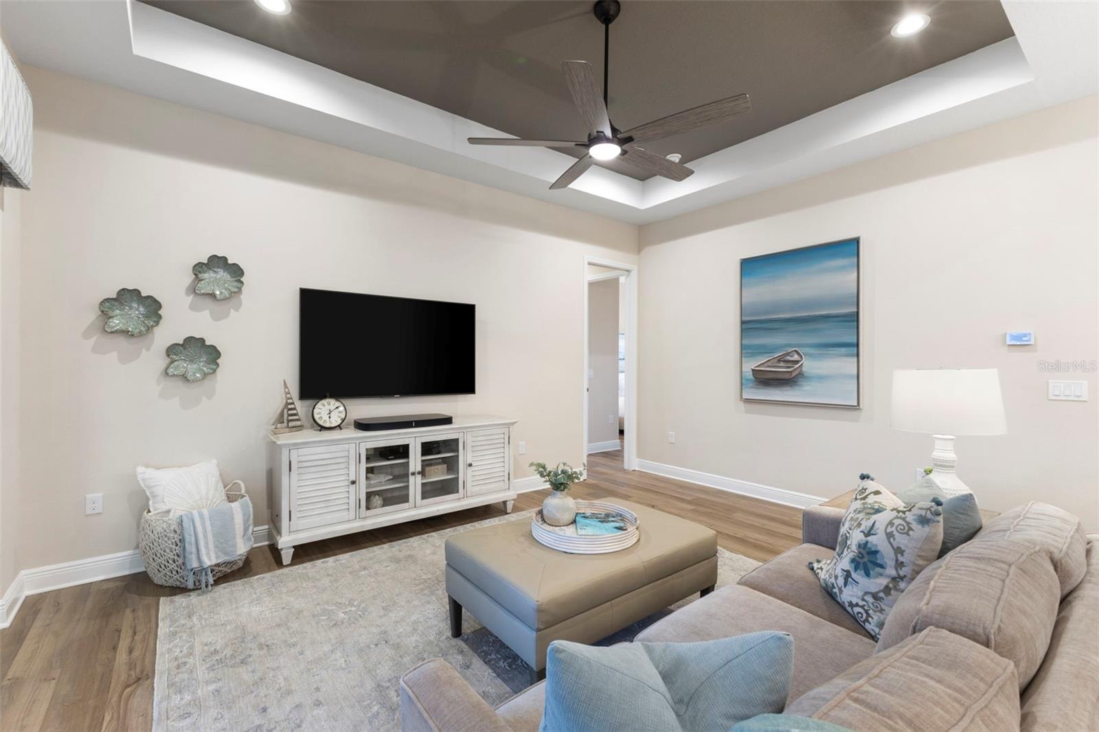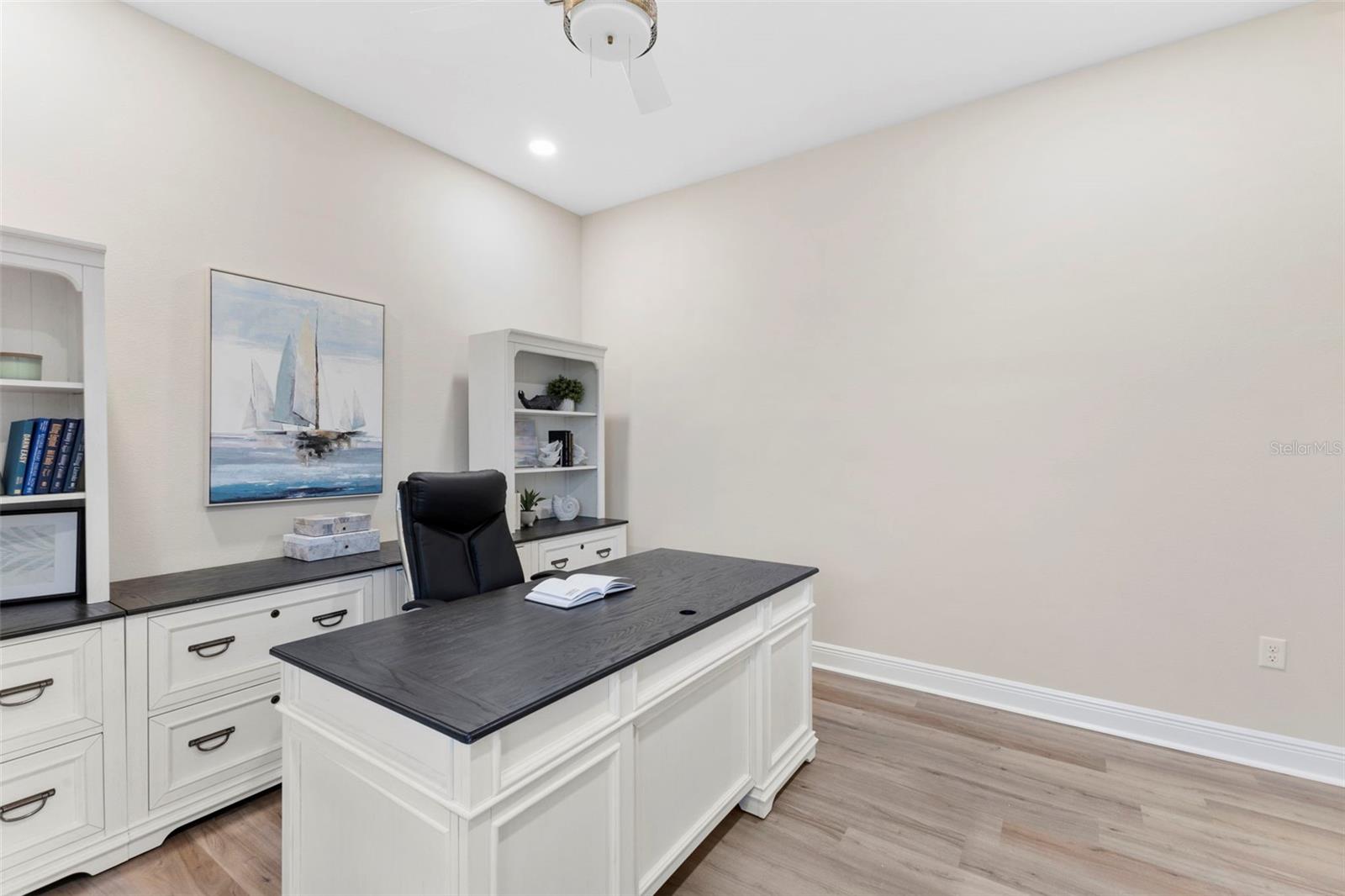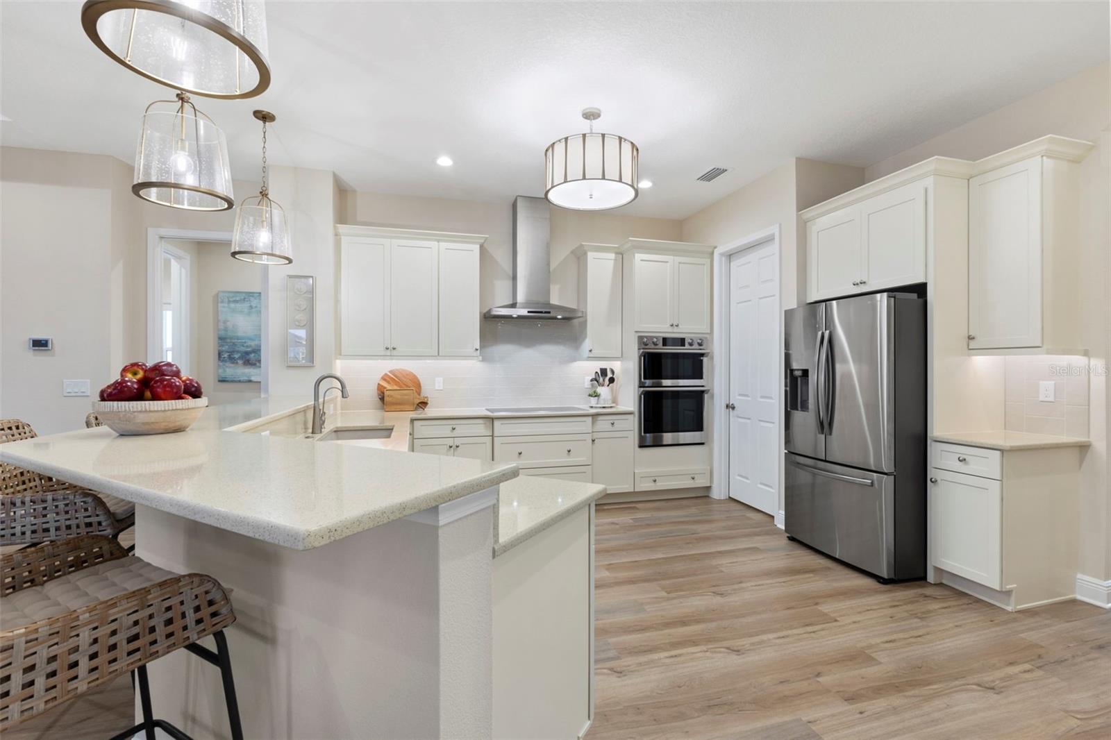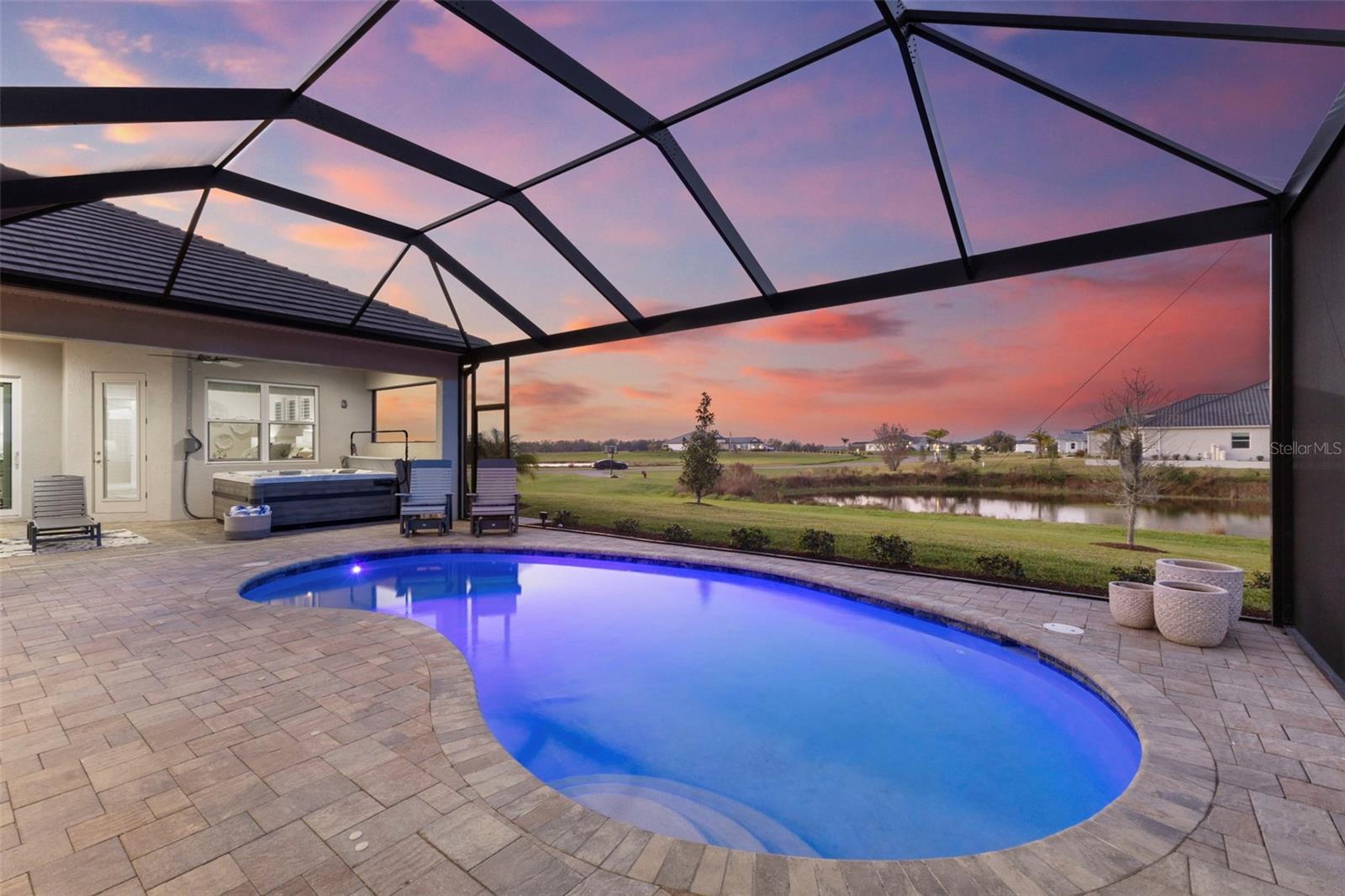 Welcome to luxurious living at 3554 Recurve Circle, nestled in the serene countryside of Hampton Lakes in Sarasota, Florida. This exquisite estate offers a perfect blend of tranquility and opulence, set on a sprawling 3-acre parcel within a neighborhood just 5 miles from the vibrant Waterside Place and Lakewood Ranch. It is priced below the latest appraisal, so you could have instant equity on beautiful property. Upon arrival, be greeted by the grandeur of this estate with its expansive driveway leading to a stately 3-car garage. As you step through the double doors into the foyer, the warmth of the beautiful luxury vinyl flooring welcomes you, guiding you into an open floor plan designed for seamless living and entertaining. To the left, an elegant dining room awaits, adorned with a tray ceiling, grass cloth wallpaper, and custom lighting, setting the stage for intimate gatherings. To the right, discover a private office retreat behind double doors, offering serene views of the lush front yard. Straight ahead, an inviting seating area and butler's pantry beckon, ideal for hosting guests, with sliding glass doors opening to a picturesque pool lanai overlooking a tranquil lake, creating an oasis of relaxation. The heart of this home lies in its oversized gourmet kitchen, boasting light cabinets, a bar-height island with ample seating, double oven, induction cooktop, quartz countertops, and a light subway tile backsplash. Adjacent, a spacious laundry room leads to the garage, featuring an oversized mudroom and storage closets, ensuring effortless organization. Flowing seamlessly from the kitchen, a second living room bathes in natural light, framed by glass sliding doors and an aquarium window, offering panoramic views of the pool and surrounding landscape. A true highlight awaits at the rear of the home—a sprawling bonus room with high ceilings, tray ceiling, and space for a large sectional and pool table. Open the sliding glass pocket doors to seamlessly extend the living space onto the expansive lanai, where every corner offers breathtaking vistas of the wraparound lake, perfect for hosting unforgettable gatherings under the stars. Retreat to the luxurious Primary Suite, boasting a tray ceiling, custom closets, and a spa-like bathroom featuring quartz countertops, large mirrors, and abundant storage. Three additional bedrooms give privacy for both homeowners and guests, ensuring comfort and serenity for all. Experience the epitome of luxury living at 3554 Recurve Circle—a sanctuary where every detail is crafted for relaxation, entertainment, and timeless elegance.