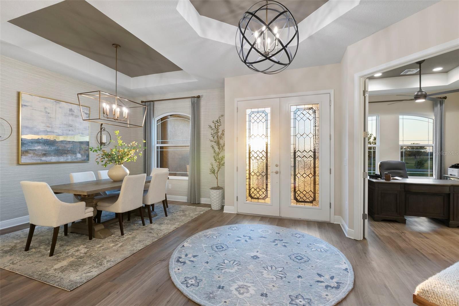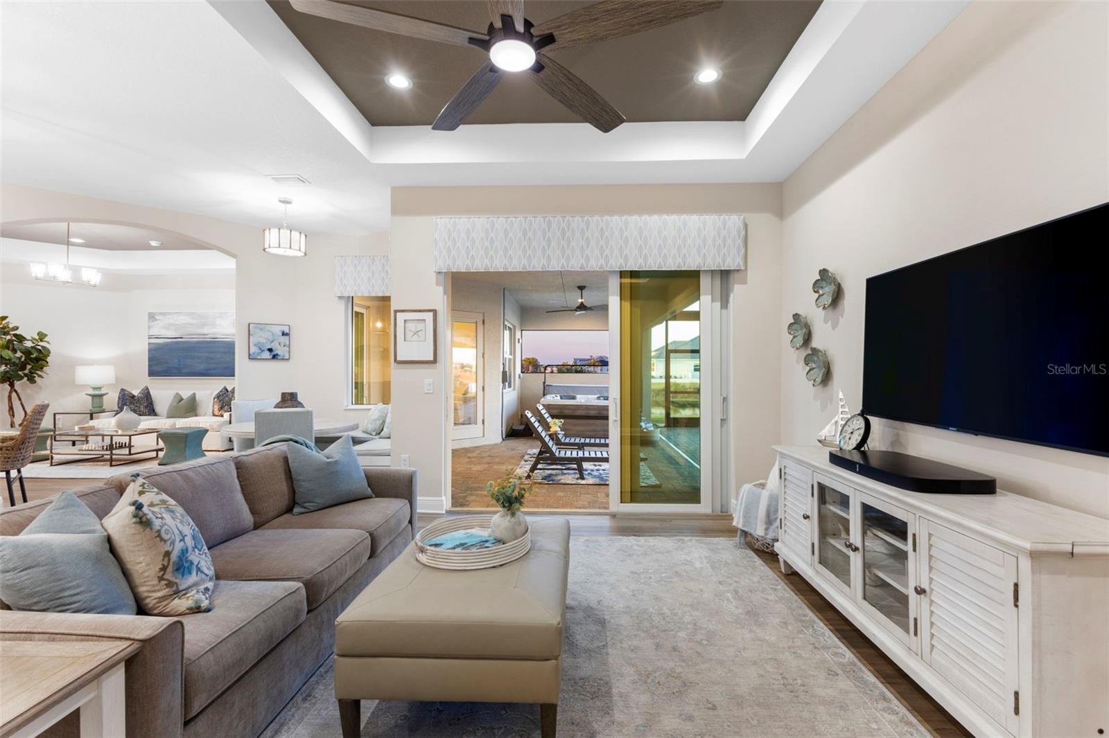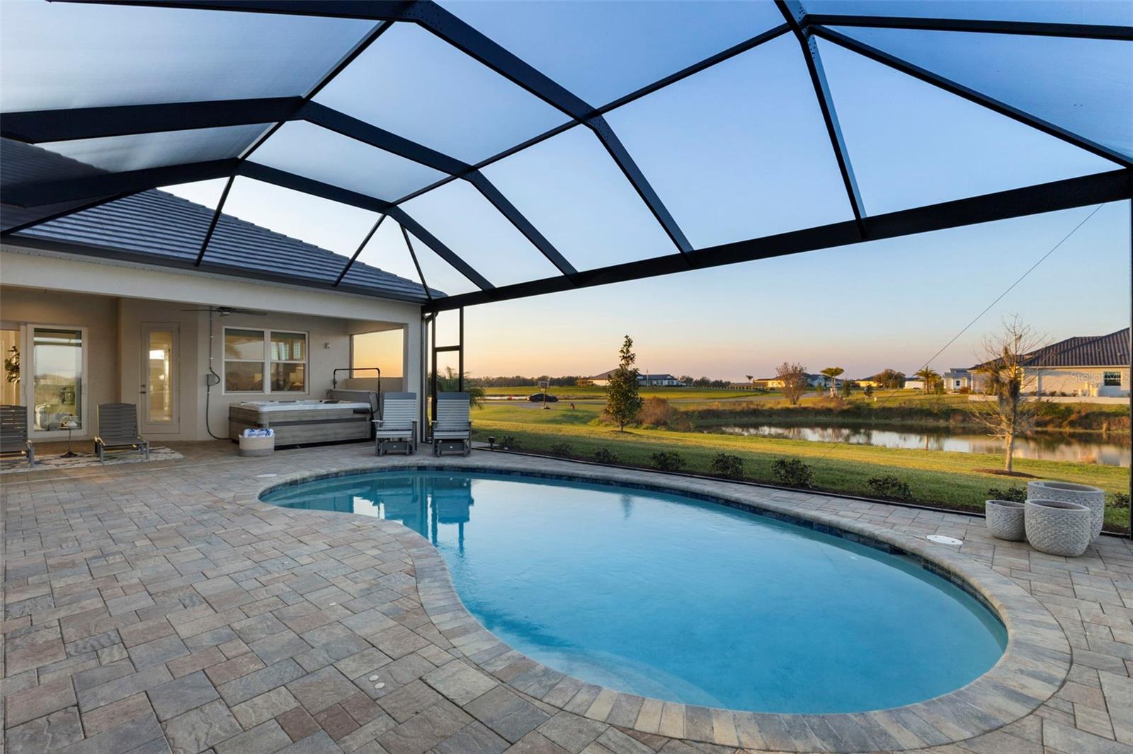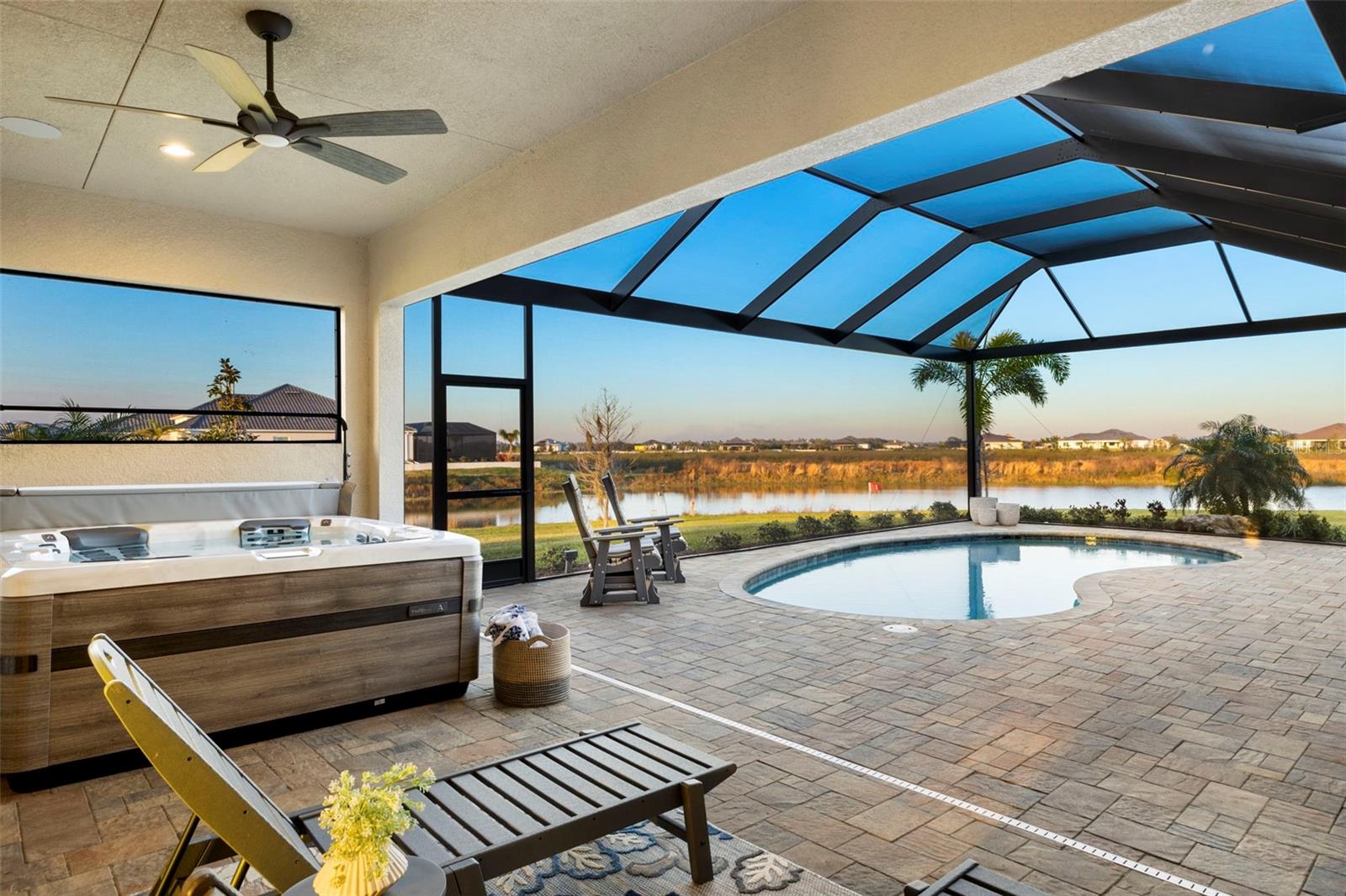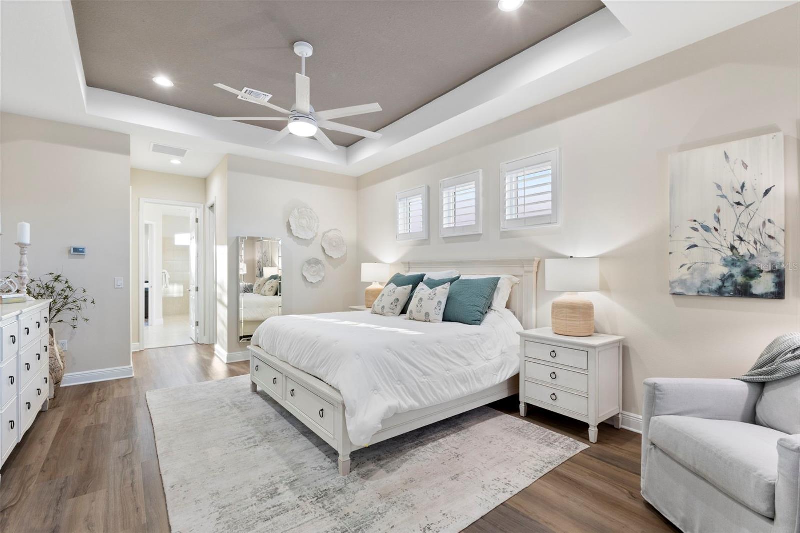 Welcome to luxurious living at 3554 Recurve Circle, nestled in the serene countryside of Hampton Lakes in Sarasota, Florida. This exquisite estate offers a perfect blend of tranquility and opulence, set on a sprawling 3-acre parcel within a neighborhood just 5 miles from the vibrant Waterside Place and Lakewood Ranch. It is priced below the latest appraisal, so you could have instant equity on beautiful property. Upon arrival, be greeted by the grandeur of this estate with its expansive driveway leading to a stately 3-car garage. As you step through the double doors into the foyer, the warmth of the beautiful luxury vinyl flooring welcomes you, guiding you into an open floor plan designed for seamless living and entertaining. To the left, an elegant dining room awaits, adorned with a tray ceiling, grass cloth wallpaper, and custom lighting, setting the stage for intimate gatherings. To the right, discover a private office retreat behind double doors, offering serene views of the lush front yard. Straight ahead, an inviting seating area and butler's pantry beckon, ideal for hosting guests, with sliding glass doors opening to a picturesque pool lanai overlooking a tranquil lake, creating an oasis of relaxation. The heart of this home lies in its oversized gourmet kitchen, boasting light cabinets, a bar-height island with ample seating, double oven, induction cooktop, quartz countertops, and a light subway tile backsplash. Adjacent, a spacious laundry room leads to the garage, featuring an oversized mudroom and storage closets, ensuring effortless organization. Flowing seamlessly from the kitchen, a second living room bathes in natural light, framed by glass sliding doors and an aquarium window, offering panoramic views of the pool and surrounding landscape. A true highlight awaits at the rear of the home—a sprawling bonus room with high ceilings, tray ceiling, and space for a large sectional and pool table. Open the sliding glass pocket doors to seamlessly extend the living space onto the expansive lanai, where every corner offers breathtaking vistas of the wraparound lake, perfect for hosting unforgettable gatherings under the stars. Retreat to the luxurious Primary Suite, boasting a tray ceiling, custom closets, and a spa-like bathroom featuring quartz countertops, large mirrors, and abundant storage. Three additional bedrooms give privacy for both homeowners and guests, ensuring comfort and serenity for all. Experience the epitome of luxury living at 3554 Recurve Circle—a sanctuary where every detail is crafted for relaxation, entertainment, and timeless elegance.