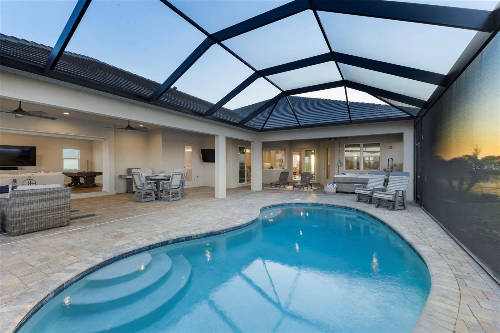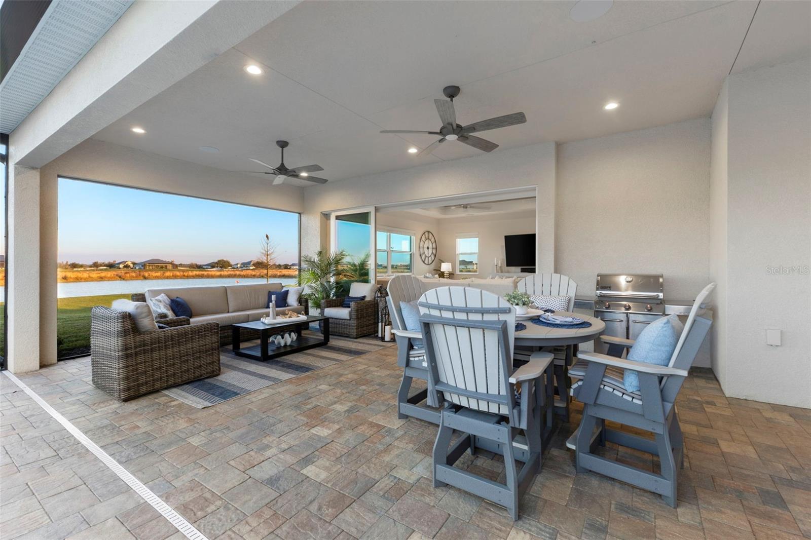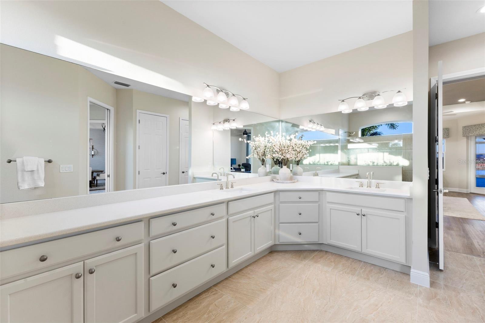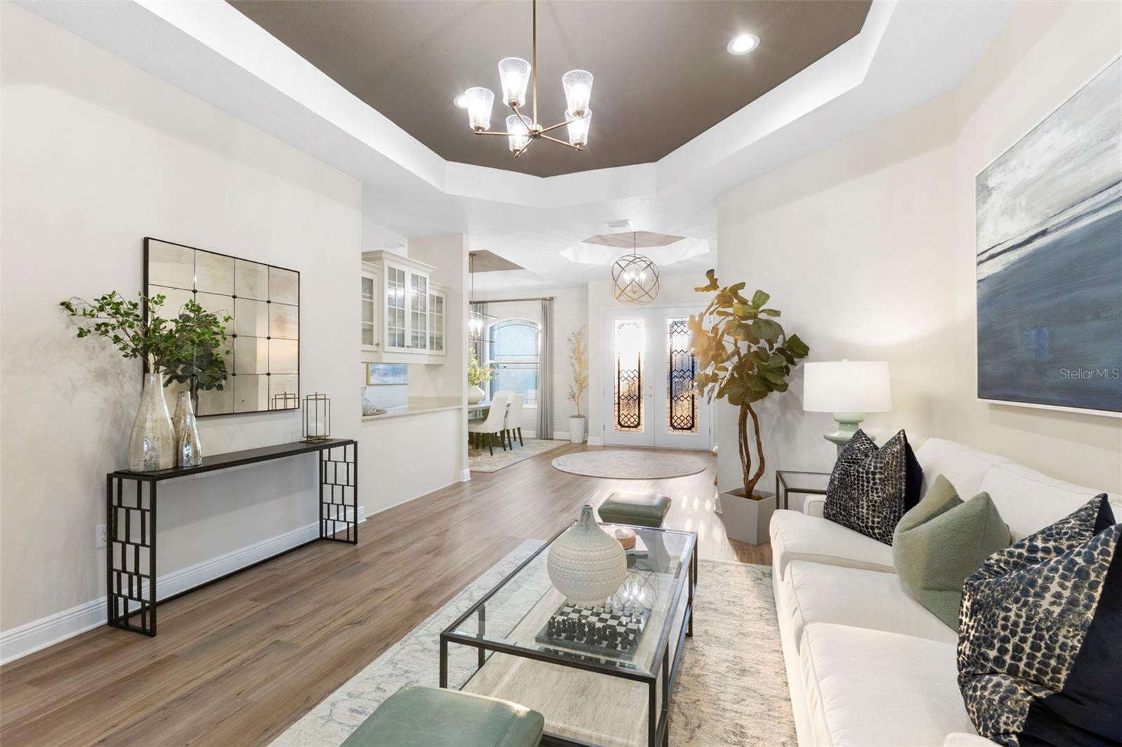 Welcome to luxurious living at 3554 Recurve Circle, nestled in the serene countryside of Hampton Lakes in Sarasota, Florida. This exquisite estate offers a perfect blend of tranquility and opulence, set on a sprawling 3-acre parcel within a neighborhood just 5 miles from the vibrant Waterside Place and Lakewood Ranch. It is priced below the latest appraisal, so you could have instant equity on beautiful property. Upon arrival, be greeted by the grandeur of this estate with its expansive driveway leading to a stately 3-car garage. As you step through the double doors into the foyer, the warmth of the beautiful luxury vinyl flooring welcomes you, guiding you into an open floor plan designed for seamless living and entertaining. To the left, an elegant dining room awaits, adorned with a tray ceiling, grass cloth wallpaper, and custom lighting, setting the stage for intimate gatherings. To the right, discover a private office retreat behind double doors, offering serene views of the lush front yard. Straight ahead, an inviting seating area and butler's pantry beckon, ideal for hosting guests, with sliding glass doors opening to a picturesque pool lanai overlooking a tranquil lake, creating an oasis of relaxation. The heart of this home lies in its oversized gourmet kitchen, boasting light cabinets, a bar-height island with ample seating, double oven, induction cooktop, quartz countertops, and a light subway tile backsplash. Adjacent, a spacious laundry room leads to the garage, featuring an oversized mudroom and storage closets, ensuring effortless organization. Flowing seamlessly from the kitchen, a second living room bathes in natural light, framed by glass sliding doors and an aquarium window, offering panoramic views of the pool and surrounding landscape. A true highlight awaits at the rear of the home—a sprawling bonus room with high ceilings, tray ceiling, and space for a large sectional and pool table. Open the sliding glass pocket doors to seamlessly extend the living space onto the expansive lanai, where every corner offers breathtaking vistas of the wraparound lake, perfect for hosting unforgettable gatherings under the stars. Retreat to the luxurious Primary Suite, boasting a tray ceiling, custom closets, and a spa-like bathroom featuring quartz countertops, large mirrors, and abundant storage. Three additional bedrooms give privacy for both homeowners and guests, ensuring comfort and serenity for all. Experience the epitome of luxury living at 3554 Recurve Circle—a sanctuary where every detail is crafted for relaxation, entertainment, and timeless elegance.