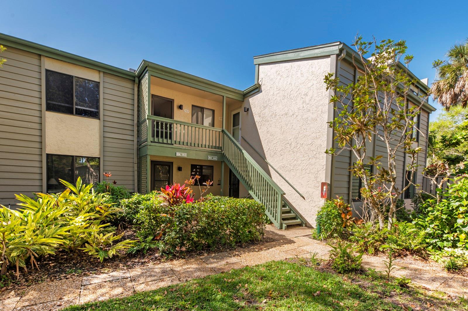 See the beautiful Little Sarasota Bay from your home every day! A light-filled and airy 3-bedroom/2-bath condo awaits you in one of Sarasota’s most popular residential communities. With its soaring cathedral ceilings, clerestory windows, generous, open floorplan, and sparkling waterfront just beyond a lush lawn and tropical plantings, it would be hard to find a more gracious home. Meticulous renovations include a premier, high capacity AC system, new water heater, luxury vinyl flooring, quarts countertops in the kitchen, and granite in both bathrooms with glass doors. Centrally located within the 75-acre, botanic garden-like setting of Pelican Cove, this second floor unit is a quick walk to the main resort-style heated pool at the historic Wilbanks clubhouse that serves as host for music concerts and events. Across the way is a picturesque 87-boat slip harbor. A charming gated community that has it all; Pelican Cove residents enjoy a unique blend of natural habitats and well-maintained landscaping, miles of scenic walking and biking trails, a fitness room, pickleball courts, and lighted tennis courts, as well as multiple other recreational and cultural venues/activities. The unit comes with a carport space and storage shed, while the grounds and building exterior maintenance are covered by the HOA fees. A sweet, sweet bonus: all furnishings shown in the listing are included in the sale.