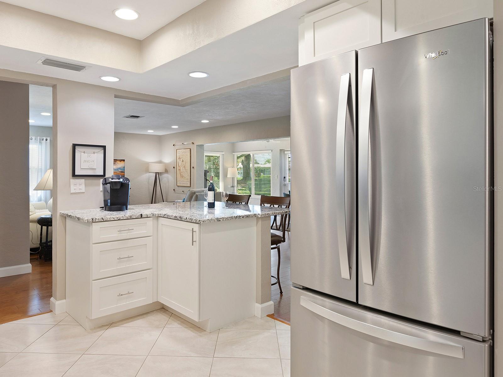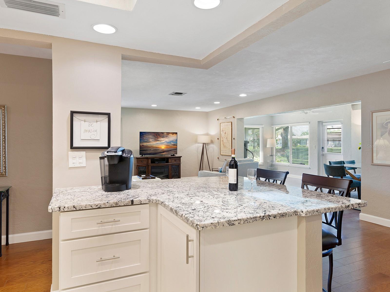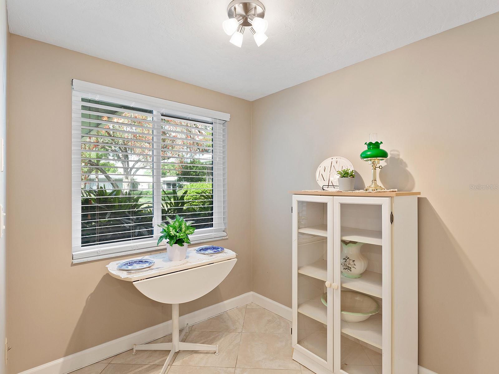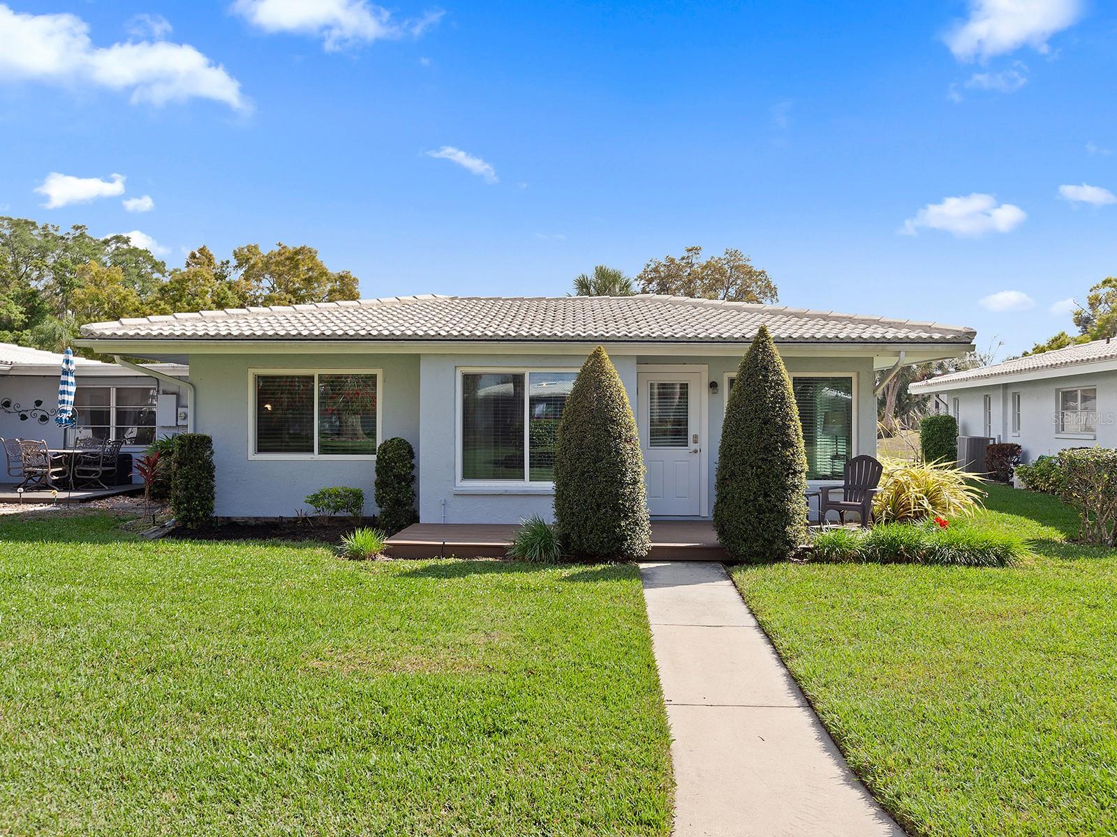 Prepare to be enchanted as you step into this move-in ready villa offering two spacious bedrooms, two full baths, a den/office area, and the icing on the cake- a generously sized great/bonus room overlooking lovely landscaped grounds and trees. Upon entering, be greeted by an abundance of natural light that illuminates the living space adorned with modern finishes and thoughtful touches throughout, seamlessly blending style and functionality. The open-plan layout effortlessly connects the living area, dining space, and kitchen, creating an ideal setting for both relaxation and entertainment. The nicely equipped kitchen features single-shaker cabinetry, granite countertops, and stainless steel appliances, making meal preparation a pleasure. Enjoy your morning coffee while birdwatching from the cozy breakfast nook or an evening cocktail from your private patio, where you can unwind amidst tranquil surroundings. Peace of mind ensues with hurricane-rated windows in many of the main rooms. Convenience is key with an inside laundry and attached garage, providing secure parking and additional storage solutions. Outside, the community offers a serene oasis to explore at your leisure, whether you're taking a refreshing dip in the sparkling pool or immersing yourself in the beauty of nature with a leisurely stroll along the walking path. Located in a 55+ community in a prime central location, it offers easy access to shopping, dining, entertainment, and all the amenities you desire, whether you're seeking a relaxing retreat or an active social lifestyle, this renovated villa offers a lifestyle of comfort and sophistication. Don't miss the opportunity to make it yours!