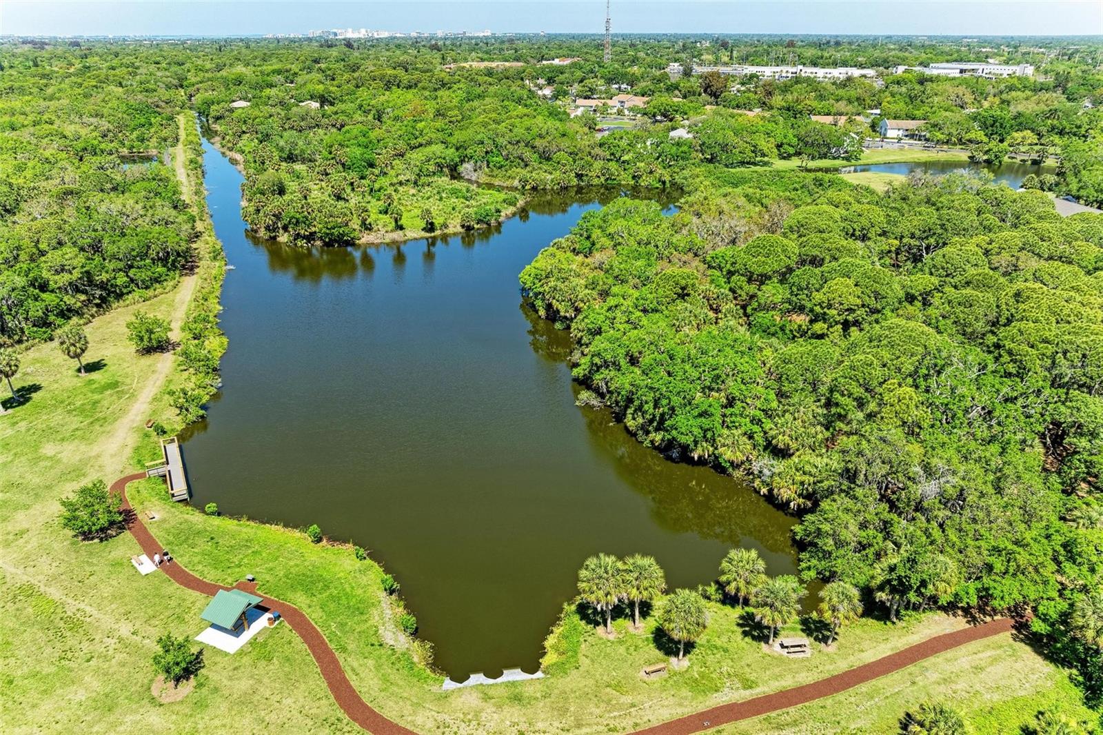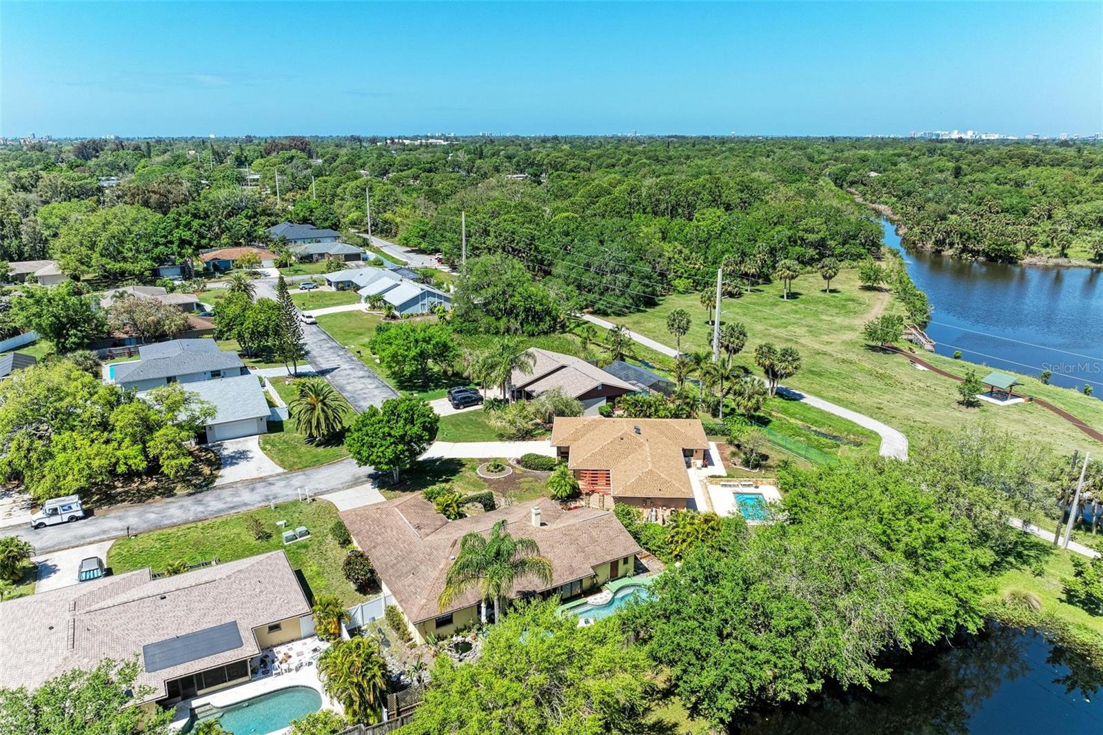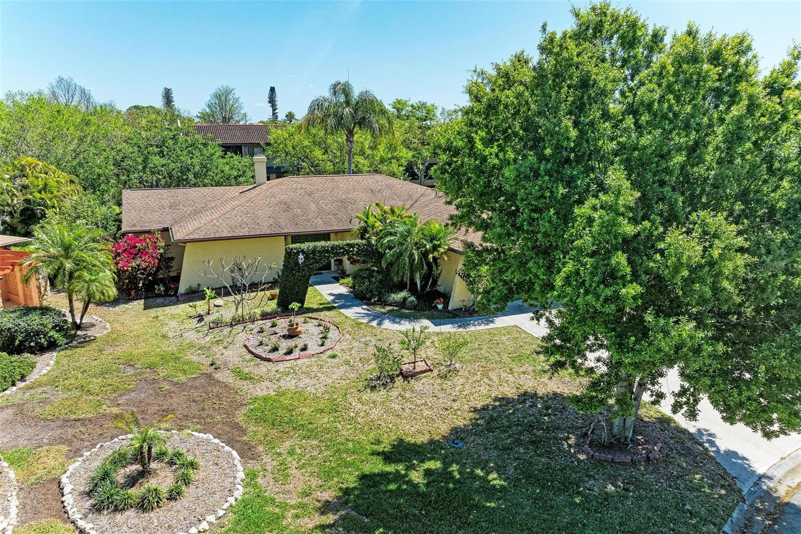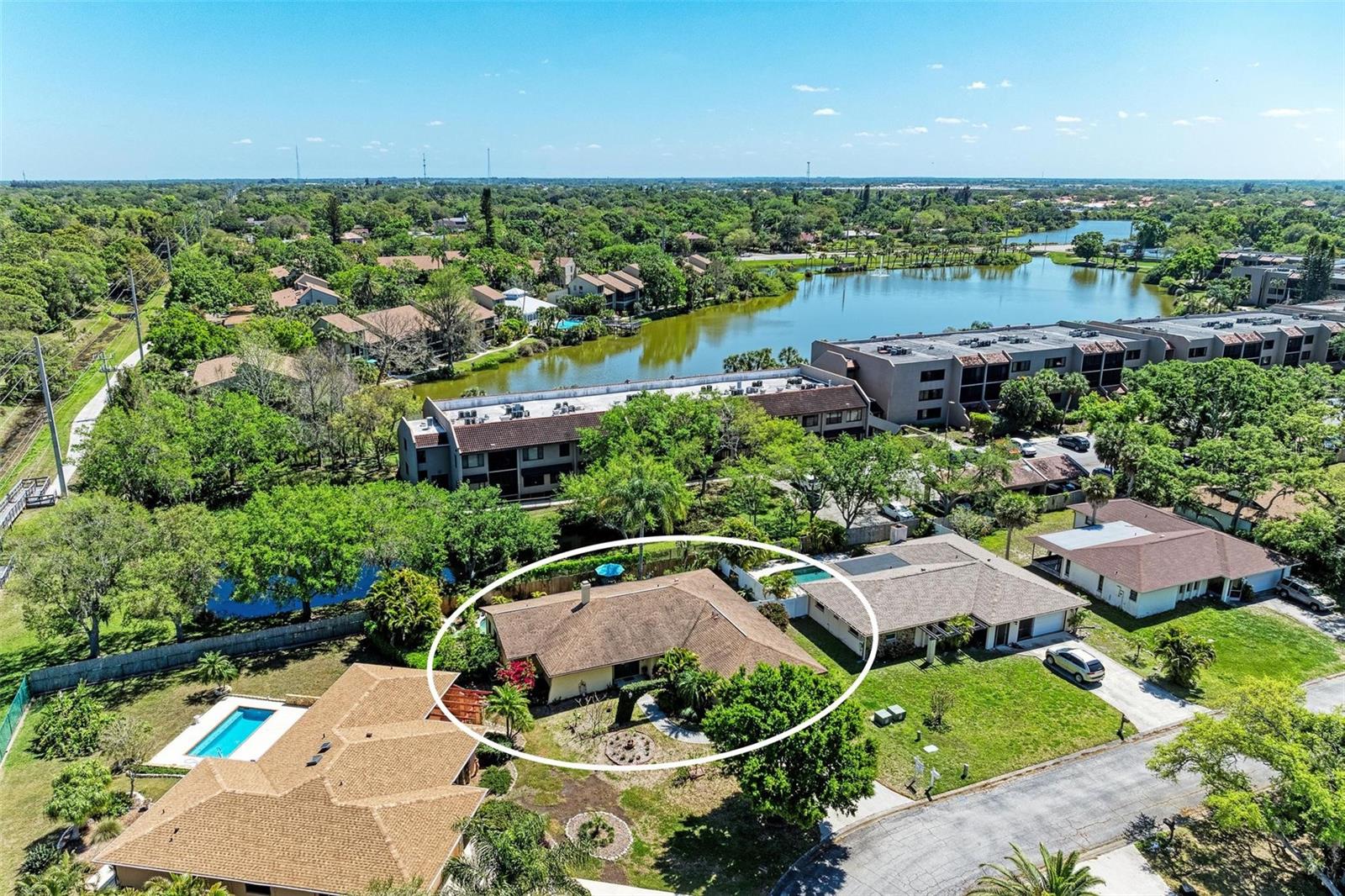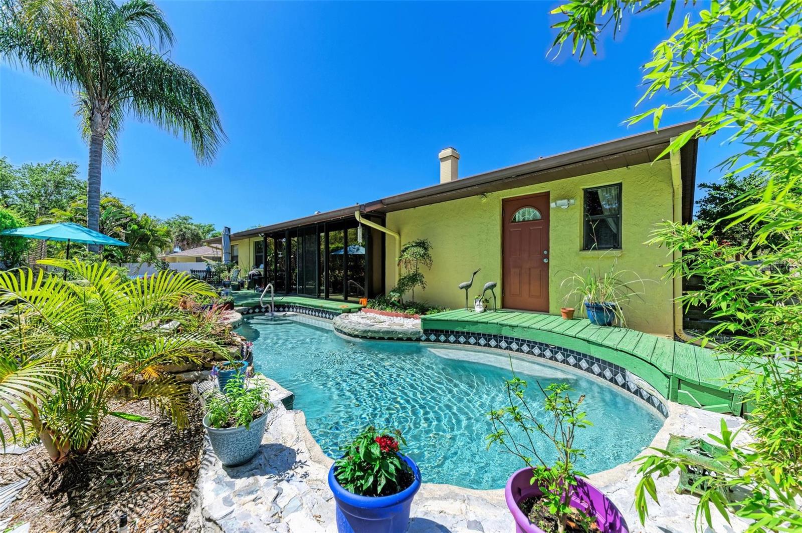 Serenity, beauty, and charm with a heated saltwater pool. How could you ask for more? Features include cathedral ceilings, built-in bookcases, split floor plan, fireplace, double sink bathroom with grab bars, 4 bedrooms, 2 baths, office, enclosed patio, 4th room as nursery, exercise or craft room all with high quality Pergo flooring. Borders Red Bug Slough Park with walking and biking trails, dog park, and lake stocked with bass. Backyard garden with unique lagoon pool and fish pond. The pool is concrete and is salt water and has a newer electric pool heater. Quiet deed-restricted neighborhood tucked away from traffic yet accessible to shopping and Siesta Key Beach. Westlake Estates is a small HOA community of 65 homes with low HOA fees. This home was originally built and owned by the famous cartoonist, Dik Brown, creator of Hi and Lois and Hagar the Horrible.