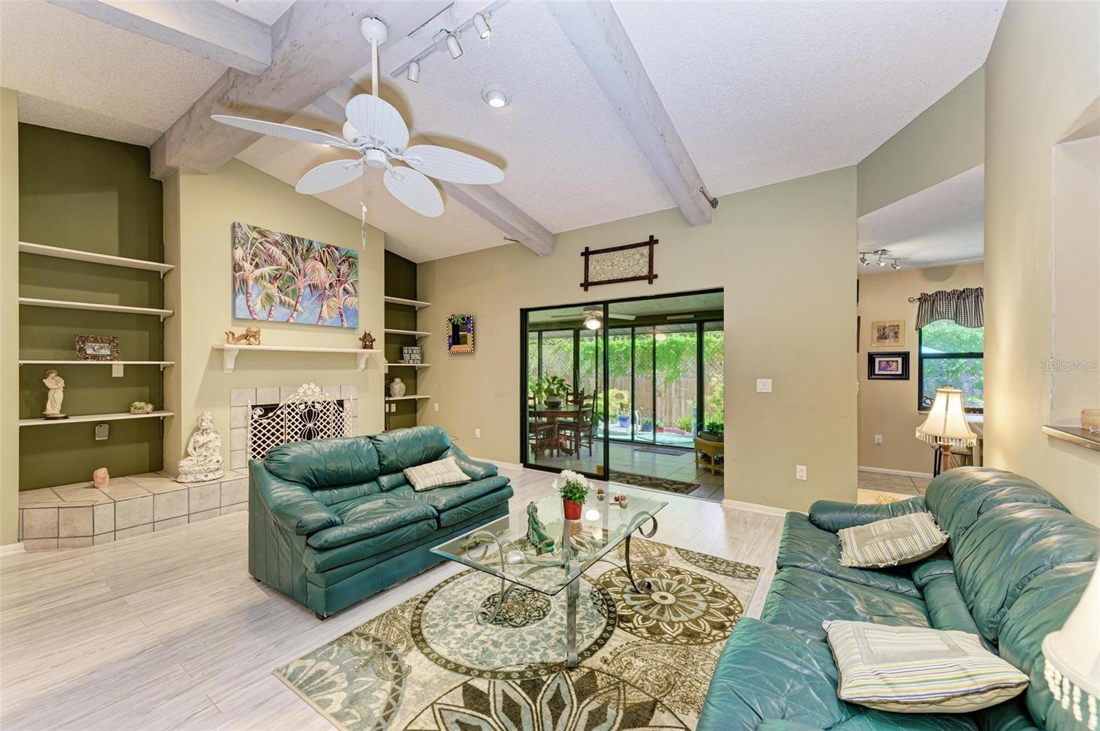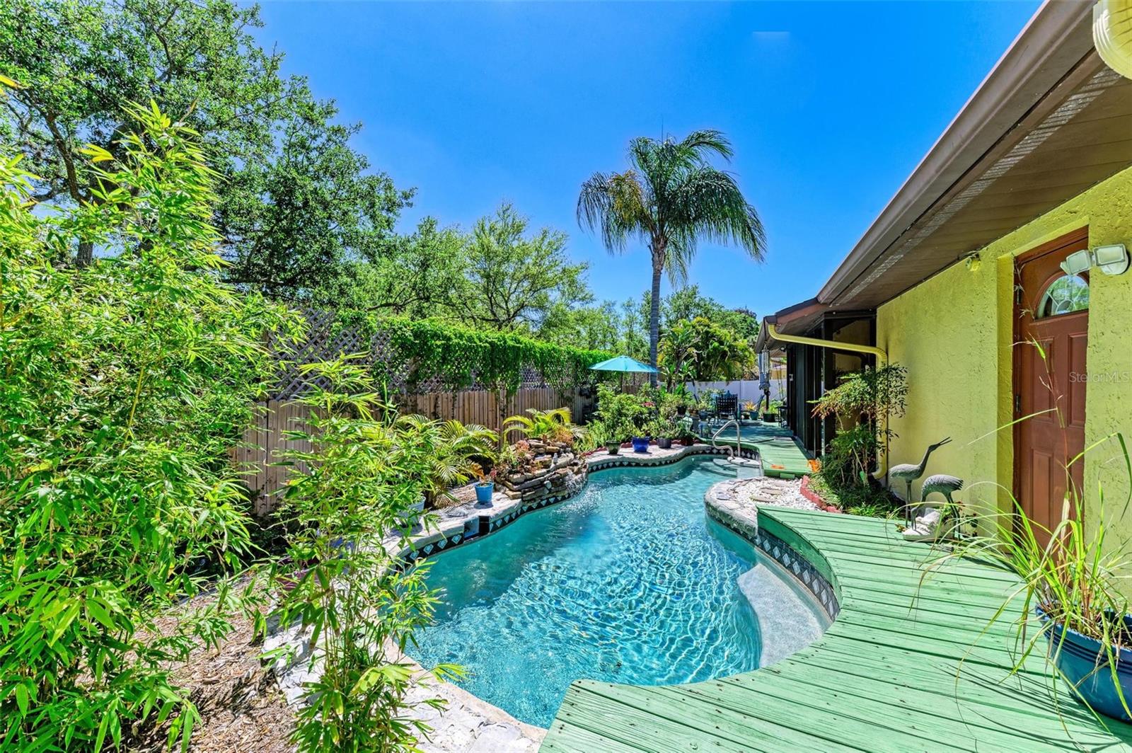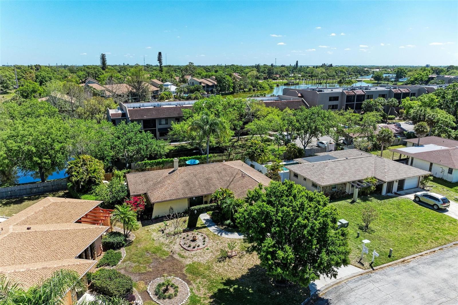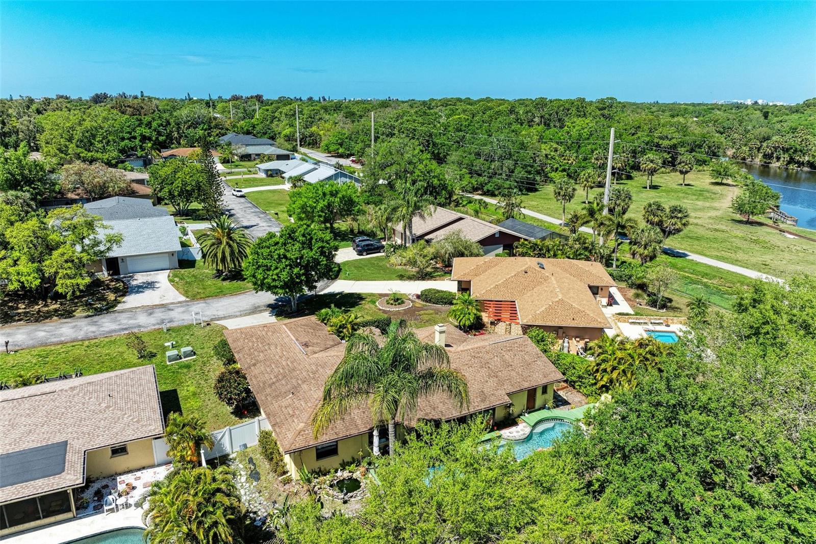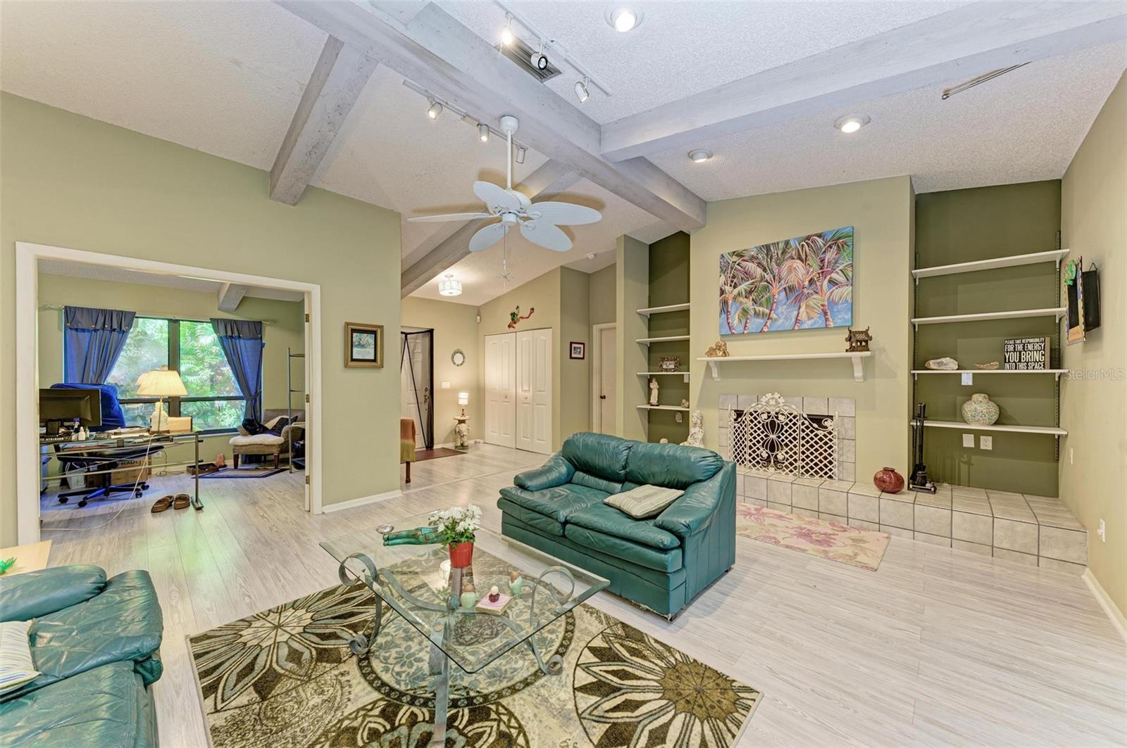 Serenity, beauty, and charm with a heated saltwater pool. How could you ask for more? Features include cathedral ceilings, built-in bookcases, split floor plan, fireplace, double sink bathroom with grab bars, 4 bedrooms, 2 baths, office, enclosed patio, 4th room as nursery, exercise or craft room all with high quality Pergo flooring. Borders Red Bug Slough Park with walking and biking trails, dog park, and lake stocked with bass. Backyard garden with unique lagoon pool and fish pond. The pool is concrete and is salt water and has a newer electric pool heater. Quiet deed-restricted neighborhood tucked away from traffic yet accessible to shopping and Siesta Key Beach. Westlake Estates is a small HOA community of 65 homes with low HOA fees. This home was originally built and owned by the famous cartoonist, Dik Brown, creator of Hi and Lois and Hagar the Horrible.