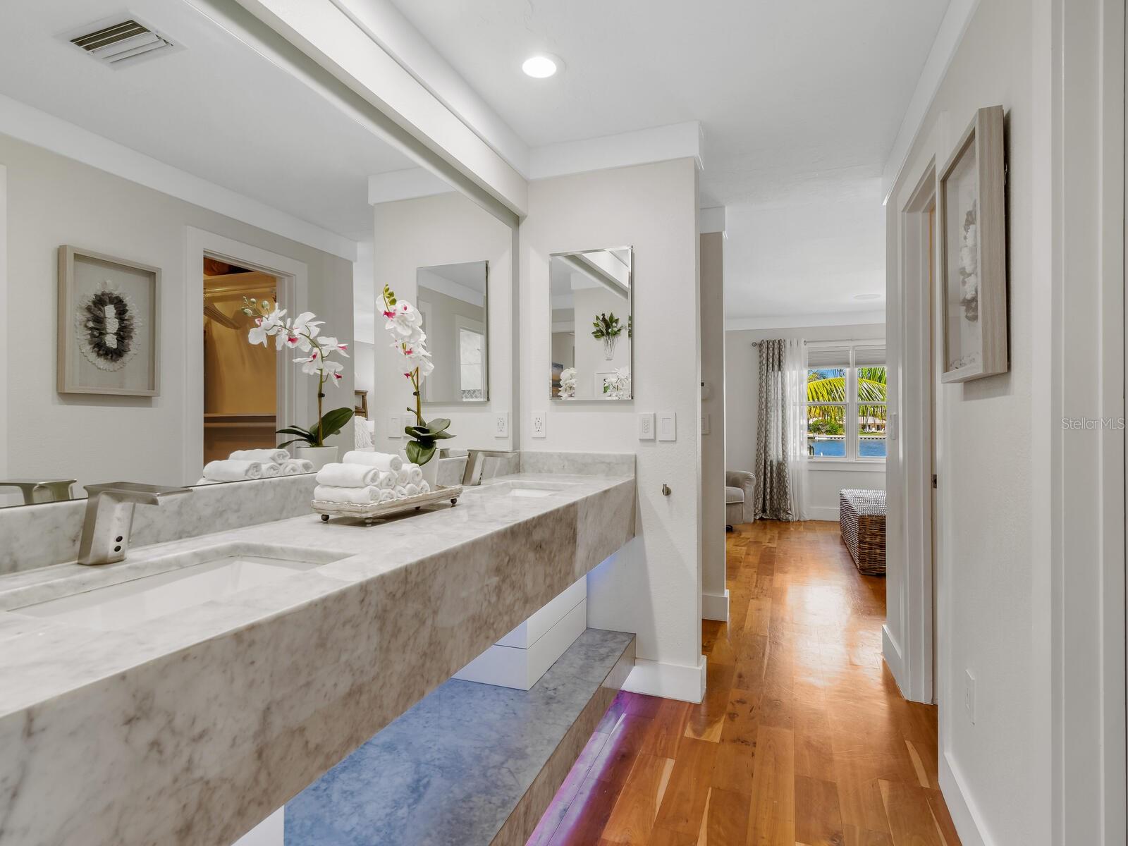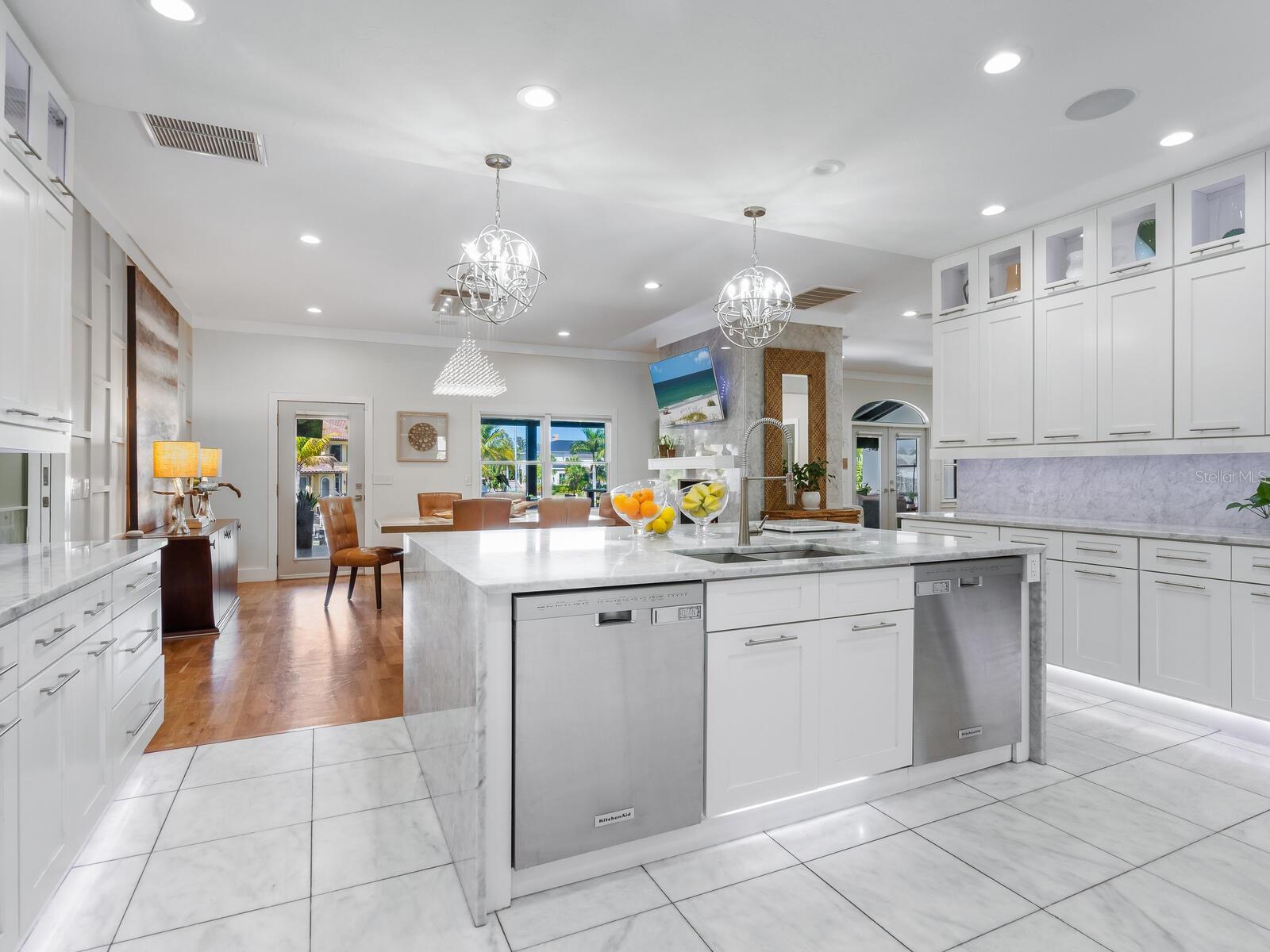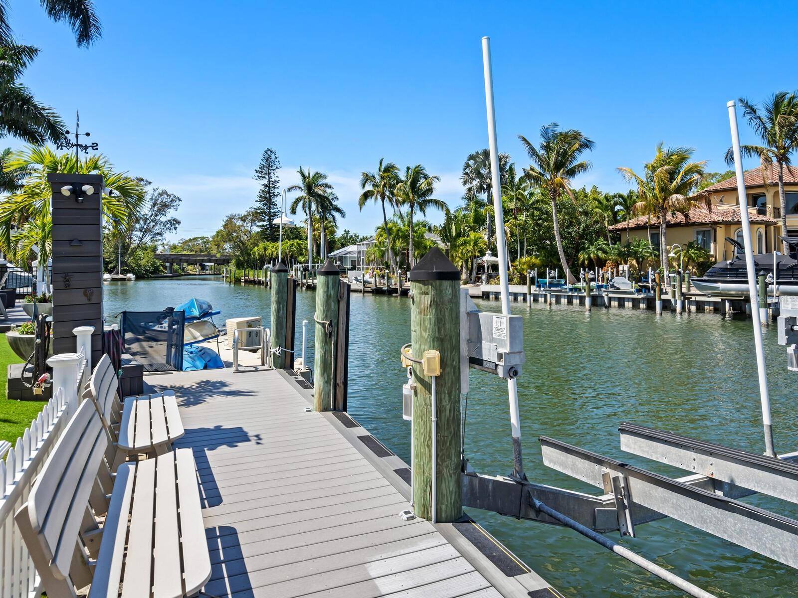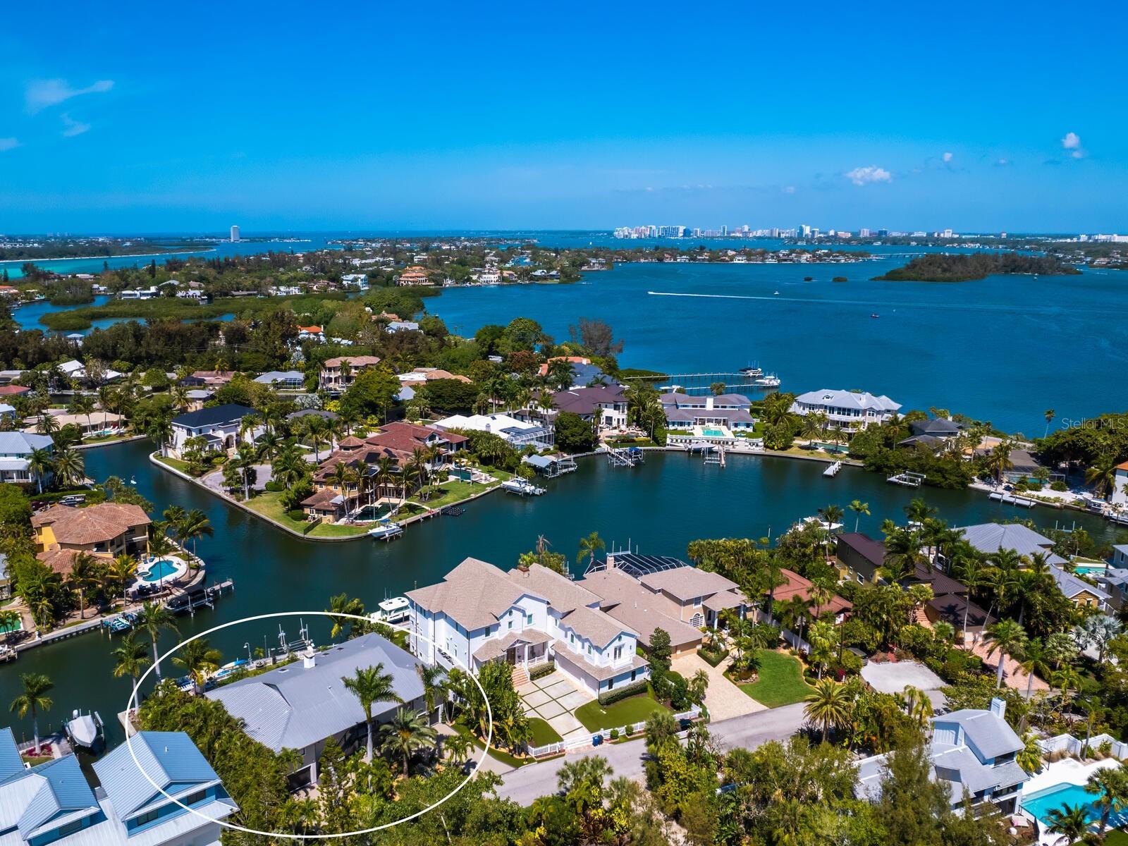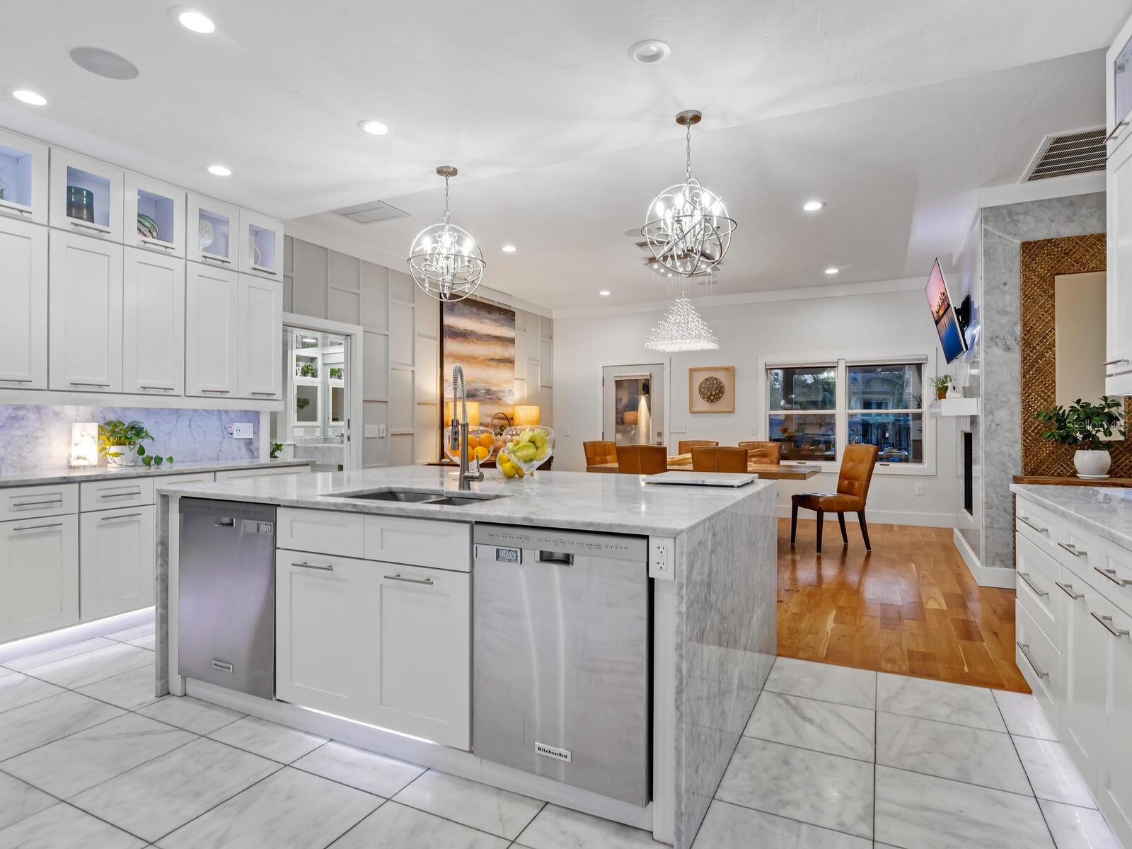 New pricing! Welcome to paradise found on Siesta Key, the epitome of coastal living. Situated on 108 feet of deep sailboat waterfront on the Grand Canal, this meticulously renovated 5,011 square-foot luxury home awaits you. With no fixed bridge and direct access to Roberts Bay and the Intracoastal Waterway, boating enthusiasts will appreciate the short trip to the azure waters of the Gulf of Mexico. As you step inside, prepare to be enchanted by stunning contemporary details and exquisite craftsmanship. The open floor plan seamlessly integrates with custom built-in cabinetry, natural cherry hardwood, and marble floors, exuding an ambiance of modern elegance. The heart of the home, the spectacular chef’s kitchen, is a culinary masterpiece. Featuring a vast center island with room for seating, coastal contemporary cabinetry, and luxurious Carrera marble countertops and backsplashes, it is equipped with top-of-the-line appliances, including a six-burner gas cooktop, plus dual wall ovens, dishwashers, and microwaves, and a pantry. The resident gourmand will entertain guests with ease. The adjacent dining room shares a marble-faced, double-sided fireplace with the living room and opens to an expansive terrace, creating an idyllic indoor/outdoor entertaining space perfect for waterfront al fresco dining under the stars. Retreat to the luxurious primary bedroom suite overlooking the waterway, while the split bedroom plan offers two additional guest suites on the main living level. An office, a half bath, and two laundry areas complete the upper level. The lower level beckons with a home theater/game room and two private guest suites, each with kitchenettes and a private entrance. Outside, indulge in your private resort-style amenities, including a waterfront pool and spa, an expansive covered lanai with an outdoor kitchen and bar seating, and a waterfront deck with a fabulous pergola – the perfect location for daily dolphin and manatee sightings. Surrounded by lush tropical landscaping, enjoy privacy and tranquility with maintenance-free lawn, and a well for irrigation. In the evening, landscape lighting creates a dazzling experience on the waterfront. The dock offers a 20,000-pound boat lift, two floating jet ski docks, electricity, water, and two showers, while a bait room provides secure storage for fishing equipment and pool toys. With its enviable location on Siesta Key, renowned for its world-class beaches and vibrant island lifestyle, this property offers an unparalleled experience of coastal luxury and island living. Close to Siesta Beach, Siesta Village, downtown Sarasota, St. Armands Circle, restaurants, shopping, Sarasota Memorial Hospital, and top-notch schools, this residence epitomizes the ideal island lifestyle in a prime Sarasota location. Don’t miss this opportunity to live every day like a vacation in paradise!