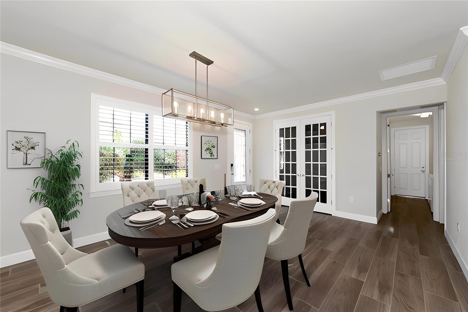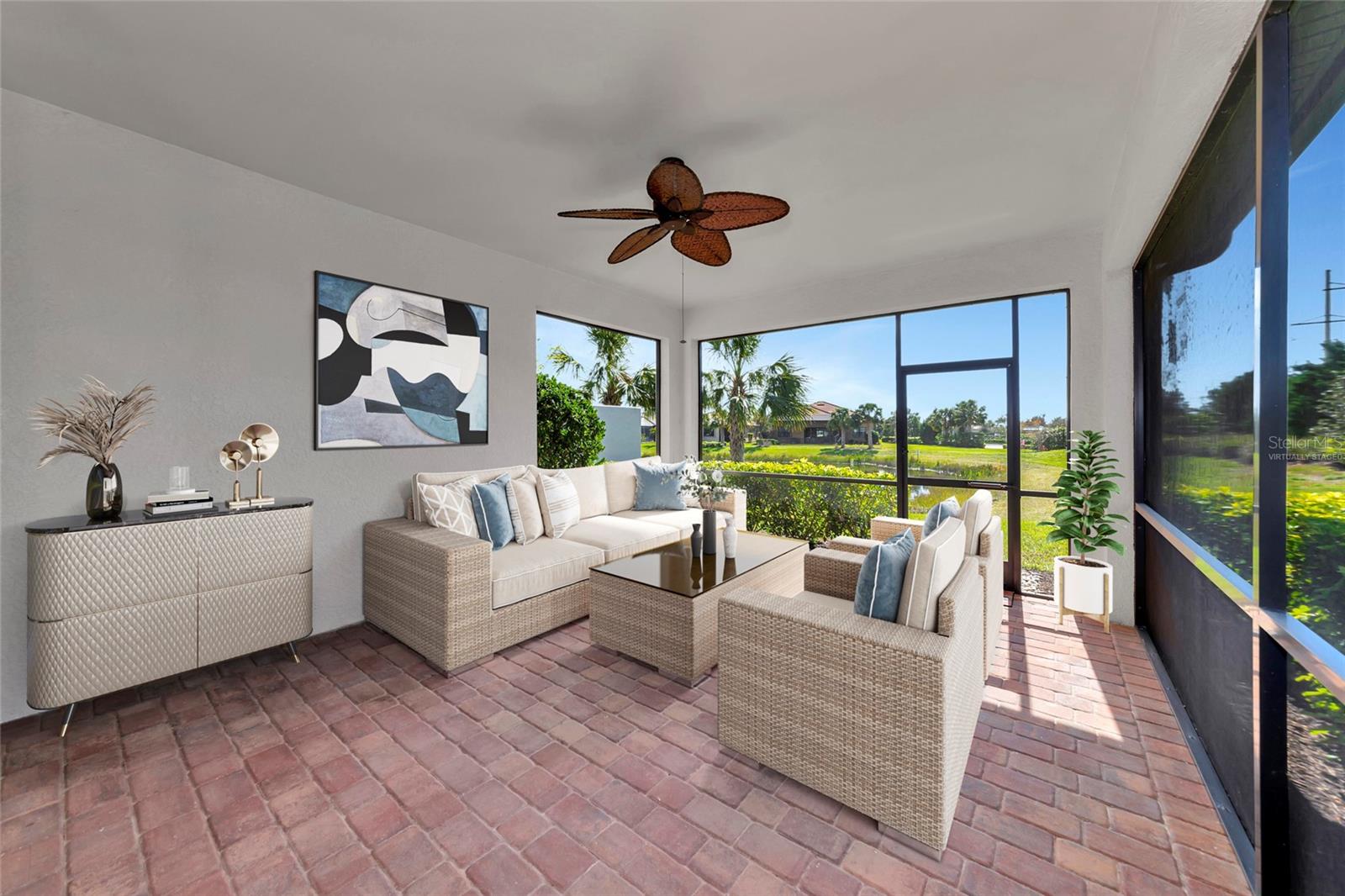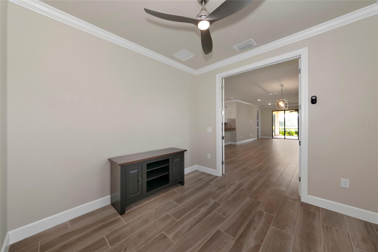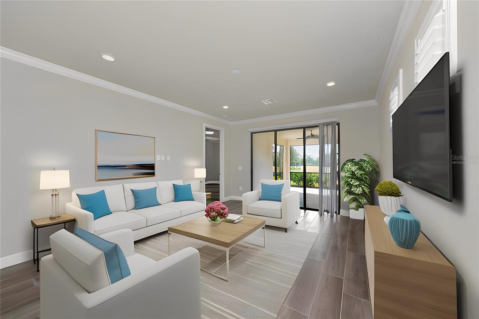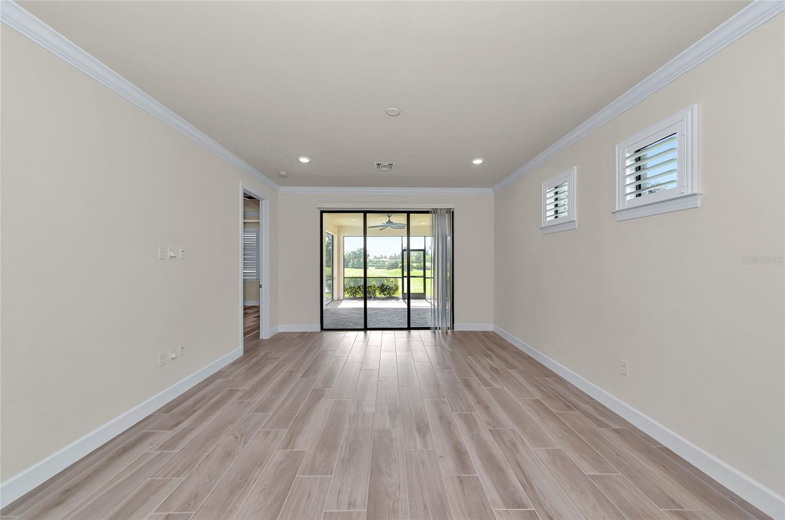 One or more photo(s) has been virtually staged. Nestled within the sought-after master-planned community of Palmer Ranch lies Hammock Preserve, close to Sarasota's best shopping, dining, and outdoor adventures. This gated community epitomizes resort living and features a clubhouse, fitness center, Barefoot Bar, resort pool, hot tub, fire pit, bocce courts, tennis courts, pickleball courts, dog park, and fishing pier. Experience the epitome of Florida living in this exceptional community. Within this vibrant setting, discover a meticulously crafted home designed for contemporary living, with its open-concept layout and expansive waterfront lanai, perfect for hosting gatherings and crafting cherished memories. Enter this exceptional residence featuring 2 bedrooms, 2 bathrooms, and a versatile bonus den/office. The living spaces seamlessly flow onto the spacious waterfront lanai, offering a tranquil setting for relaxation and entertaining. The spacious kitchen, adorned with stainless-steel appliances, a natural gas oven/stove, granite countertops, custom backsplash, breakfast bar, and ample pantry space, invites culinary delights and gatherings. Impeccable finishes, including neutral ceramic plank flooring, crown molding, plantation shutters, and an art glass entry door, infuse sophistication and charm into every corner. Positioned at the end of a tranquil cul-de-sac with an extended driveway, this coveted lot offers exceptional privacy while remaining conveniently close to Hammock Preserve's abundant amenities. Whether seeking relaxation or social engagement, Hammock Preserve offers an array of options, including a clubhouse, fitness center, Barefoot Bar, resort pool, hot tub, fire pit, bocce courts, tennis courts, pickleball courts, dog park, and fishing pier. Experience the epitome of Florida living in this exceptional community.