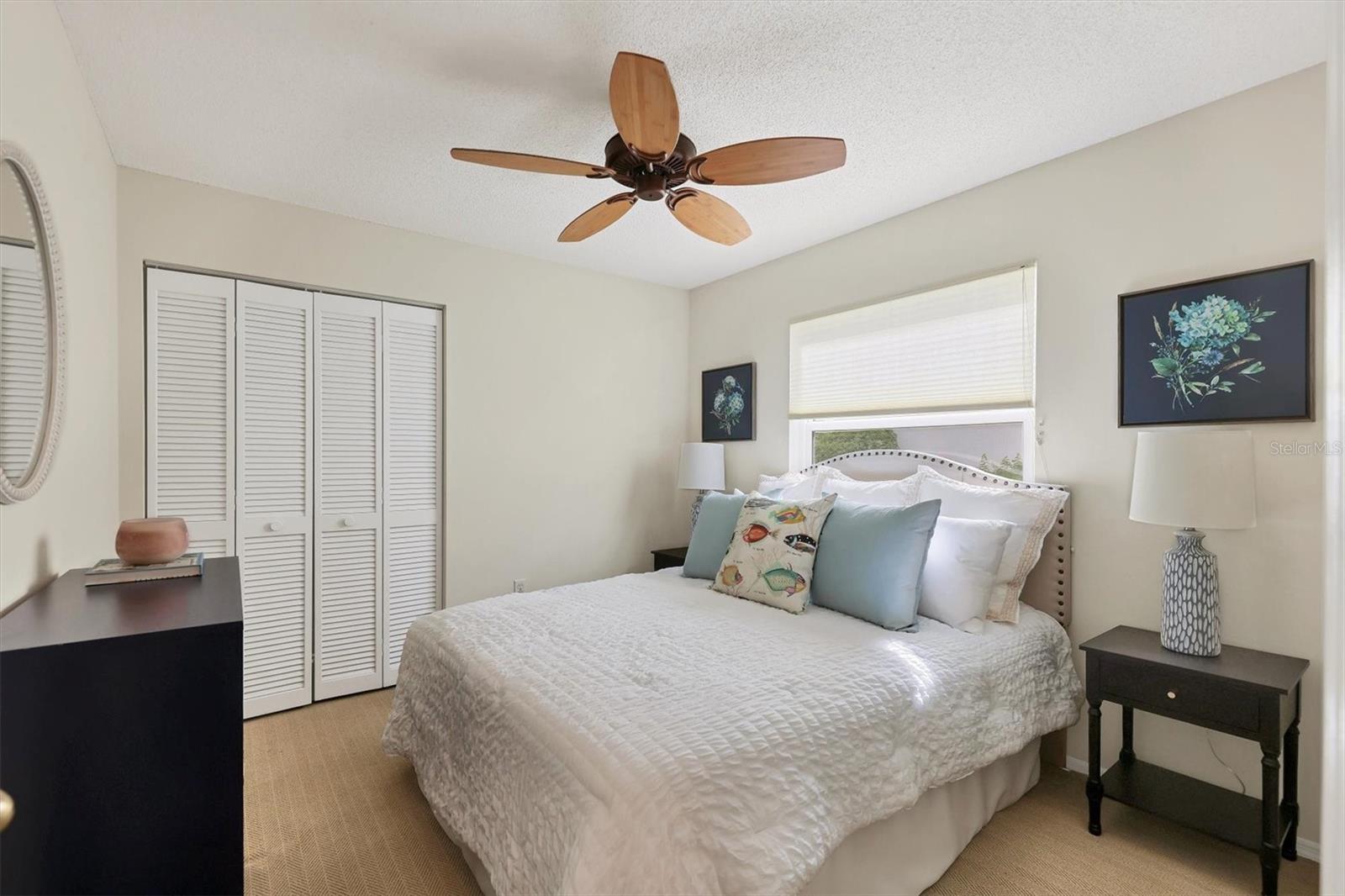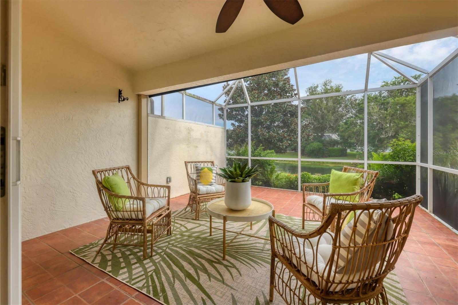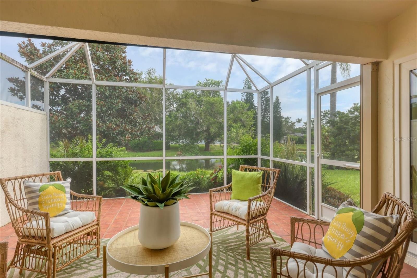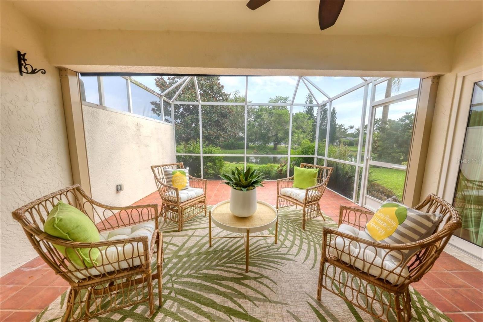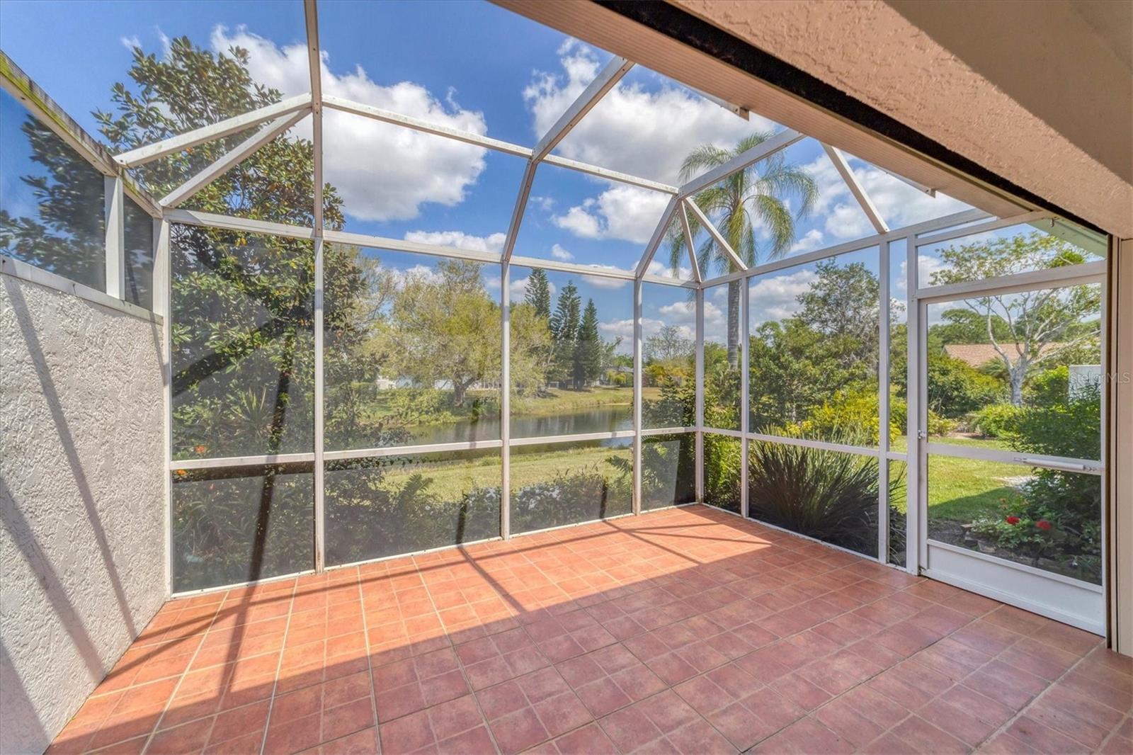 Welcome to the Beekman Place Community, a hidden gem ideally situated between the UTC shopping center and downtown Sarasota. This single-family home features 2 bedrooms, 2 bathrooms, plus a den that could easily be converted into a third bedroom, along with a 2-car garage. Upon entering, you will be greeted by a large living room with vaulted ceilings that opens to a screened patio boasting serene water views. Notable upgrades include hurricane impact windows/doors throughout the home, an electric roll-down hurricane shutter on the lanai, motorized shades for the sliding doors, a newer air conditioner (2021), and recently refinished tile floors throughout the living areas. The primary bedroom offers a walk-in closet, water views, and access to the outdoor patio. Both bathrooms have been tastefully updated with granite countertops and new shower doors. The spacious kitchen boasts stainless steel appliances, with recent replacements for the refrigerator and dishwasher. Transom windows allow for ample natural light to fill the space. The community features a gated entry, well-manicured common areas, a community pool, and tennis courts, creating a quiet and peaceful atmosphere. Bring all reasonable offers.