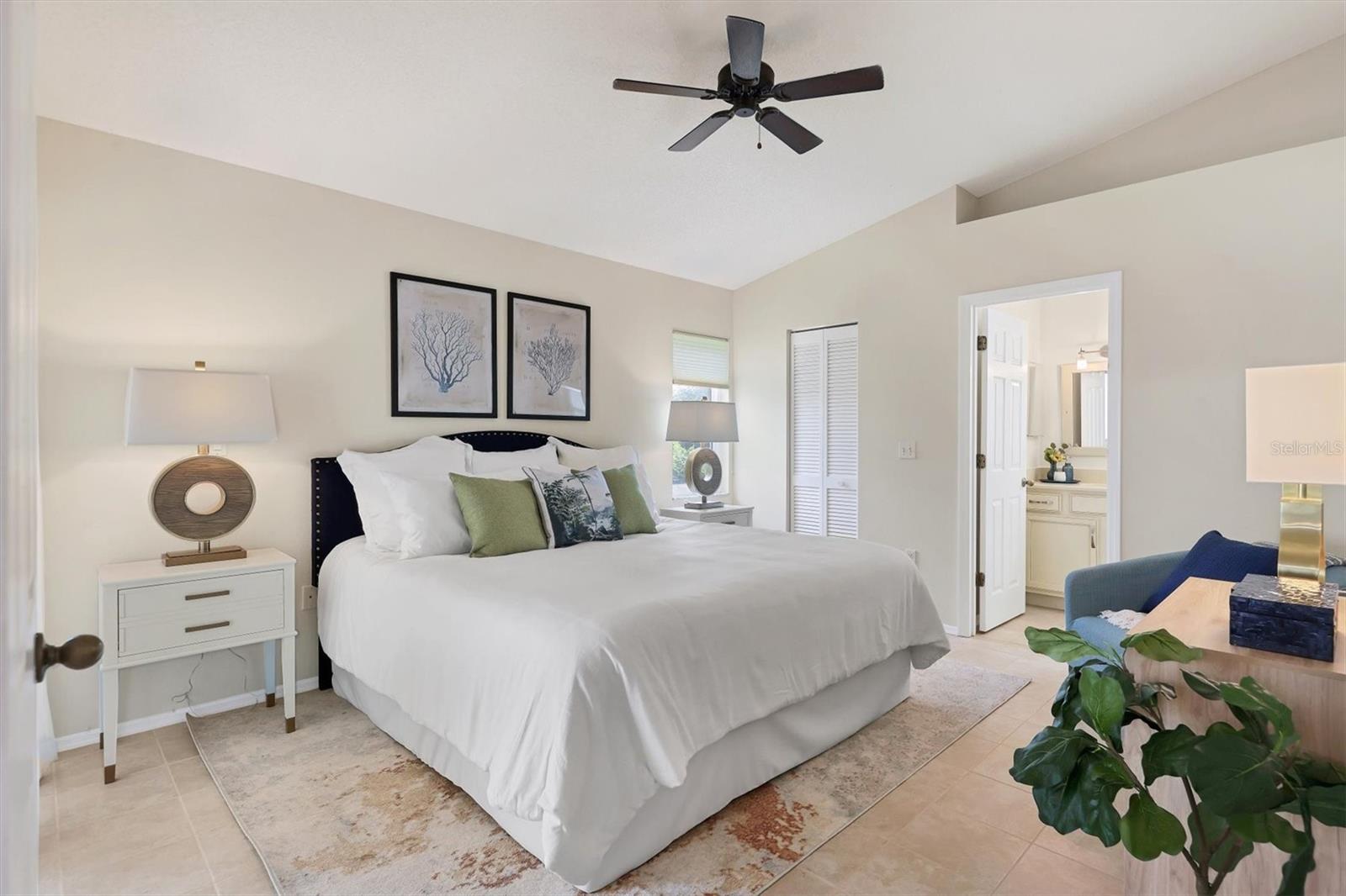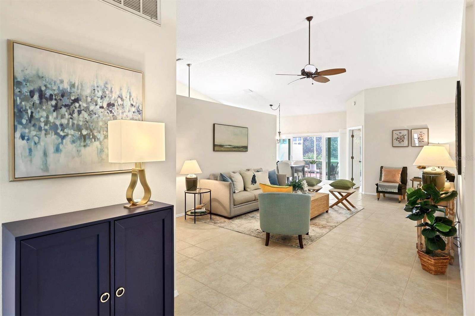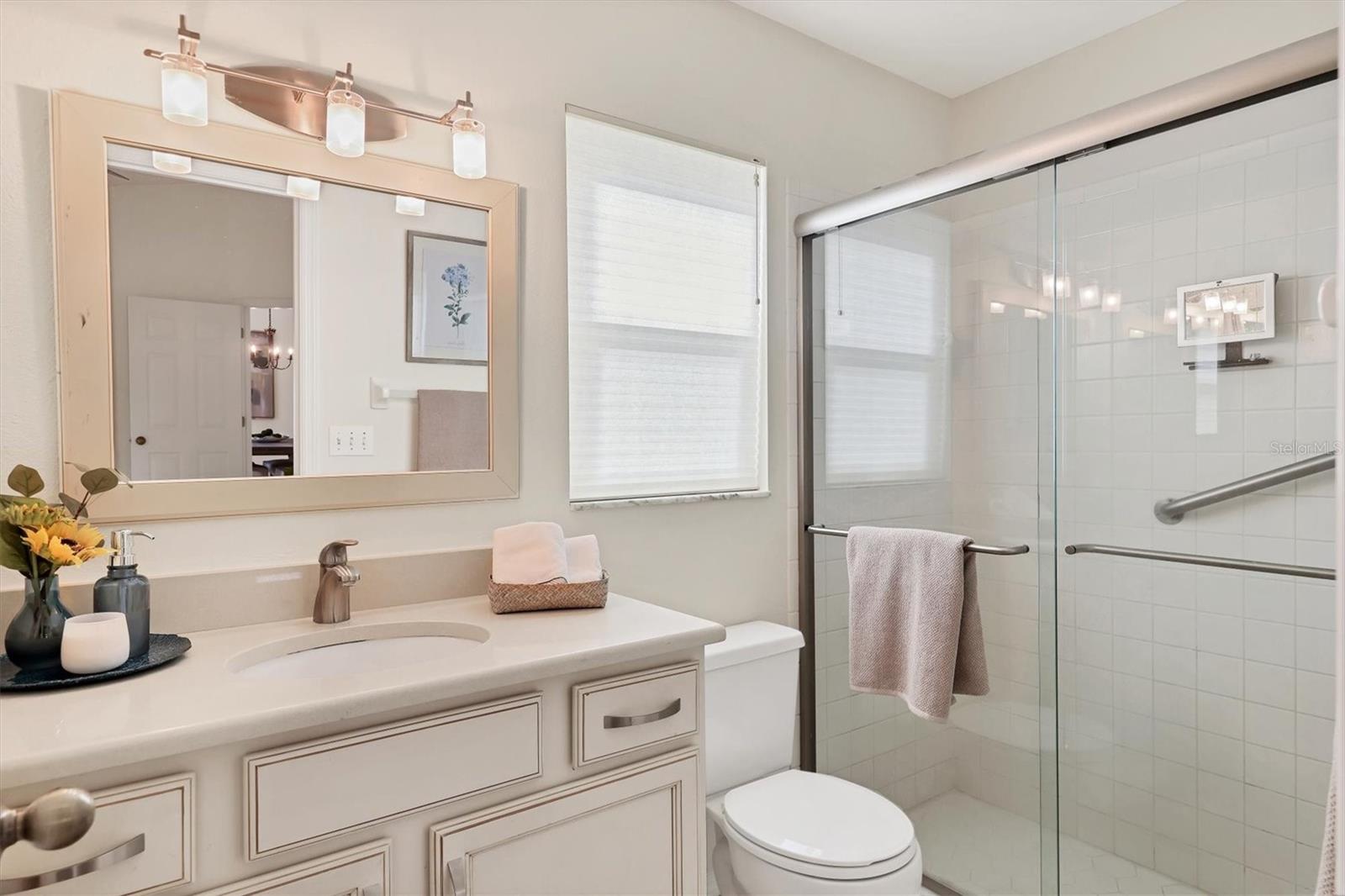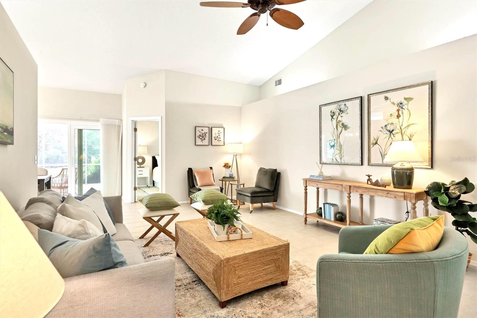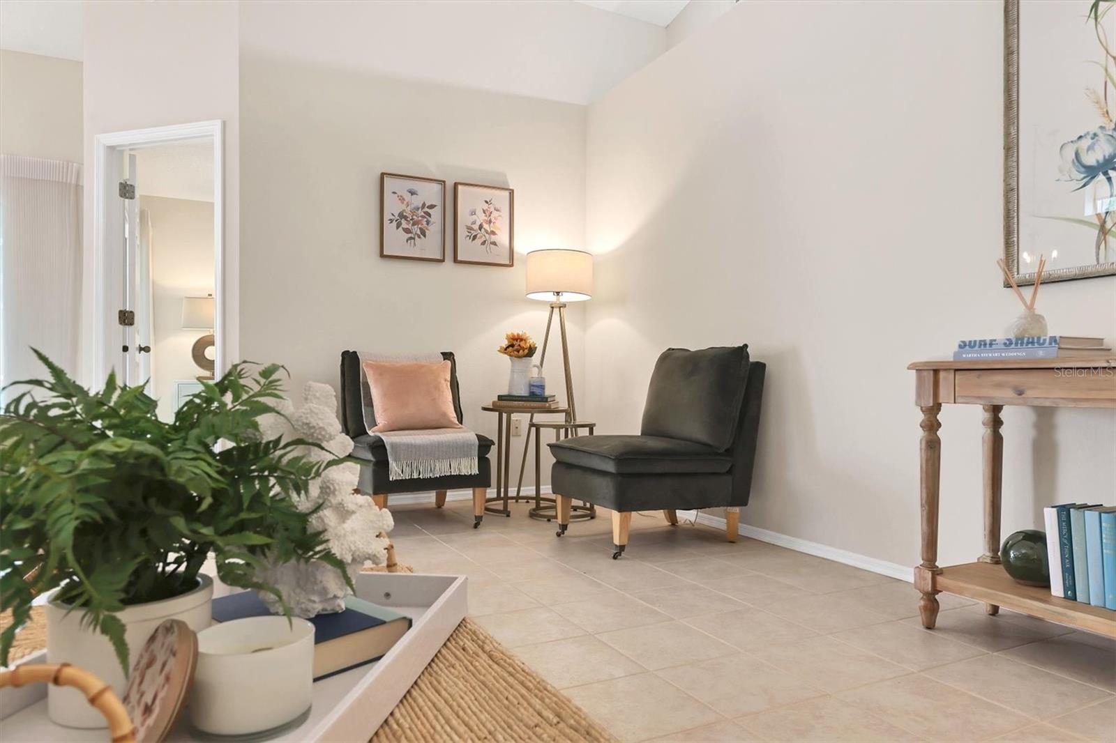 Welcome to the Beekman Place Community, a hidden gem ideally situated between the UTC shopping center and downtown Sarasota. This single-family home features 2 bedrooms, 2 bathrooms, plus a den that could easily be converted into a third bedroom, along with a 2-car garage. Upon entering, you will be greeted by a large living room with vaulted ceilings that opens to a screened patio boasting serene water views. Notable upgrades include hurricane impact windows/doors throughout the home, an electric roll-down hurricane shutter on the lanai, motorized shades for the sliding doors, a newer air conditioner (2021), and recently refinished tile floors throughout the living areas. The primary bedroom offers a walk-in closet, water views, and access to the outdoor patio. Both bathrooms have been tastefully updated with granite countertops and new shower doors. The spacious kitchen boasts stainless steel appliances, with recent replacements for the refrigerator and dishwasher. Transom windows allow for ample natural light to fill the space. The community features a gated entry, well-manicured common areas, a community pool, and tennis courts, creating a quiet and peaceful atmosphere. Bring all reasonable offers.