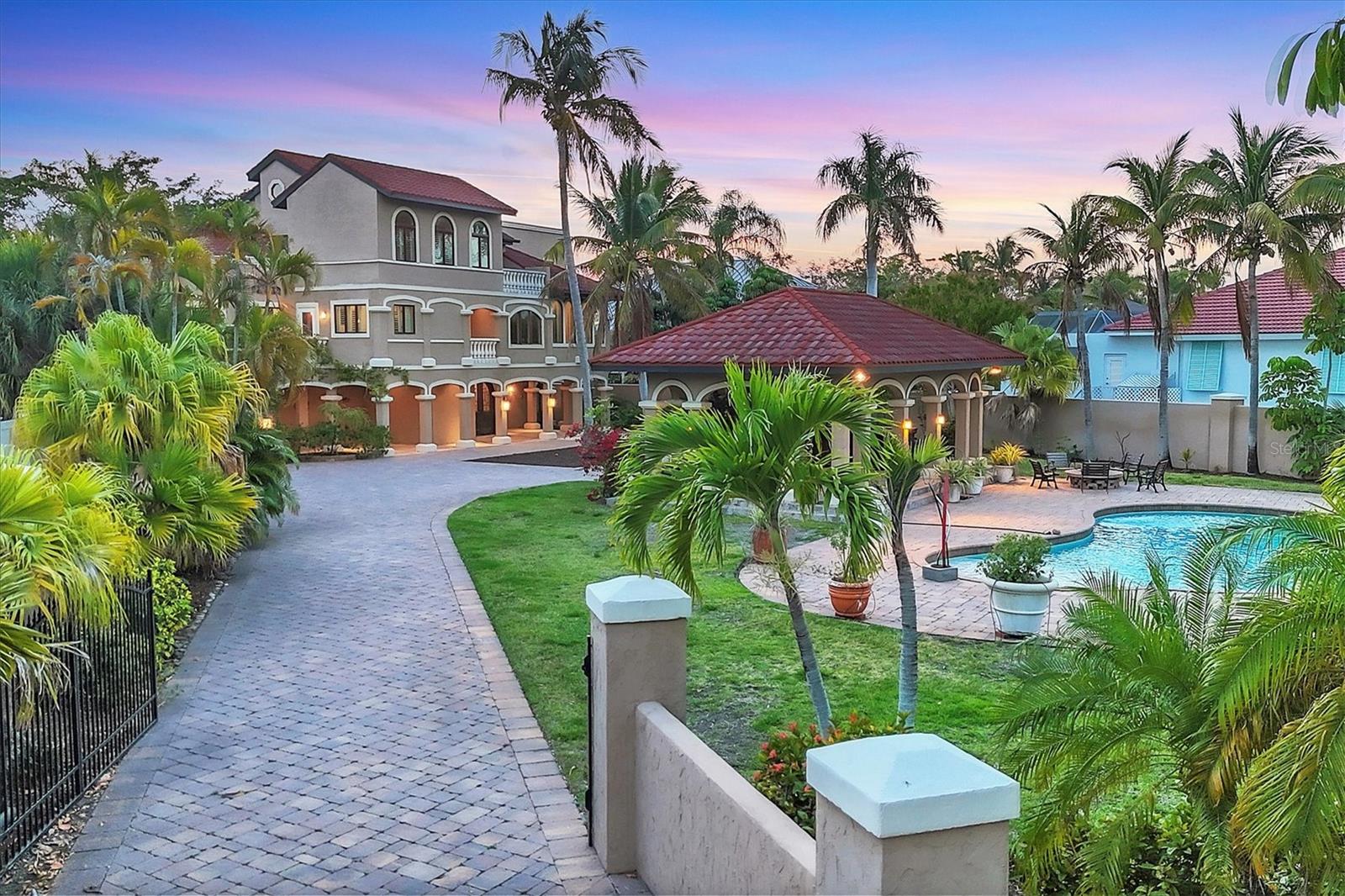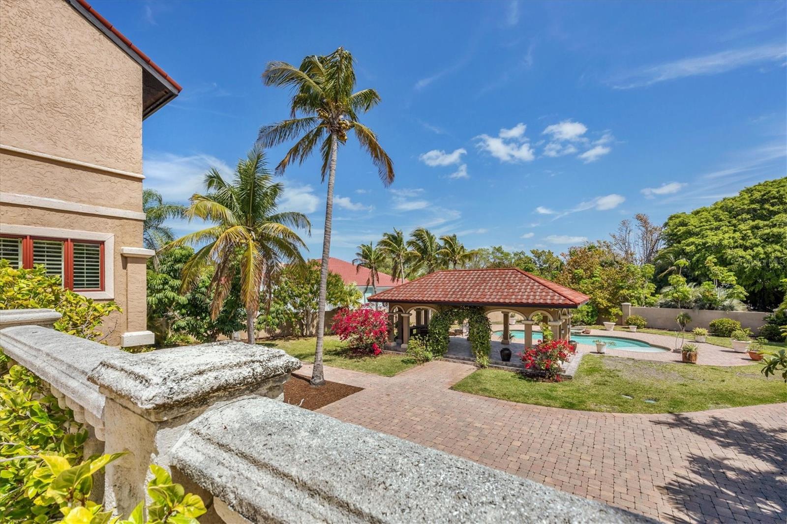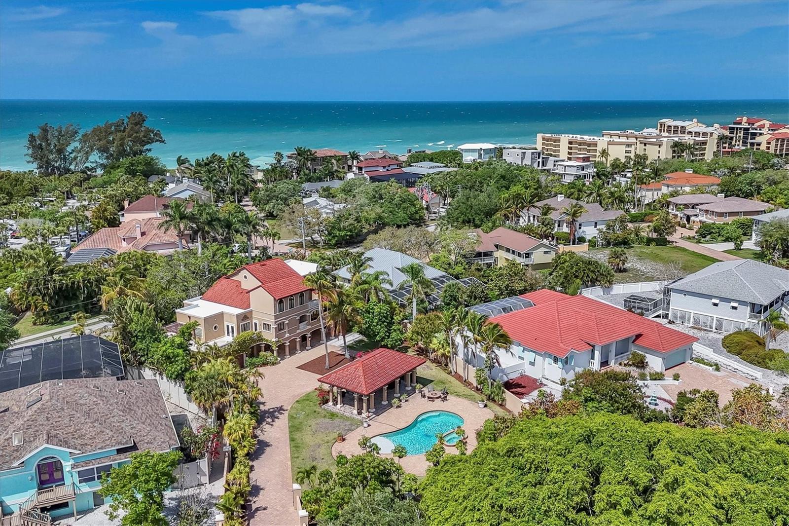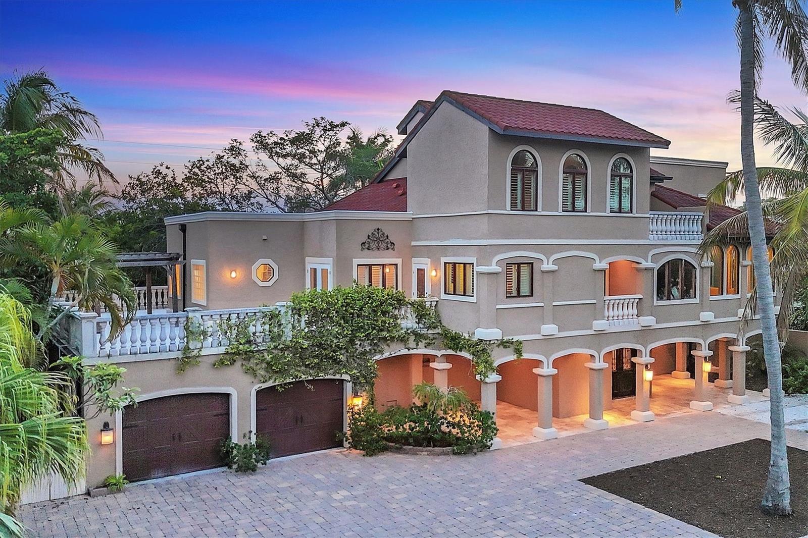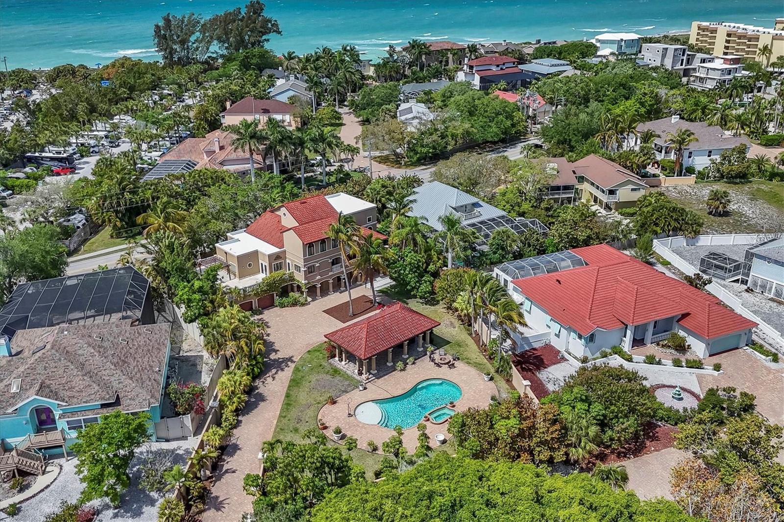 One or more photo(s) has been virtually staged. Offering unparalleled privacy and tranquility, this over ½ acre wall-enclosed Siesta Key estate home embodies exclusivity and sophistication. On the market for the first time, this custom-built family home welcomes you through double arched wooden doors to find large open spaces that seamlessly blend timeless charm with modern amenities. On the main living level, you will find a spacious gourmet kitchen that is fully equipped with top-of-the-line appliances, a huge central island and custom-built wood cabinetry. An office/workspace nook with built-in desk and shelving is adjacent to the kitchen, along with a dry bar and laundry room with double washers and dryers, counter space, and extra storage. Just off the kitchen is a formal dining room ideal for hosting dinner parties that oversees a living room boasting with soaring ceilings, wood beams and grand oversized arched windows – creating an ideal space for large gatherings. On the same level you will find a charming arched hallway faced in Tuskegee brick imported from Alabama that leads to an expansive outside terrace with decorative stone railing and stunning views of the property. You will also find two en-suite bedrooms, walk-in closets with direct access to the outside terrace and a powder bath. The primary suite on the third level is a true retreat that exudes European charm in its large sitting room area with French doors leading to a private balcony, separate bedroom space with large walk-in closet, and an en-suite bath with oversized walk-in shower and additional walk-in closet. A small staircase leads to an adorable flex room with built-in storage perfect for a hobby room, quiet study or amazing closet. The ground floor also offers an abundance of space and opportunities (fitness room, game room, craft room, etc.) and includes a separate entrance. Step outside to find a resort-style set-up with a large cabana and pool surrounded by palm trees and lush landscaping. The outdoor kitchen and gas firepit add to the appeal and make this space great for entertaining and fun adventures around the pool. Beyond the walls you will have access to your very own deeded beach, along with a neighboring premier, full-service, bay front marina.
