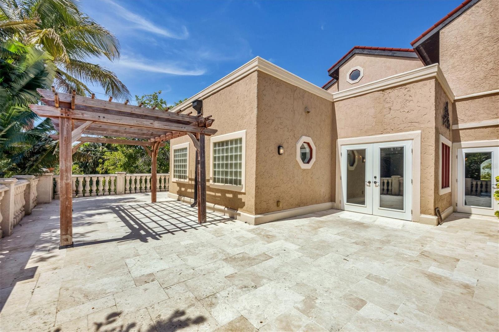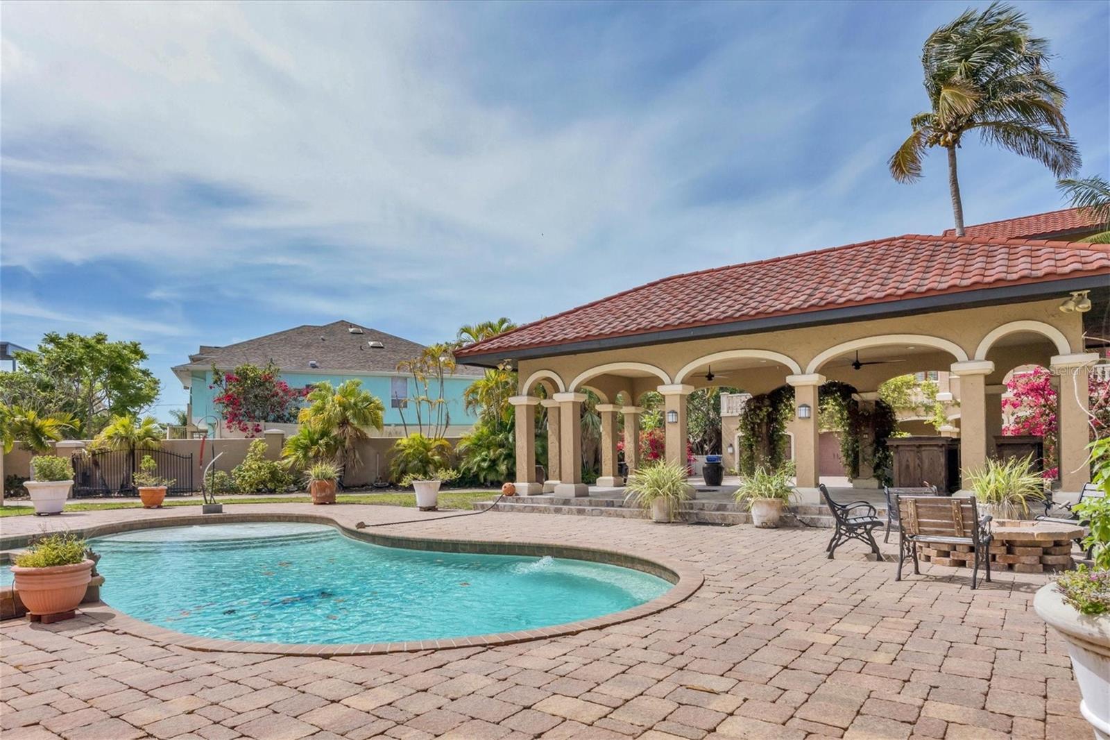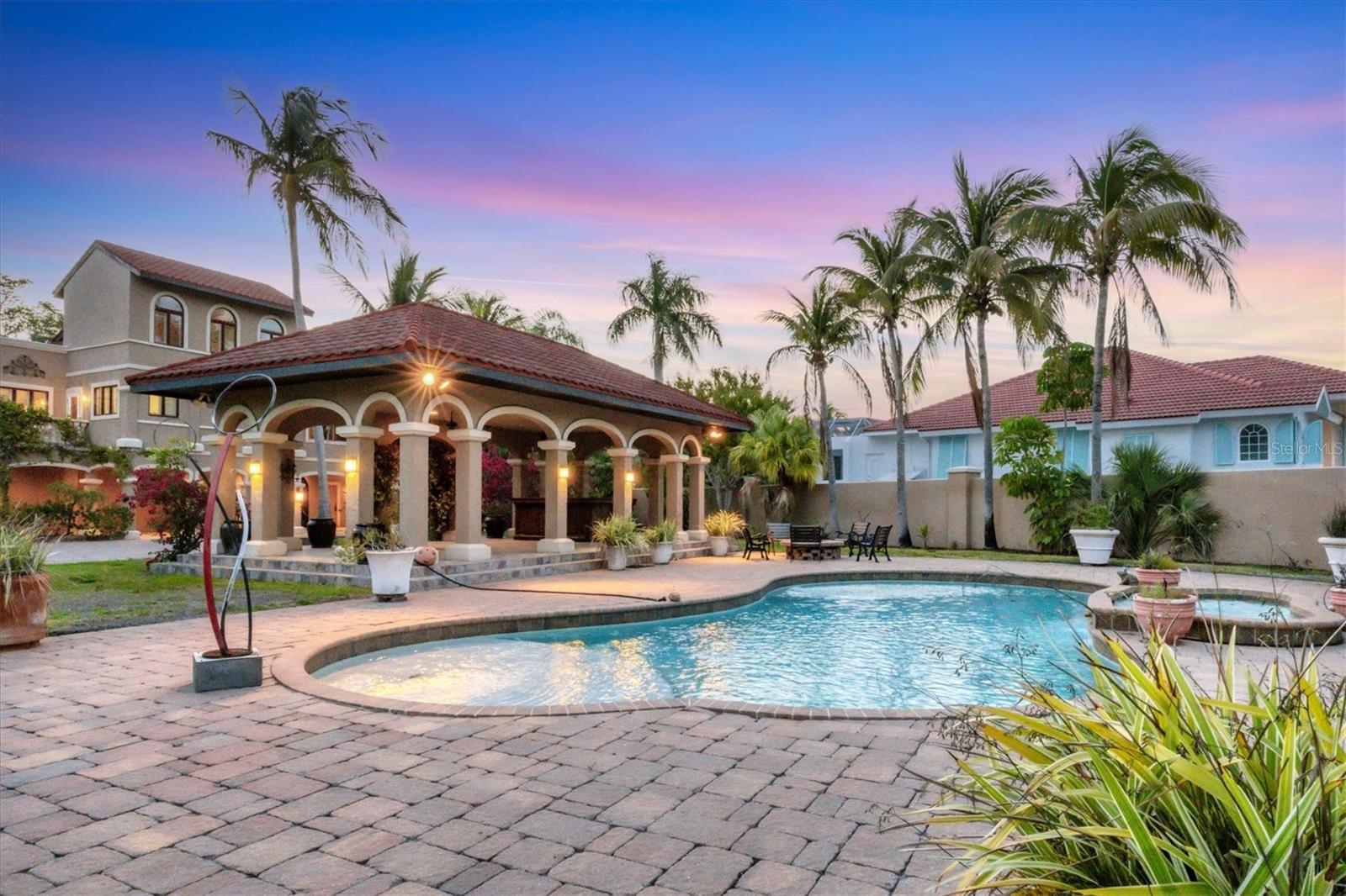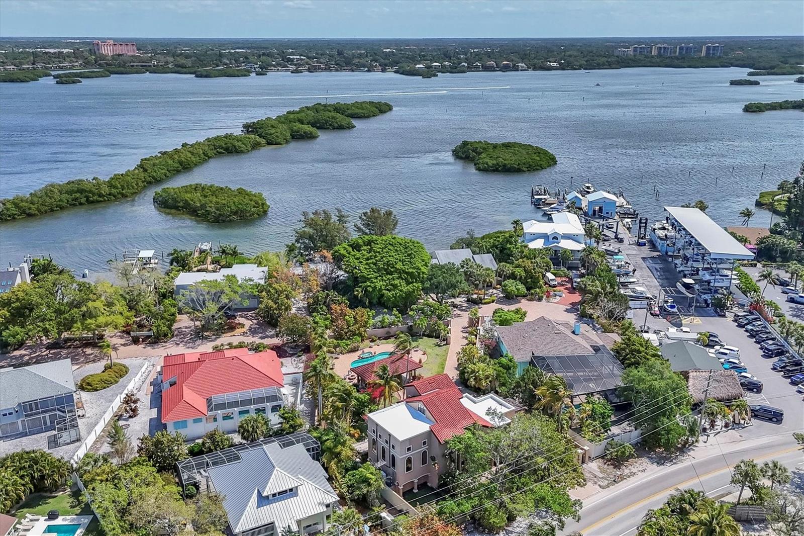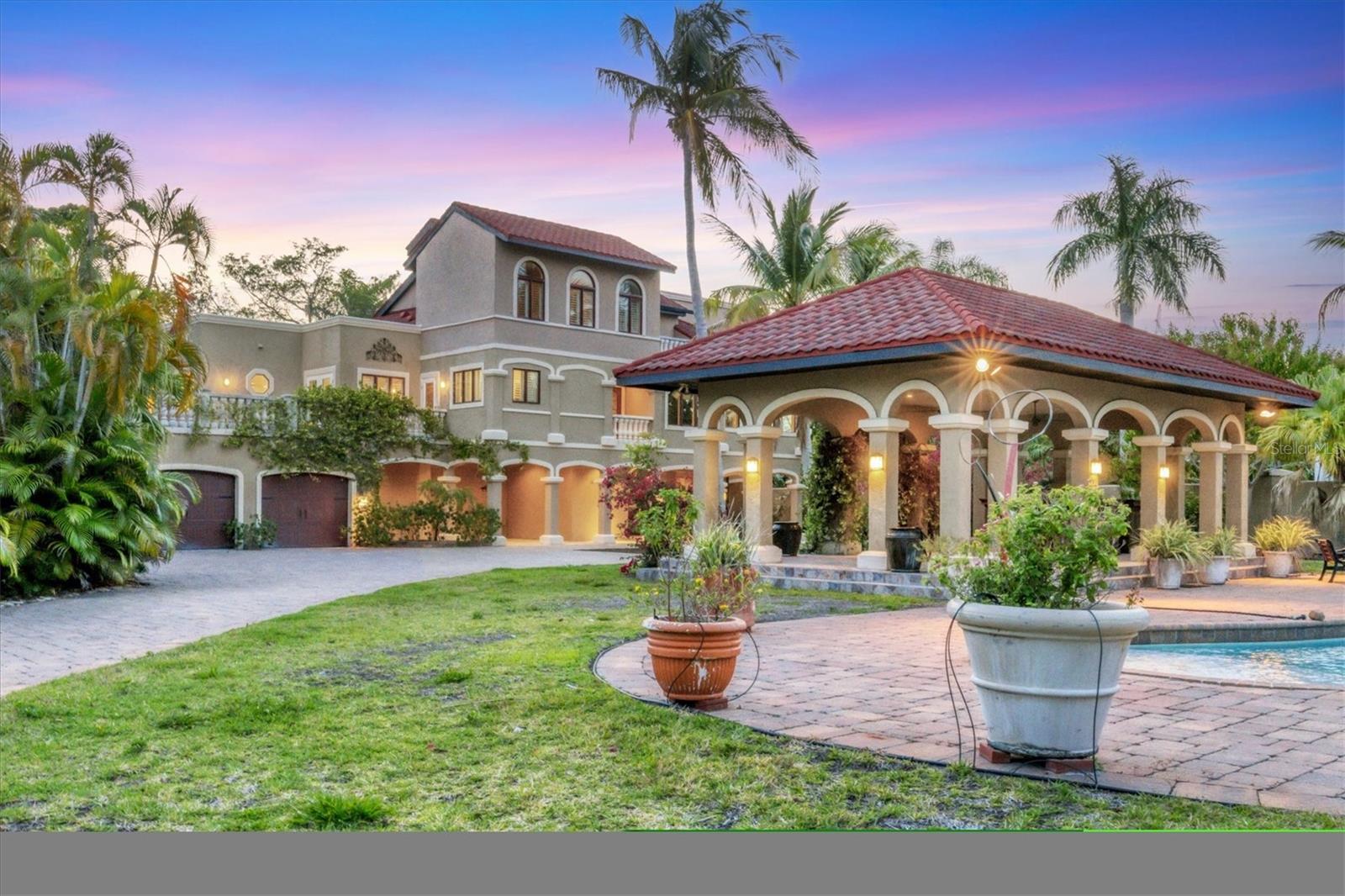 One or more photo(s) has been virtually staged. Offering unparalleled privacy and tranquility, this over ½ acre wall-enclosed Siesta Key estate home embodies exclusivity and sophistication. On the market for the first time, this custom-built family home welcomes you through double arched wooden doors to find large open spaces that seamlessly blend timeless charm with modern amenities. On the main living level, you will find a spacious gourmet kitchen that is fully equipped with top-of-the-line appliances, a huge central island and custom-built wood cabinetry. An office/workspace nook with built-in desk and shelving is adjacent to the kitchen, along with a dry bar and laundry room with double washers and dryers, counter space, and extra storage. Just off the kitchen is a formal dining room ideal for hosting dinner parties that oversees a living room boasting with soaring ceilings, wood beams and grand oversized arched windows – creating an ideal space for large gatherings. On the same level you will find a charming arched hallway faced in Tuskegee brick imported from Alabama that leads to an expansive outside terrace with decorative stone railing and stunning views of the property. You will also find two en-suite bedrooms, walk-in closets with direct access to the outside terrace and a powder bath. The primary suite on the third level is a true retreat that exudes European charm in its large sitting room area with French doors leading to a private balcony, separate bedroom space with large walk-in closet, and an en-suite bath with oversized walk-in shower and additional walk-in closet. A small staircase leads to an adorable flex room with built-in storage perfect for a hobby room, quiet study or amazing closet. The ground floor also offers an abundance of space and opportunities (fitness room, game room, craft room, etc.) and includes a separate entrance. Step outside to find a resort-style set-up with a large cabana and pool surrounded by palm trees and lush landscaping. The outdoor kitchen and gas firepit add to the appeal and make this space great for entertaining and fun adventures around the pool. Beyond the walls you will have access to your very own deeded beach, along with a neighboring premier, full-service, bay front marina.
