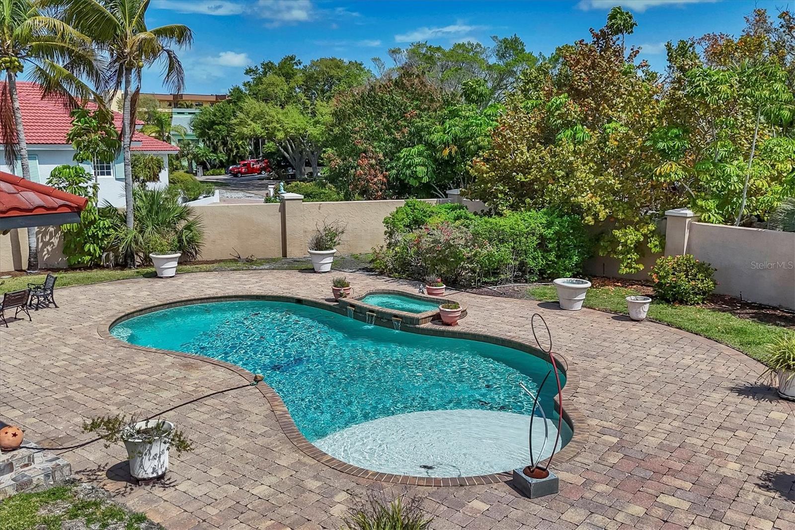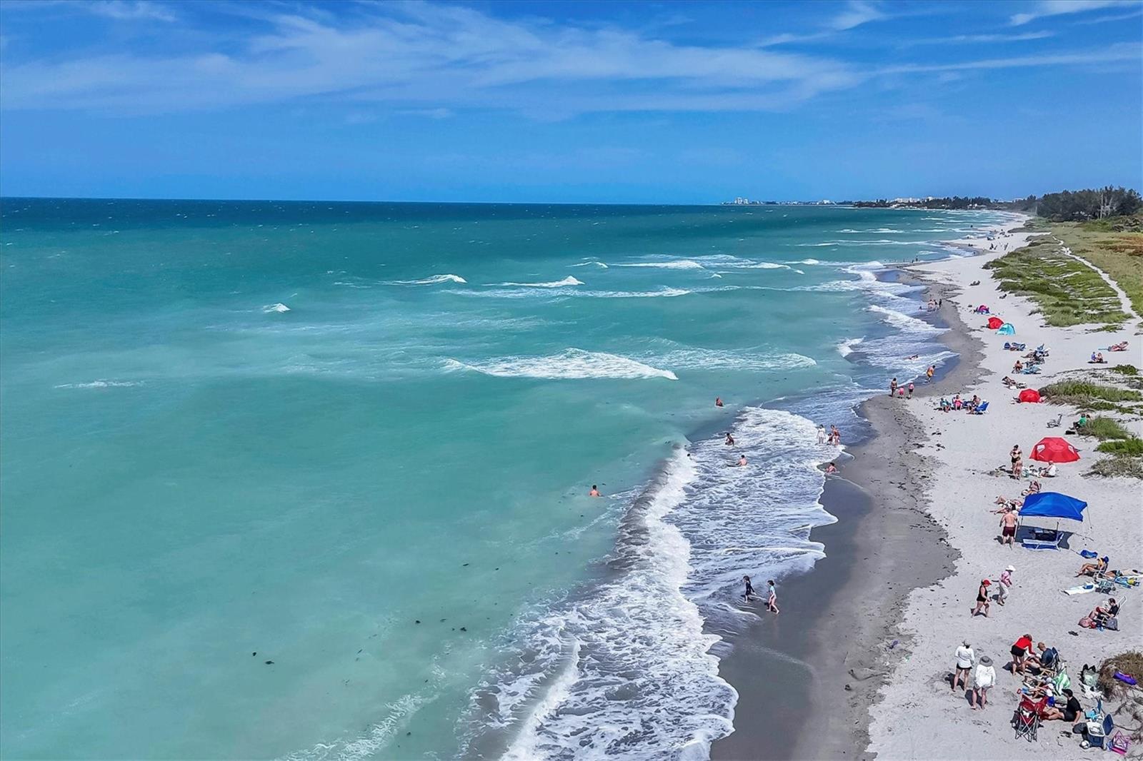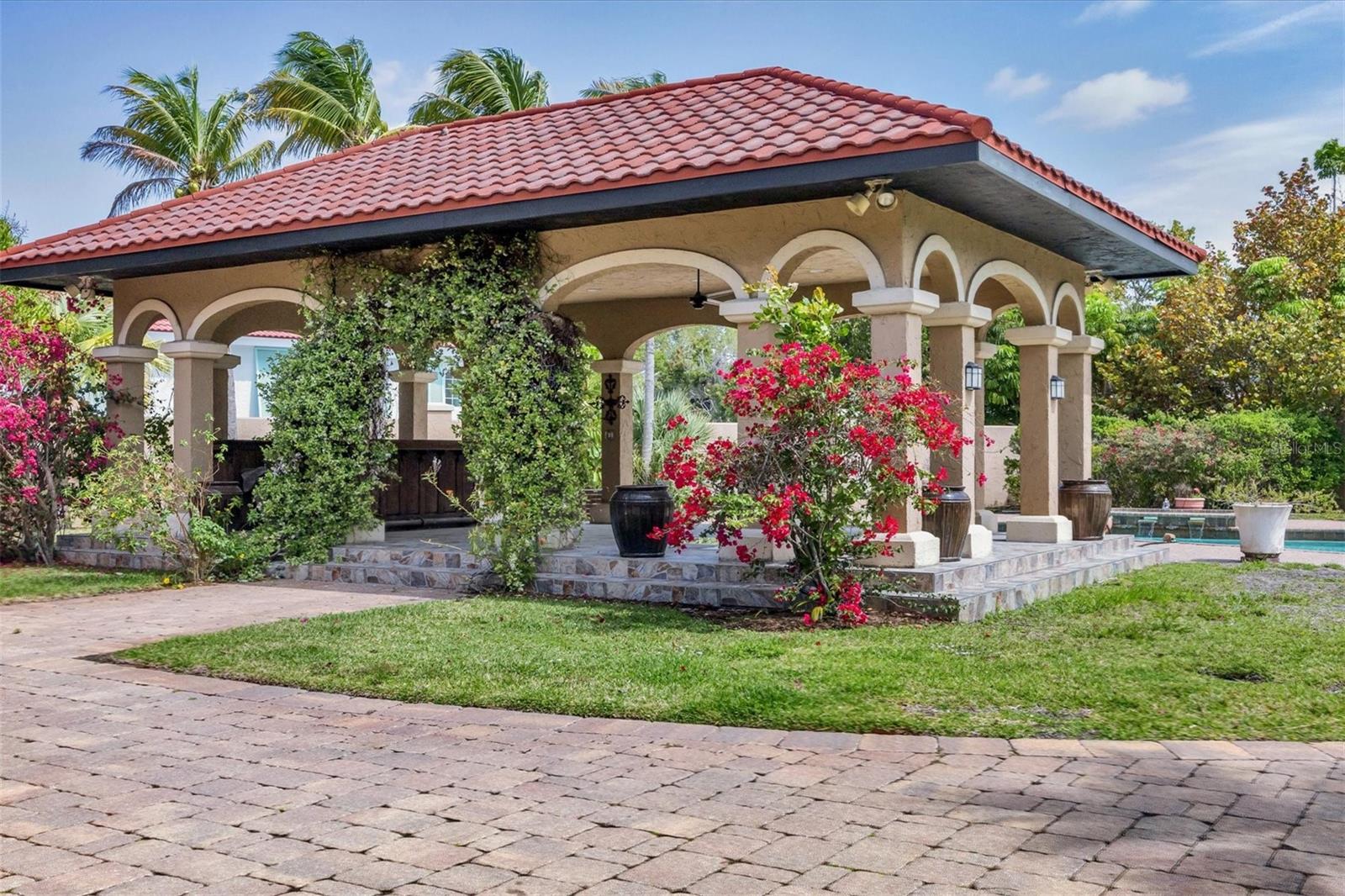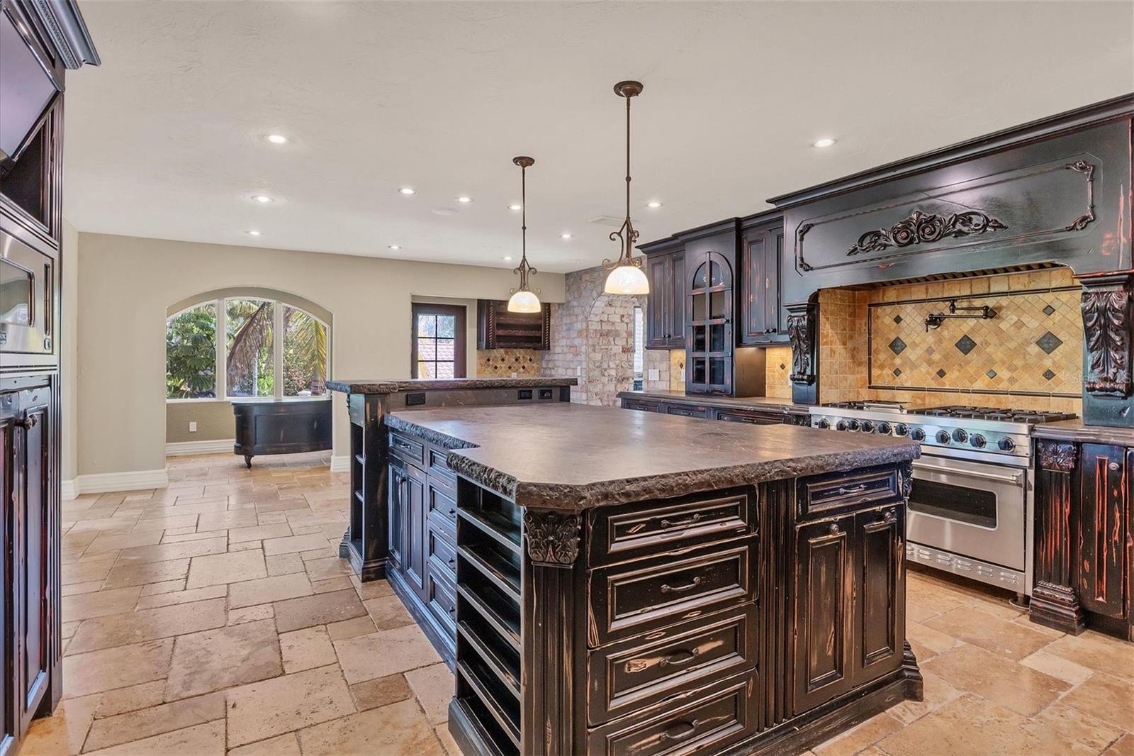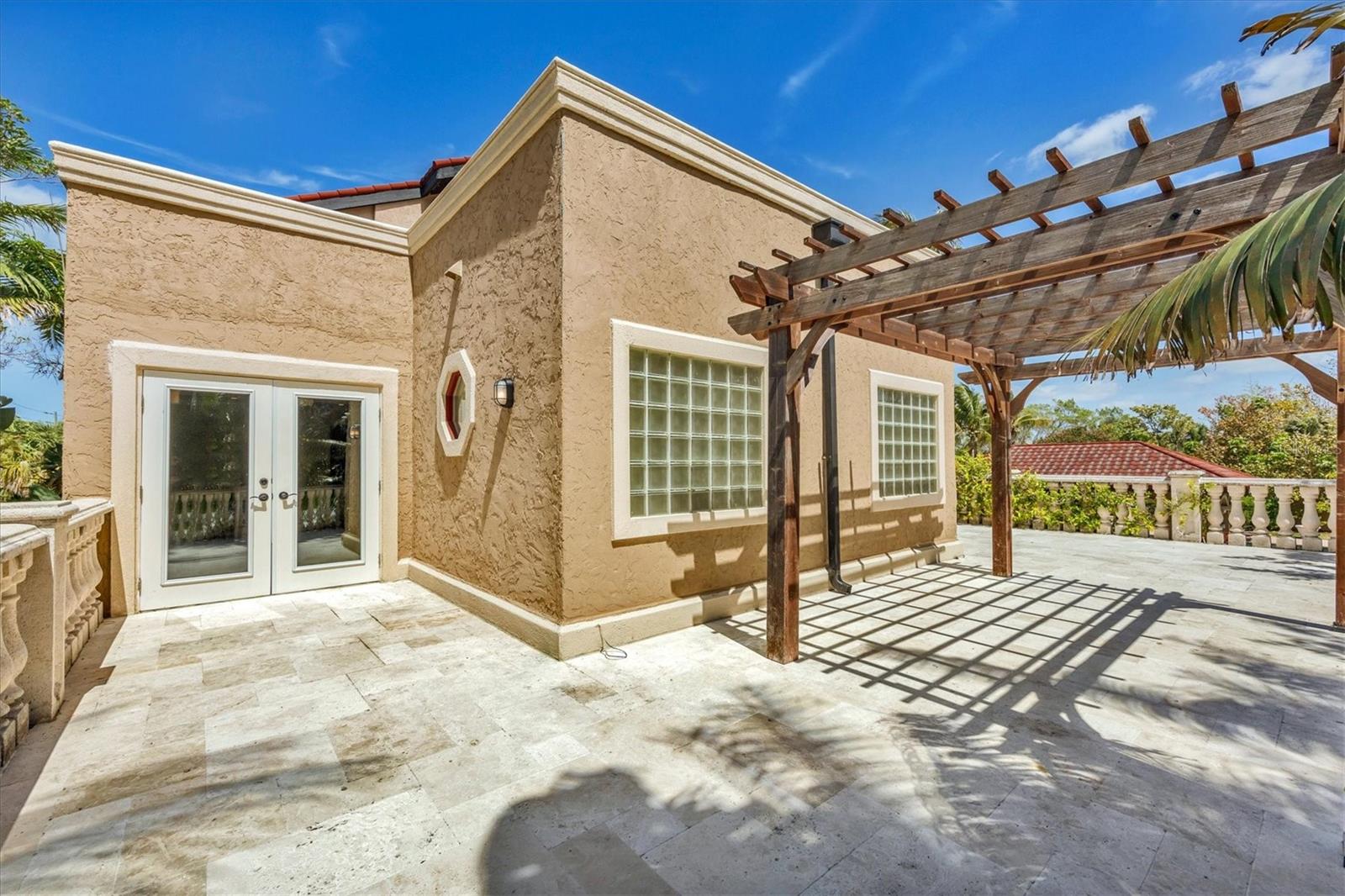One or more photo(s) has been virtually staged. Offering unparalleled privacy and tranquility, this over ½ acre wall-enclosed Siesta Key estate home embodies exclusivity and sophistication. On the market for the first time, this custom-built family home welcomes you through double arched wooden doors to find large open spaces that seamlessly blend timeless charm with modern amenities. On the main living level, you will find a spacious gourmet kitchen that is fully equipped with top-of-the-line appliances, a huge central island and custom-built wood cabinetry. An office/workspace nook with built-in desk and shelving is adjacent to the kitchen, along with a dry bar and laundry room with double washers and dryers, counter space, and extra storage. Just off the kitchen is a formal dining room ideal for hosting dinner parties that oversees a living room boasting with soaring ceilings, wood beams and grand oversized arched windows – creating an ideal space for large gatherings. On the same level you will find a charming arched hallway faced in Tuskegee brick imported from Alabama that leads to an expansive outside terrace with decorative stone railing and stunning views of the property. You will also find two en-suite bedrooms, walk-in closets with direct access to the outside terrace and a powder bath. The primary suite on the third level is a true retreat that exudes European charm in its large sitting room area with French doors leading to a private balcony, separate bedroom space with large walk-in closet, and an en-suite bath with oversized walk-in shower and additional walk-in closet. A small staircase leads to an adorable flex room with built-in storage perfect for a hobby room, quiet study or amazing closet. The ground floor also offers an abundance of space and opportunities (fitness room, game room, craft room, etc.) and includes a separate entrance. Step outside to find a resort-style set-up with a large cabana and pool surrounded by palm trees and lush landscaping. The outdoor kitchen and gas firepit add to the appeal and make this space great for entertaining and fun adventures around the pool. Beyond the walls you will have access to your very own deeded beach, along with a neighboring premier, full-service, bay front marina.