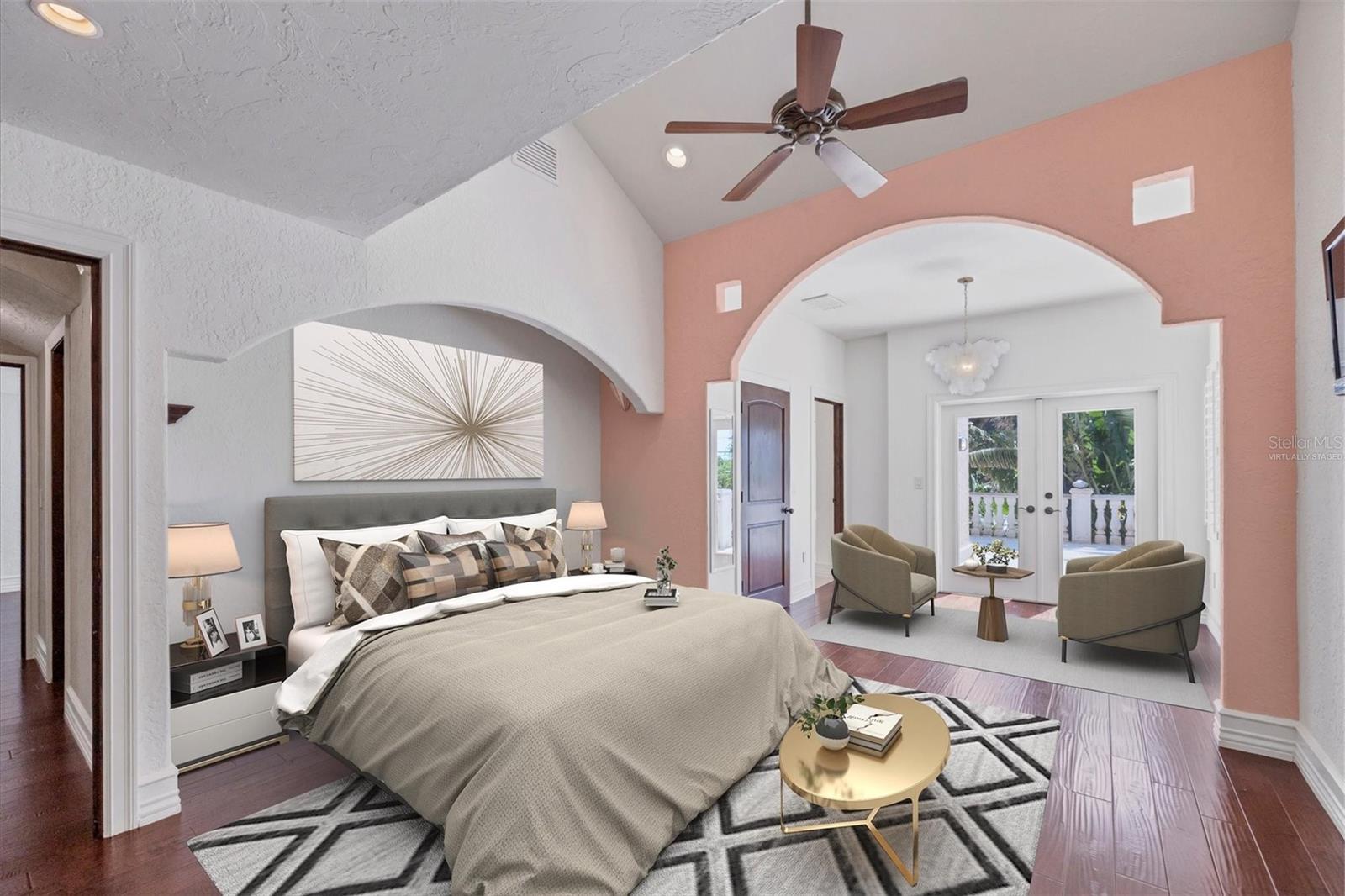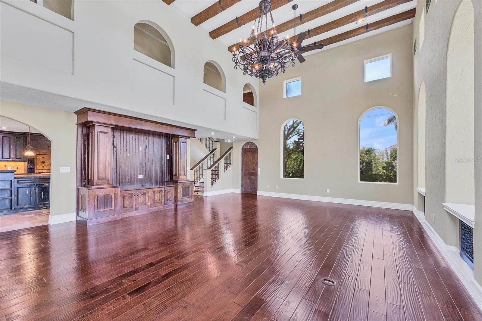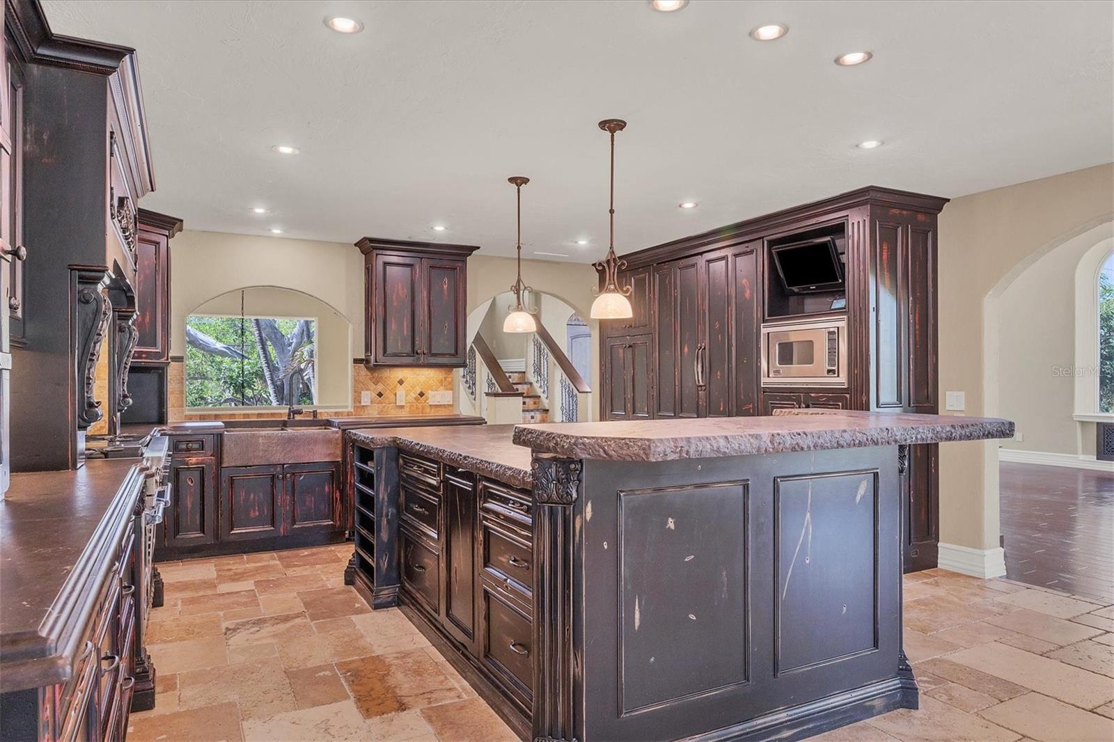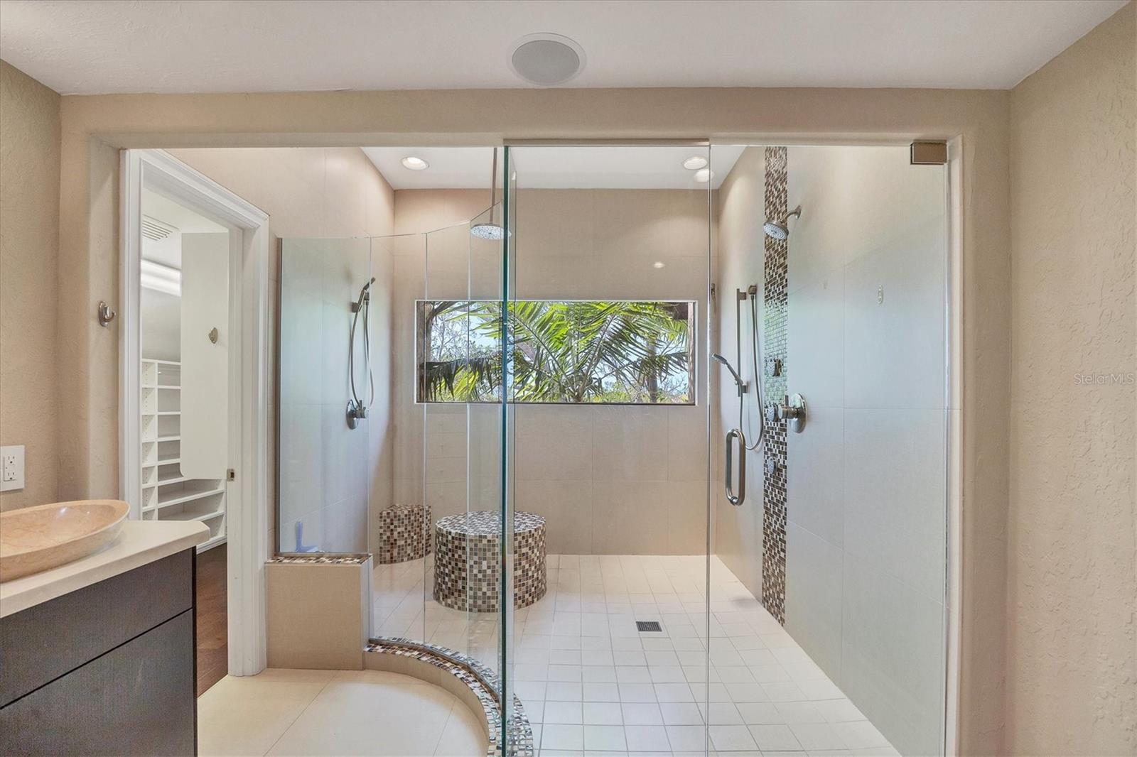 One or more photo(s) has been virtually staged. Offering unparalleled privacy and tranquility, this over ½ acre wall-enclosed Siesta Key estate home embodies exclusivity and sophistication. On the market for the first time, this custom-built family home welcomes you through double arched wooden doors to find large open spaces that seamlessly blend timeless charm with modern amenities. On the main living level, you will find a spacious gourmet kitchen that is fully equipped with top-of-the-line appliances, a huge central island and custom-built wood cabinetry. An office/workspace nook with built-in desk and shelving is adjacent to the kitchen, along with a dry bar and laundry room with double washers and dryers, counter space, and extra storage. Just off the kitchen is a formal dining room ideal for hosting dinner parties that oversees a living room boasting with soaring ceilings, wood beams and grand oversized arched windows – creating an ideal space for large gatherings. On the same level you will find a charming arched hallway faced in Tuskegee brick imported from Alabama that leads to an expansive outside terrace with decorative stone railing and stunning views of the property. You will also find two en-suite bedrooms, walk-in closets with direct access to the outside terrace and a powder bath. The primary suite on the third level is a true retreat that exudes European charm in its large sitting room area with French doors leading to a private balcony, separate bedroom space with large walk-in closet, and an en-suite bath with oversized walk-in shower and additional walk-in closet. A small staircase leads to an adorable flex room with built-in storage perfect for a hobby room, quiet study or amazing closet. The ground floor also offers an abundance of space and opportunities (fitness room, game room, craft room, etc.) and includes a separate entrance. Step outside to find a resort-style set-up with a large cabana and pool surrounded by palm trees and lush landscaping. The outdoor kitchen and gas firepit add to the appeal and make this space great for entertaining and fun adventures around the pool. Beyond the walls you will have access to your very own deeded beach, along with a neighboring premier, full-service, bay front marina.