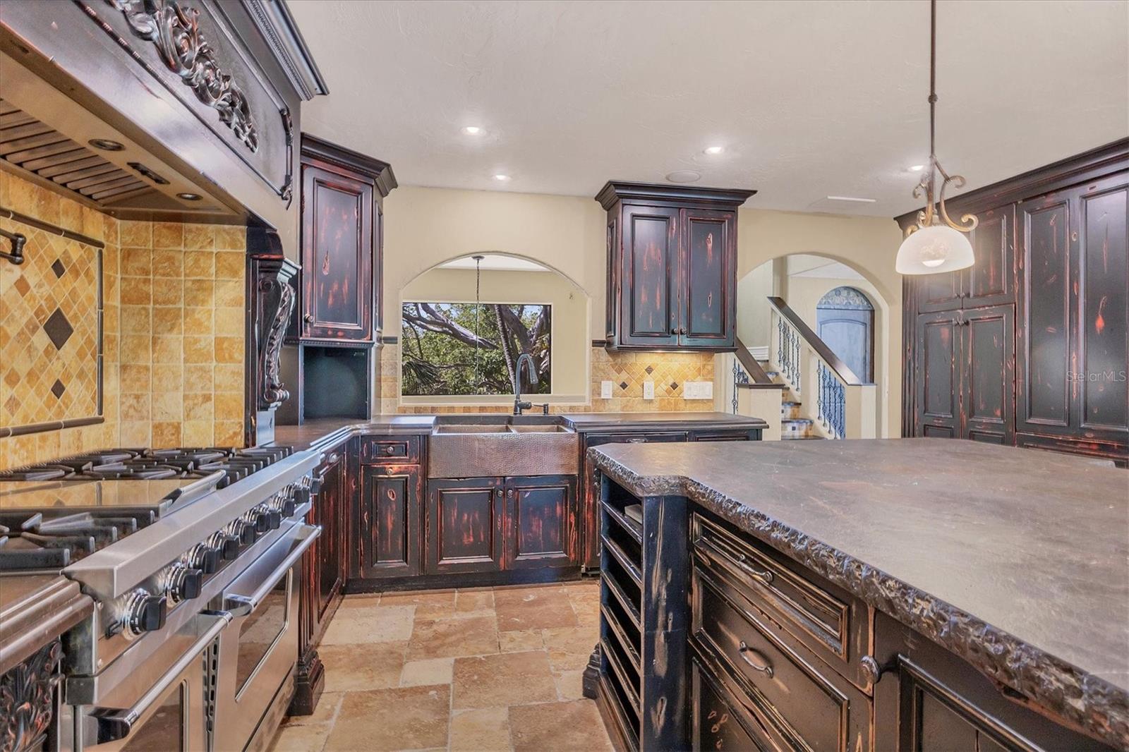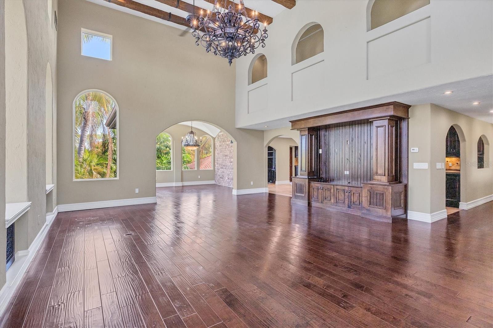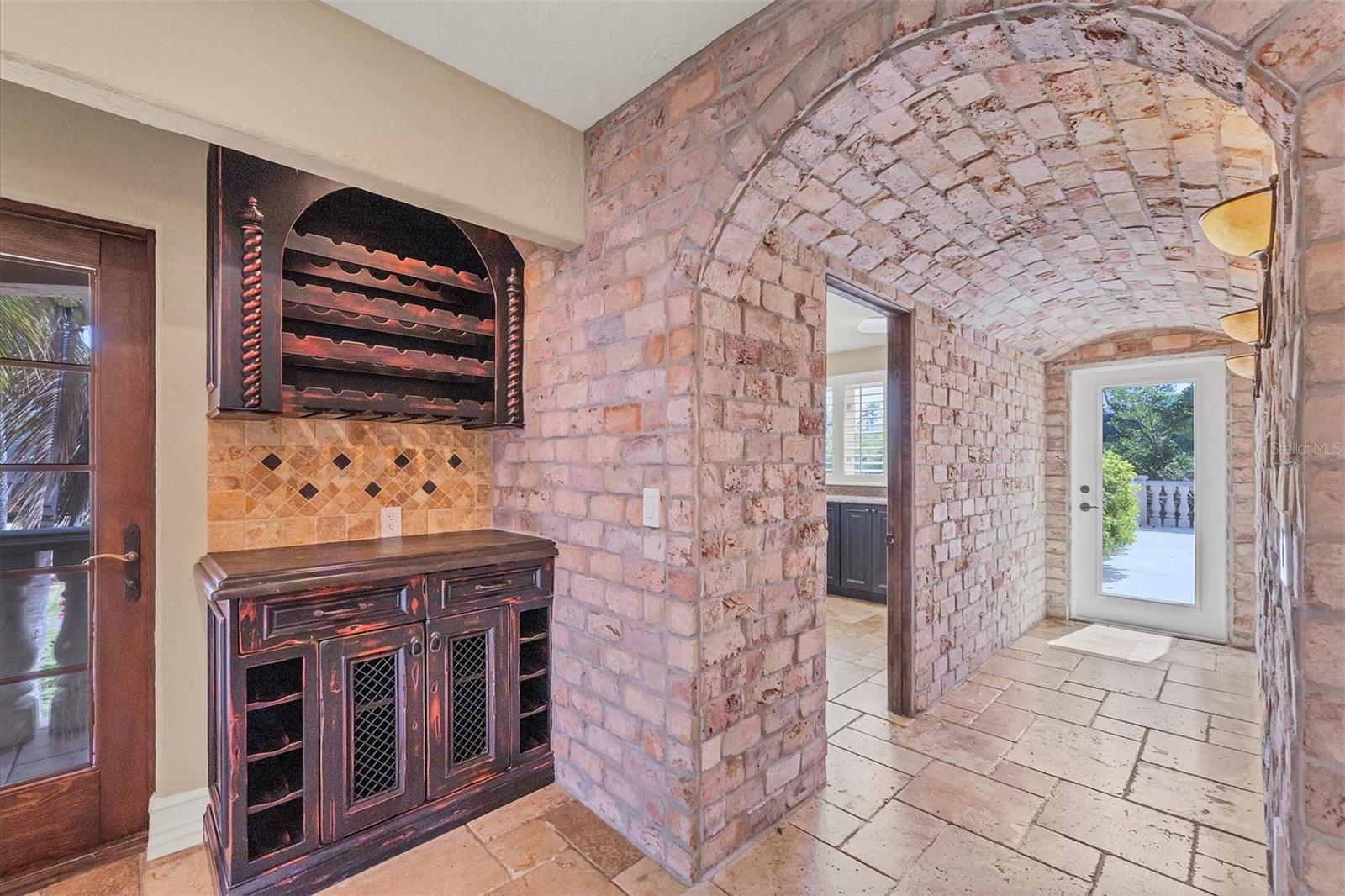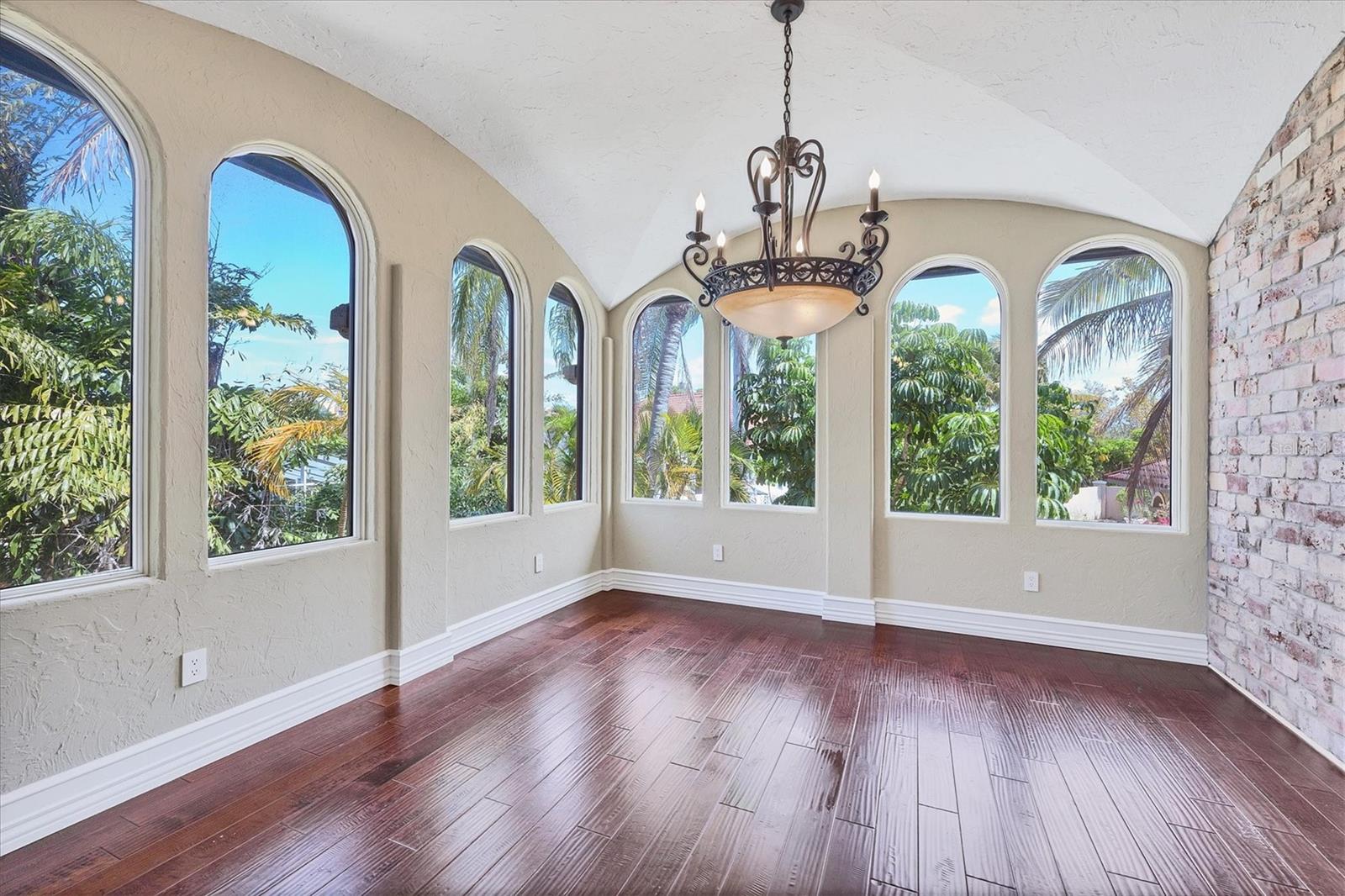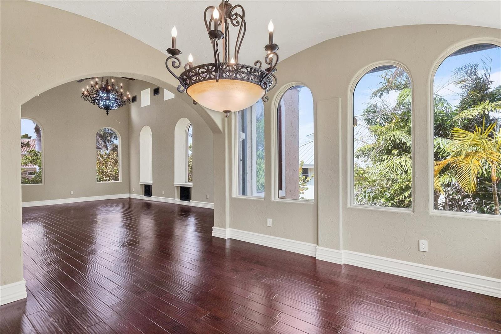 One or more photo(s) has been virtually staged. Offering unparalleled privacy and tranquility, this over ½ acre wall-enclosed Siesta Key estate home embodies exclusivity and sophistication. On the market for the first time, this custom-built family home welcomes you through double arched wooden doors to find large open spaces that seamlessly blend timeless charm with modern amenities. On the main living level, you will find a spacious gourmet kitchen that is fully equipped with top-of-the-line appliances, a huge central island and custom-built wood cabinetry. An office/workspace nook with built-in desk and shelving is adjacent to the kitchen, along with a dry bar and laundry room with double washers and dryers, counter space, and extra storage. Just off the kitchen is a formal dining room ideal for hosting dinner parties that oversees a living room boasting with soaring ceilings, wood beams and grand oversized arched windows – creating an ideal space for large gatherings. On the same level you will find a charming arched hallway faced in Tuskegee brick imported from Alabama that leads to an expansive outside terrace with decorative stone railing and stunning views of the property. You will also find two en-suite bedrooms, walk-in closets with direct access to the outside terrace and a powder bath. The primary suite on the third level is a true retreat that exudes European charm in its large sitting room area with French doors leading to a private balcony, separate bedroom space with large walk-in closet, and an en-suite bath with oversized walk-in shower and additional walk-in closet. A small staircase leads to an adorable flex room with built-in storage perfect for a hobby room, quiet study or amazing closet. The ground floor also offers an abundance of space and opportunities (fitness room, game room, craft room, etc.) and includes a separate entrance. Step outside to find a resort-style set-up with a large cabana and pool surrounded by palm trees and lush landscaping. The outdoor kitchen and gas firepit add to the appeal and make this space great for entertaining and fun adventures around the pool. Beyond the walls you will have access to your very own deeded beach, along with a neighboring premier, full-service, bay front marina.