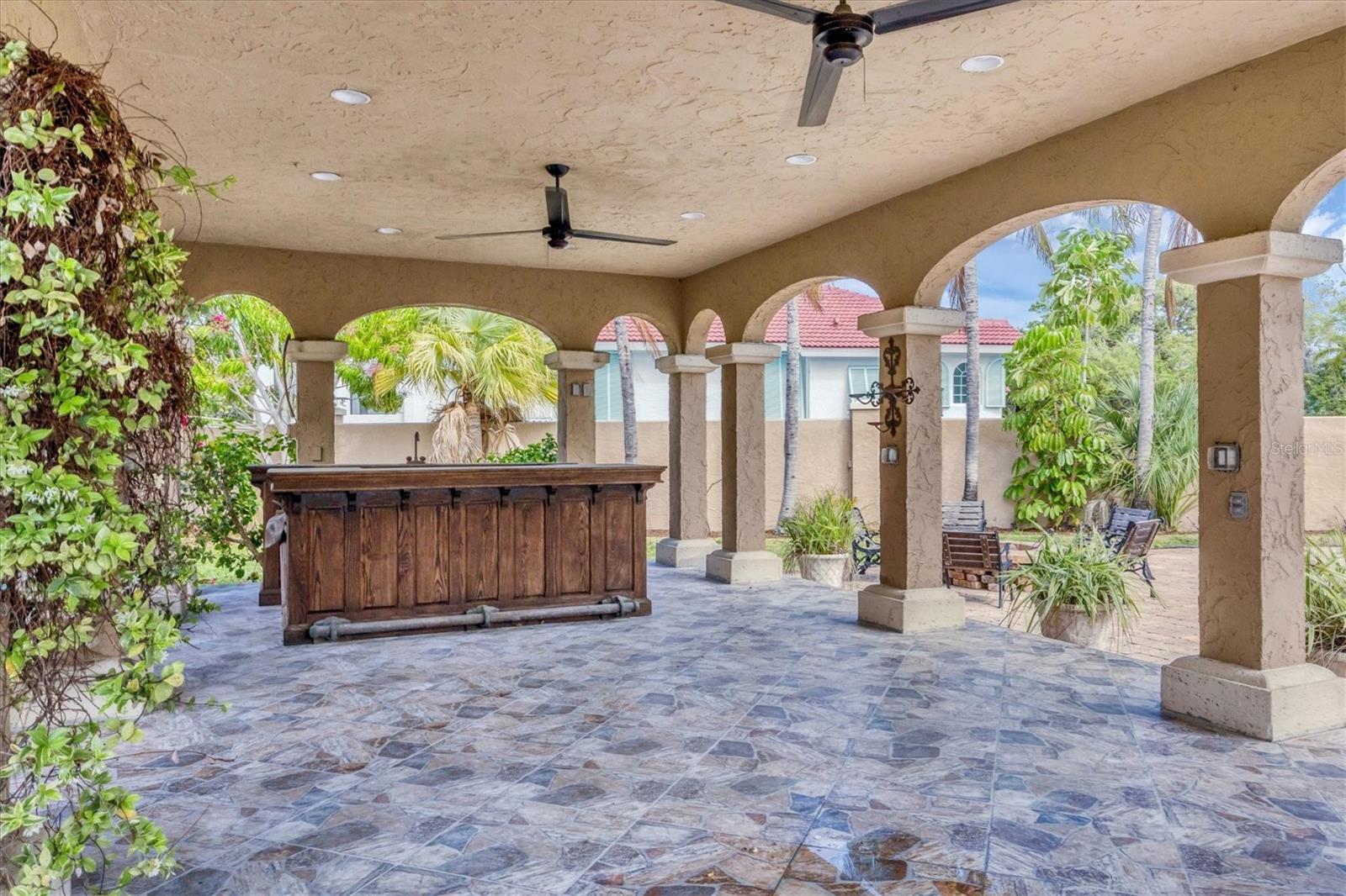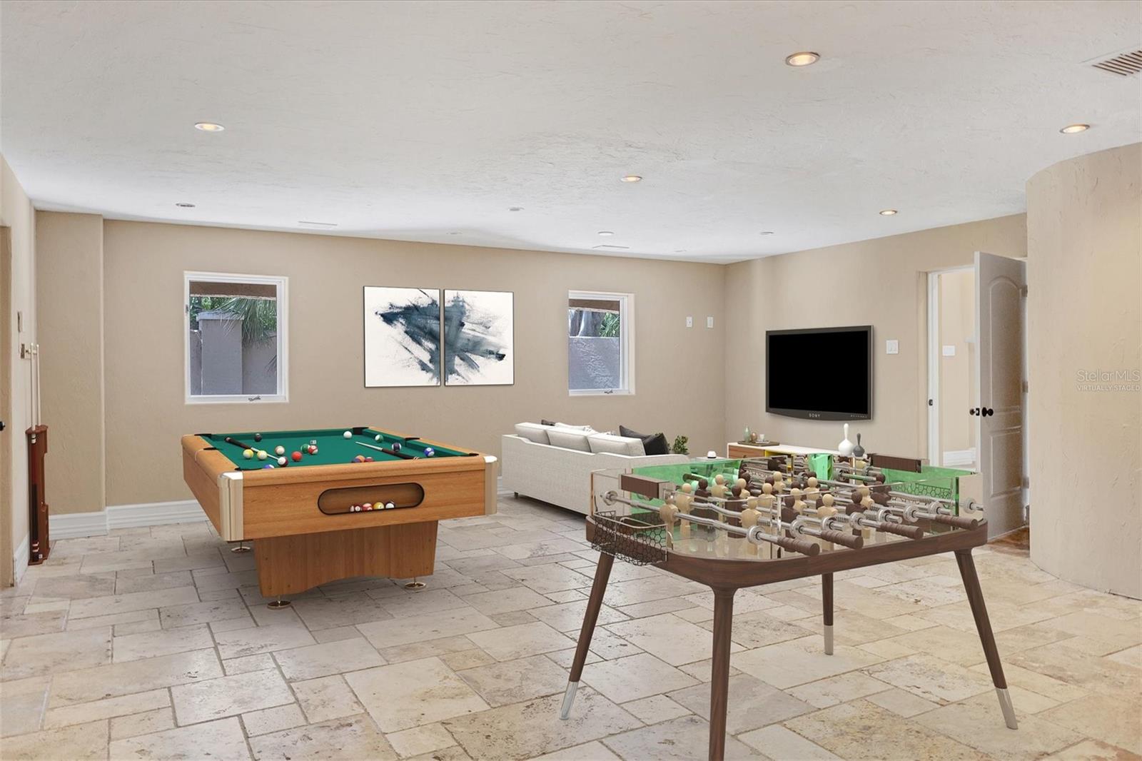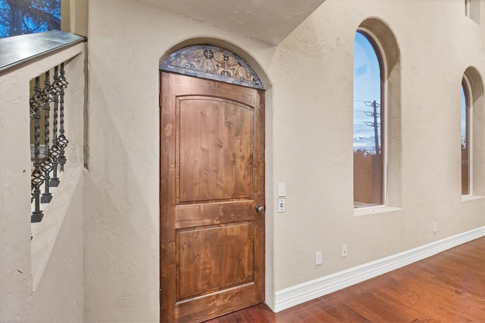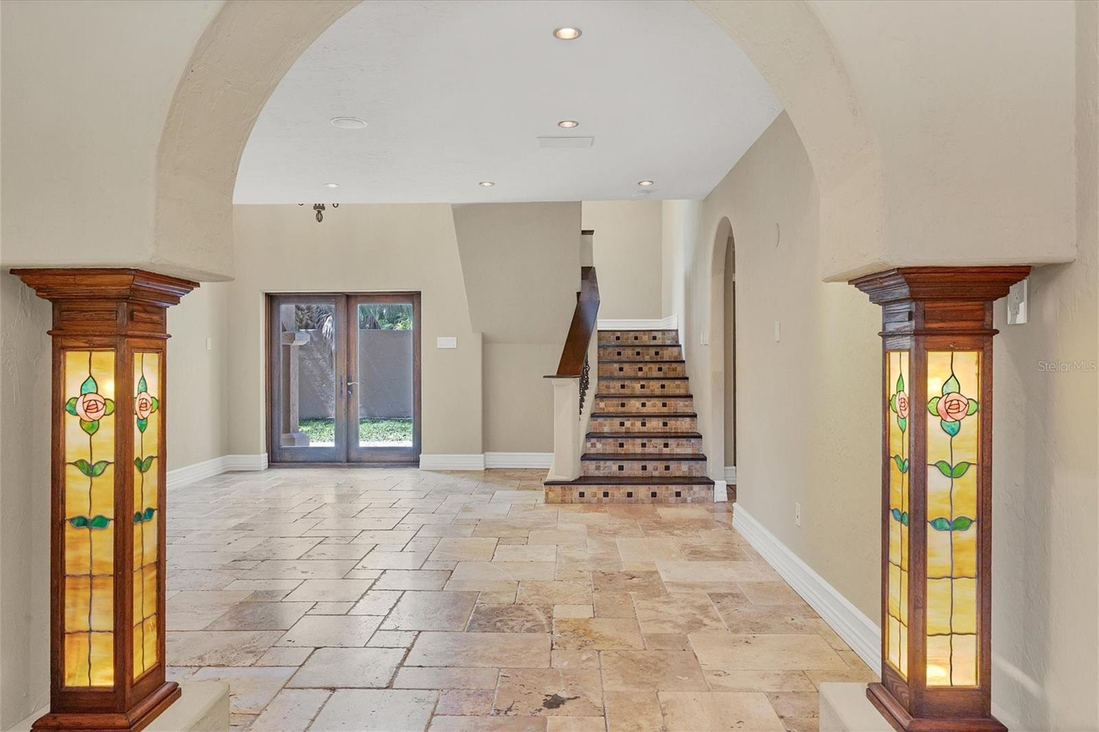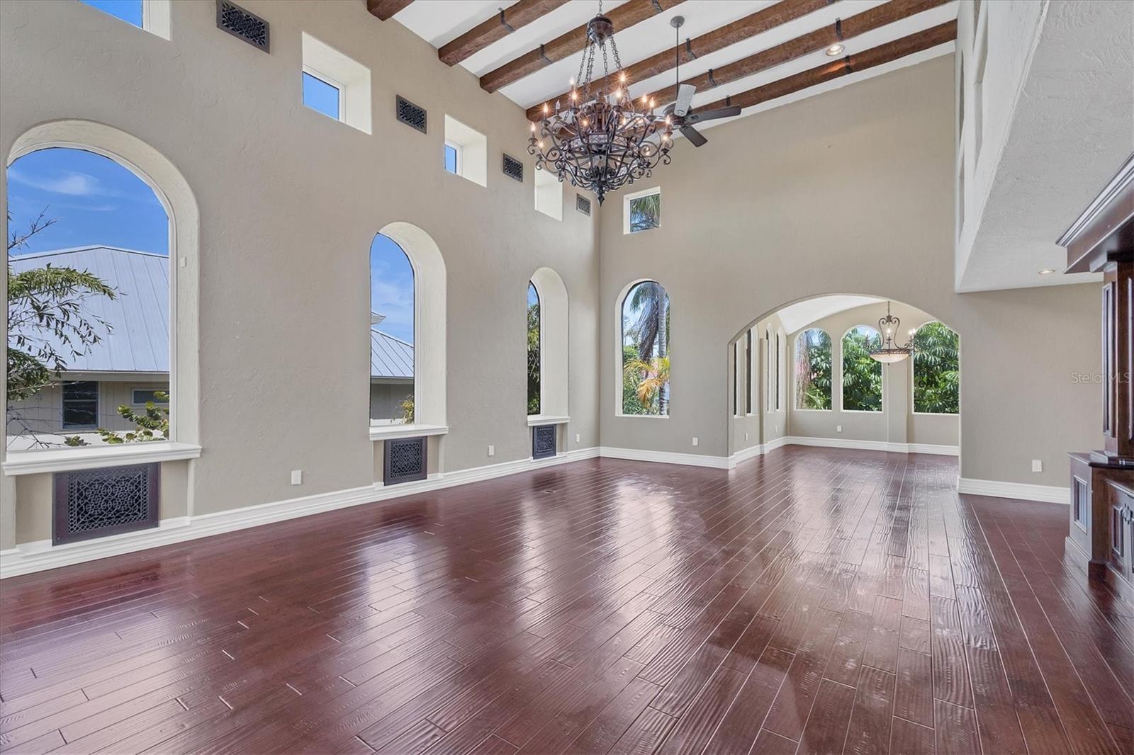 One or more photo(s) has been virtually staged. Offering unparalleled privacy and tranquility, this over ½ acre wall-enclosed Siesta Key estate home embodies exclusivity and sophistication. On the market for the first time, this custom-built family home welcomes you through double arched wooden doors to find large open spaces that seamlessly blend timeless charm with modern amenities. On the main living level, you will find a spacious gourmet kitchen that is fully equipped with top-of-the-line appliances, a huge central island and custom-built wood cabinetry. An office/workspace nook with built-in desk and shelving is adjacent to the kitchen, along with a dry bar and laundry room with double washers and dryers, counter space, and extra storage. Just off the kitchen is a formal dining room ideal for hosting dinner parties that oversees a living room boasting with soaring ceilings, wood beams and grand oversized arched windows – creating an ideal space for large gatherings. On the same level you will find a charming arched hallway faced in Tuskegee brick imported from Alabama that leads to an expansive outside terrace with decorative stone railing and stunning views of the property. You will also find two en-suite bedrooms, walk-in closets with direct access to the outside terrace and a powder bath. The primary suite on the third level is a true retreat that exudes European charm in its large sitting room area with French doors leading to a private balcony, separate bedroom space with large walk-in closet, and an en-suite bath with oversized walk-in shower and additional walk-in closet. A small staircase leads to an adorable flex room with built-in storage perfect for a hobby room, quiet study or amazing closet. The ground floor also offers an abundance of space and opportunities (fitness room, game room, craft room, etc.) and includes a separate entrance. Step outside to find a resort-style set-up with a large cabana and pool surrounded by palm trees and lush landscaping. The outdoor kitchen and gas firepit add to the appeal and make this space great for entertaining and fun adventures around the pool. Beyond the walls you will have access to your very own deeded beach, along with a neighboring premier, full-service, bay front marina.