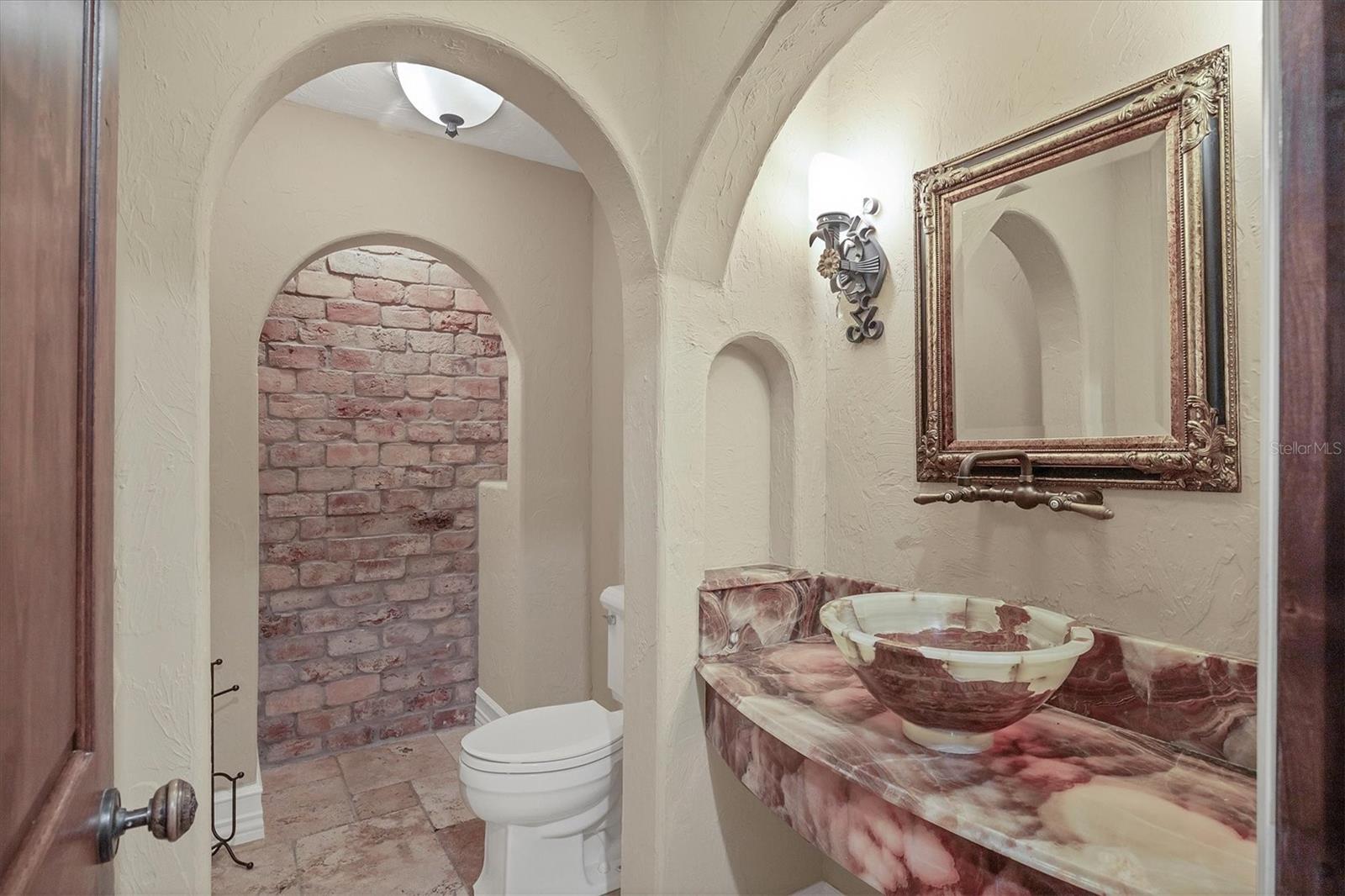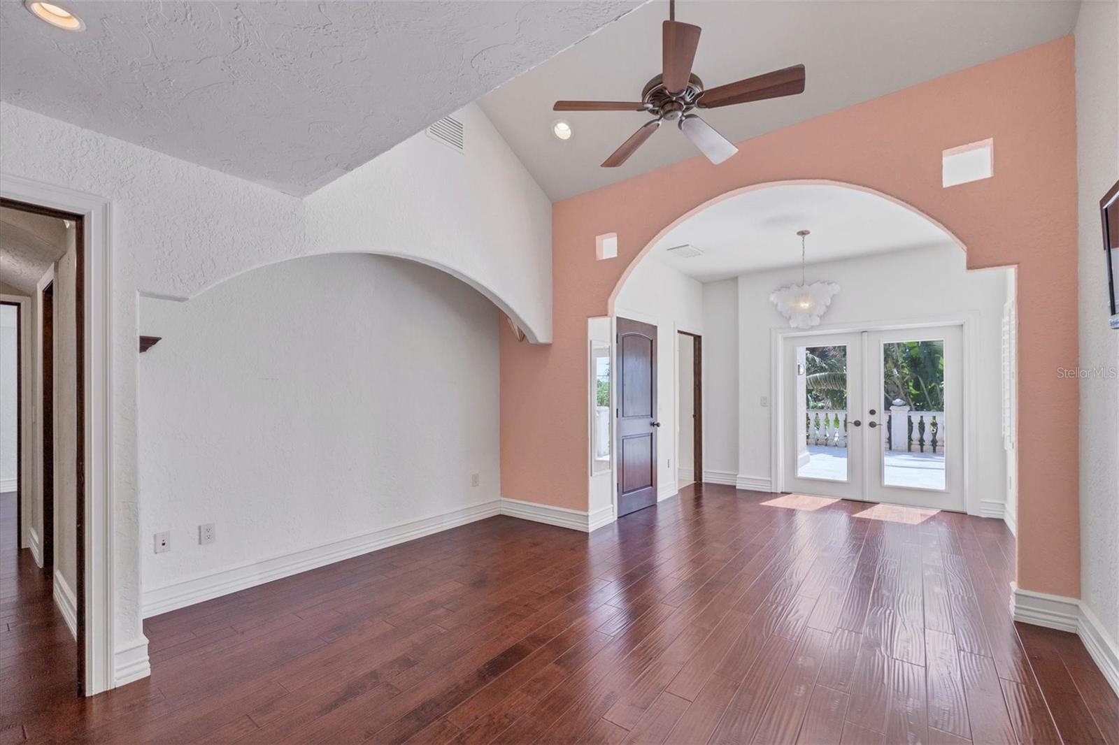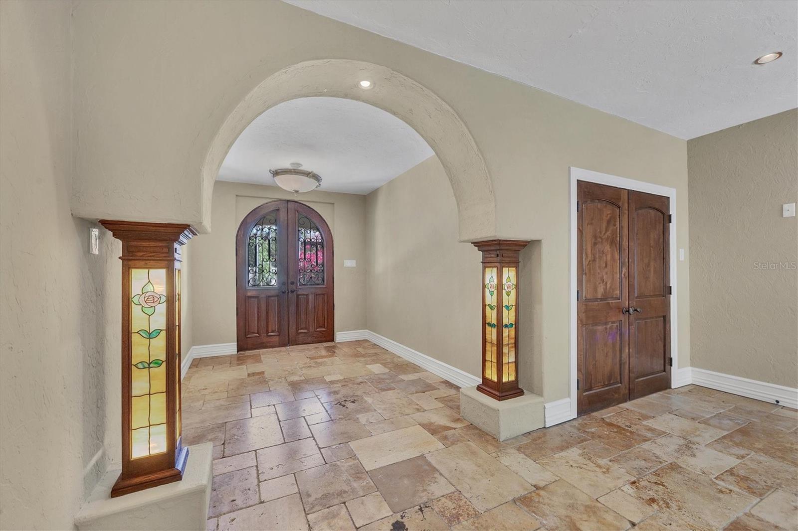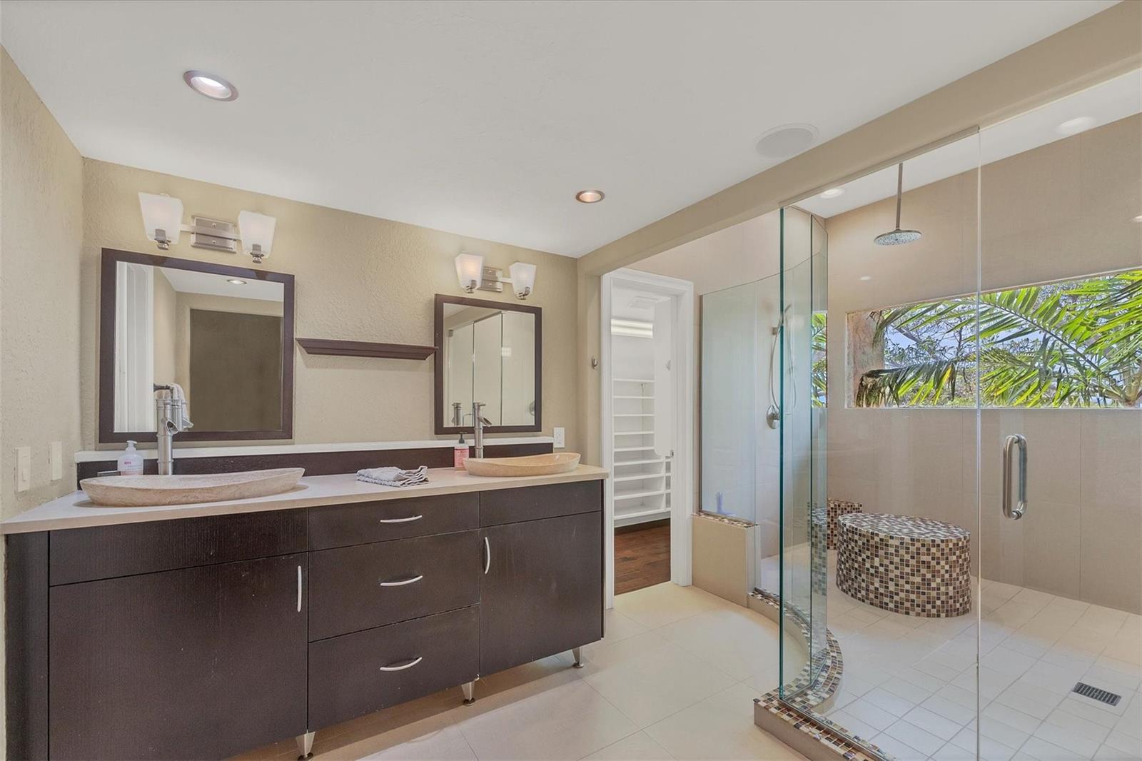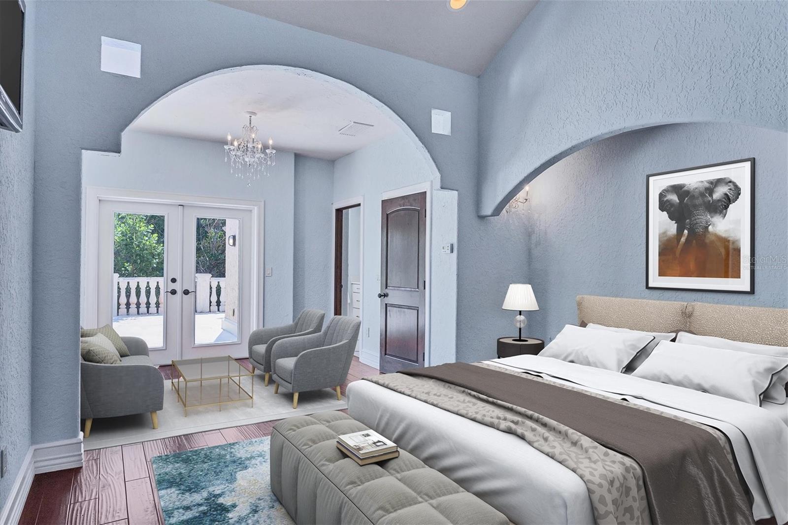 One or more photo(s) has been virtually staged. Offering unparalleled privacy and tranquility, this over ½ acre wall-enclosed Siesta Key estate home embodies exclusivity and sophistication. On the market for the first time, this custom-built family home welcomes you through double arched wooden doors to find large open spaces that seamlessly blend timeless charm with modern amenities. On the main living level, you will find a spacious gourmet kitchen that is fully equipped with top-of-the-line appliances, a huge central island and custom-built wood cabinetry. An office/workspace nook with built-in desk and shelving is adjacent to the kitchen, along with a dry bar and laundry room with double washers and dryers, counter space, and extra storage. Just off the kitchen is a formal dining room ideal for hosting dinner parties that oversees a living room boasting with soaring ceilings, wood beams and grand oversized arched windows – creating an ideal space for large gatherings. On the same level you will find a charming arched hallway faced in Tuskegee brick imported from Alabama that leads to an expansive outside terrace with decorative stone railing and stunning views of the property. You will also find two en-suite bedrooms, walk-in closets with direct access to the outside terrace and a powder bath. The primary suite on the third level is a true retreat that exudes European charm in its large sitting room area with French doors leading to a private balcony, separate bedroom space with large walk-in closet, and an en-suite bath with oversized walk-in shower and additional walk-in closet. A small staircase leads to an adorable flex room with built-in storage perfect for a hobby room, quiet study or amazing closet. The ground floor also offers an abundance of space and opportunities (fitness room, game room, craft room, etc.) and includes a separate entrance. Step outside to find a resort-style set-up with a large cabana and pool surrounded by palm trees and lush landscaping. The outdoor kitchen and gas firepit add to the appeal and make this space great for entertaining and fun adventures around the pool. Beyond the walls you will have access to your very own deeded beach, along with a neighboring premier, full-service, bay front marina.