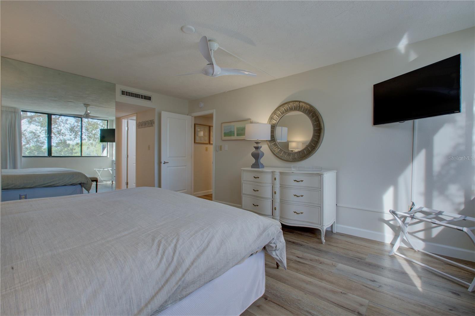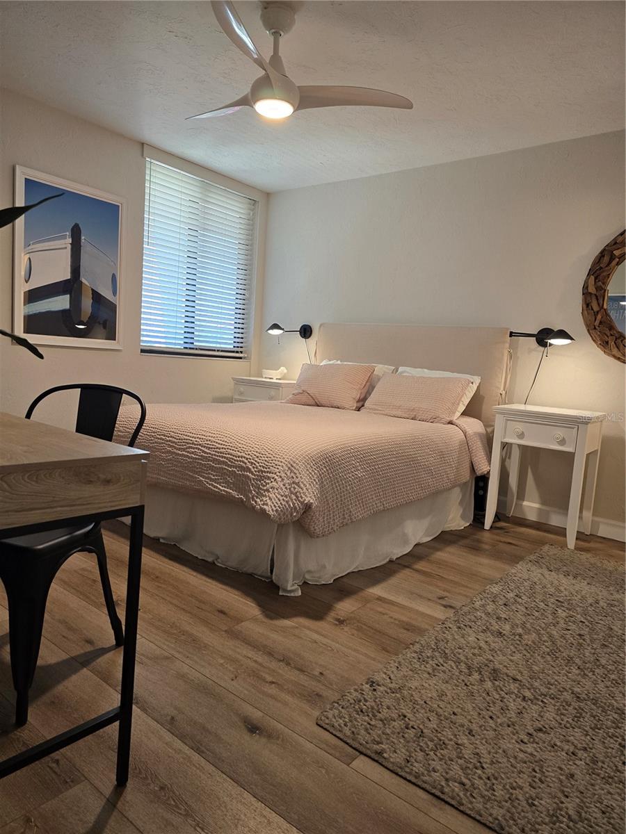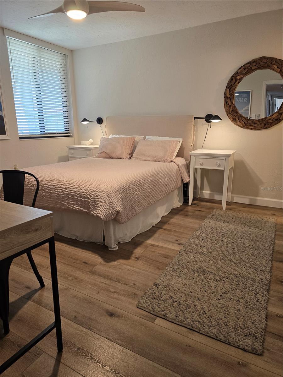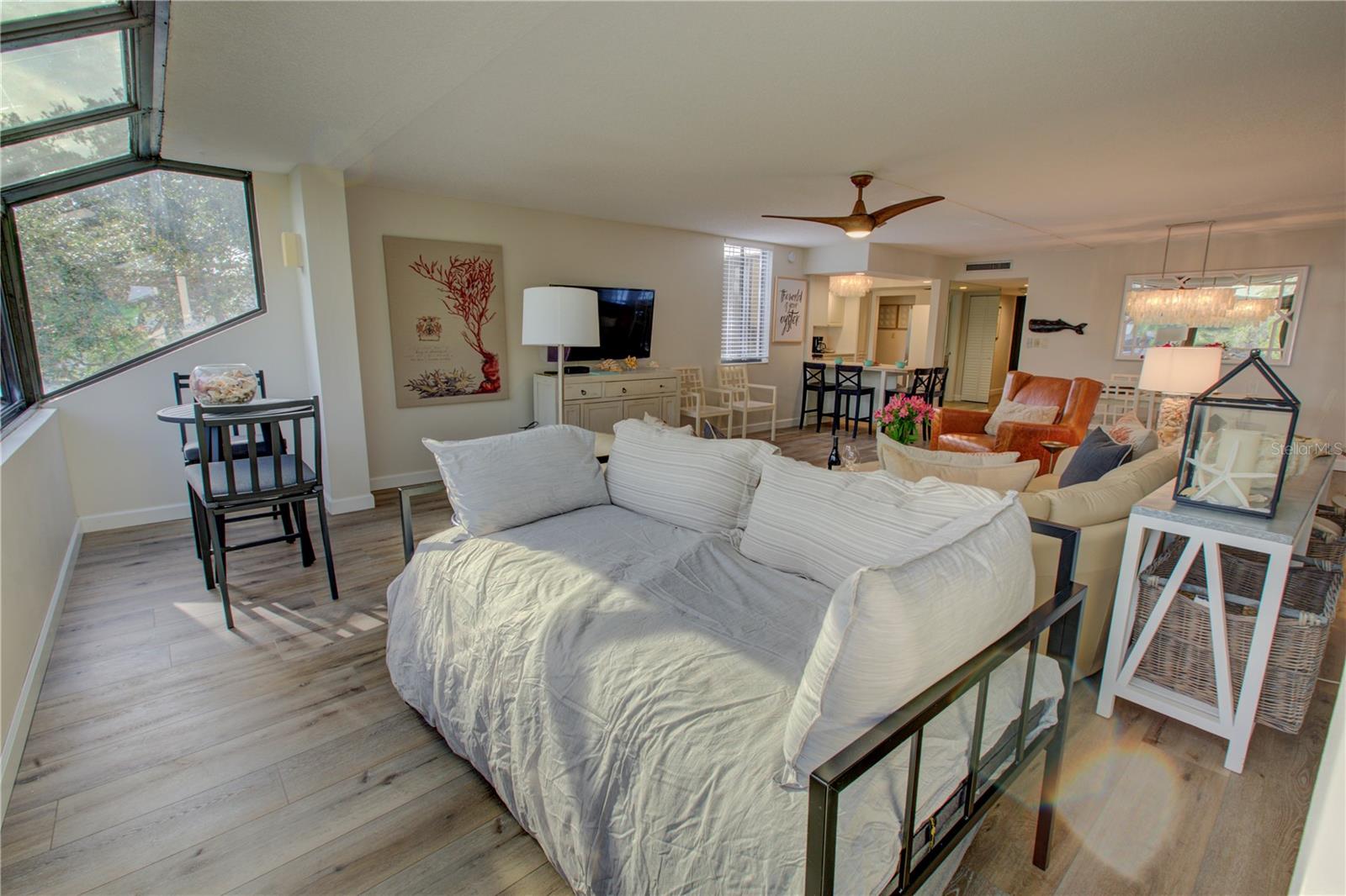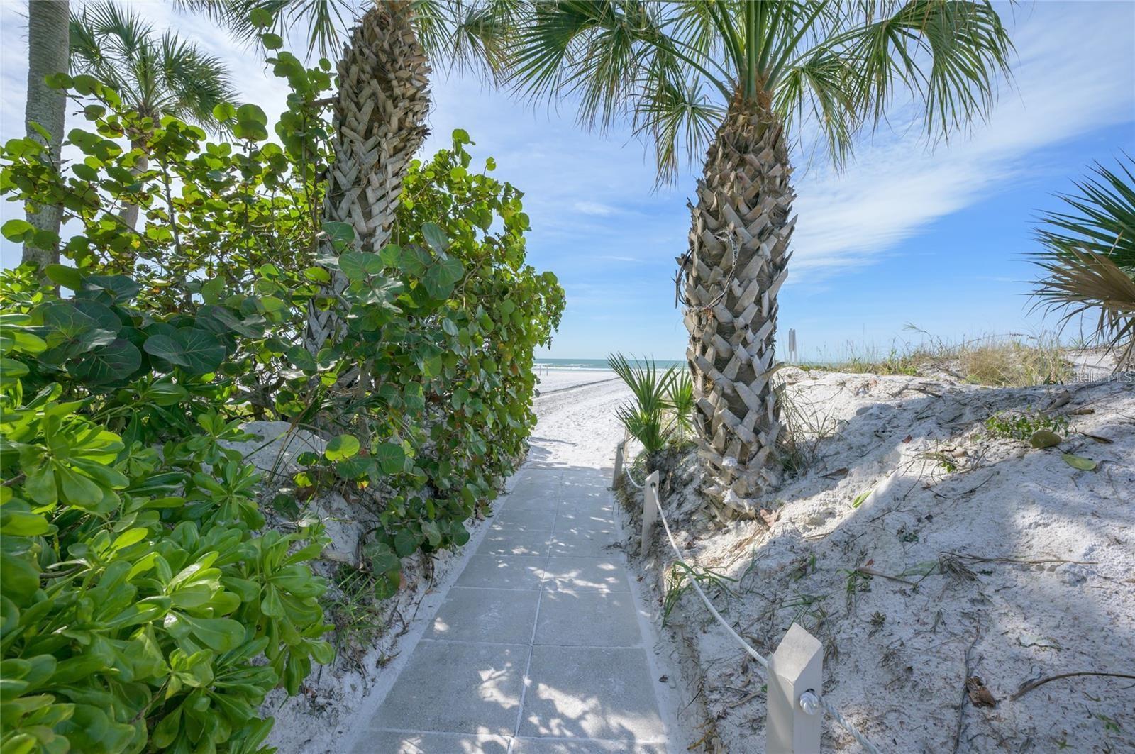 This is one of the largest two-bedroom units in this pet friendly, beach-to-bay development. Excelsior is known for its lush tropical landscaping, with paved walkways weaving through both the beach and bayside. The resort-style amenities will keep you entertained in a development that isn't just packing in tourists, which allows you to make friends and socialize in your beautiful second home or investment property. This is not your typical beach condominium. This end unit is situated on the second floor in the first building across the street from the beach. The unit is front to back and overlooks a courtyard, so the unit has sun and tropical vistas from three sides. With windows in every room (excluding bathrooms) and oversized rooms, there is a feeling of being in a space that is as comfortable as home. Excelsior offers you a private white sandy beach with complimentary lounge chairs. You can indulge in resort-style amenities such as two heated pools with poolside restrooms and showers, whirlpools, fitness center, tennis courts, pickleball courts, shuffleboard, fishing pier, a gulf-side sun deck, barbecue areas, and picnic areas. Under building assigned parking and storage are included. The unit is fully furnished and already has rental bookings in place. The unit has been partially renovated with tasteful decor with a vacation vibe. From the matching Capiza chandeliers that adorn the kitchen and dining room to the large shell prints in the living room. Open the Juliette French doors next to the dining room table that overlooks a patio and garden, so you can enjoy the cross breeze during the cooler months. The owners have expanded the kitchen to provide additional storage space, which also serves as a counter-height bar for extra guests or a cozy spot to enjoy your morning coffee. The living room, besides having a large sectional sofa and chairs, features a day bed with a trundle, providing two additional sleeping spaces. The guest bathroom is conveniently located in the hallway, allowing your guest(s) in the living room access without having to pass through a bedroom in the middle of the night. The primary bedroom is spacious and includes a king-sized bed with floor to ceiling custom room-darkening drapes. There is a sitting area where you can apply makeup and get dressed. Additionally, the bathroom in the primary bedroom includes a washer and dryer installed inside a closet. The guest bedroom is located on the opposite side of the unit and features a queen-sized bed, but it can accommodate a king or an additional twin bed if desired. There is a ton of closet space in each of the bedrooms, a hall linen closet, a locked owners closet, plus a front closet that is equipped with beach chairs, coolers, and beach games, and still has enough room for your fishing gear. This is one of the largest units on the market and is exceptionally priced per square foot. Don't miss out on this attractively priced opportunity.