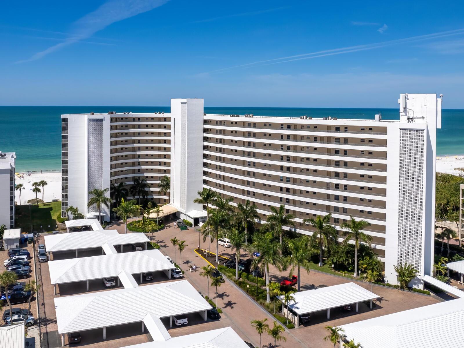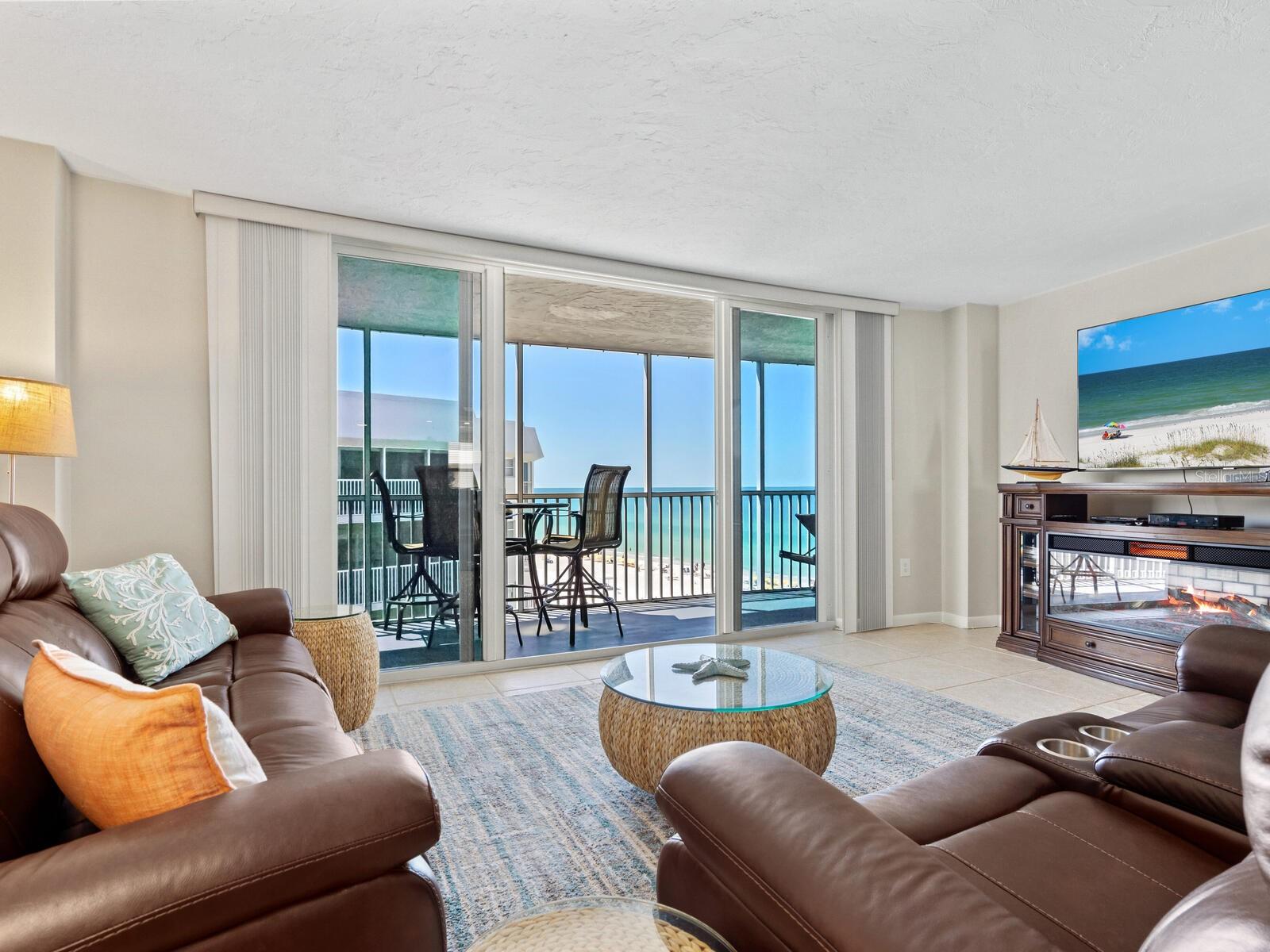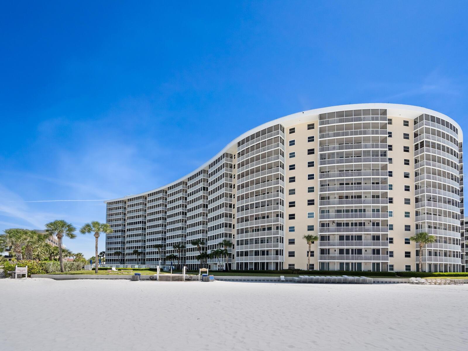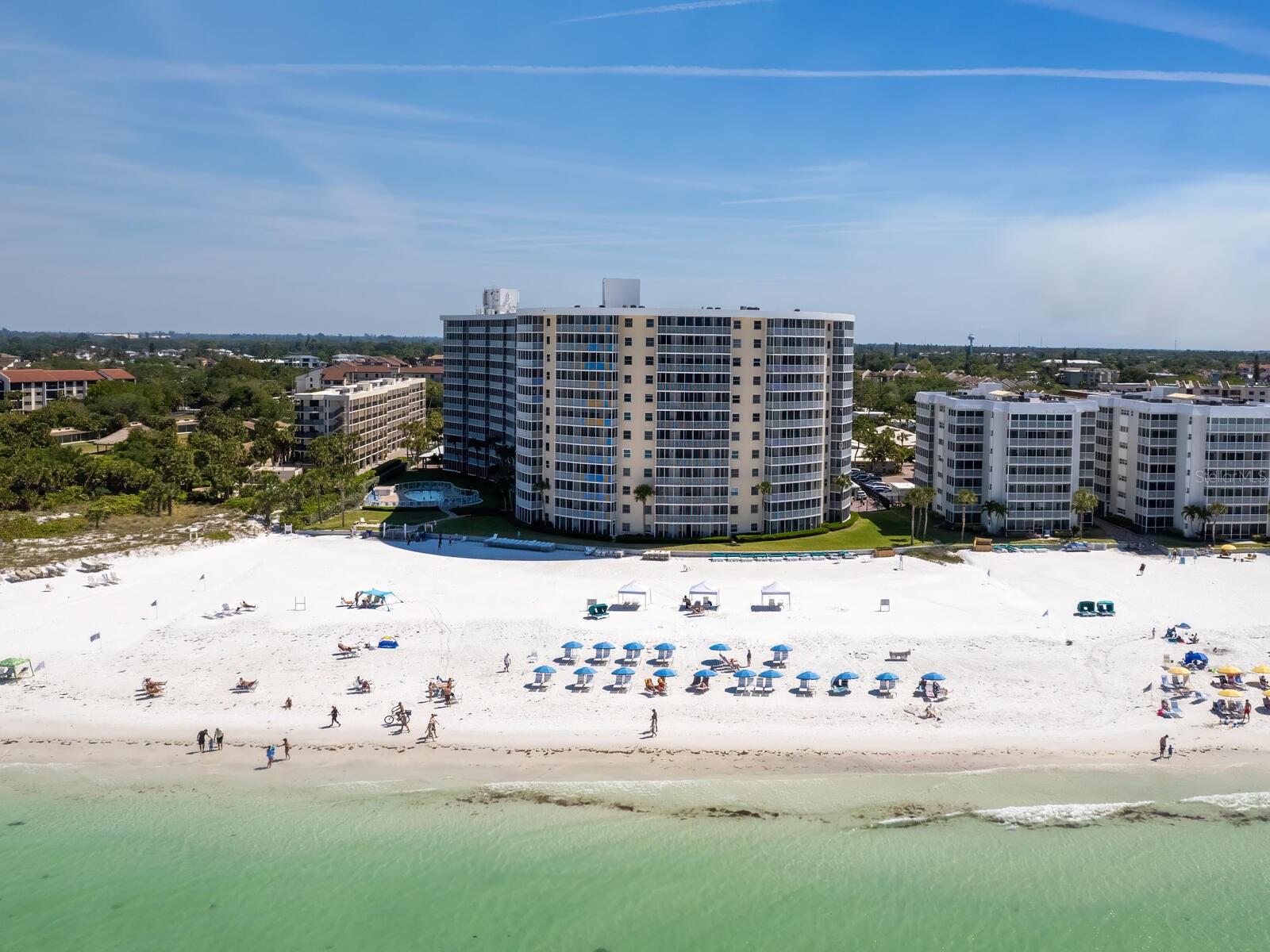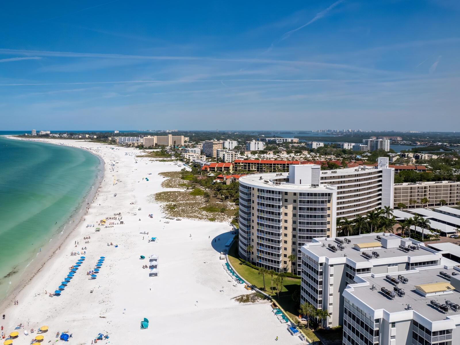 The azure waters of the Gulf of Mexico, and the spectacular white sand beach on Siesta Key is what will greet you as you enter this 7th floor condo in Crystal Sands. The views are stunning looking over the beach and water. The flowing floor plan is designed for casual living. The beautiful kitchen is open to the dining and living areas, with marble counters, SS appliances, tray ceiling, and breakfast bar. It’s a living room/dining room combo with hurricane rated sliding glass doors opening to the 31 ft. Screened in lanai. Open the sliding glass doors and hear the gentle sound of waves to lull you into a more tranquil state of mind. There is an electric fireplace in the living room that will put out heat on those chilly winter days, and the flame can be adjusted to change colors for a cozy setting. Bedrooms are on either side of the living area for the utmost in privacy. Both bedrooms have sliders opening up to the lanai, so all rooms are taking advantage of the views. The primary bath has double sinks, walk-in shower, walk-in closet. Another plus is the in unit laundry room with washer/dryer, plus additional storage. Crystal Sands is a gated community with two heated pools, private deeded beach access, beach chairs, grills, and a assigned covered parking space. The complex has been proactive on doing projects in recent years such as newer roofs, reinforced balconies, updated plumbing system, glass elevator on the North side, and more manicured landscaping. Owners and guests can take advantage of the trolley system to venture out to various restaurants, bars, gourmet grocery stores, and shops on Siesta Key without getting their car out. The two week rental minimum makes it attractive to the owner that wants some income but also wants to enjoy a Gulf and beach front condo themselves.