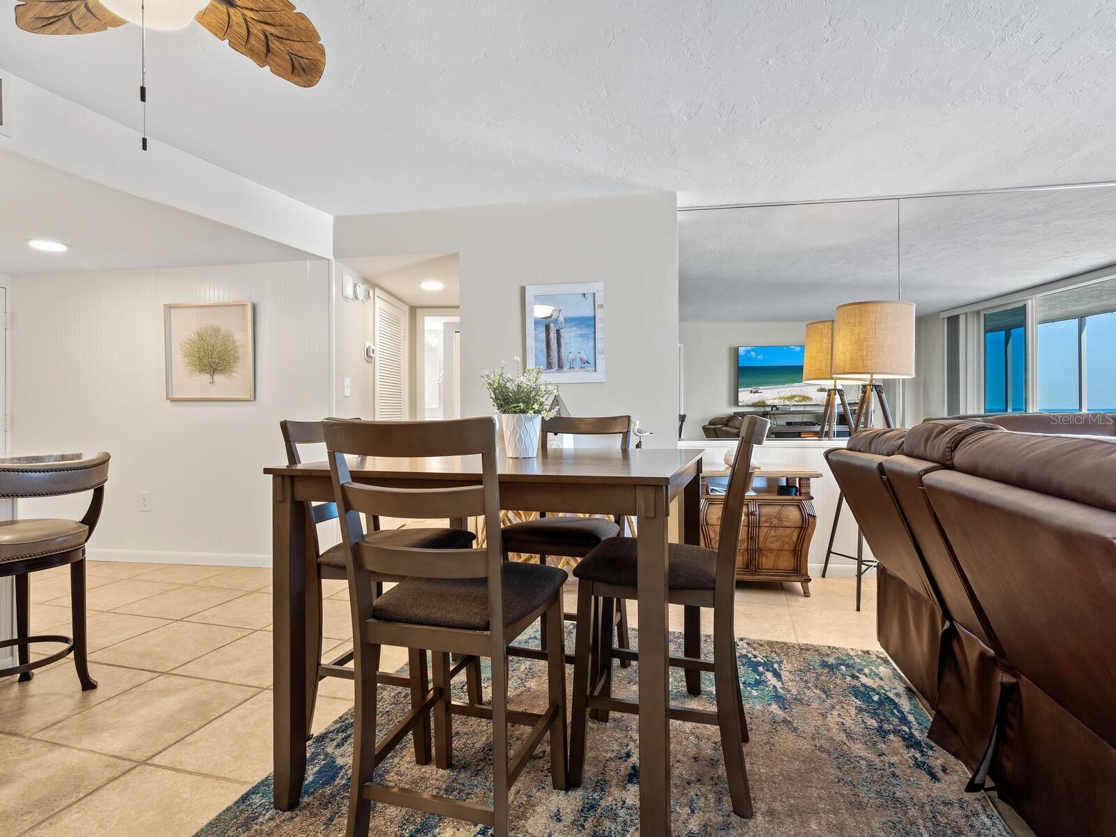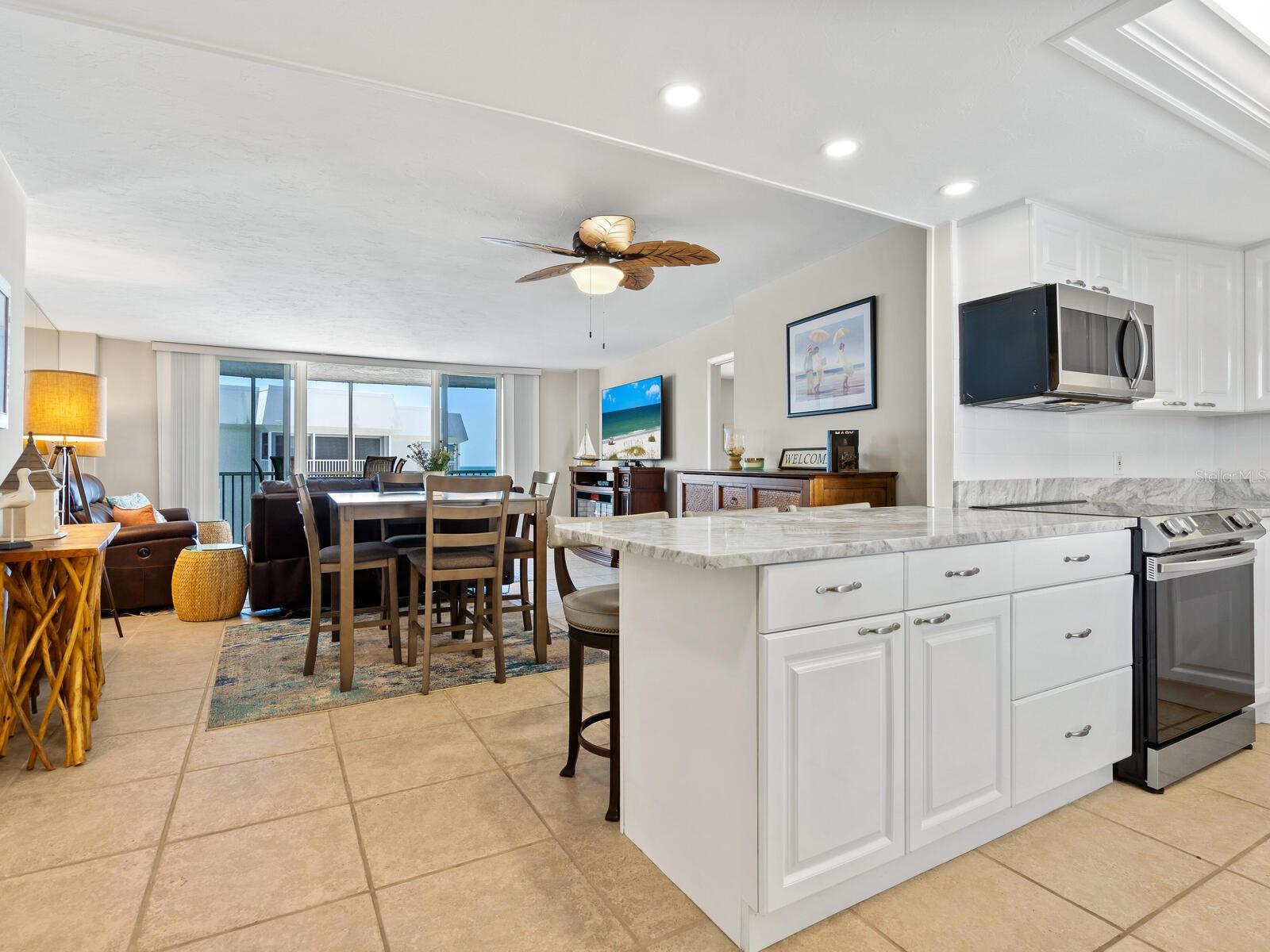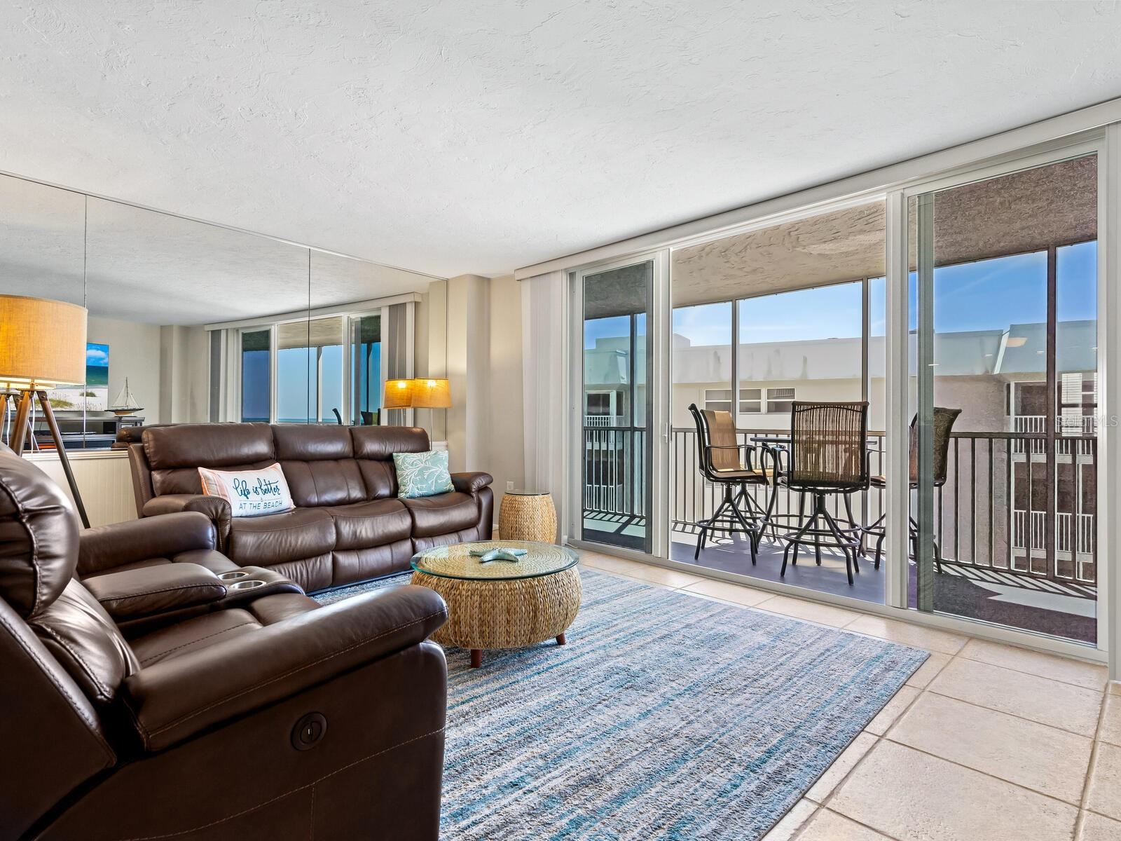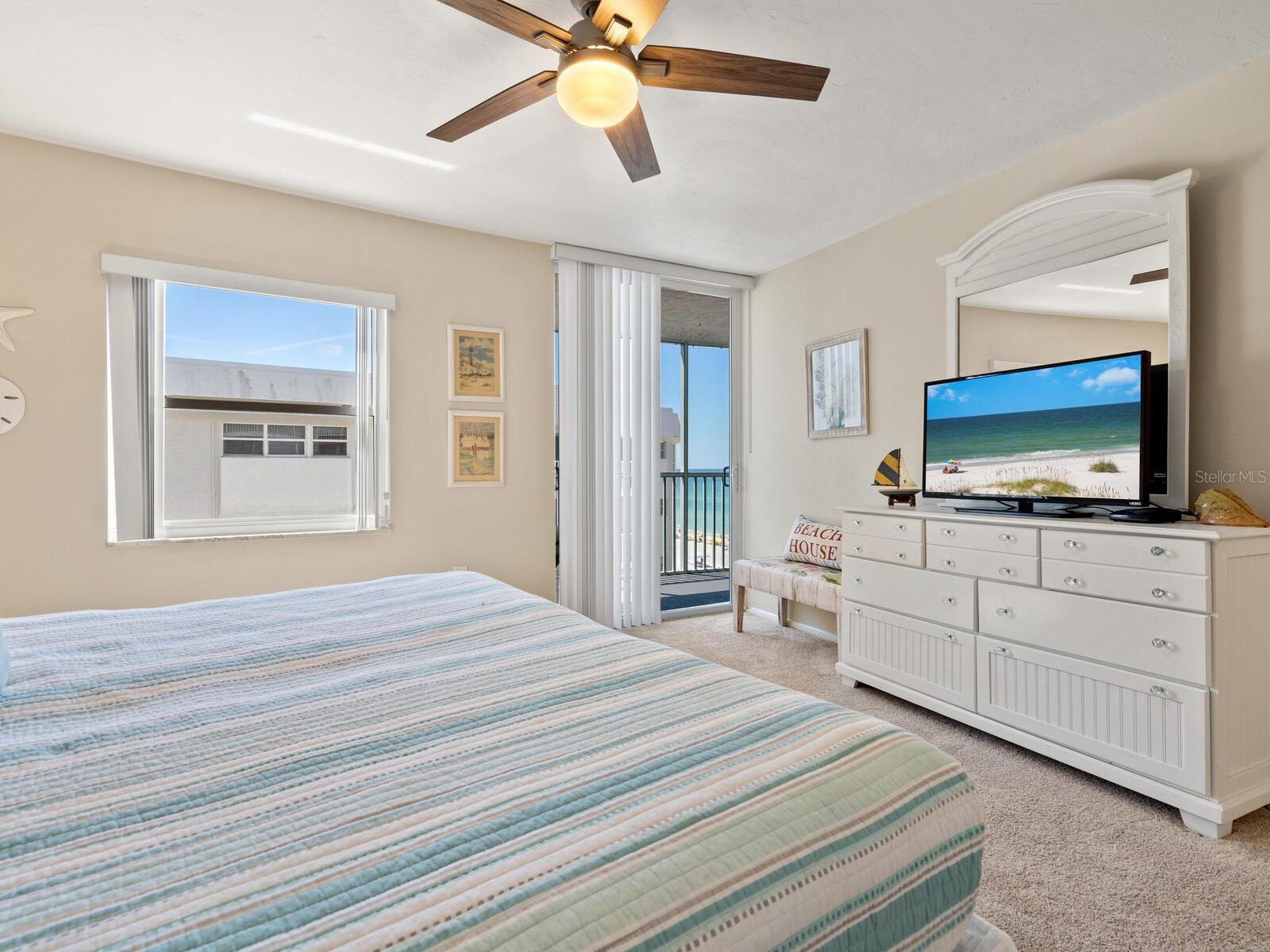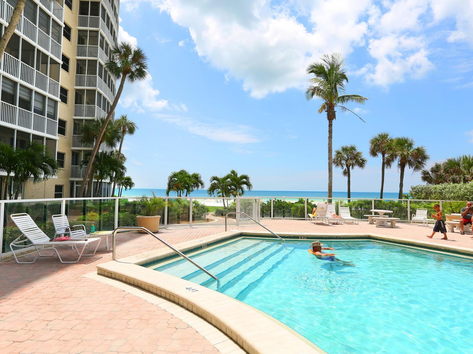 The azure waters of the Gulf of Mexico, and the spectacular white sand beach on Siesta Key is what will greet you as you enter this 7th floor condo in Crystal Sands. The views are stunning looking over the beach and water. The flowing floor plan is designed for casual living. The beautiful kitchen is open to the dining and living areas, with marble counters, SS appliances, tray ceiling, and breakfast bar. It’s a living room/dining room combo with hurricane rated sliding glass doors opening to the 31 ft. Screened in lanai. Open the sliding glass doors and hear the gentle sound of waves to lull you into a more tranquil state of mind. There is an electric fireplace in the living room that will put out heat on those chilly winter days, and the flame can be adjusted to change colors for a cozy setting. Bedrooms are on either side of the living area for the utmost in privacy. Both bedrooms have sliders opening up to the lanai, so all rooms are taking advantage of the views. The primary bath has double sinks, walk-in shower, walk-in closet. Another plus is the in unit laundry room with washer/dryer, plus additional storage. Crystal Sands is a gated community with two heated pools, private deeded beach access, beach chairs, grills, and a assigned covered parking space. The complex has been proactive on doing projects in recent years such as newer roofs, reinforced balconies, updated plumbing system, glass elevator on the North side, and more manicured landscaping. Owners and guests can take advantage of the trolley system to venture out to various restaurants, bars, gourmet grocery stores, and shops on Siesta Key without getting their car out. The two week rental minimum makes it attractive to the owner that wants some income but also wants to enjoy a Gulf and beach front condo themselves.