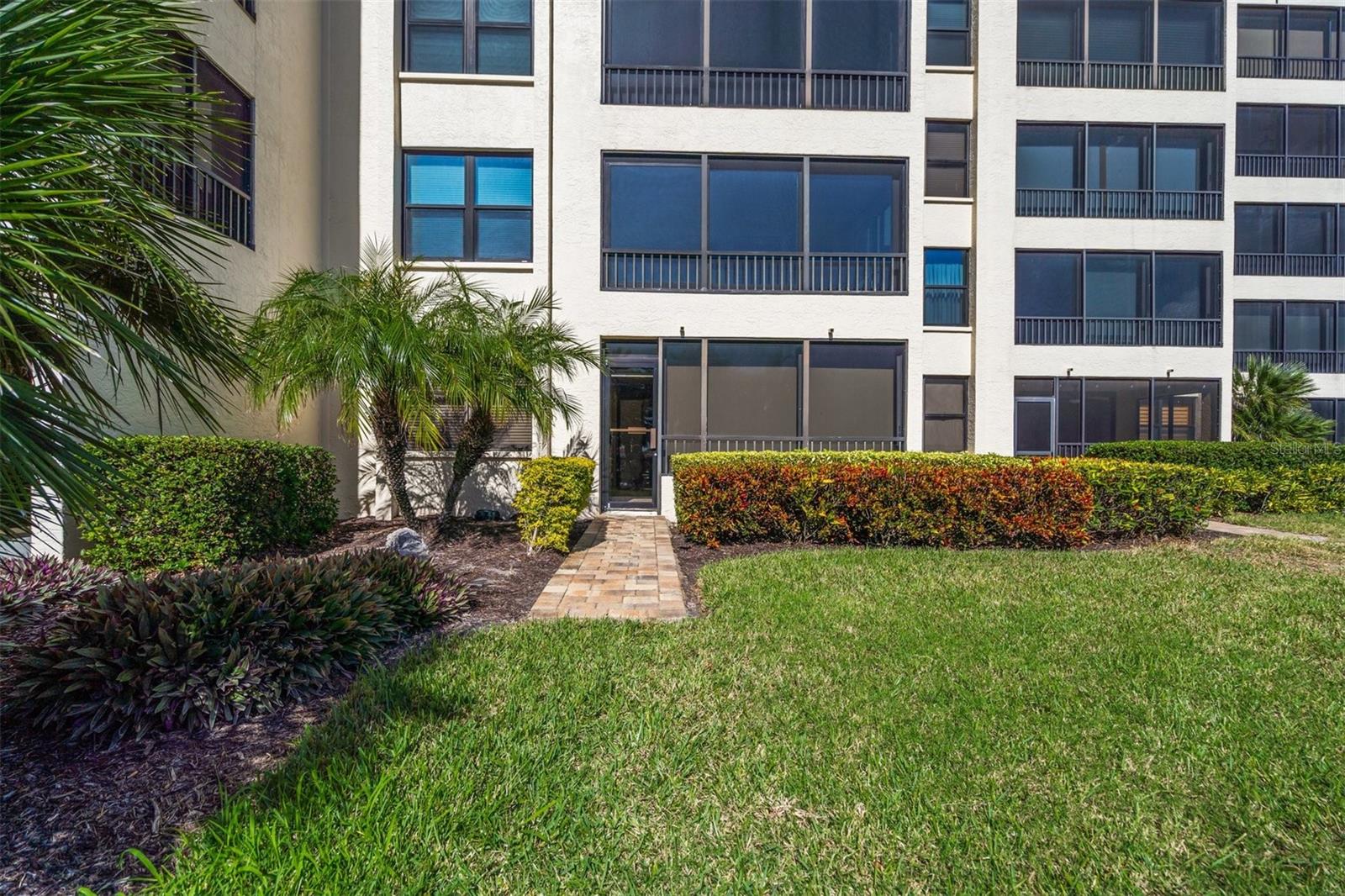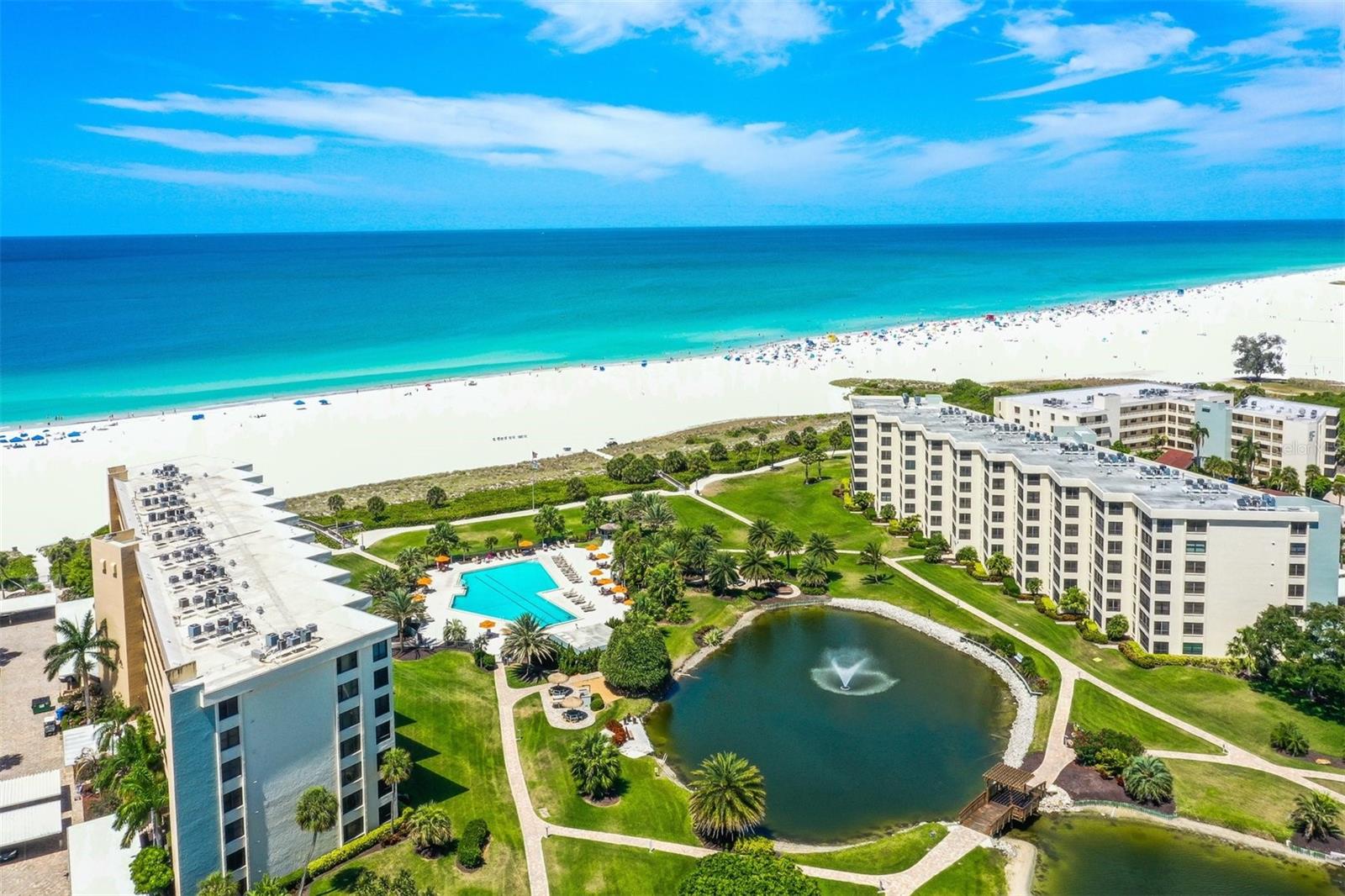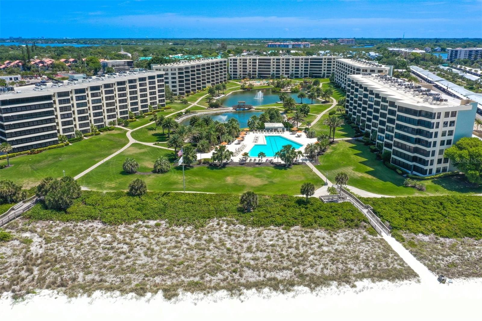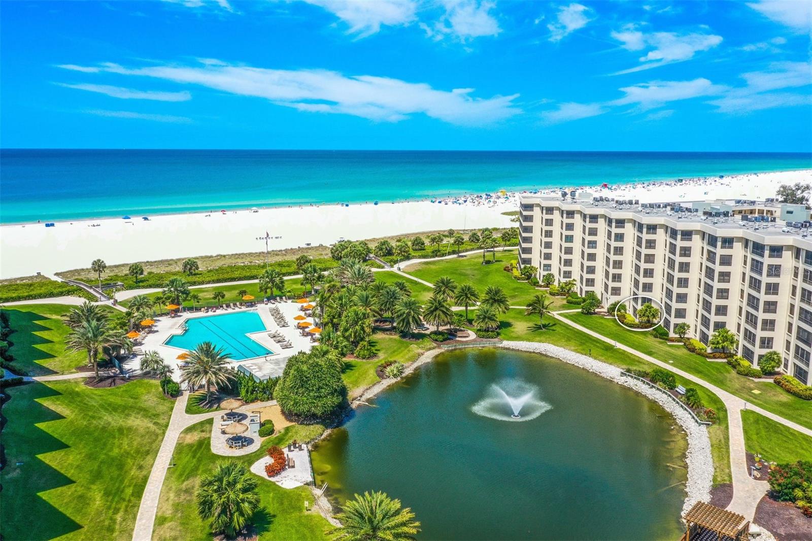 Rarely available, first-floor condominium located in the highly desirable building E at the Gulf & Bay Club. No waiting for the elevator and just a casual stroll directly out your door to the Gulf-front pool, one of the many barbecue grills and picnic areas, and most importantly, the crystal white sands of world-famous Siesta Key Beach. This nicely maintained and easy-to-care-for unit is light and bright. The living area has views overlooking the lush tropical landscaping, fountain-lit pond, waterside pool, and azure blue waters of the Gulf of Mexico. Double louvered doors allow privacy to the guest bedroom and bath plus laundry room. The laundry room easily accommodates a full-sized washer and dryer as well as extra storage. The kitchen has eat-in space with ample storage and all new kitchen appliances were installed in 2021 and 2022. The Gulf & Bay Club exemplifies the best of resort-style living with 800 feet of direct beachfront plus numerous amenities including but not limited to newer pickleball courts, tennis courts, a fitness center with sauna and spa, three swimming pools, basketball, racquetball, barbecue grills, picnic areas, two clubhouses, charging stations for electric cars, 24-hour security, and a guard-gated entry.