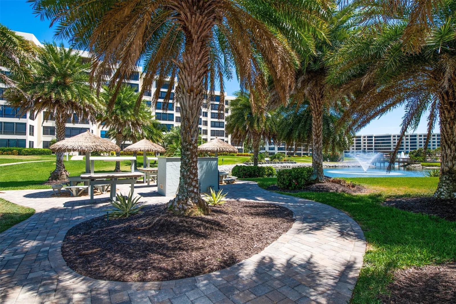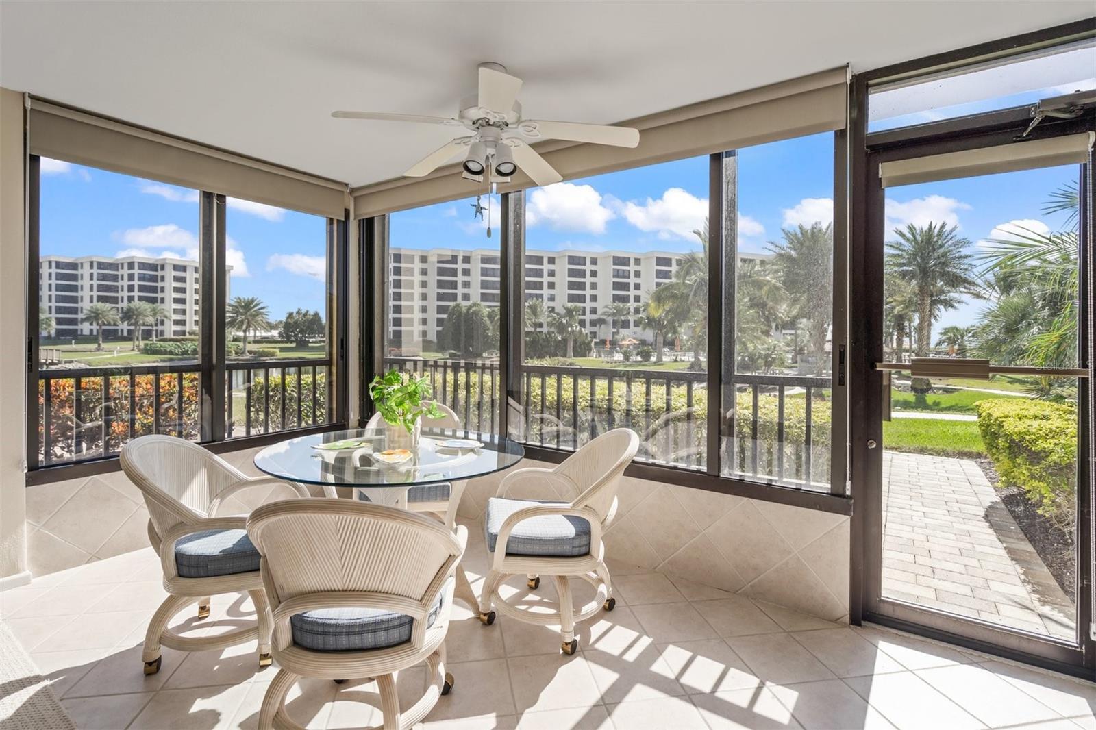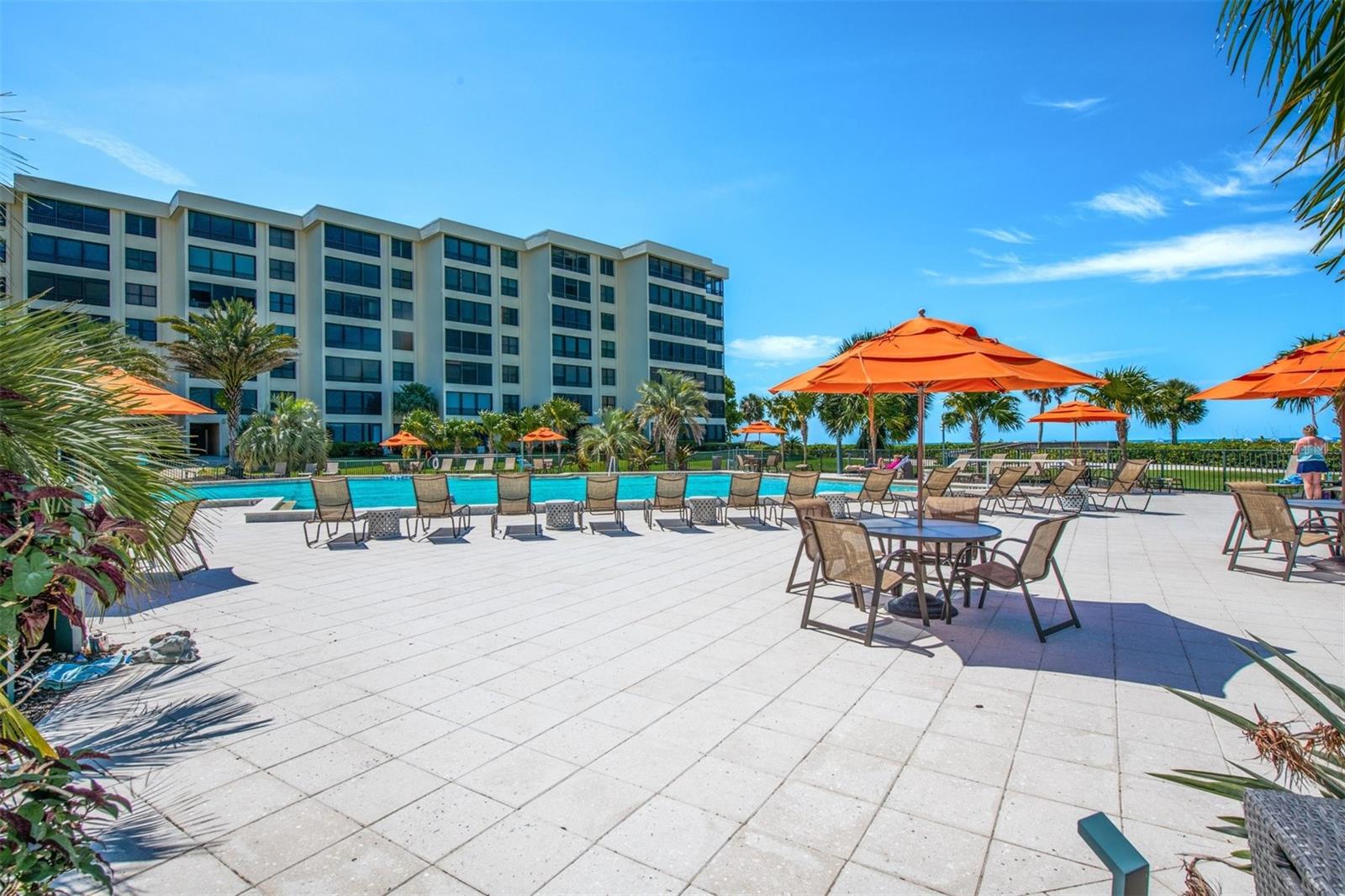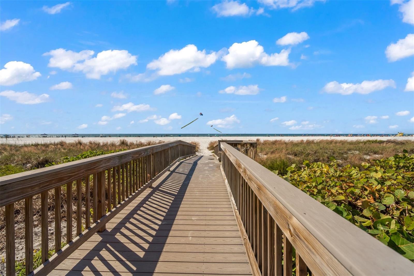 Rarely available, first-floor condominium located in the highly desirable building E at the Gulf & Bay Club. No waiting for the elevator and just a casual stroll directly out your door to the Gulf-front pool, one of the many barbecue grills and picnic areas, and most importantly, the crystal white sands of world-famous Siesta Key Beach. This nicely maintained and easy-to-care-for unit is light and bright. The living area has views overlooking the lush tropical landscaping, fountain-lit pond, waterside pool, and azure blue waters of the Gulf of Mexico. Double louvered doors allow privacy to the guest bedroom and bath plus laundry room. The laundry room easily accommodates a full-sized washer and dryer as well as extra storage. The kitchen has eat-in space with ample storage and all new kitchen appliances were installed in 2021 and 2022. The Gulf & Bay Club exemplifies the best of resort-style living with 800 feet of direct beachfront plus numerous amenities including but not limited to newer pickleball courts, tennis courts, a fitness center with sauna and spa, three swimming pools, basketball, racquetball, barbecue grills, picnic areas, two clubhouses, charging stations for electric cars, 24-hour security, and a guard-gated entry.