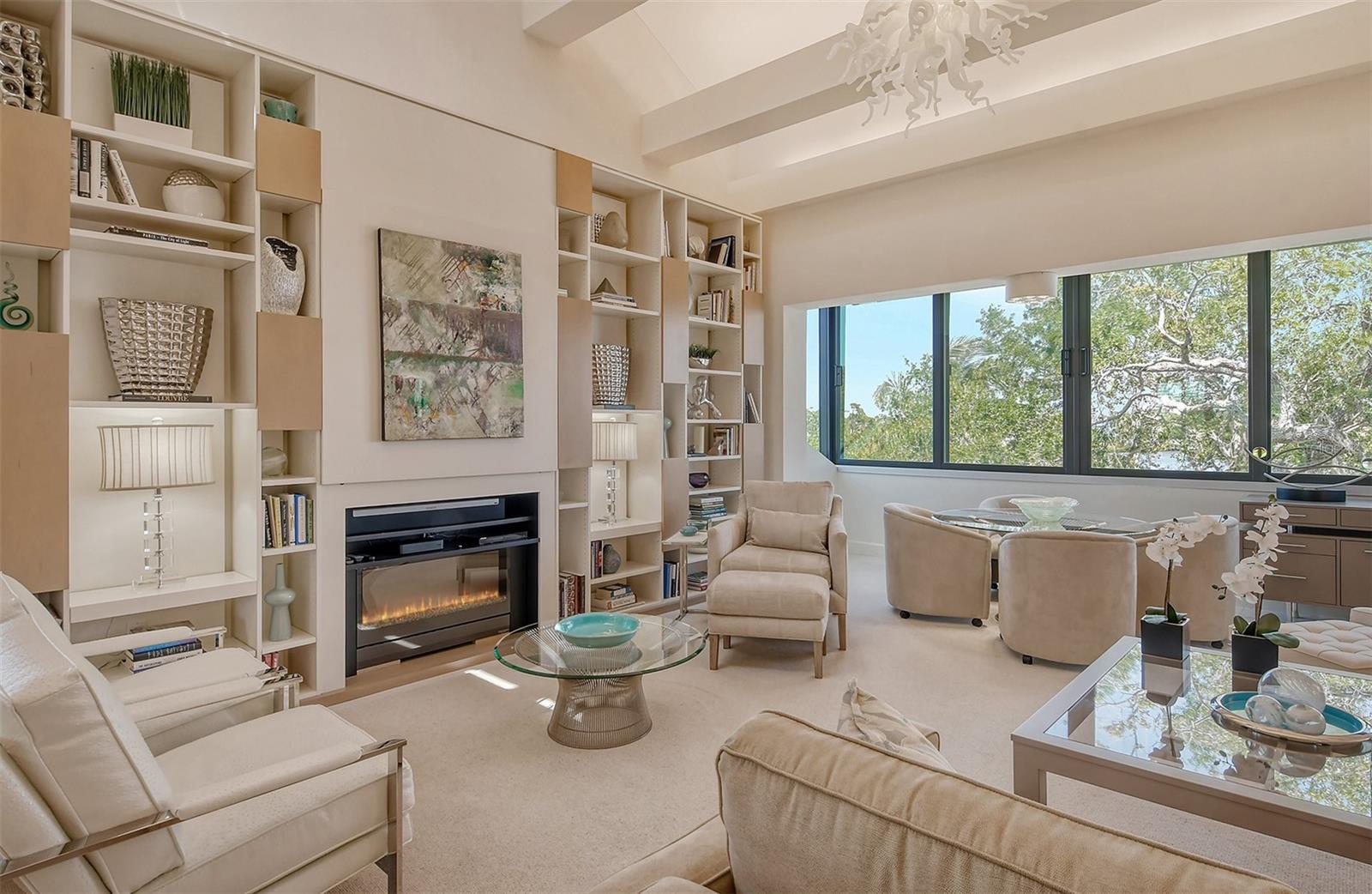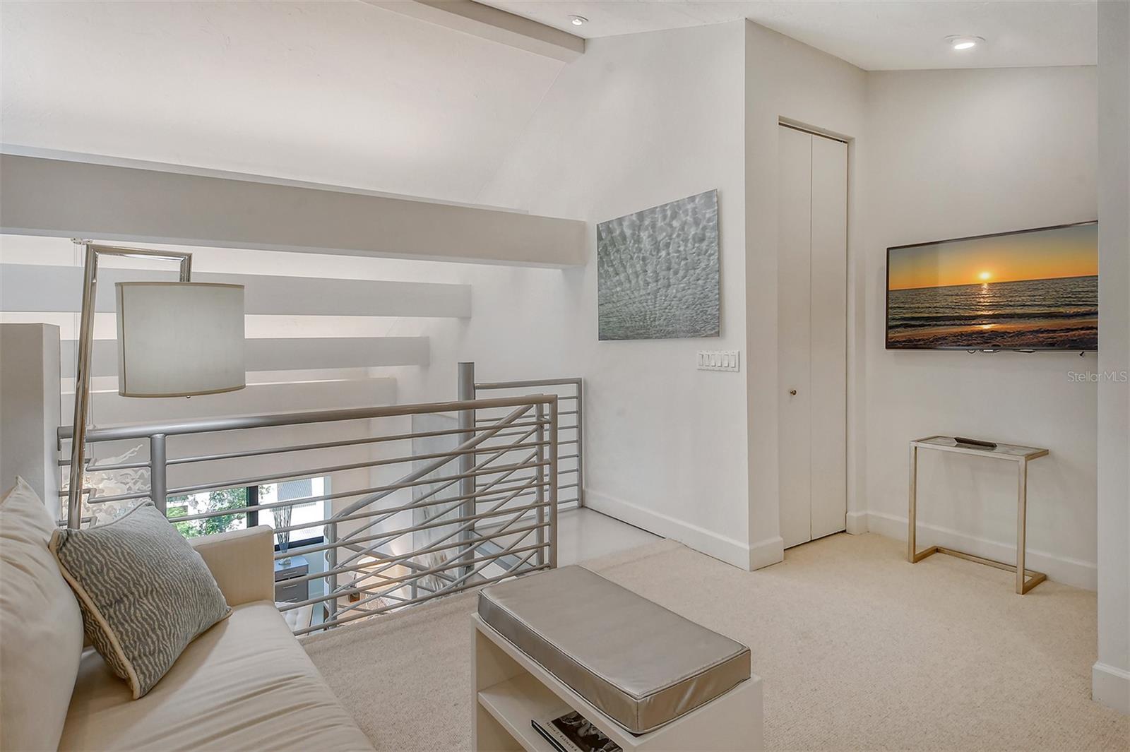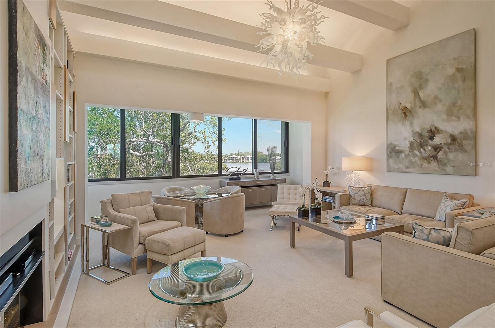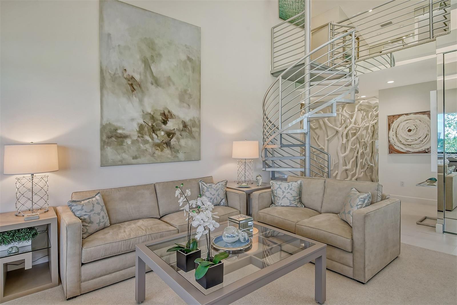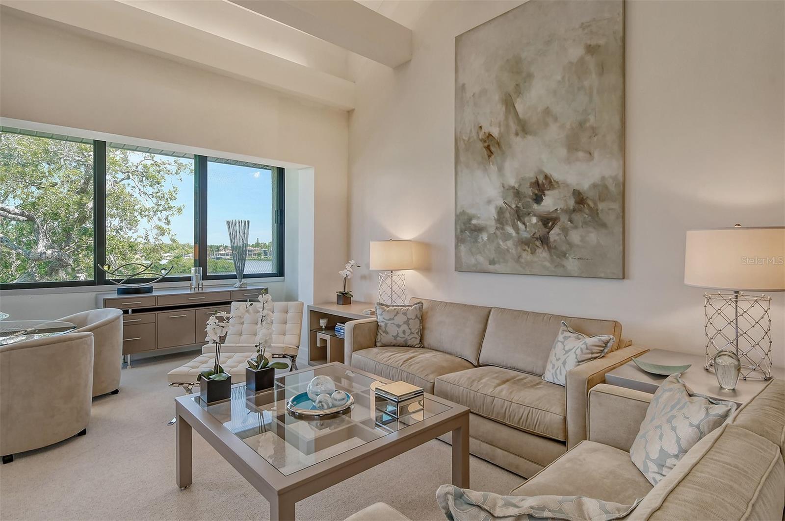 Treetop Retreat on the Bay! Welcome to living your perfect Siesta Key lifestyle. This turnkey furnished condo is situated bayside, the views from this bay view condo are of lush trees and thick tropical foilage and flowers. This condo has a tree-house feeling., The living room ceiling is 23 feet high! There is a spiral staircase made of matte-finish metal and frosted glass. The glass stair treads are lit and at night- the staircase looks like a piece of floating modern sculpture. The loft is elegant, done in creamy taupe and upholstered furniture and fine wall coverings with a Murphy bed. The loft could be a third bedroom with a full bath and closet. A larger aqua painting over the electric fireplace raises and lowers by remote control to reveal a flat-screen tv The flooring throughout is a combination of porcelain textured tile (heated floors) and wool sisal carpeting. The design of this unique tree house condo makes it like no other. The dining area has a view of the bay! Soaring ceilings fill the space with natural light-You can make this a great vacation get-a-way or investment property. Pet friendly , with pickle ball and tennis courts, bar-b-ques, 2 heated pools,2 spas, deeded private beach, fishing pier and clubhouse. Hop the trolley to Siesta Key Village for great shopping, dining and lively night life. The best of Island living starts here!